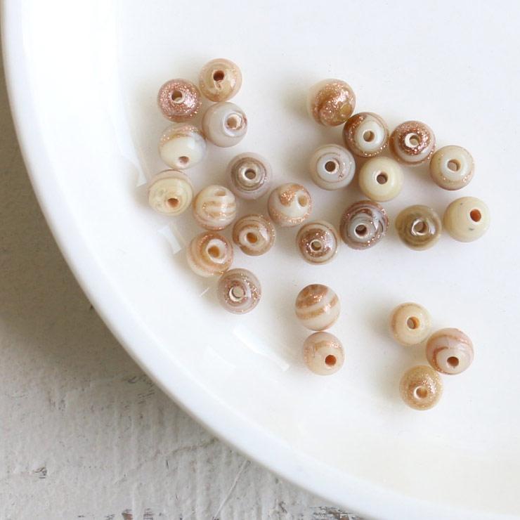 ベージュ×ブラウンラメ4mmサイズのラウンドのガラスビーズです。マーブル模様も出方がそれぞれ違うので世界に1点しかないビーズ個性の違いもお楽しみください!