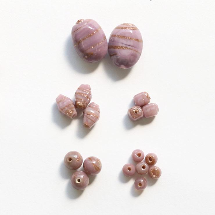 職人の手作業によって一つひとつ丁寧に作られているため、色合いや模様、サイズ、輝きの出方に個体差がございます。ガラスの内部の模様やゴールドラインの入り方はランダムであり、同じデザインでもひとつとして同じものはありません。それぞれのビーズが持つ個性としてお楽しみいただければ幸いです。