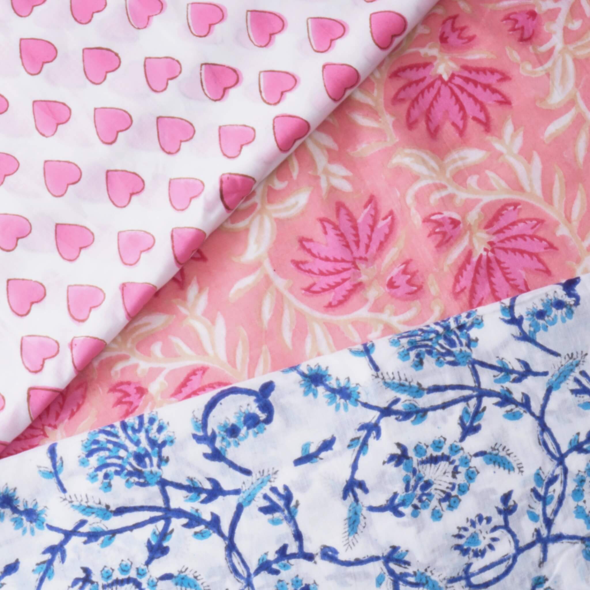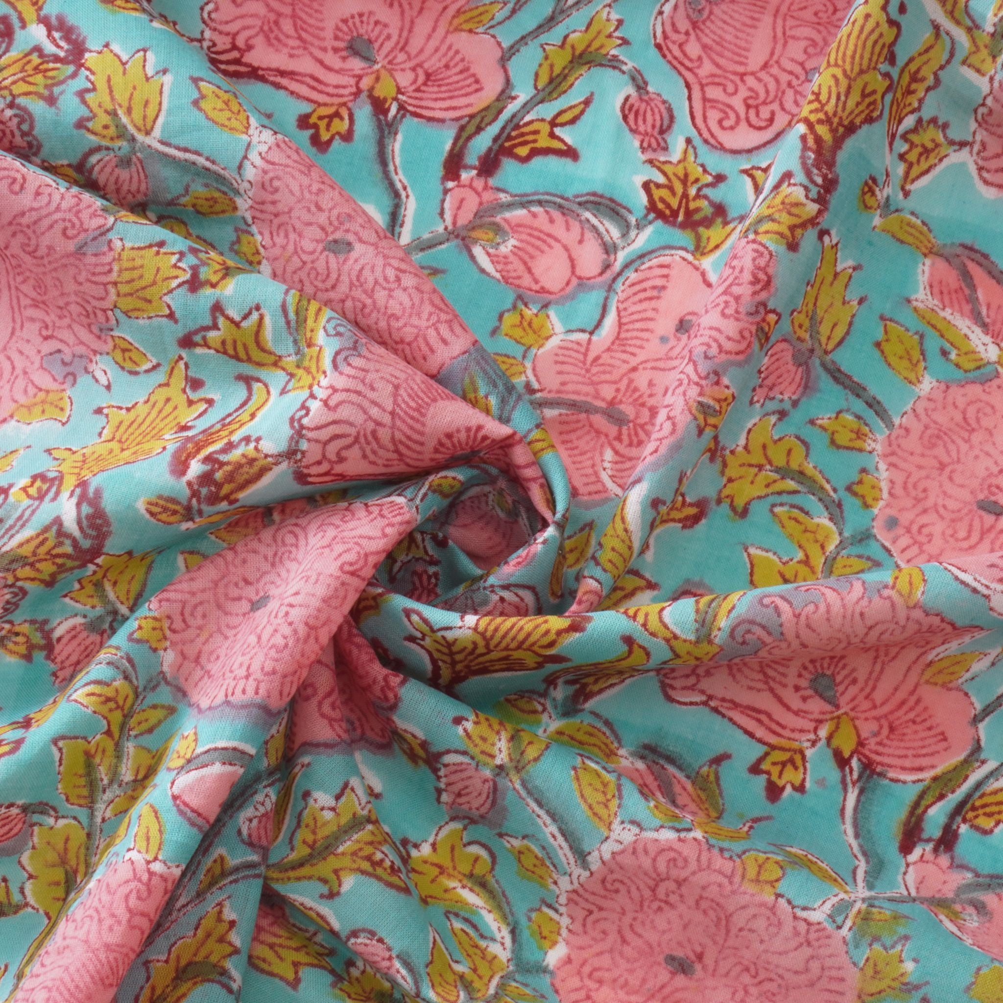 ブロックプリントの生地です。木彫りのスタンプ(ブロック)を使って、職人が1色ずつ丁寧に手作業で柄を押していく伝統的な染色技法です。柄のズレやかすれも手仕事ならではの味わいで、温もりのある風合いが魅力です。