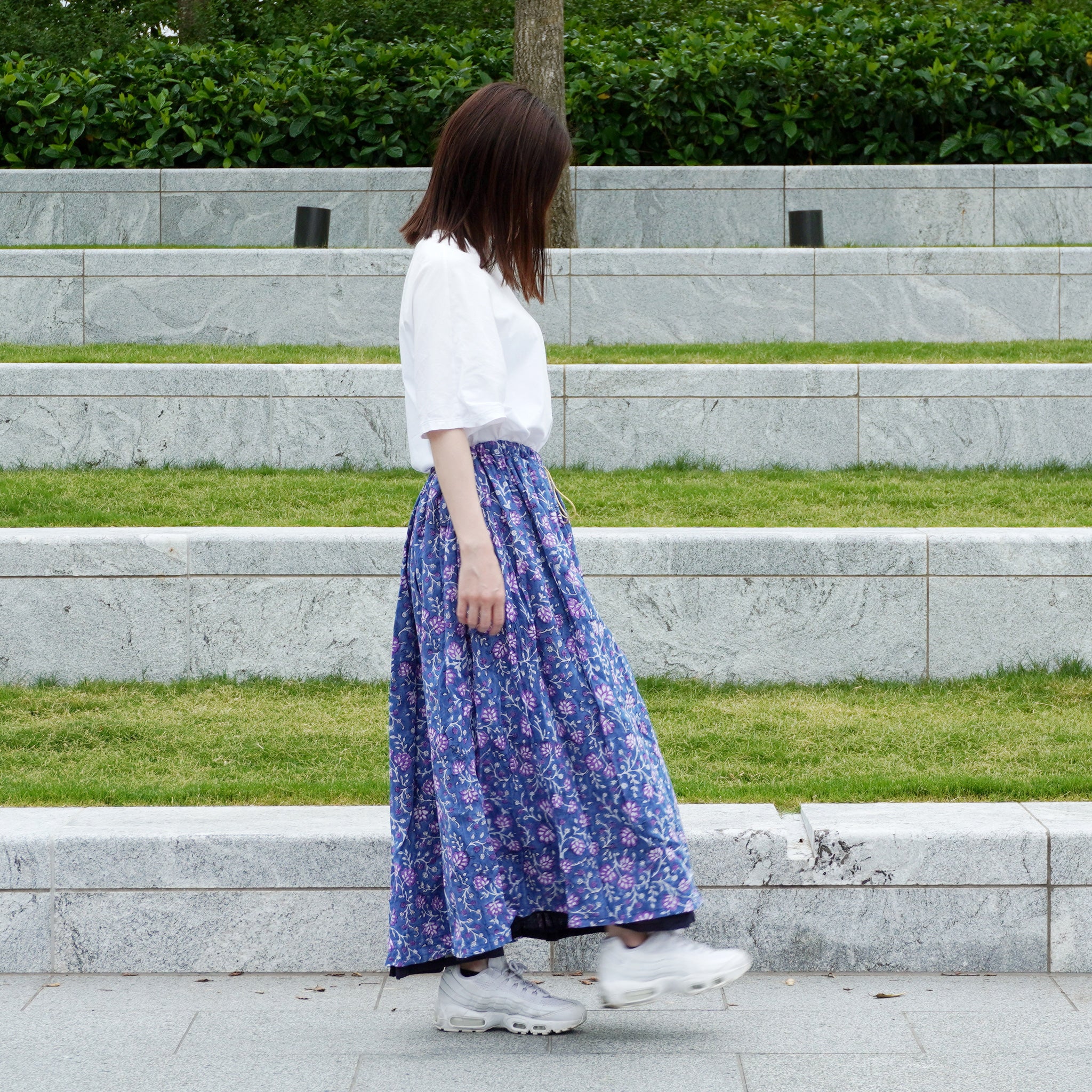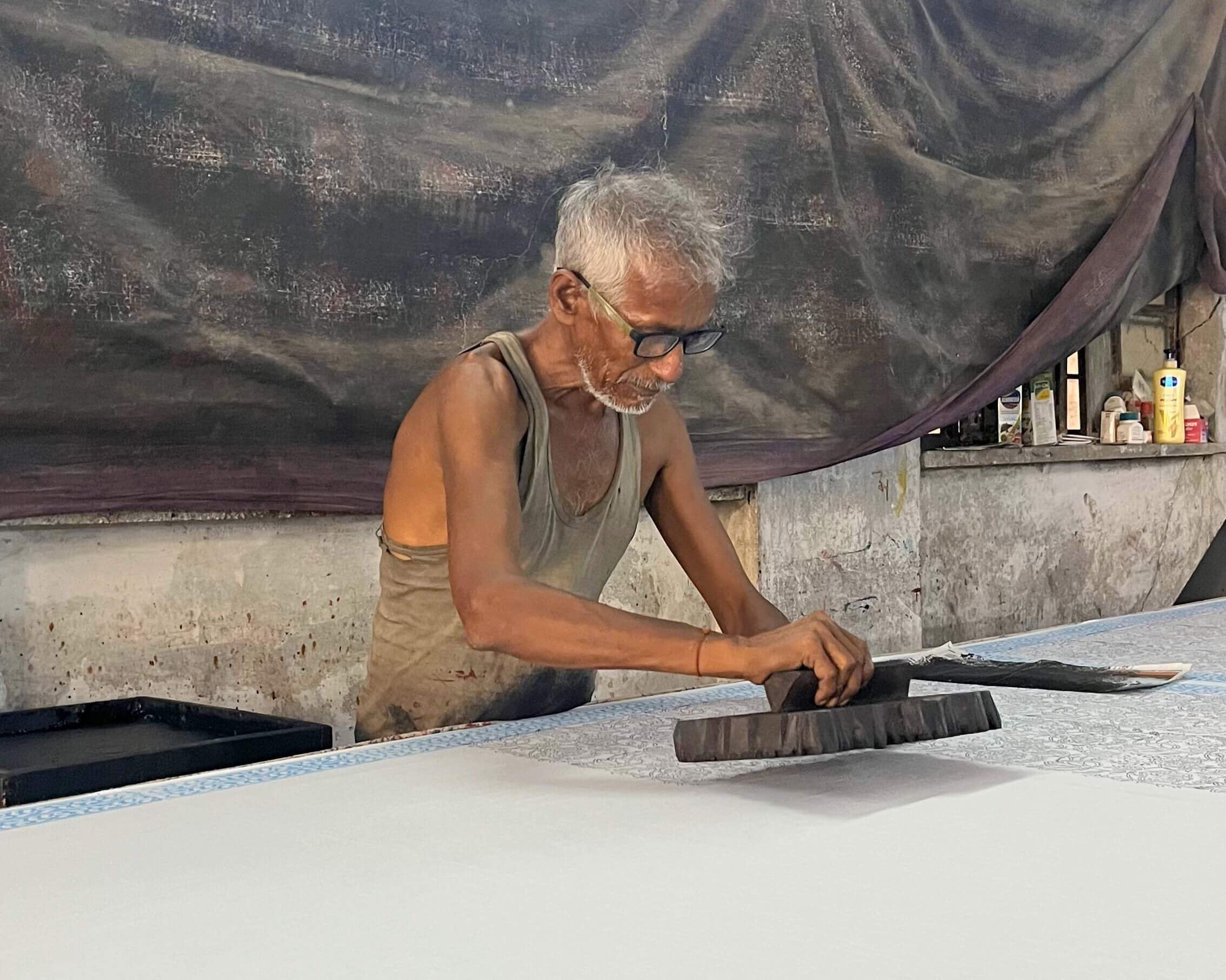 インドの伝統技法「ブロックプリント」は、熟練の職人がひとつひとつ手作業で布に模様を押していく手間ひまのかかる技法。大量生産では出せない、にじみやかすれも味となり、世界にひとつだけの風合いが生まれます。何十メートルもの布に、リズムよく丁寧にプリントされる工程は、まさに手しごとの芸術です。
