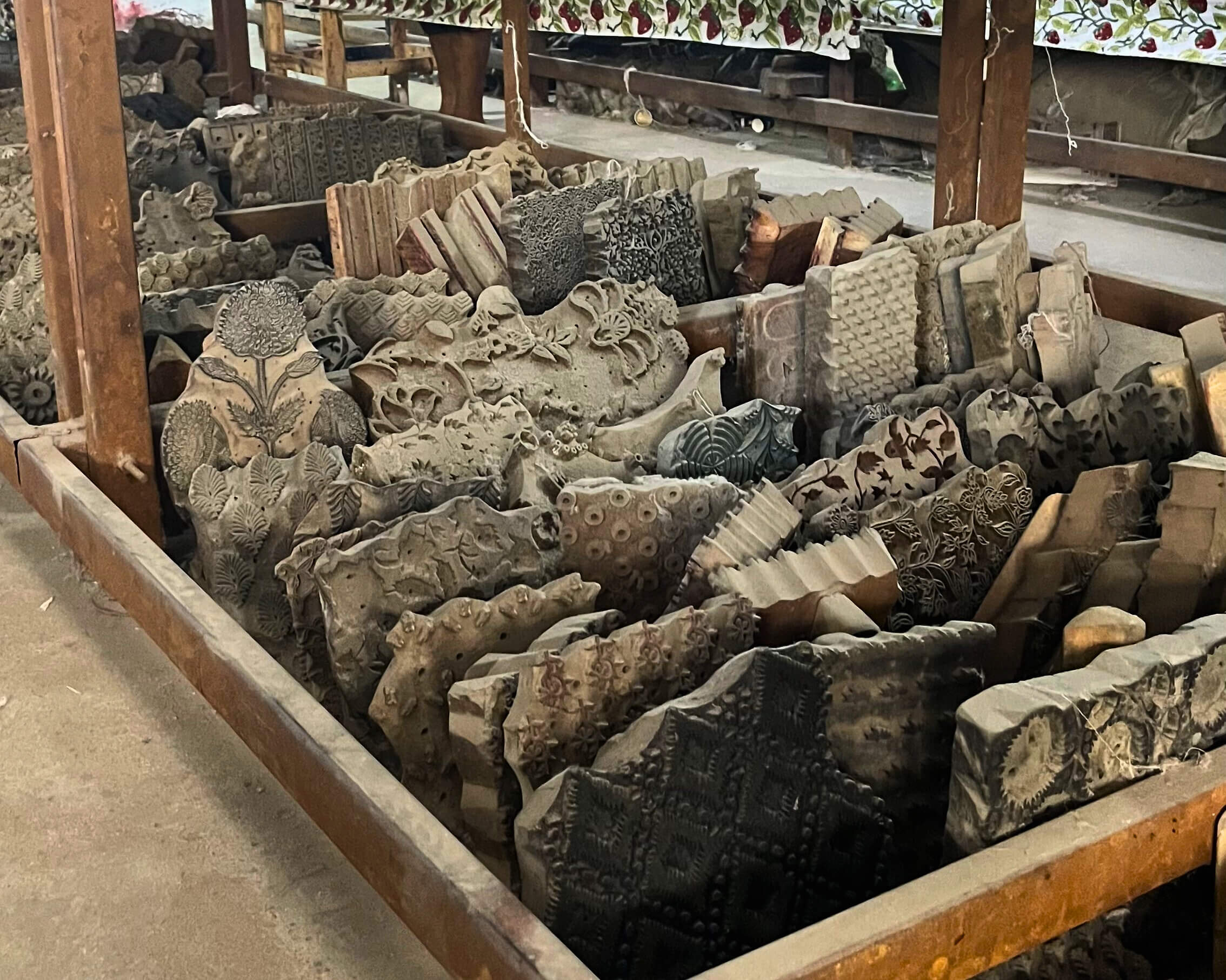 この美しい模様を生み出すのが、木を手彫りして作られる専用の「ブロック」。動植物や幾何学模様など、ひとつひとつ異なるモチーフが刻まれたブロックが、何百種類も工房に並びます。年月とともに風合いを増したブロックたちは、職人たちの歴史と技術の証。手から手へと受け継がれるクラフトの力を、ぜひ感じてみてください。