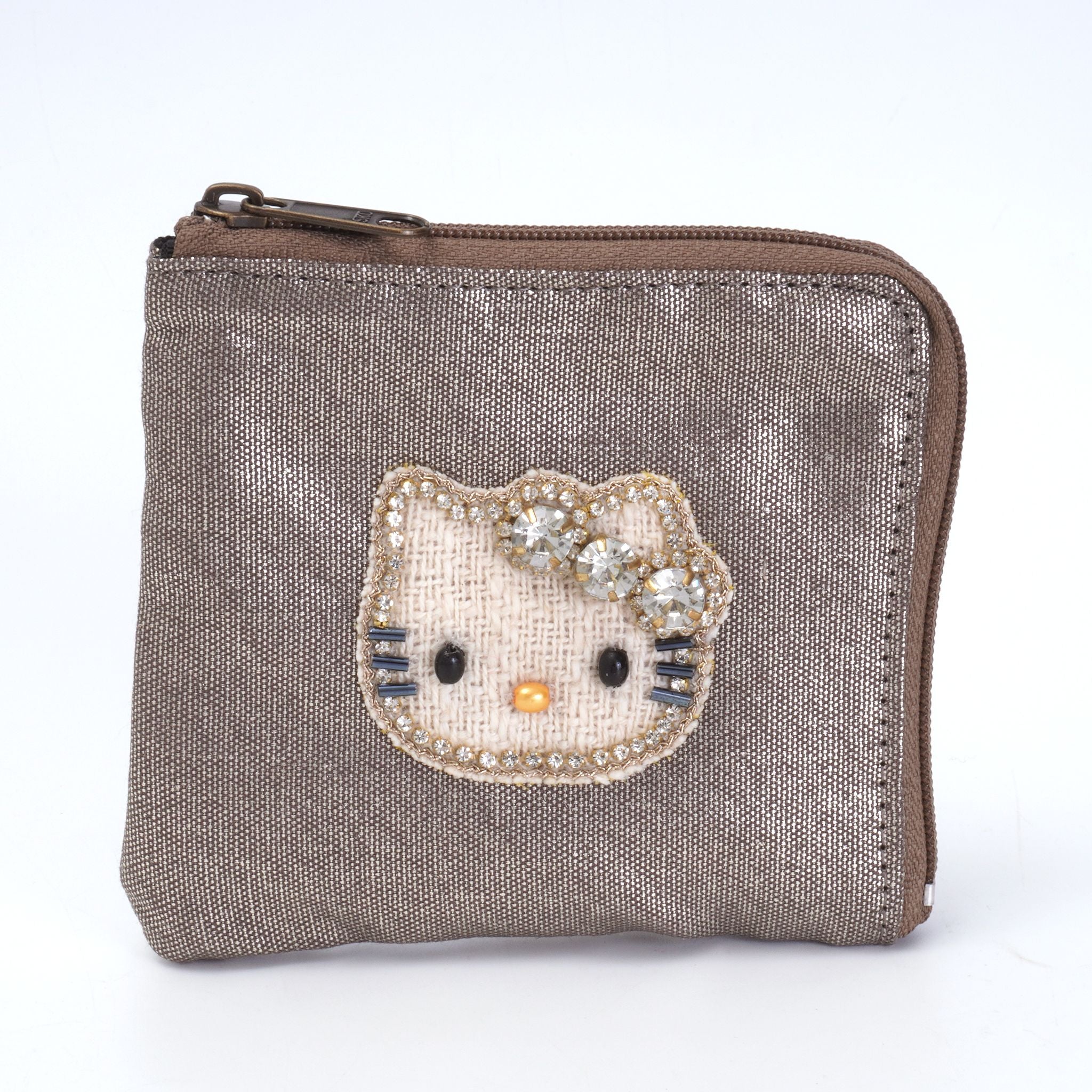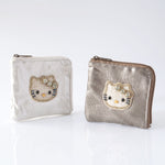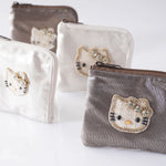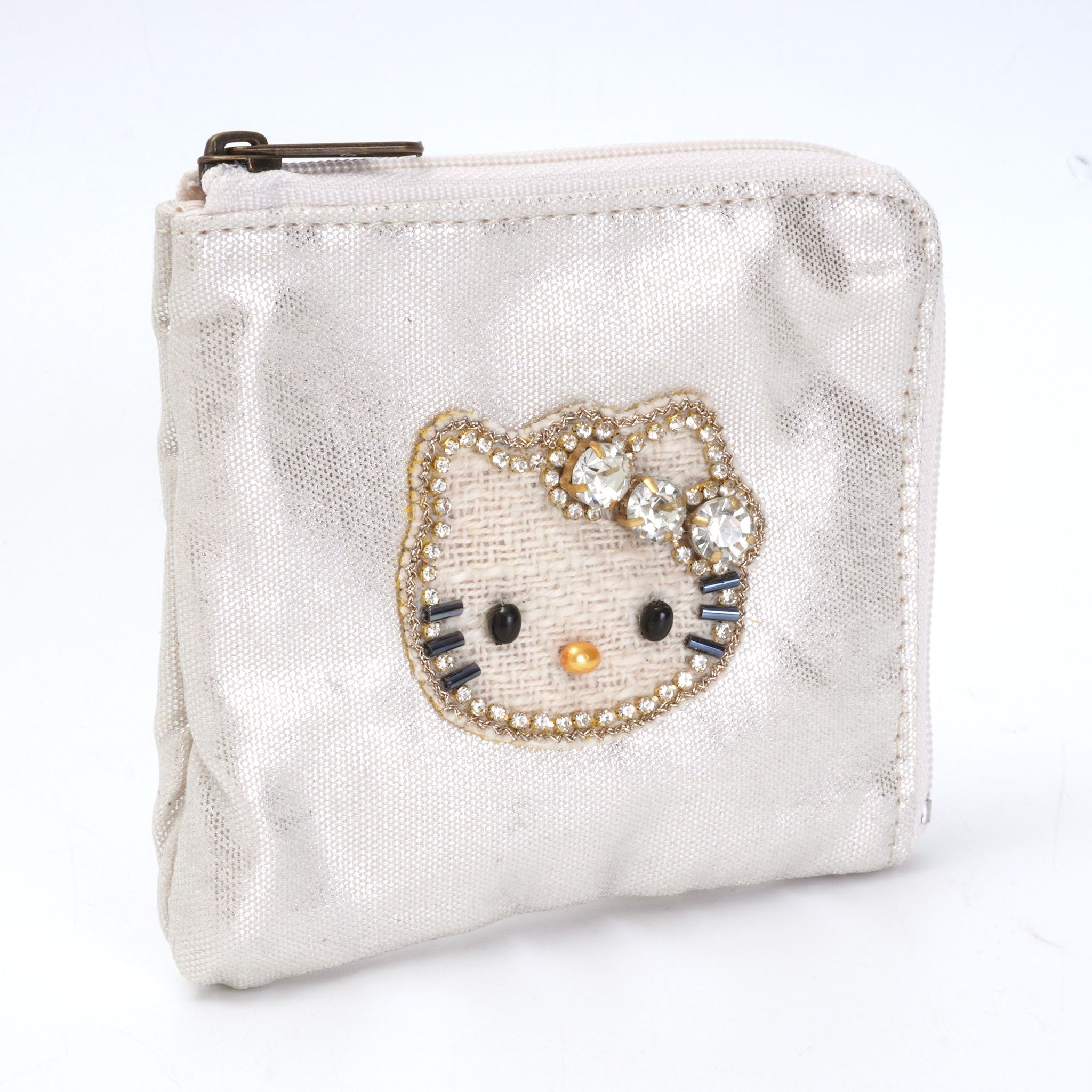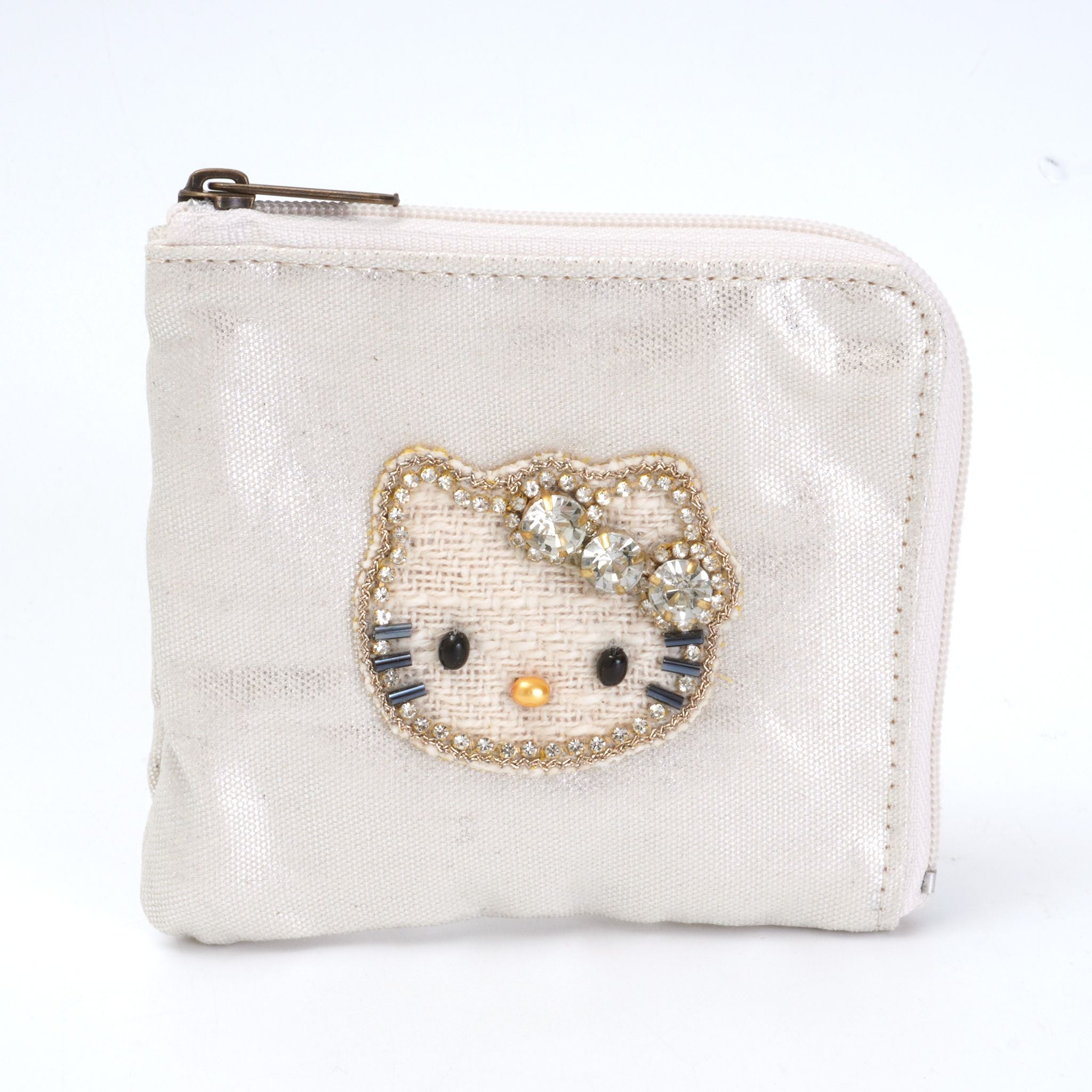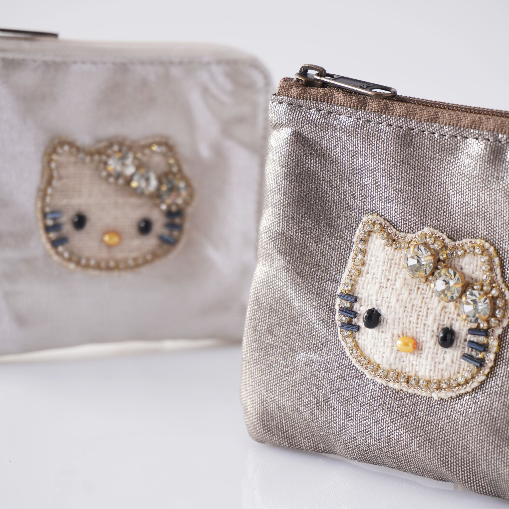 ビーズ刺繍でデザインされたハローキティのメタリックコインケース。ハローキティモチーフはダイヤレーンで囲まれており、心がときめく、キラキラデザインです。コインケースはコットンの生地にオリジナルの箔プリントを施しており上品な輝きが多くの方に支持いただいております。
