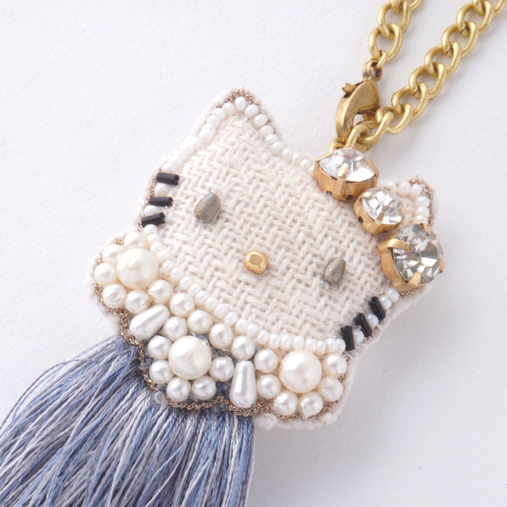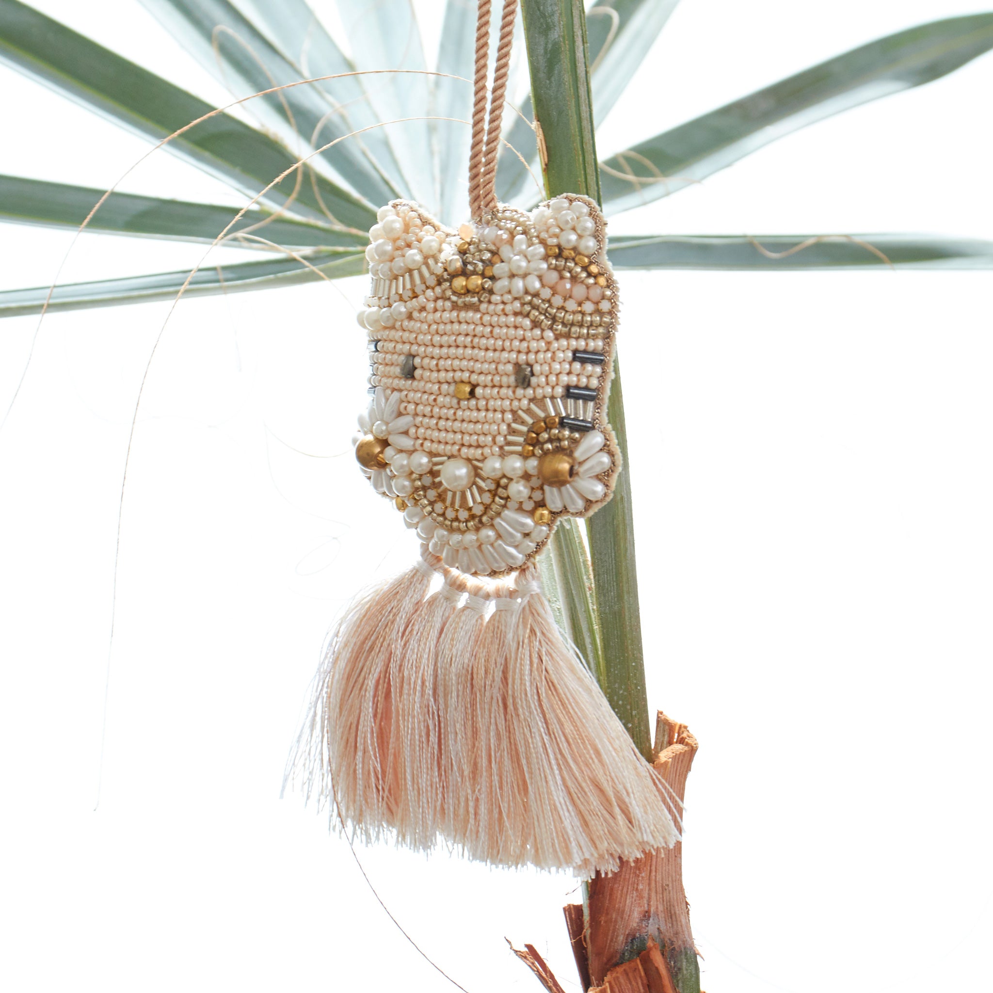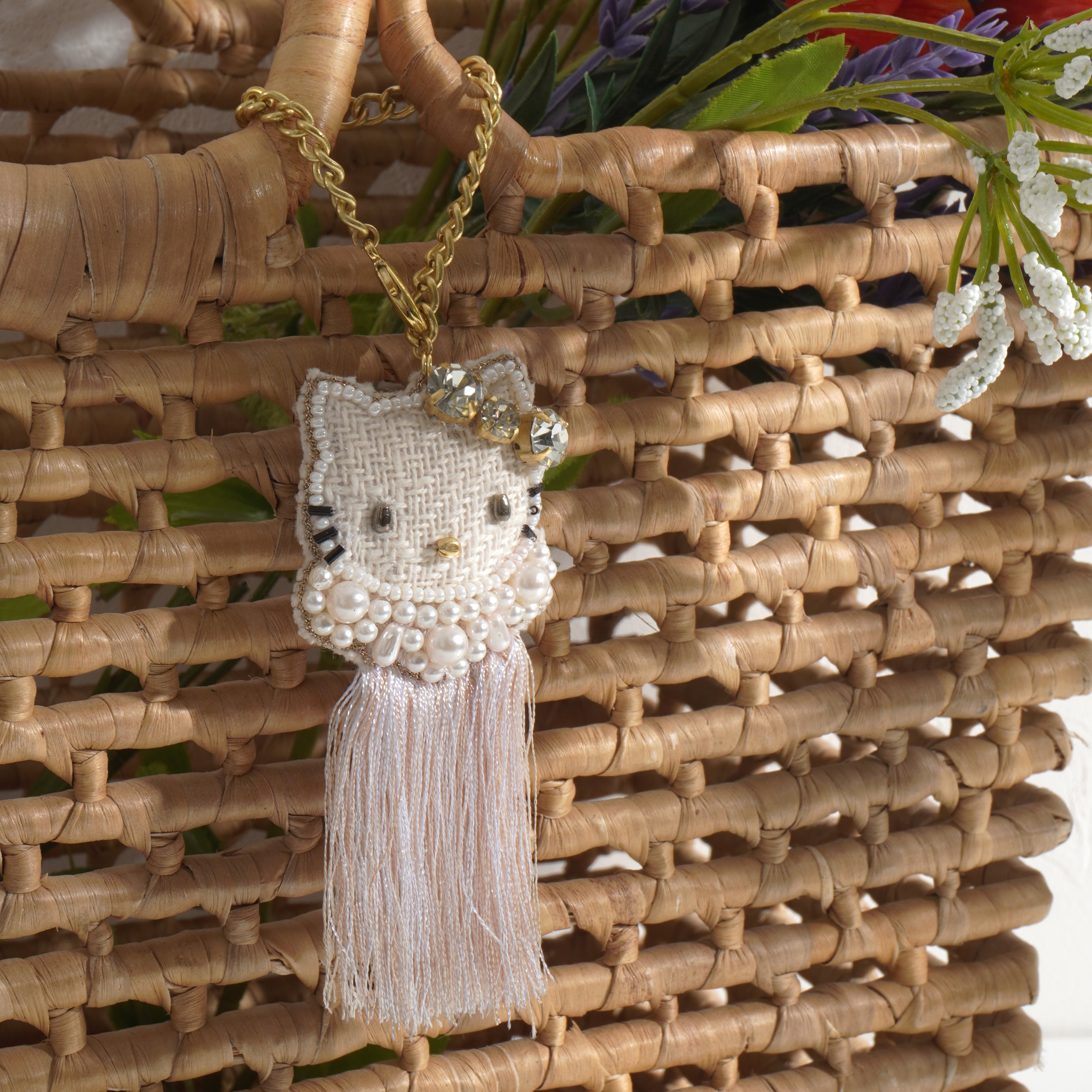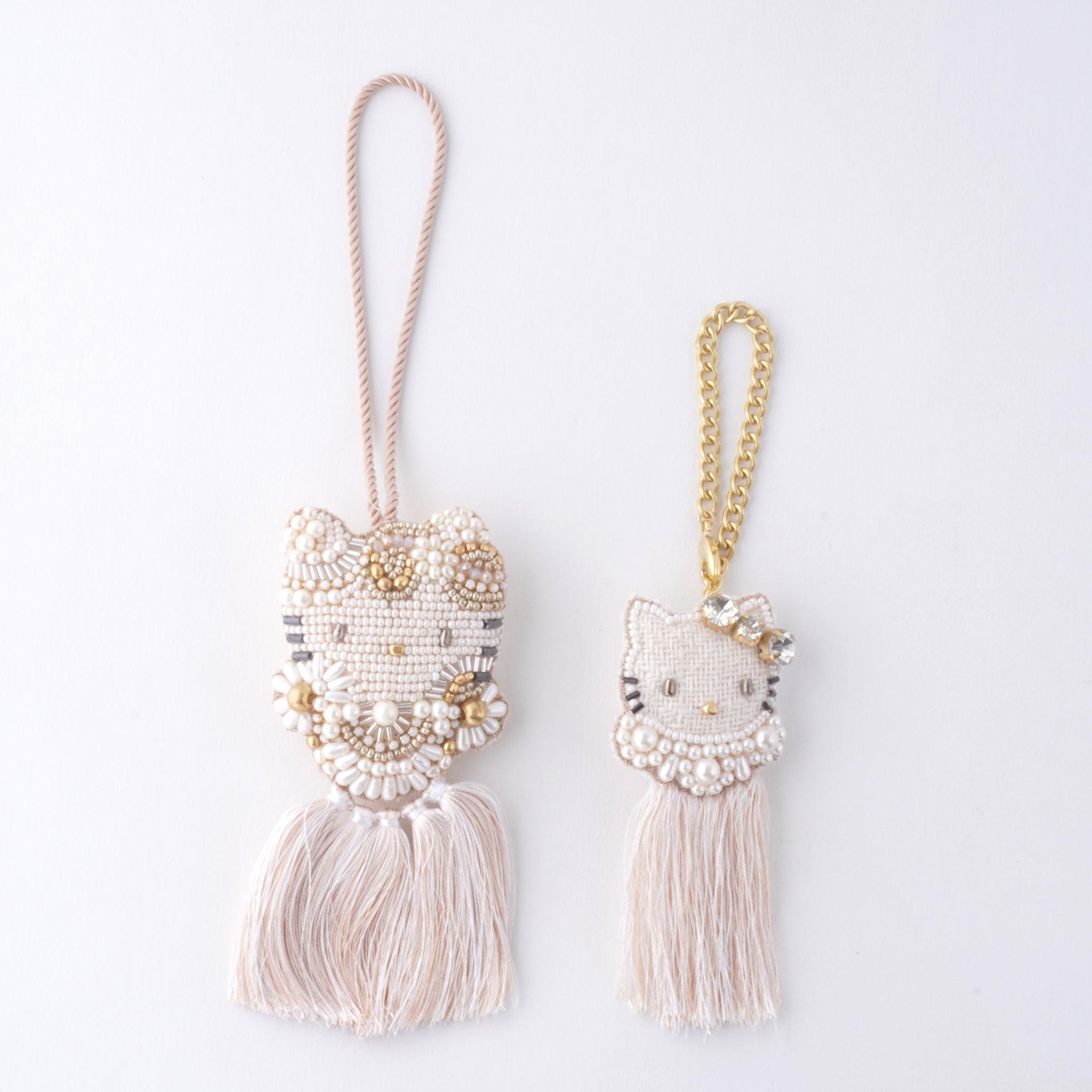ゴージャスなビーズ刺繍でデザインされたハローキティの立体的なバッグチャーム。ハローキティはもちろん、フリンジ付きの存在感抜群のバッグチャームです。ハローキティモチーフの、派手すぎない上品な輝きはハンドメイドビーズのカットによるもの。バッグはもちろんカーテンタッセルなどインテリアの一部としてお使いいただくのもおすすめです。可愛さと上品さを兼ね備えたチャームはプレゼントにもおすすめです。
