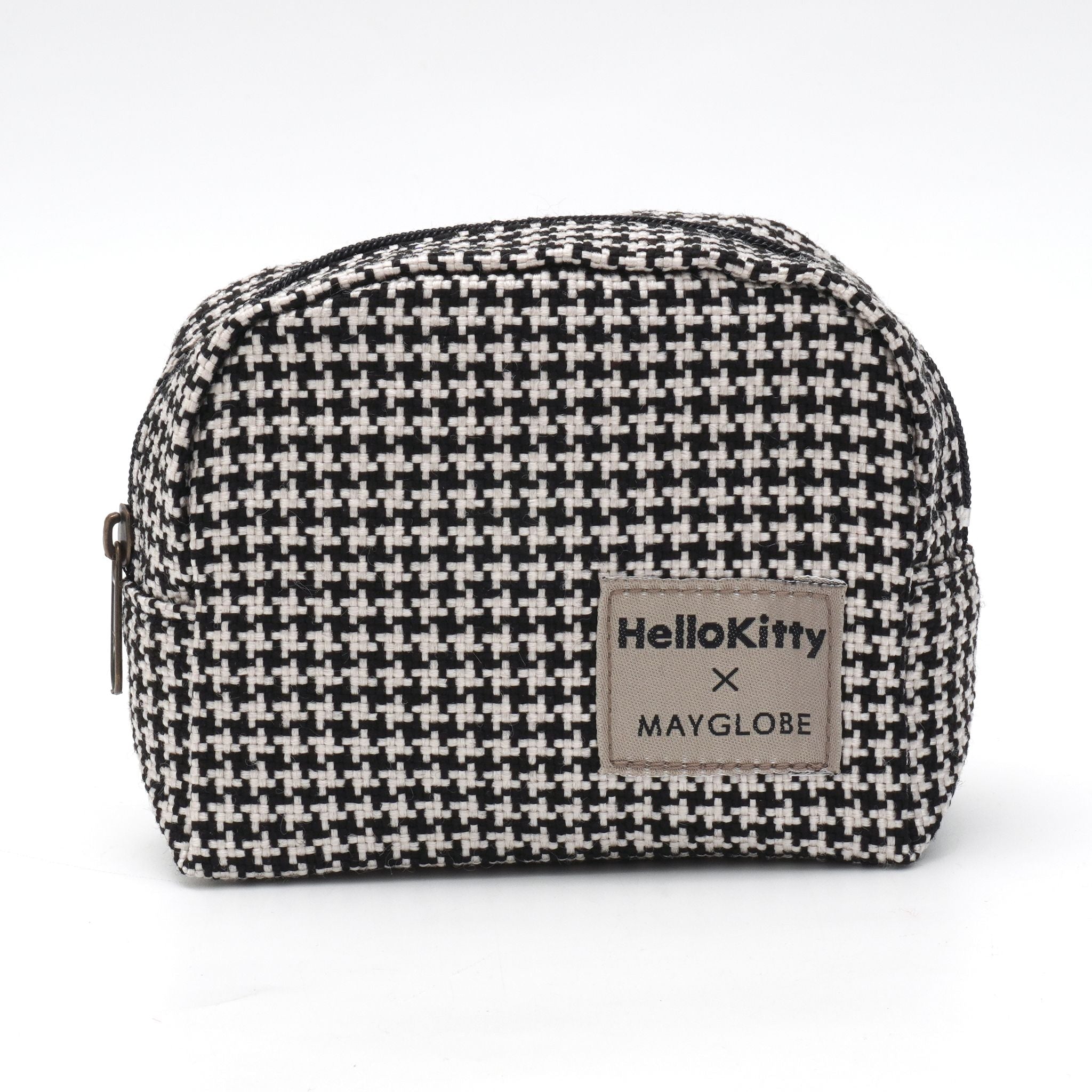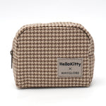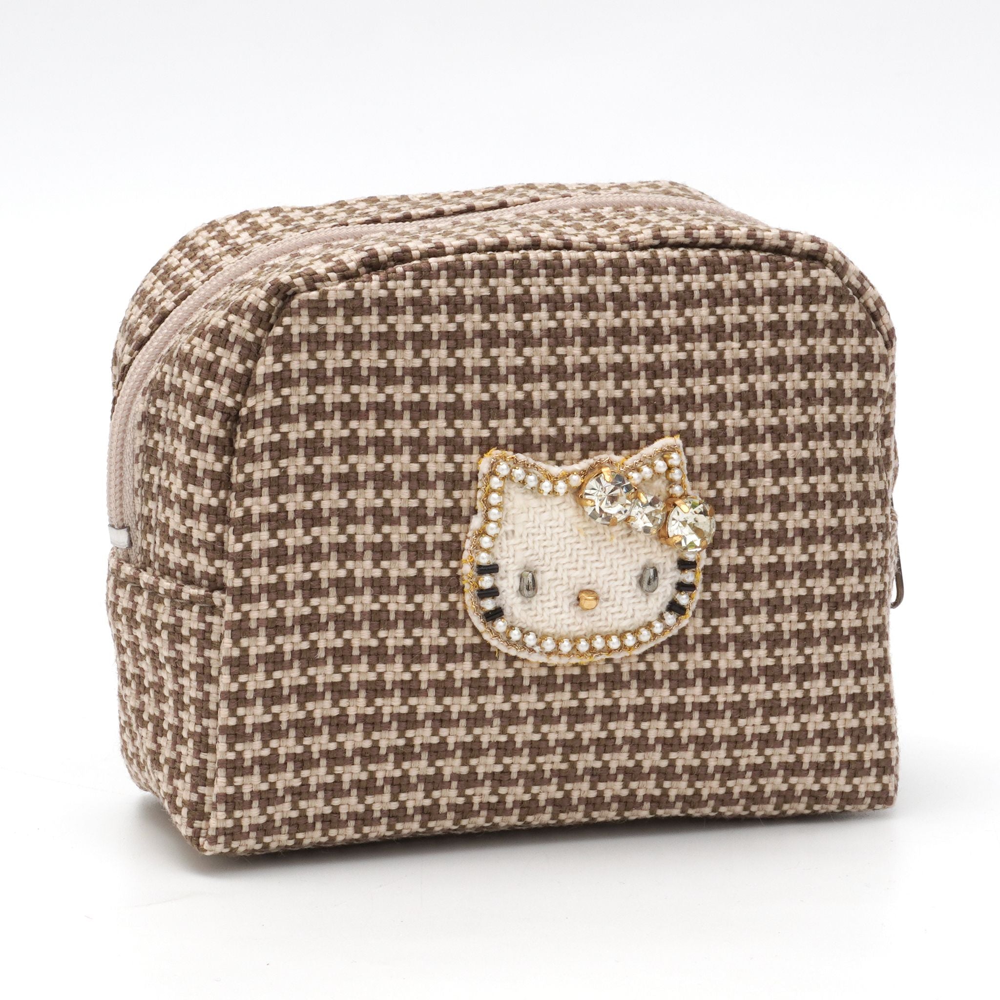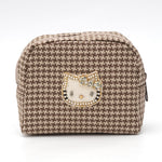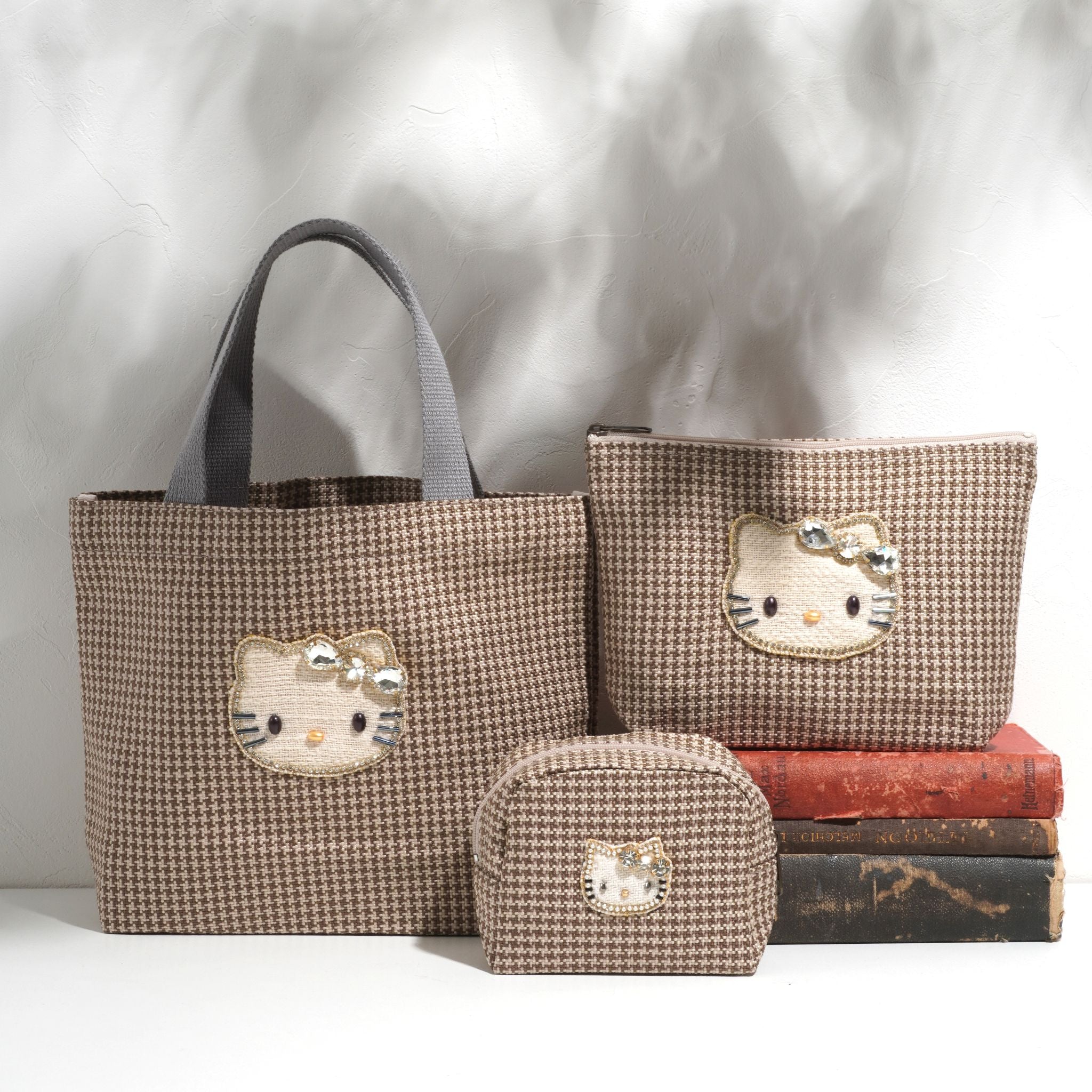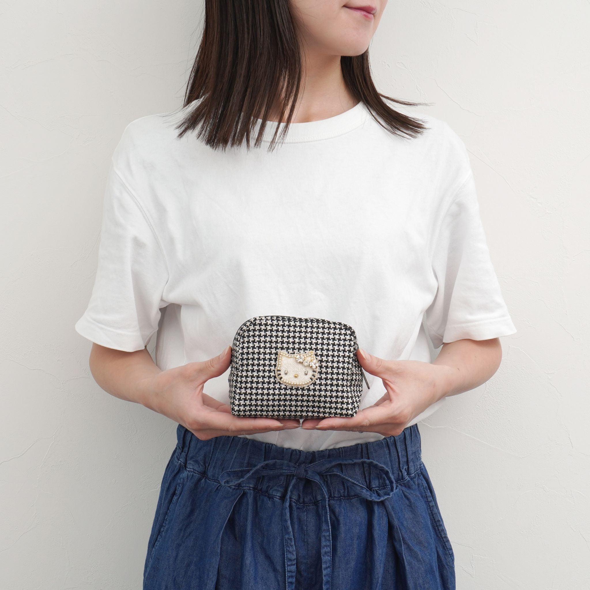 クラシカルな千鳥格子柄に、きらめくキティのビジューモチーフをあしらったポーチ。上品なモノトーンと、やわらかな印象のブラウンの2色展開です。ふっくらとしたフォルムで見た目以上の収納力があり、コスメや小物をすっきりまとめられます。シックな中にも可愛らしさが光る、大人のためのキティポーチです。