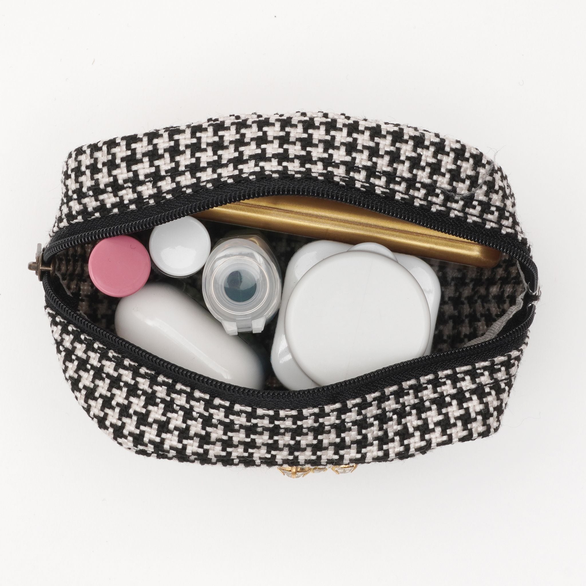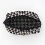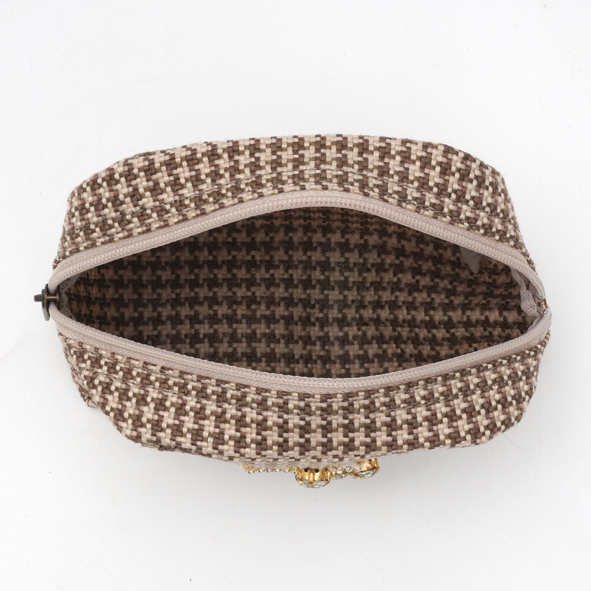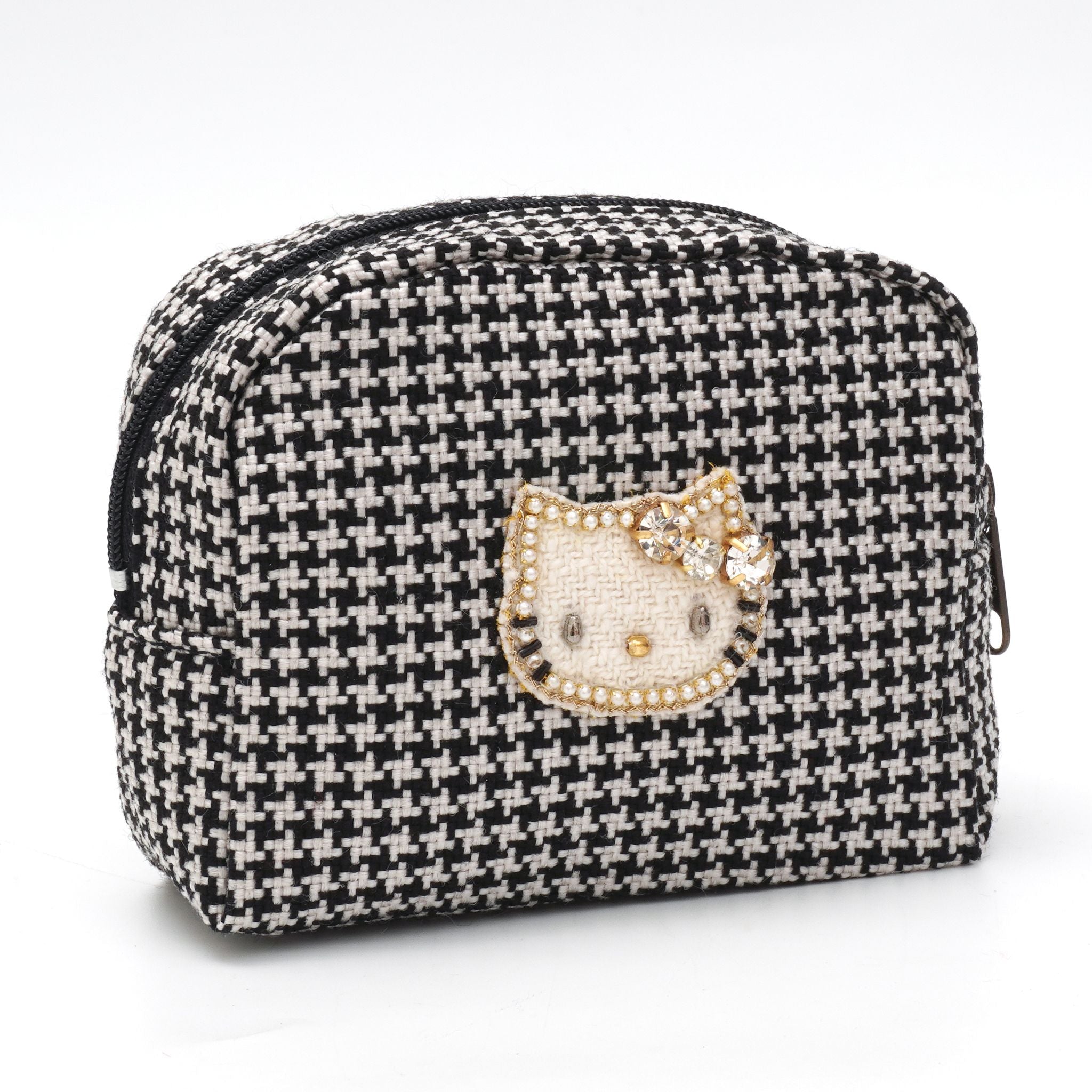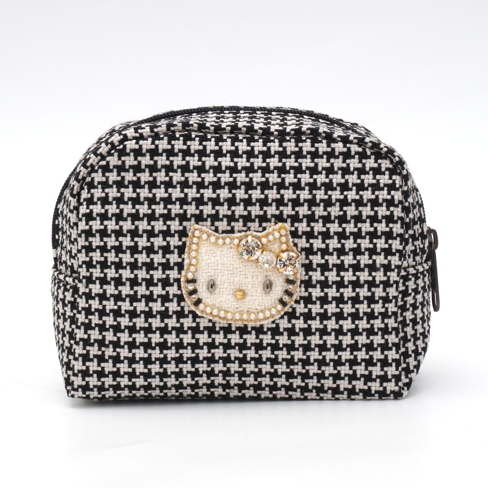 クラシカルな千鳥格子柄に、きらめくキティのビジューモチーフをあしらったポーチ。上品なモノトーンと、やわらかな印象のブラウンの2色展開です。ふっくらとしたフォルムで見た目以上の収納力があり、コスメや小物をすっきりまとめられます。シックな中にも可愛らしさが光る、大人のためのキティポーチです。