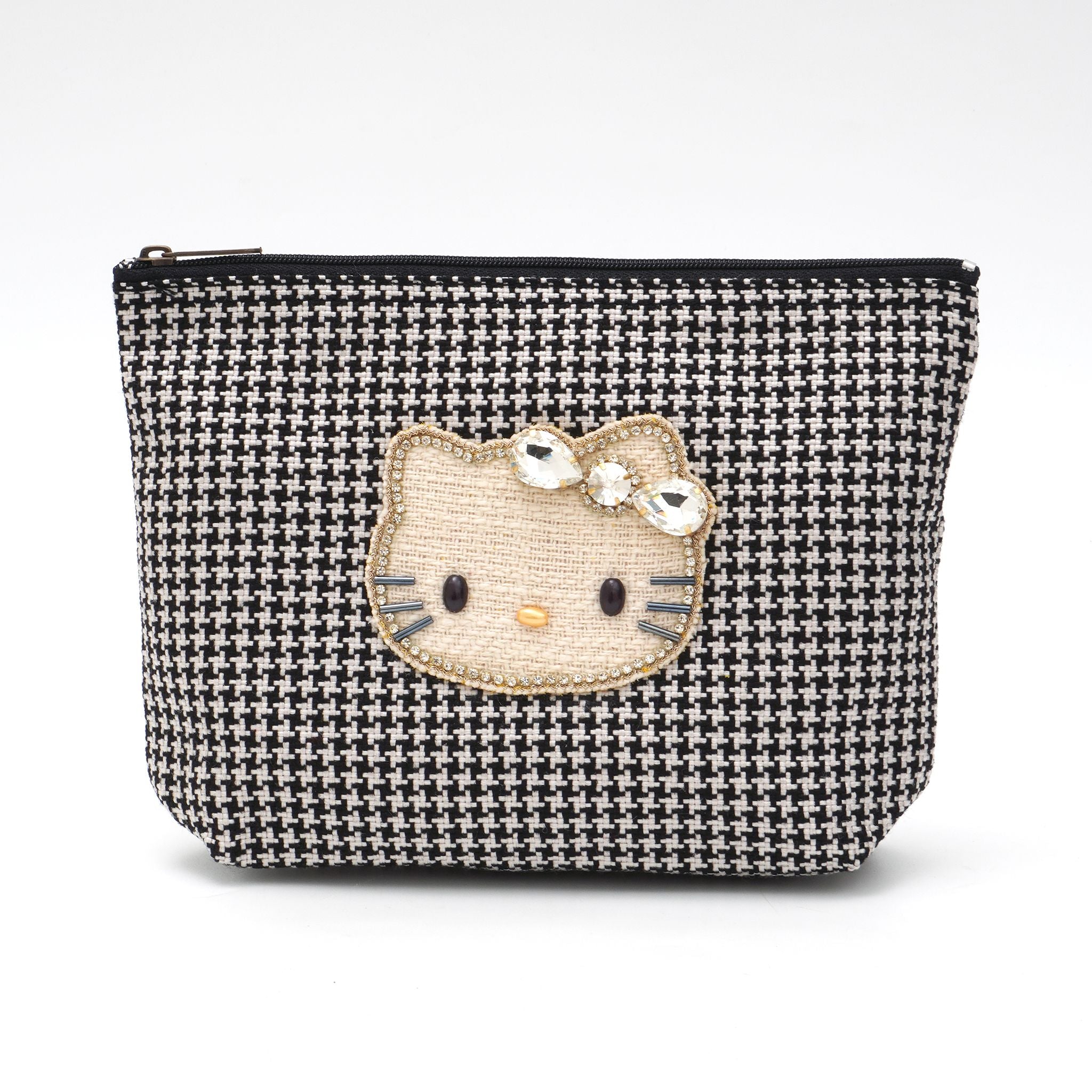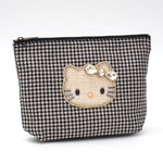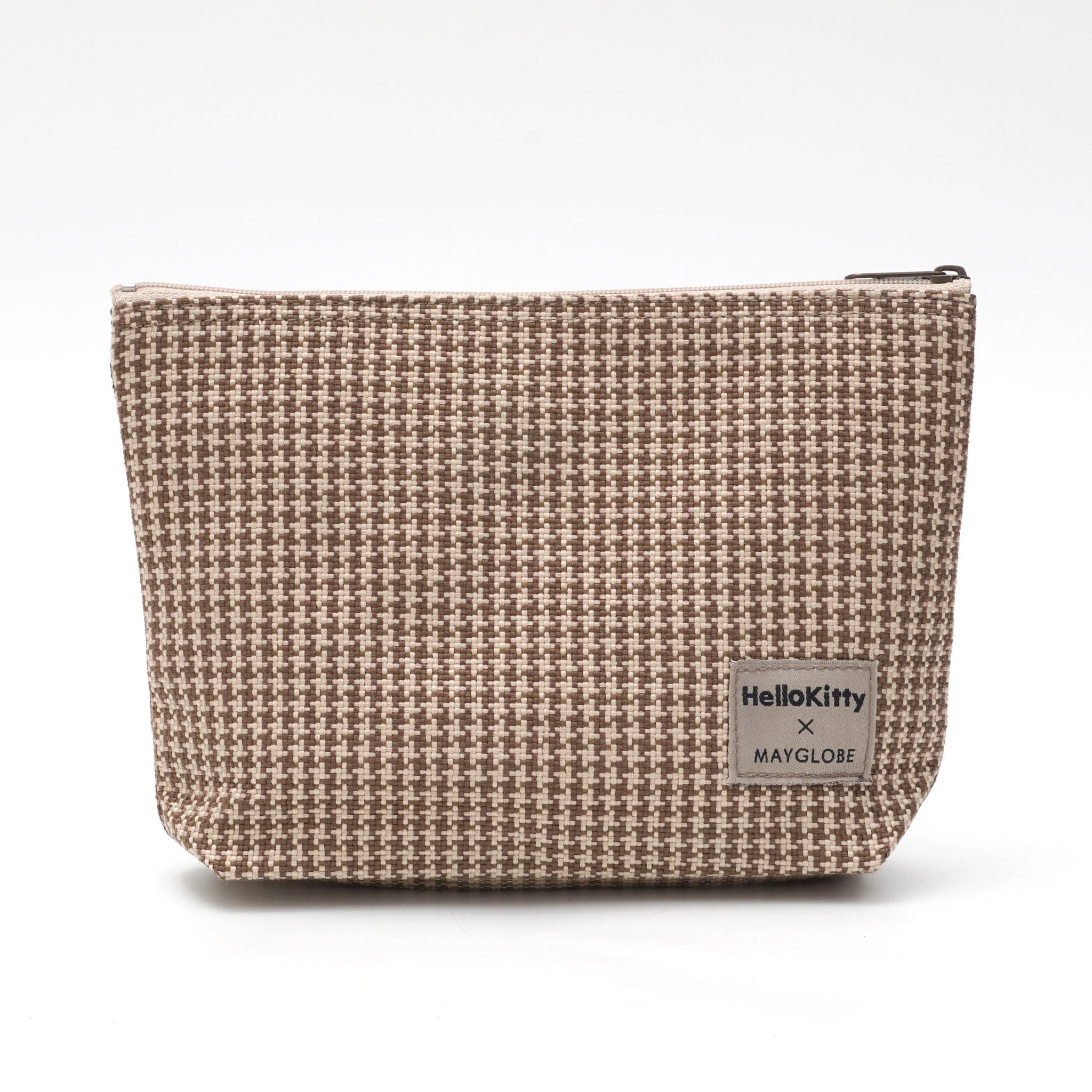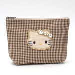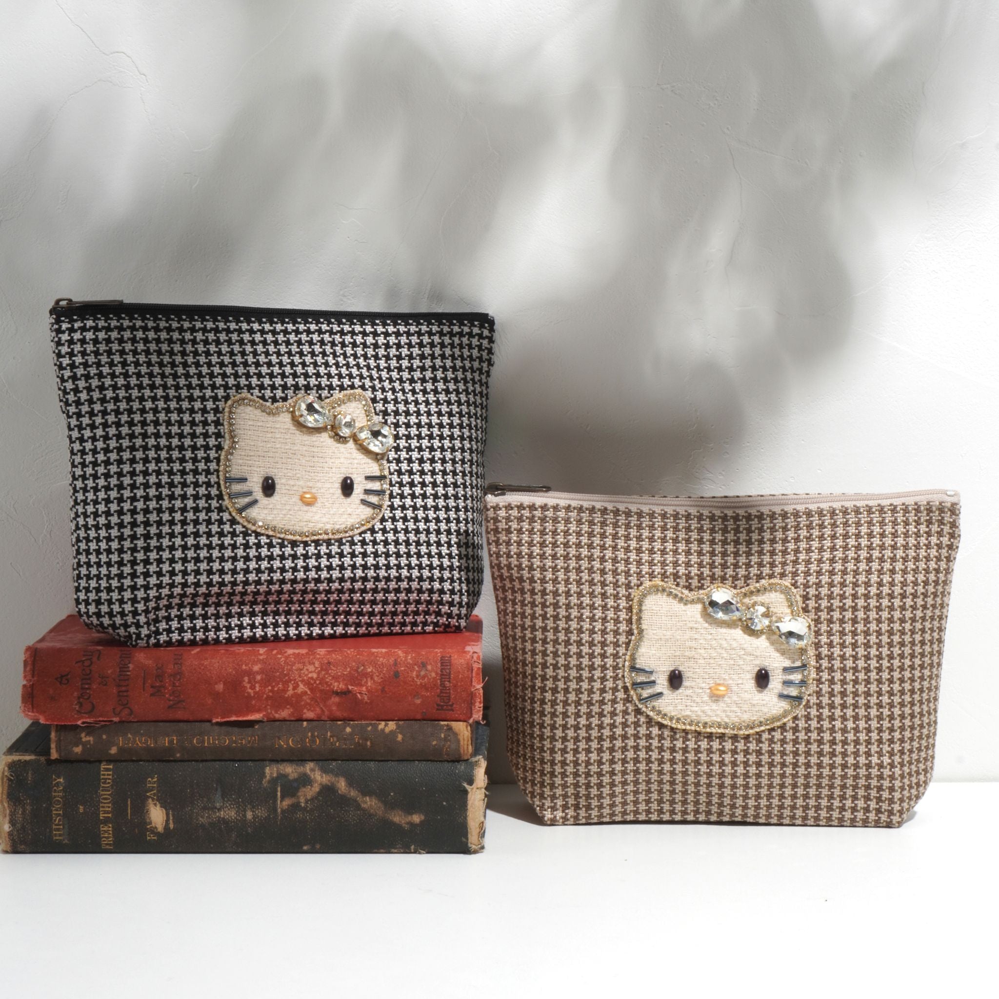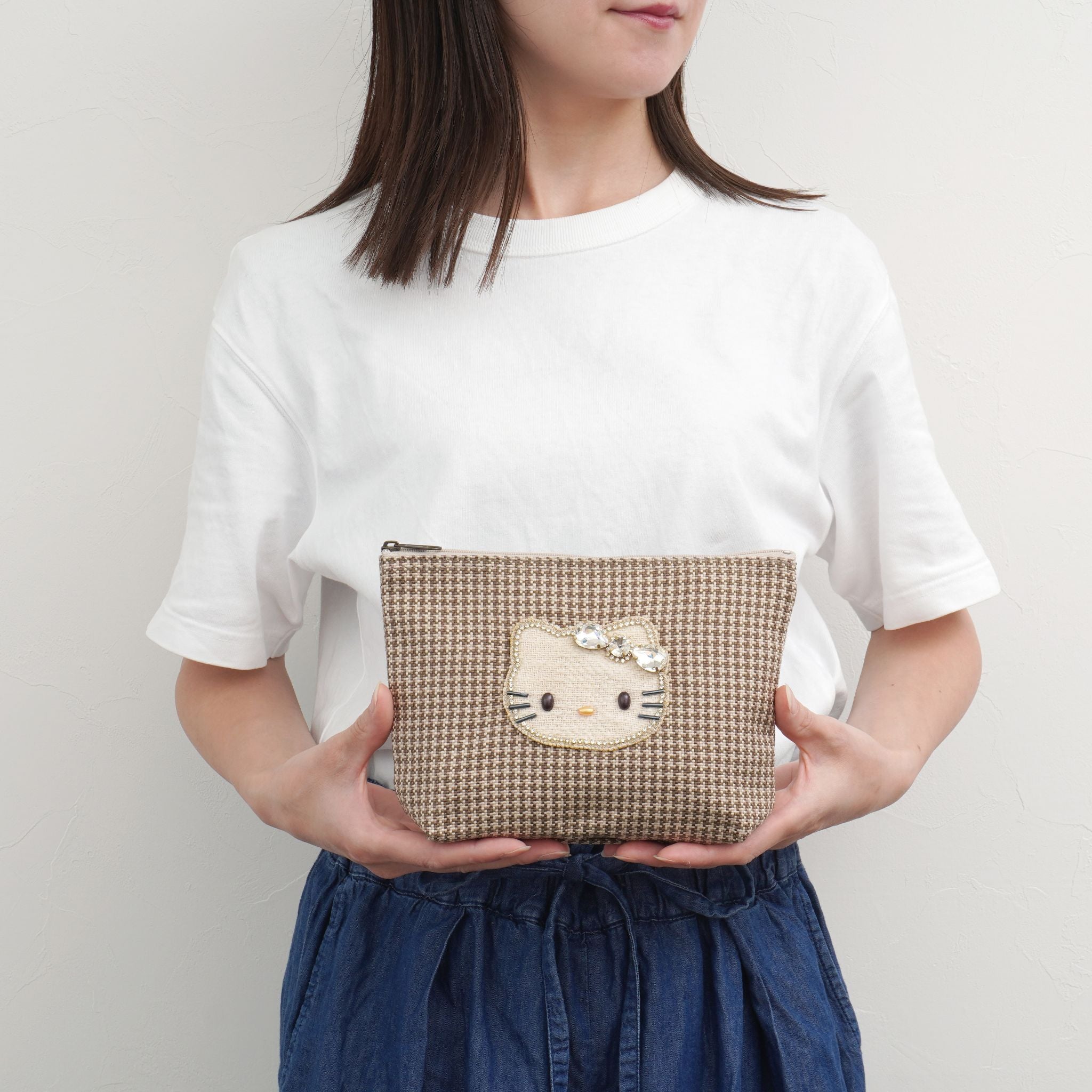 クラシカルな千鳥格子柄に、きらめくキティのビジューモチーフをあしらった舟形ポーチ。落ち着いたブラウンとシックなブラックの2色展開で、上品な雰囲気の中に可愛らしさをプラスします。マチが広く自立する形で、コスメや小物をたっぷり収納できる実用的なサイズ感。デイリー使いにもギフトにもぴったりな、大人かわいいポーチです。