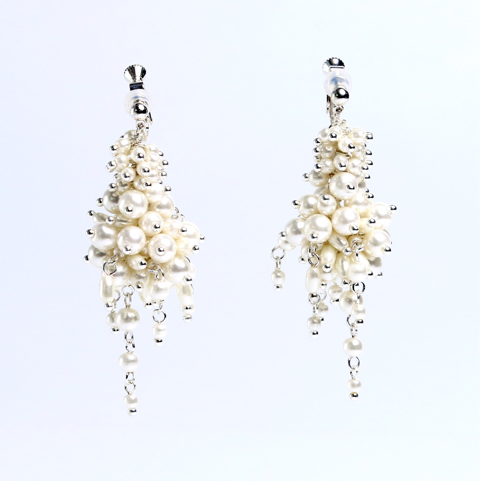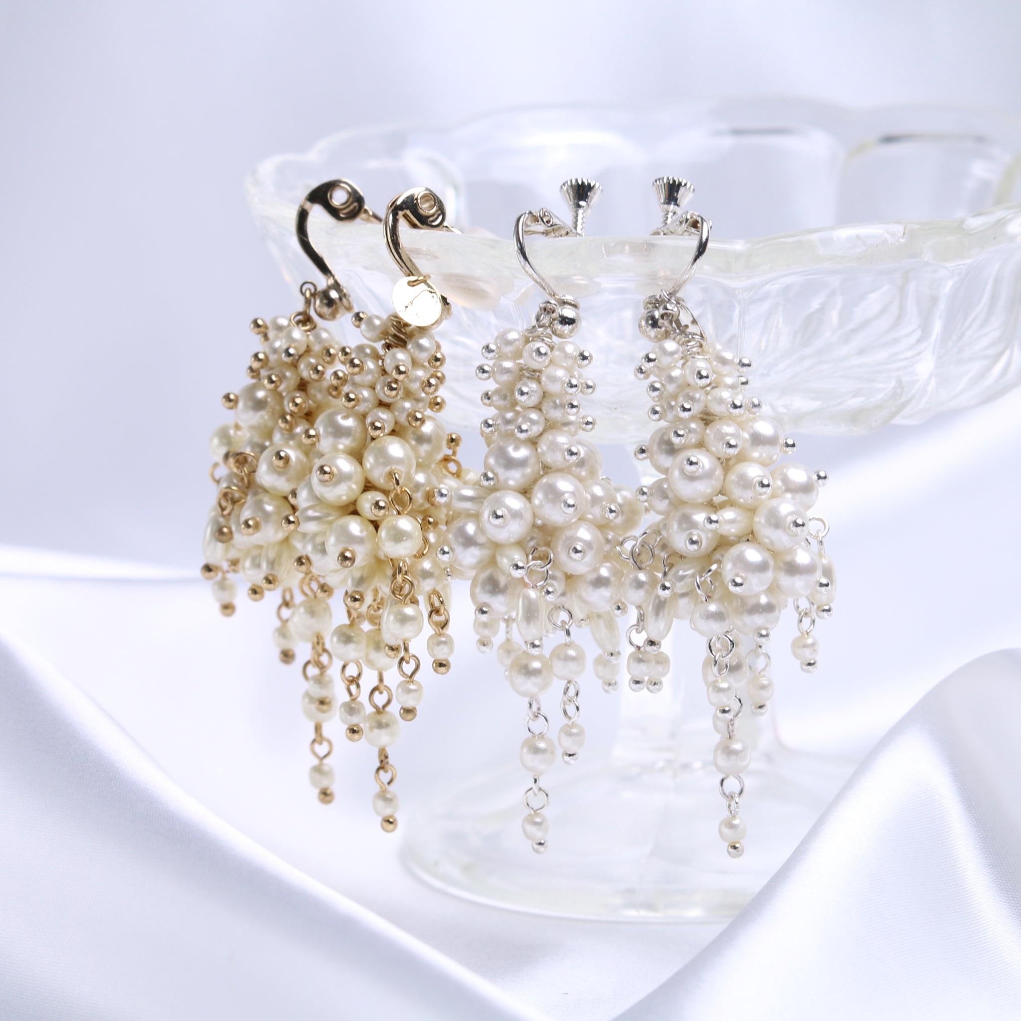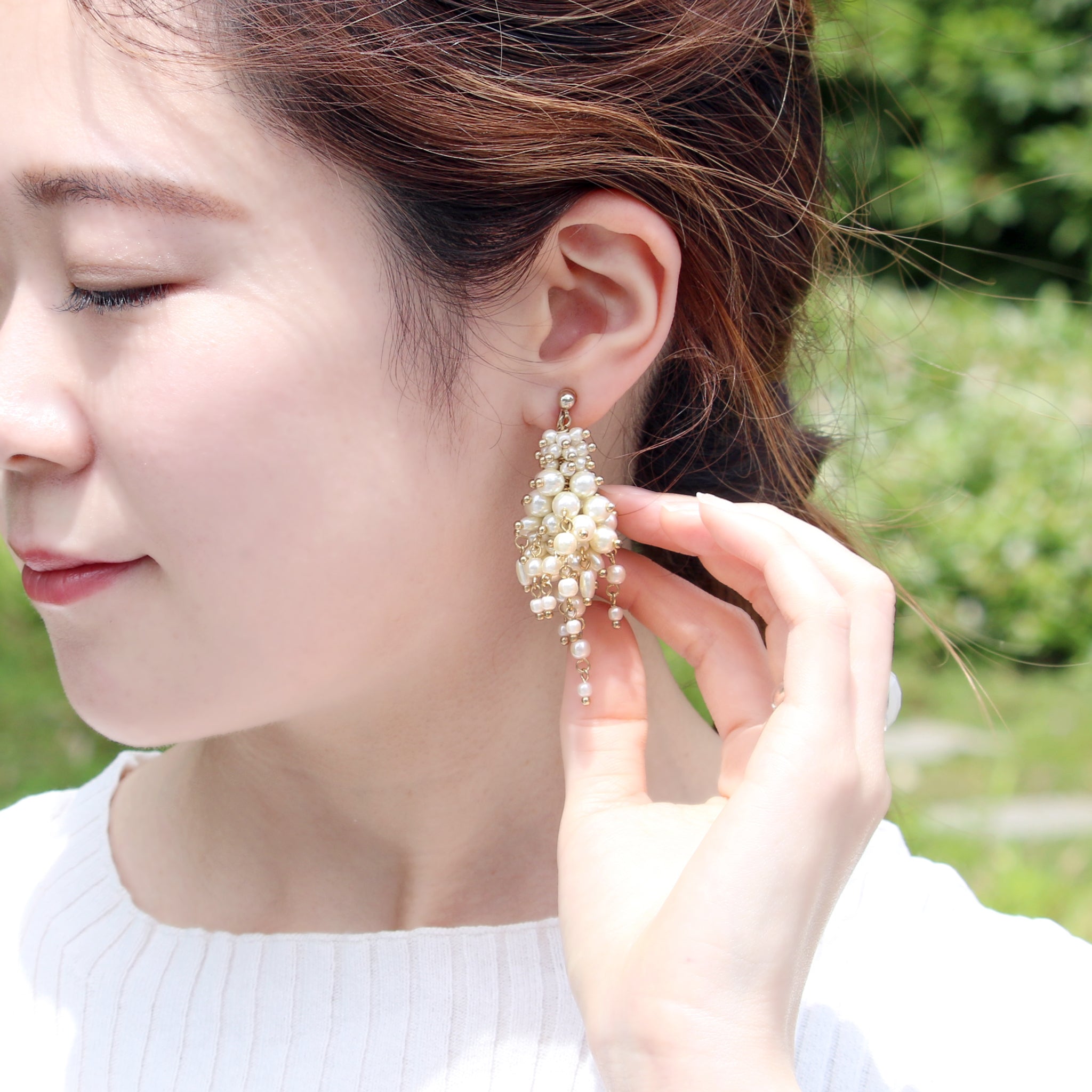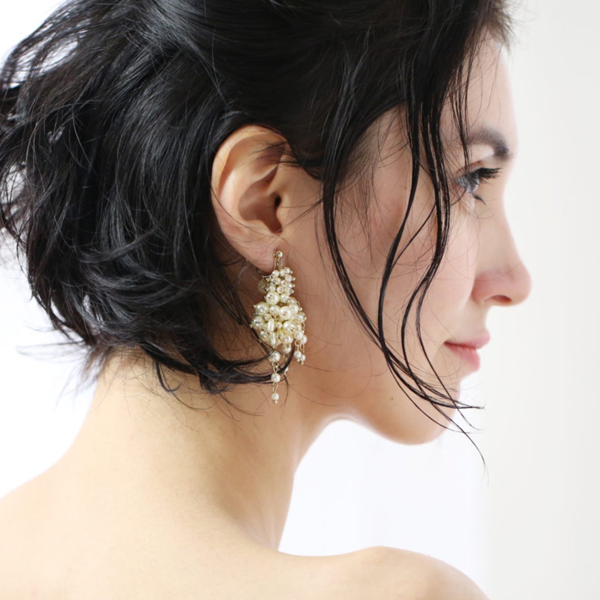 大小のパールを集めた、シャンデリアのような存在感抜群のイヤリング。繊細ながらも絶妙なボリューム感のあるデザインはお顔まわりがパッと華やぎます。ブライダルシーンや華やかなシーンでの着用もおすすめです。こちらはピアスの展開はございません。イヤリングのみとなります。