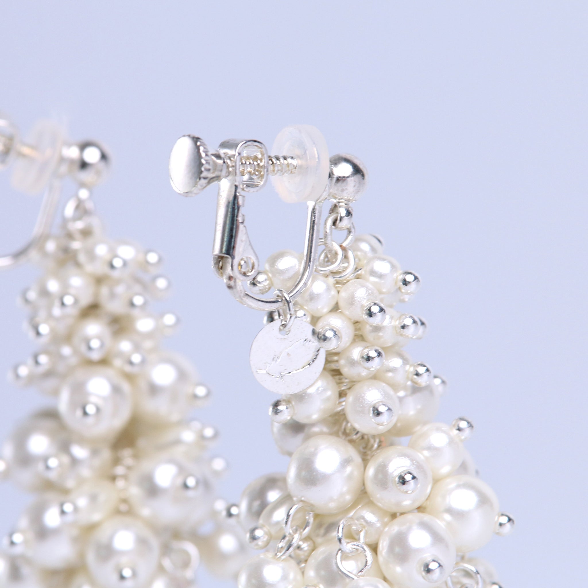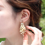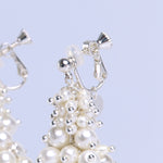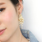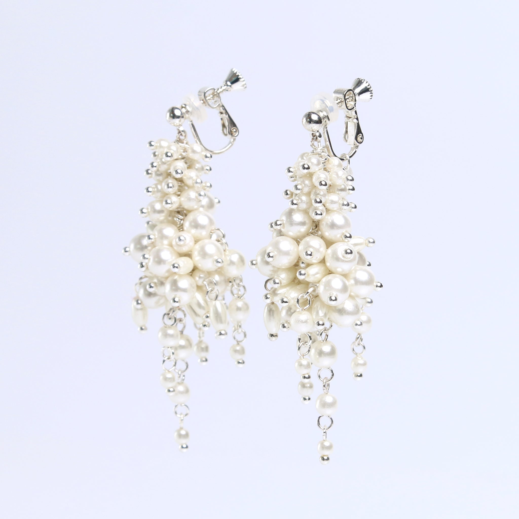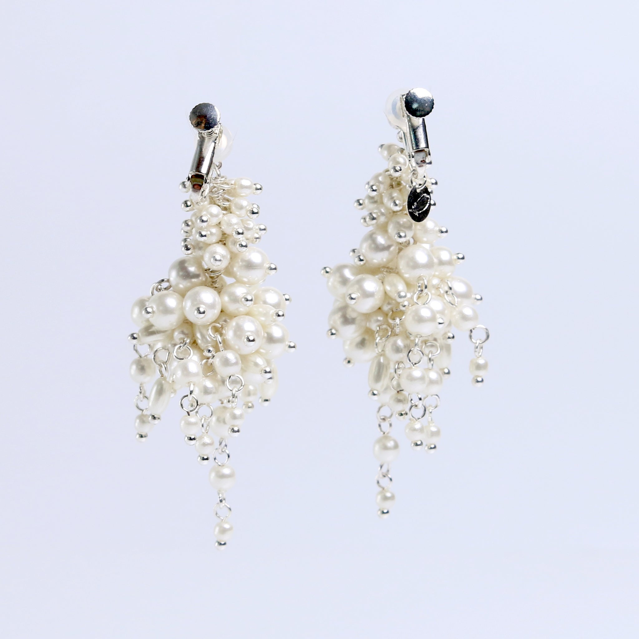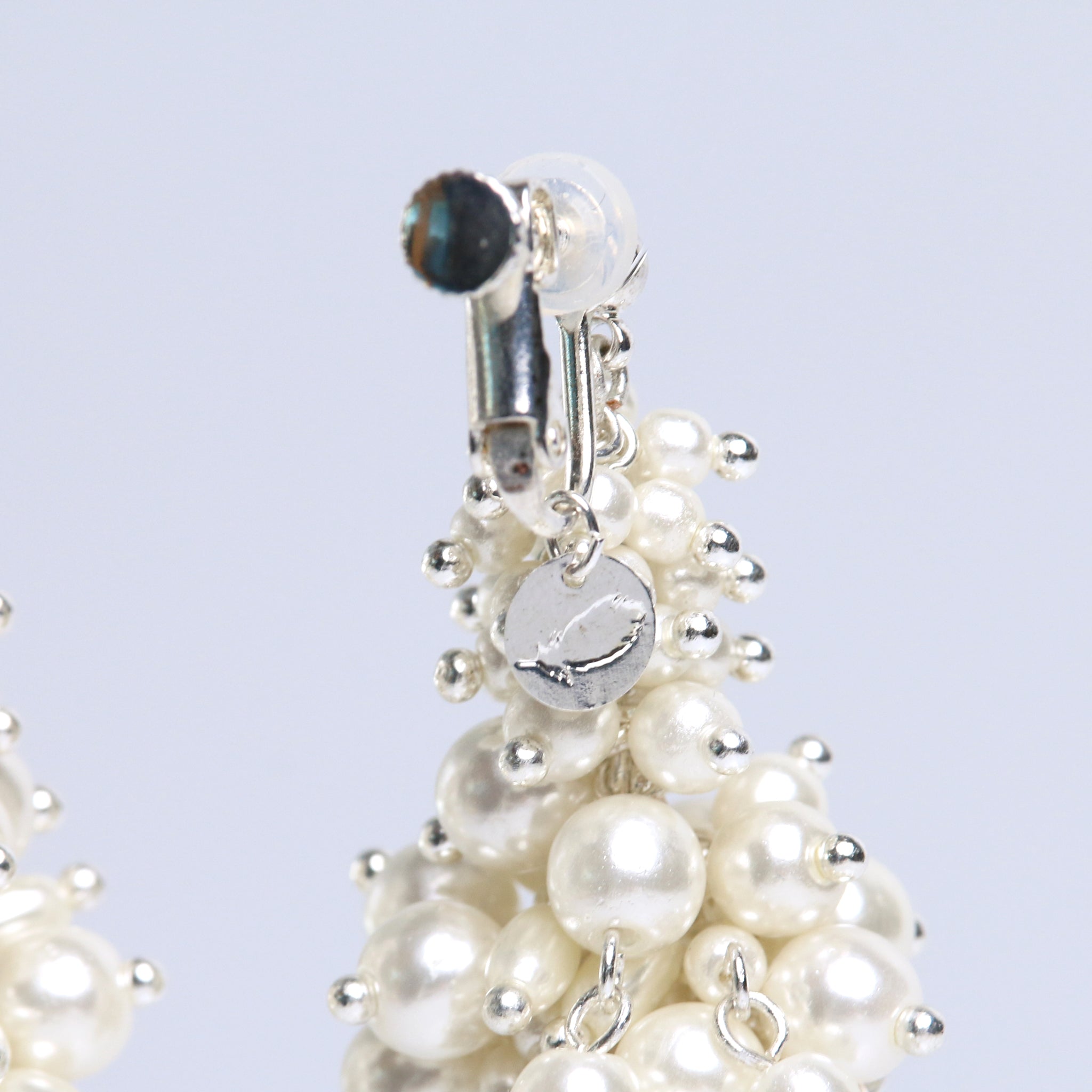 大小のパールを集めた、シャンデリアのような存在感抜群のイヤリング。繊細ながらも絶妙なボリューム感のあるデザインはお顔まわりがパッと華やぎます。ブライダルシーンや華やかなシーンでの着用もおすすめです。こちらはピアスの展開はございません。イヤリングのみとなります。