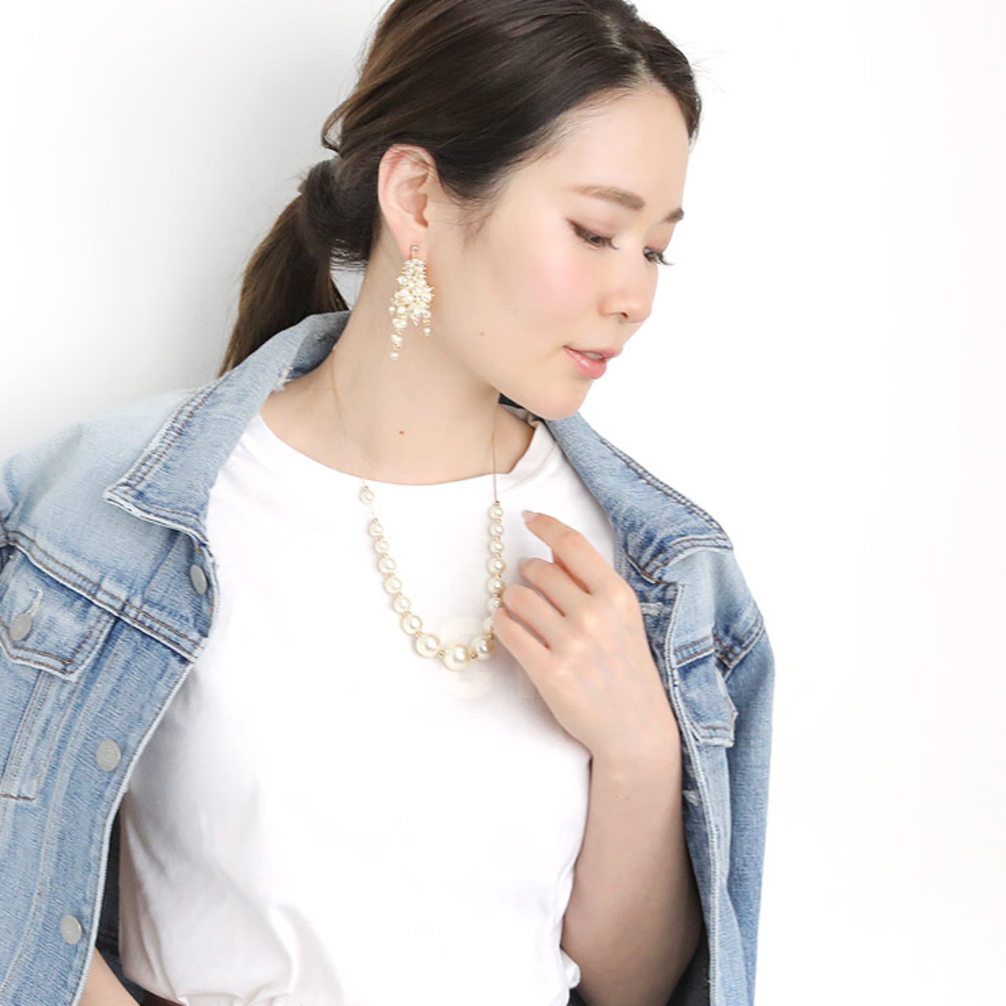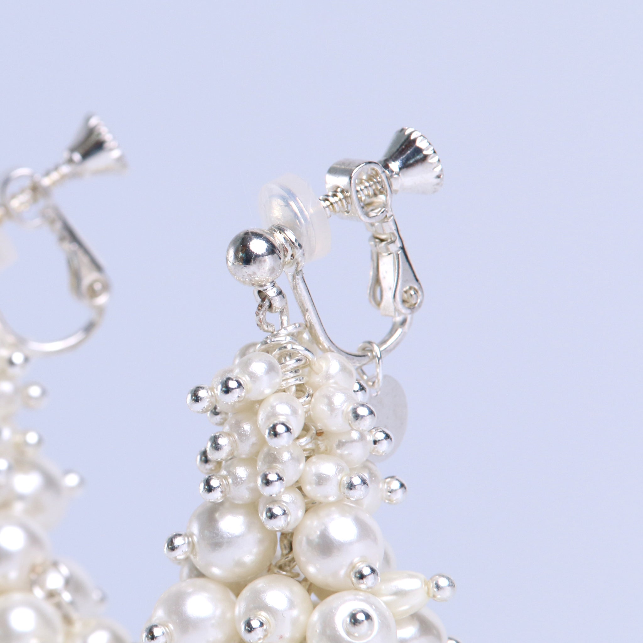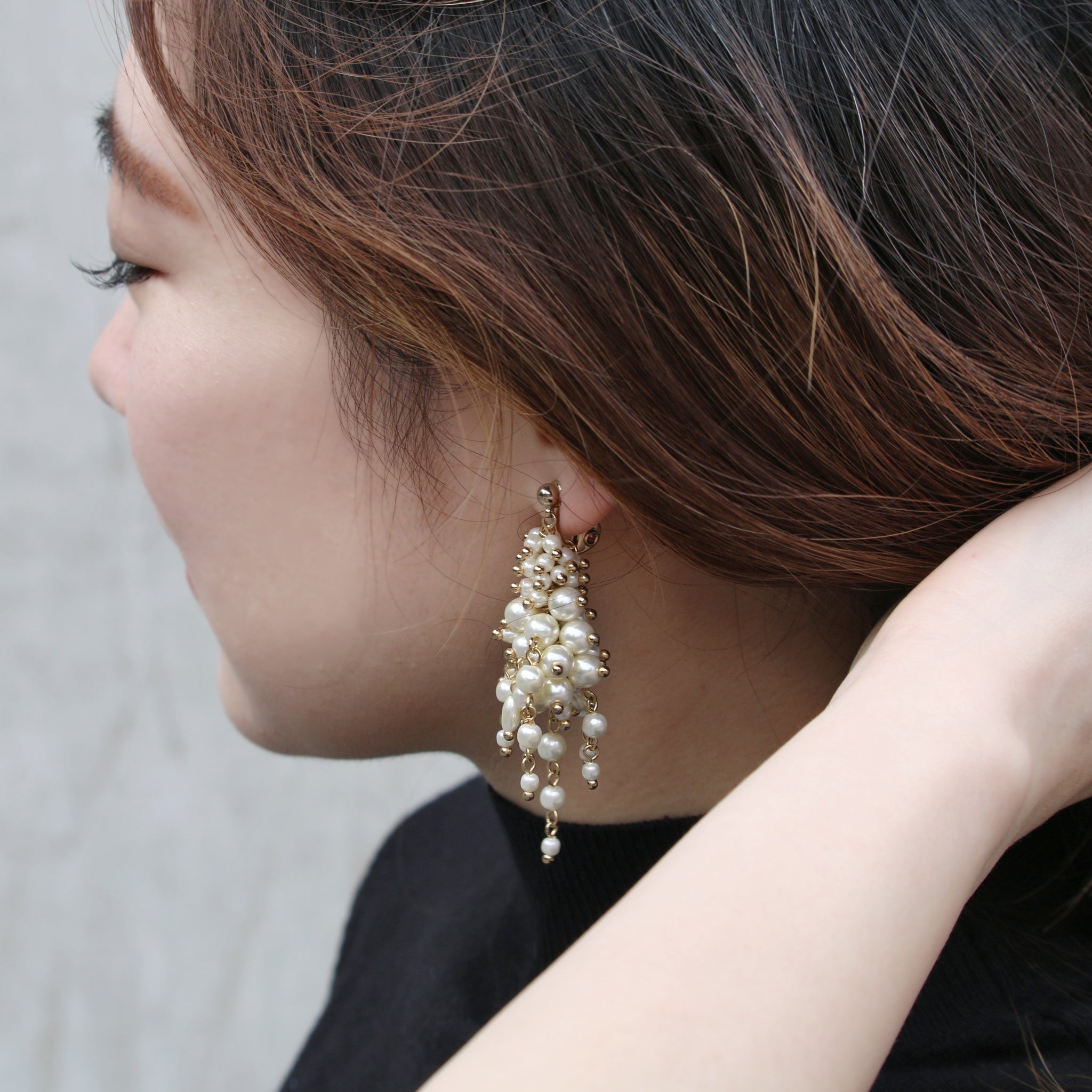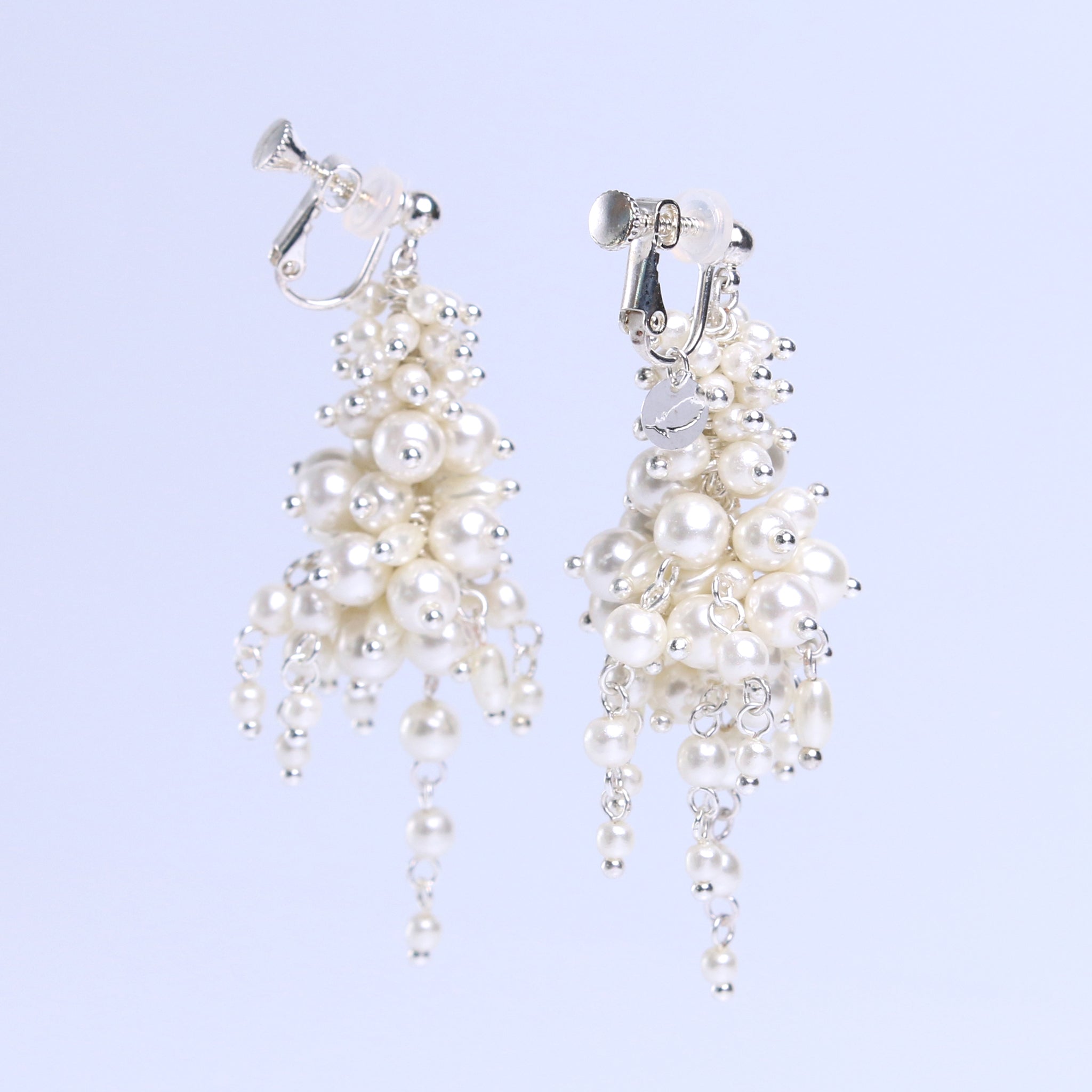 大小のパールを集めた、シャンデリアのような存在感抜群のイヤリング。繊細ながらも絶妙なボリューム感のあるデザインはお顔まわりがパッと華やぎます。ブライダルシーンや華やかなシーンでの着用もおすすめです。こちらはピアスの展開はございません。イヤリングのみとなります。