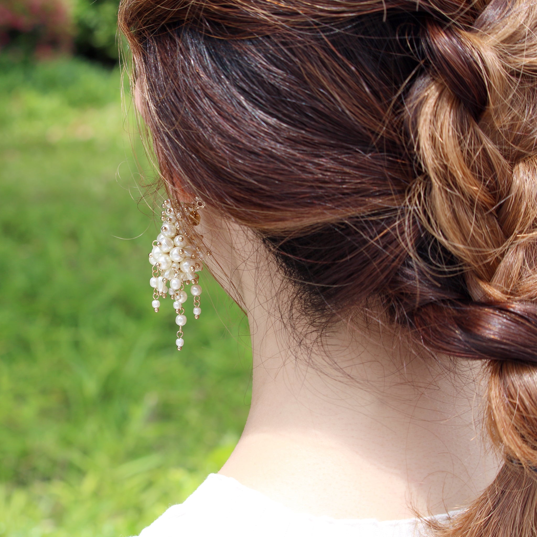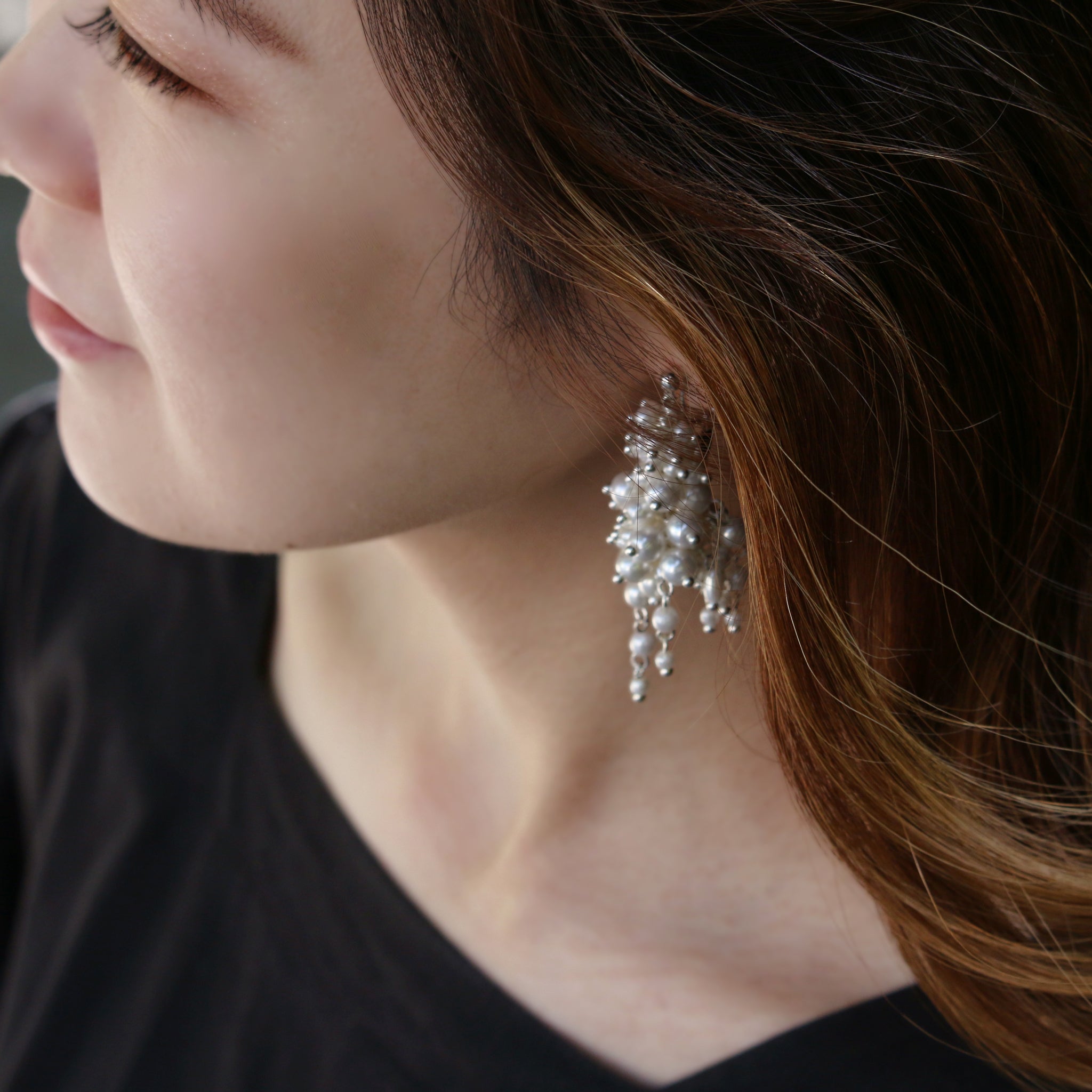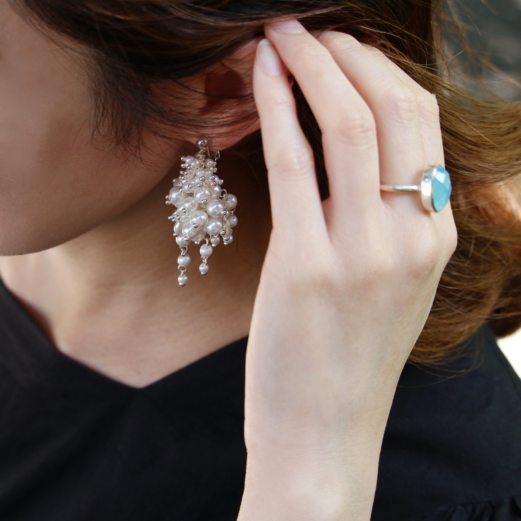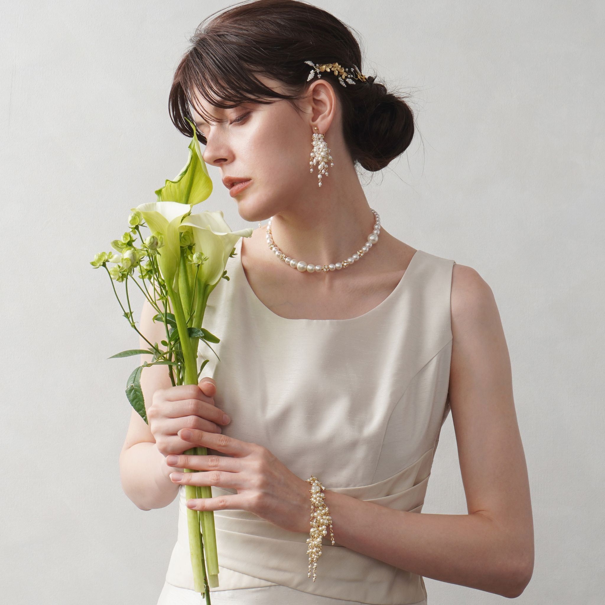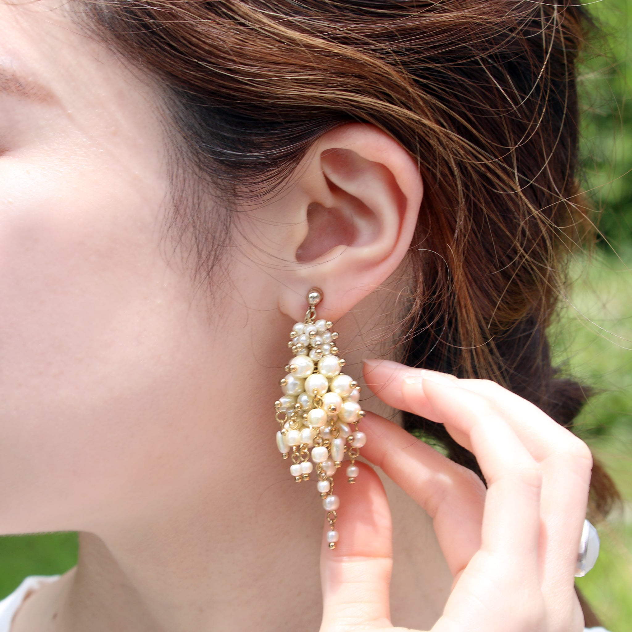 耳元で揺れるたび、ときめき実るパールたち。シンプルなドレスにも映える優雅な流線。