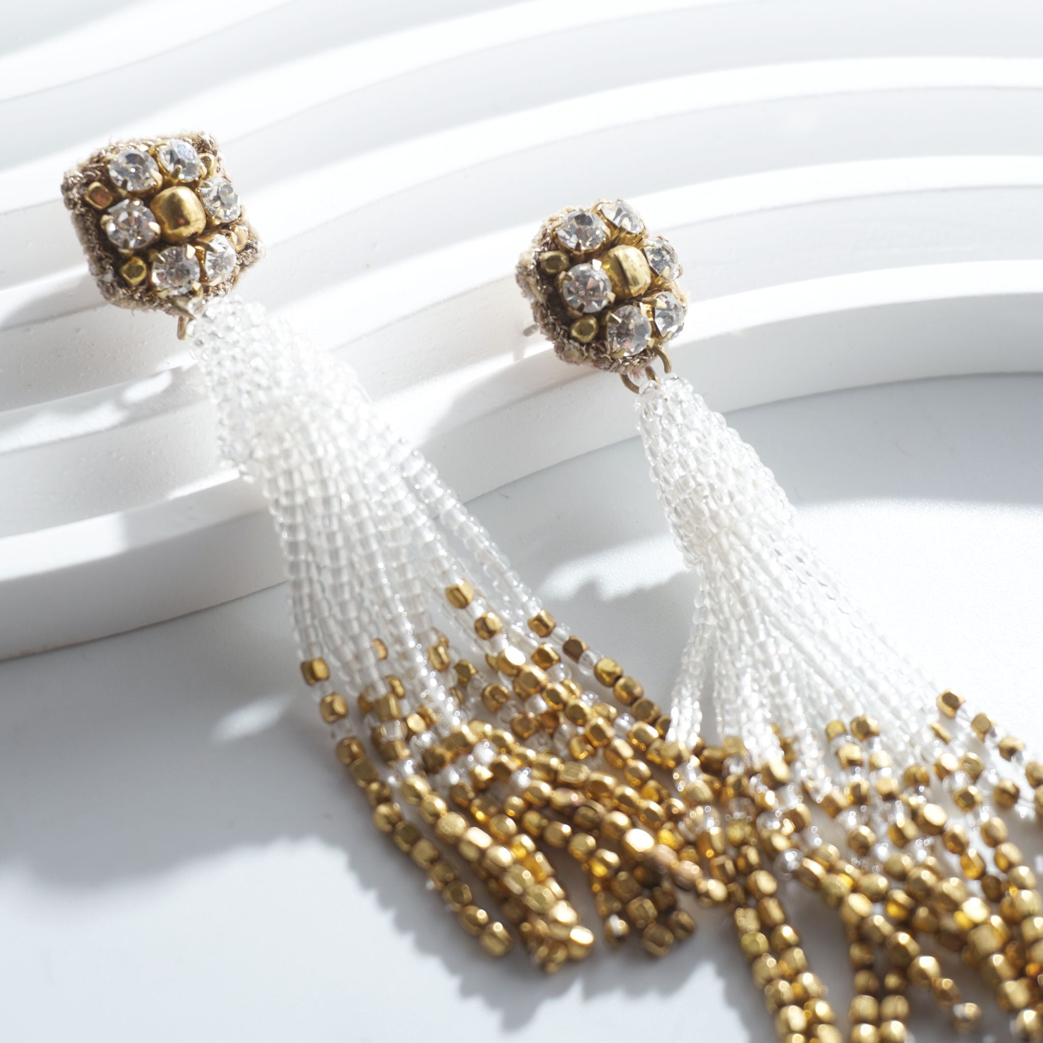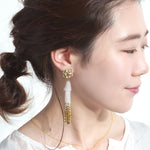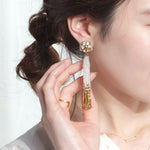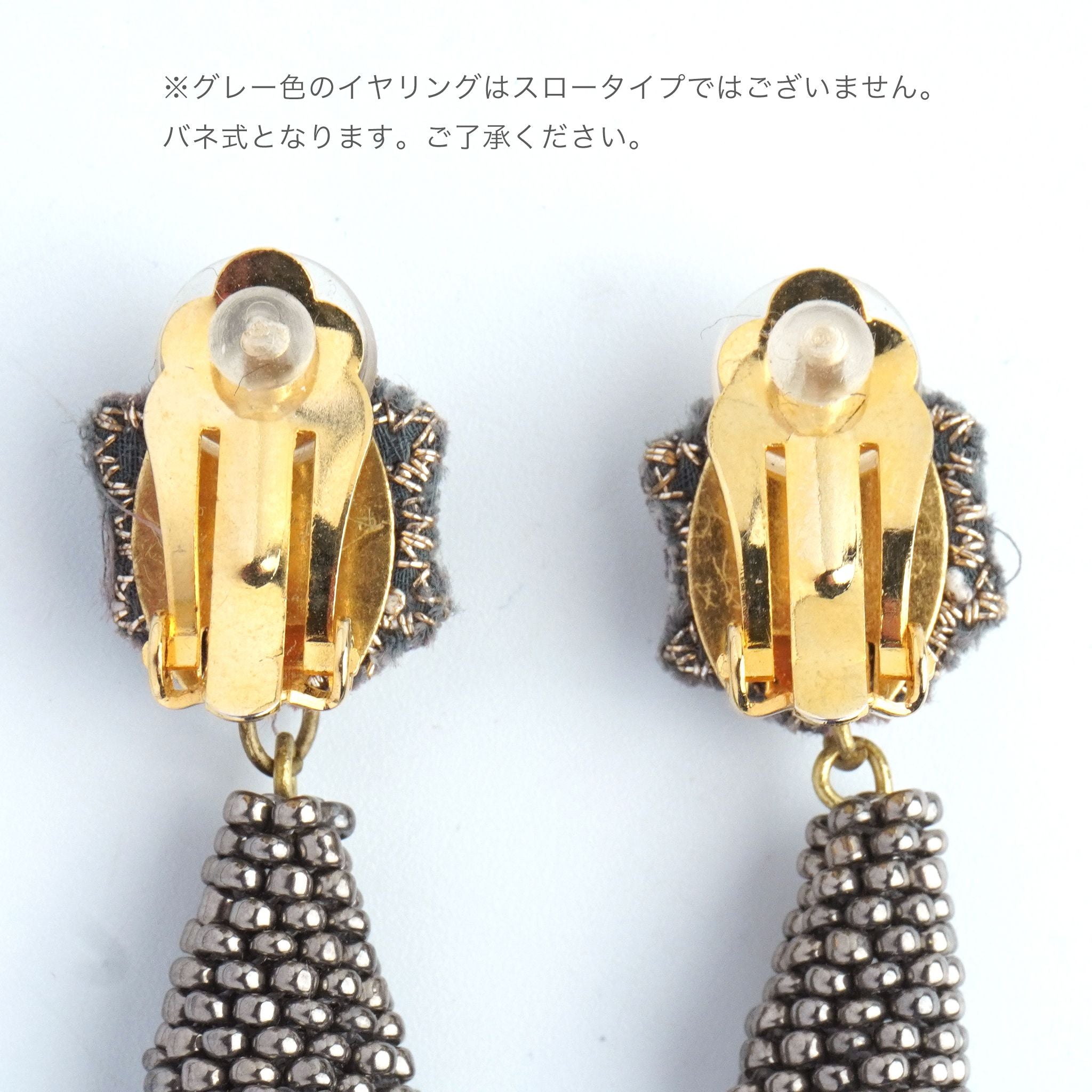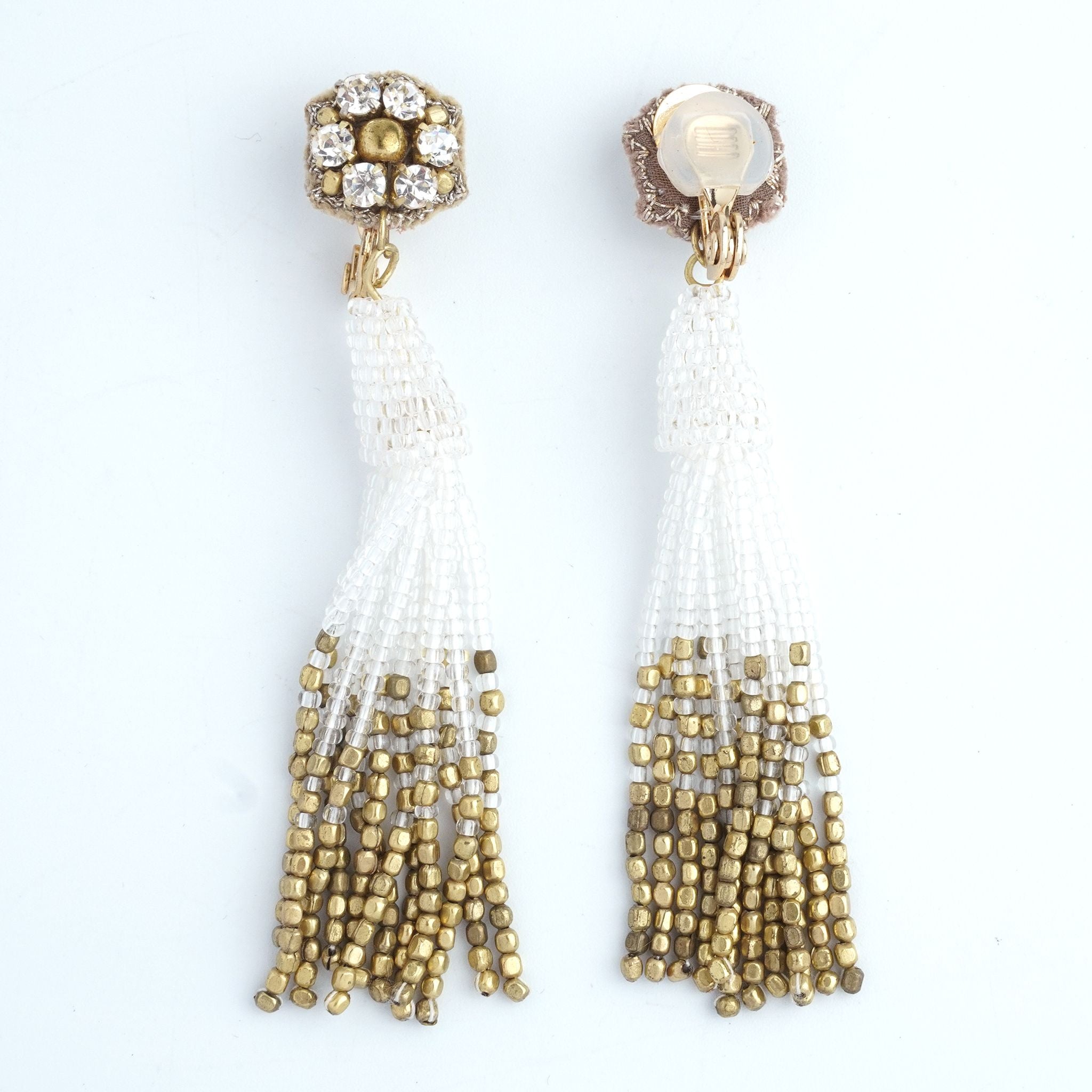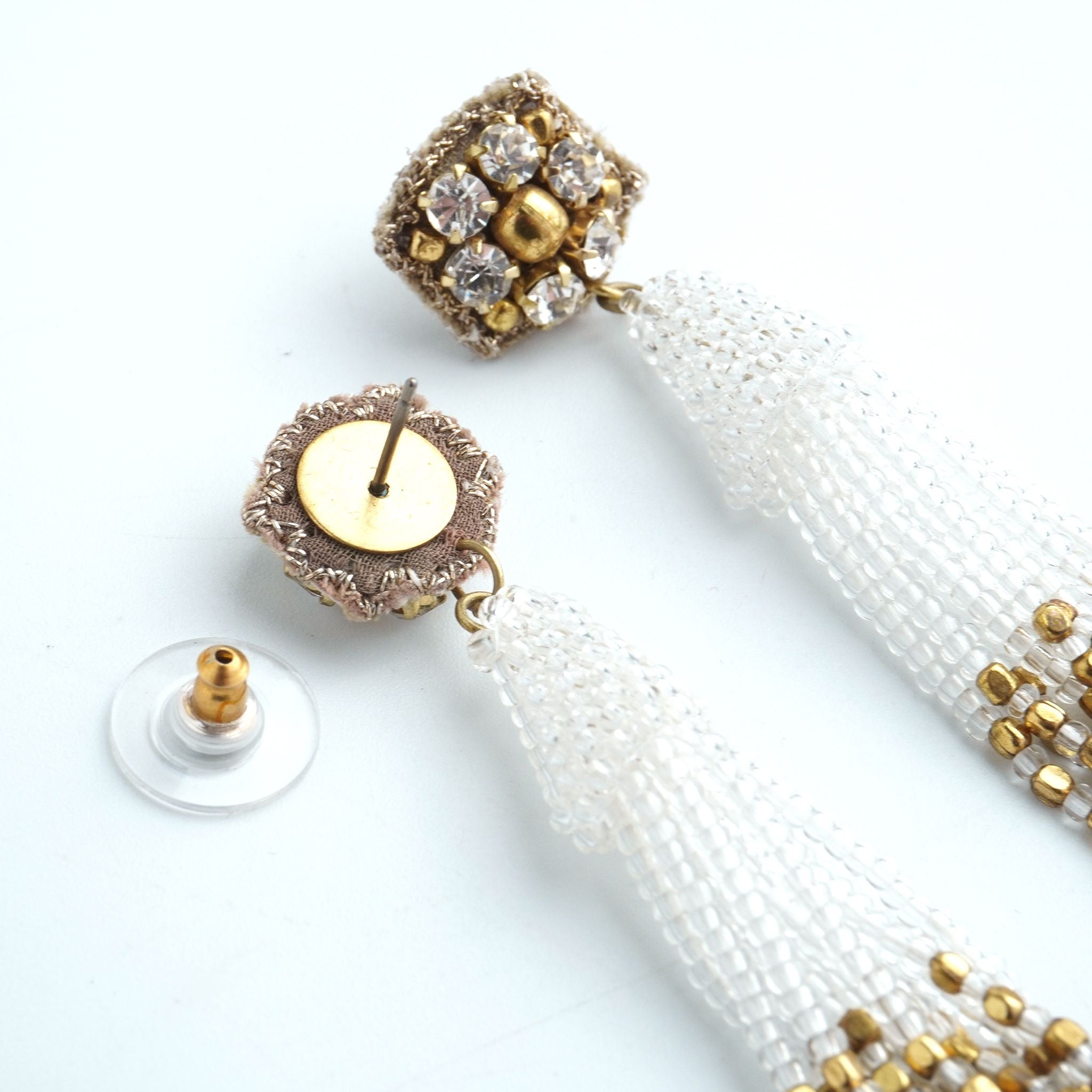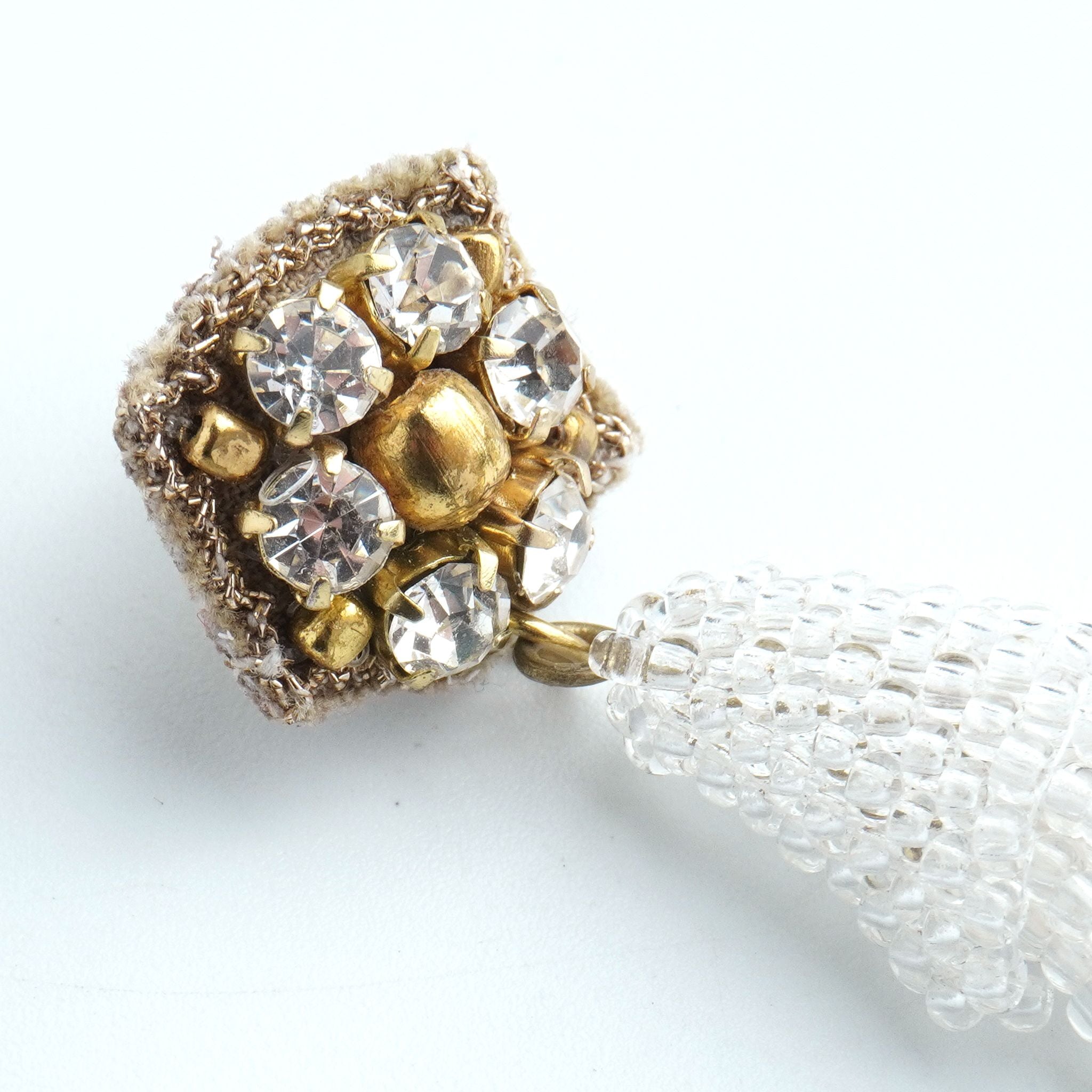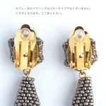小ぶりのビーズ刺繍モチーフにさわやかなクリアのタッセルを組み合わせました。ゆらゆらと揺れるビーズタッセルの下部にはゴールドのビーズをアクセントに入れ、ボリューム感があり華やかな印象に。涼し気を感じ、春夏にピッタリのアクセサリーです。