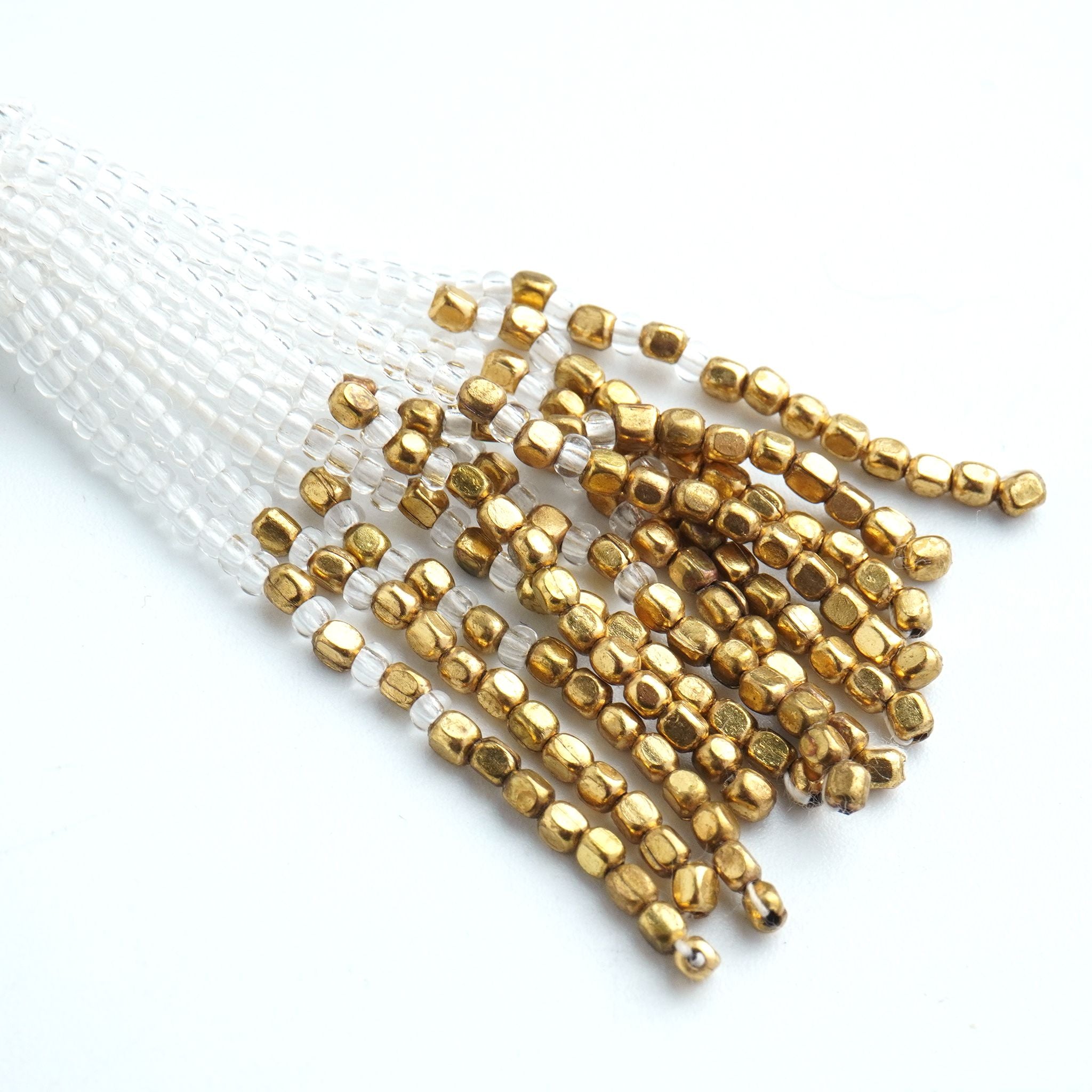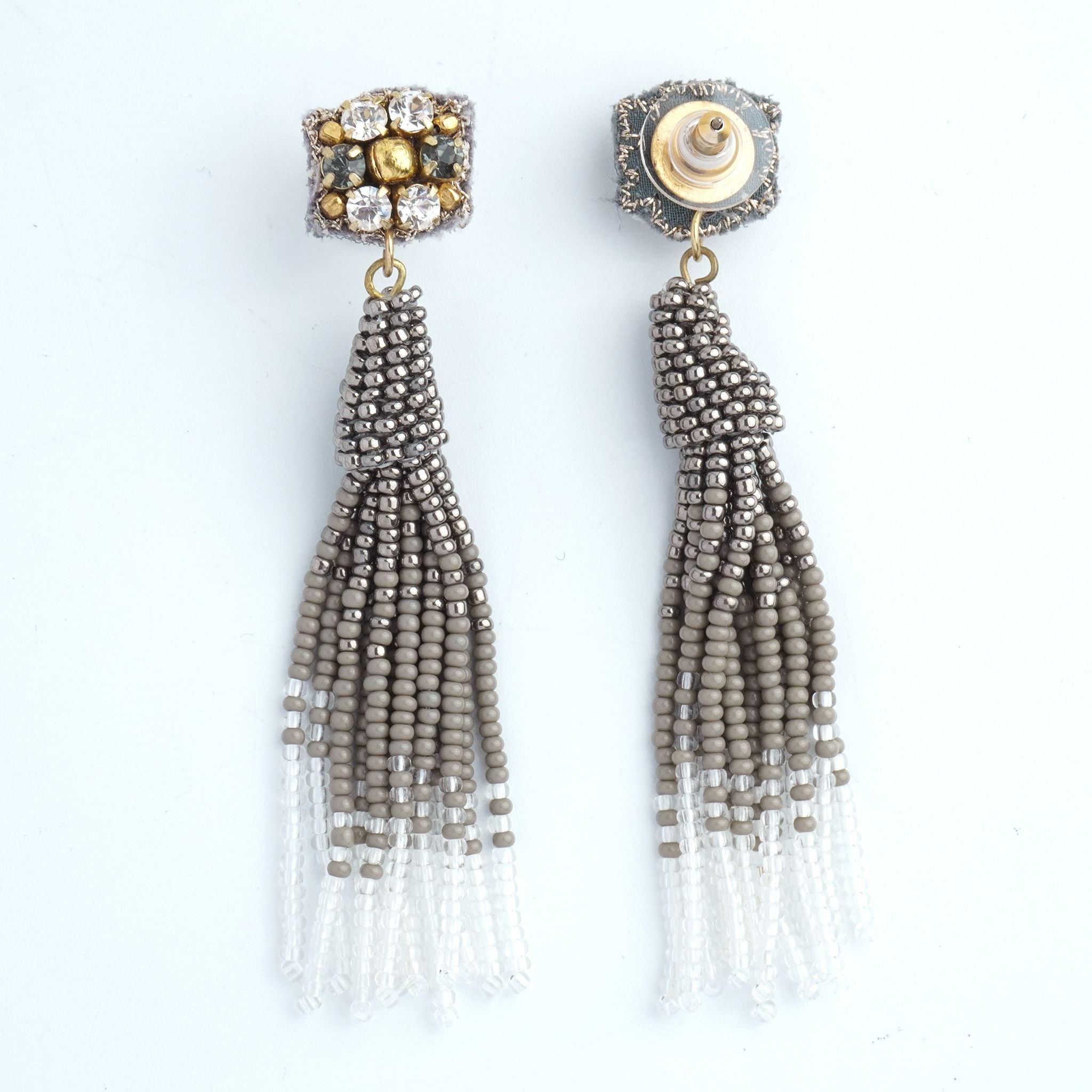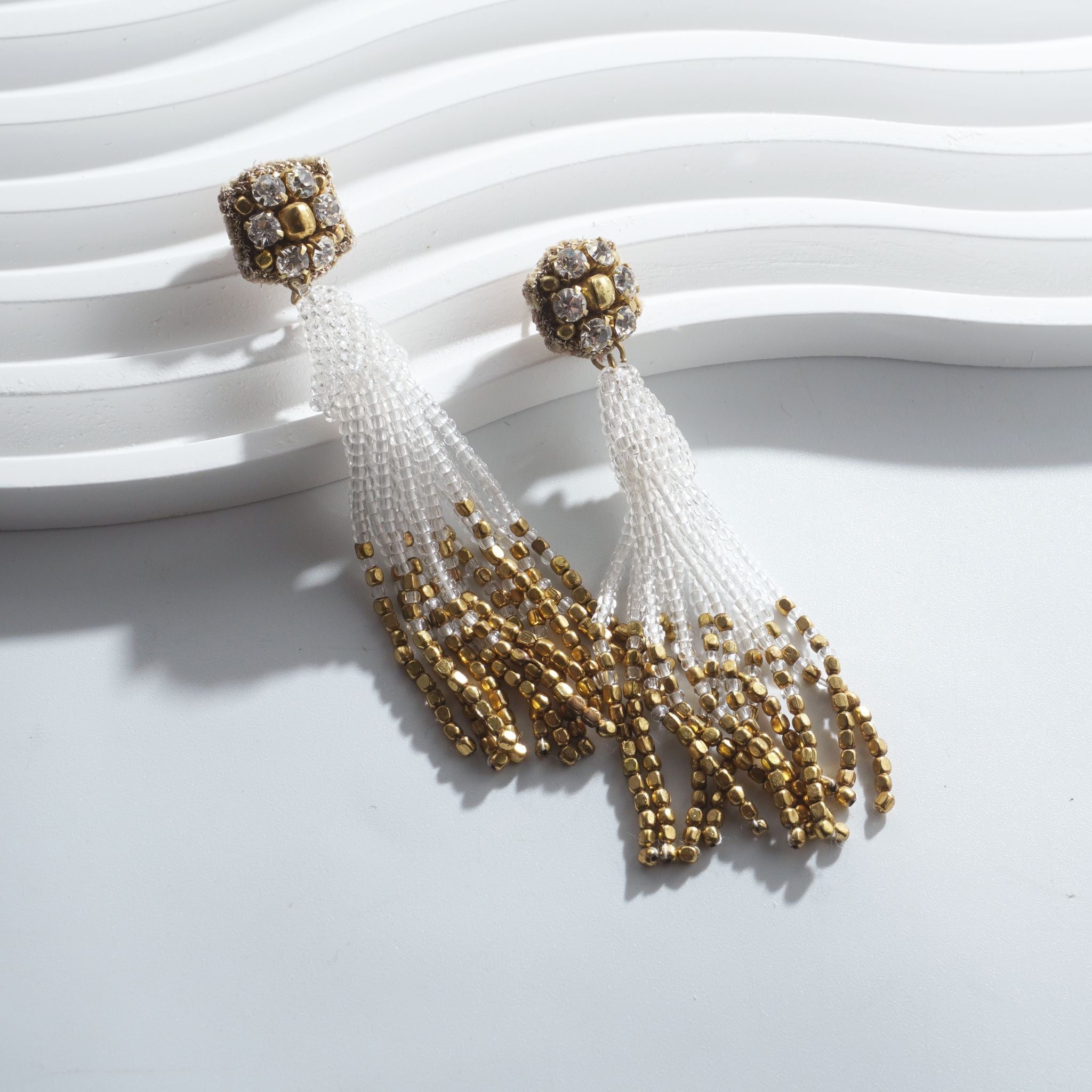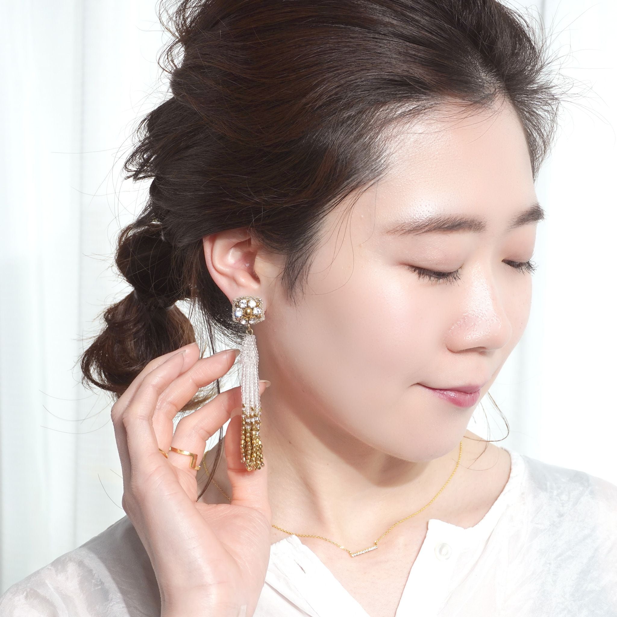小ぶりのビーズ刺繍モチーフにさわやかなクリアのタッセルを組み合わせました。ゆらゆらと揺れるビーズタッセルの下部にはゴールドのビーズをアクセントに入れ、ボリューム感があり華やかな印象に。涼し気を感じ、春夏にピッタリのアクセサリーです。