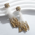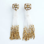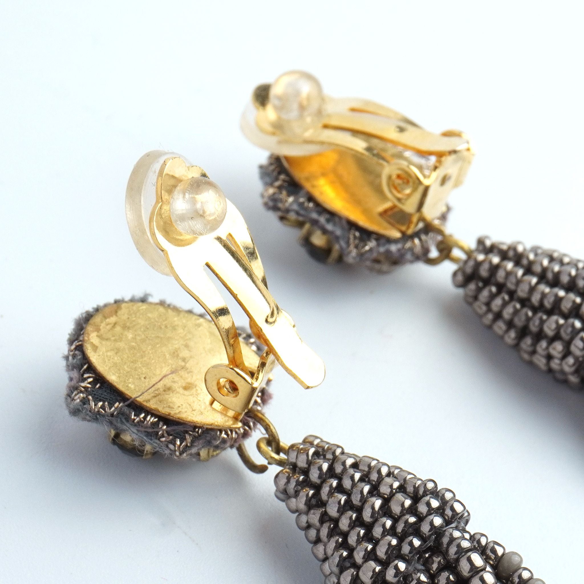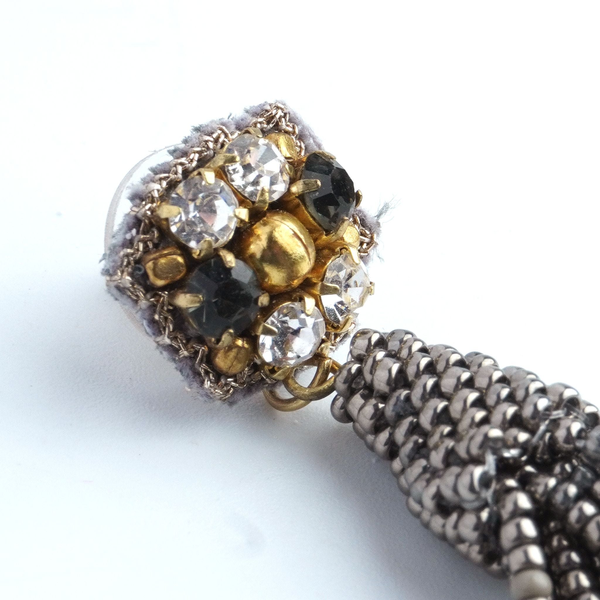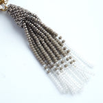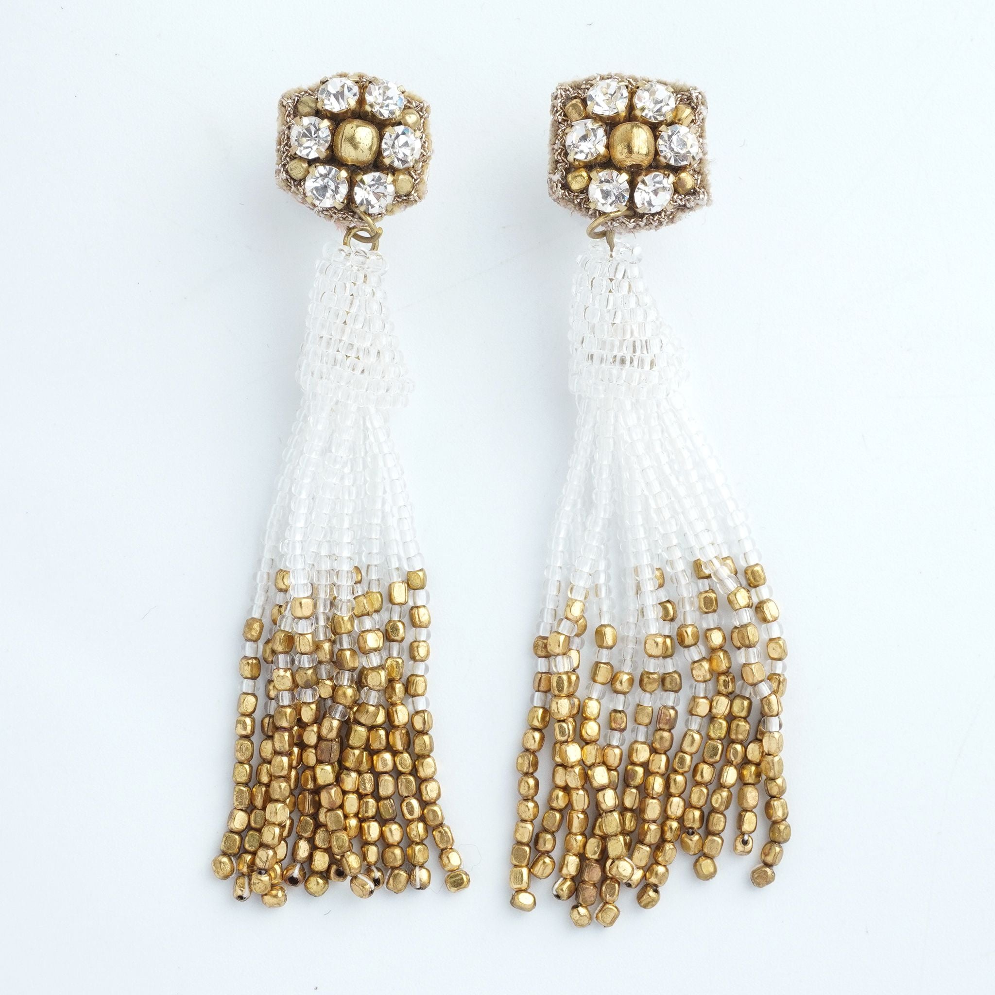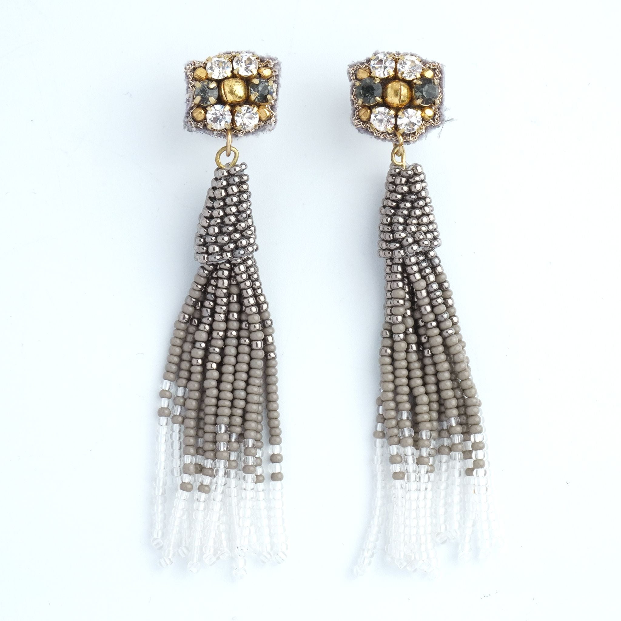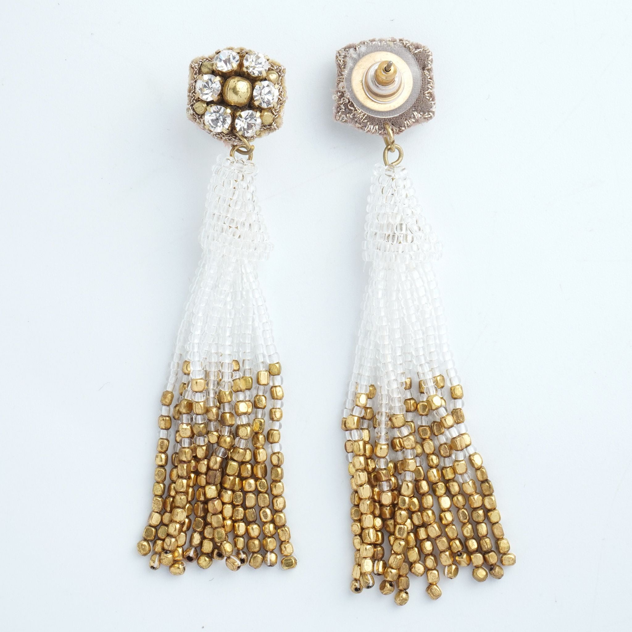 小ぶりのビーズ刺繍モチーフにさわやかなクリアのタッセルを組み合わせました。ゆらゆらと揺れるビーズタッセルの下部にはゴールドのビーズをアクセントに入れ、ボリューム感があり華やかな印象に。涼し気を感じ、春夏にピッタリのアクセサリーです。