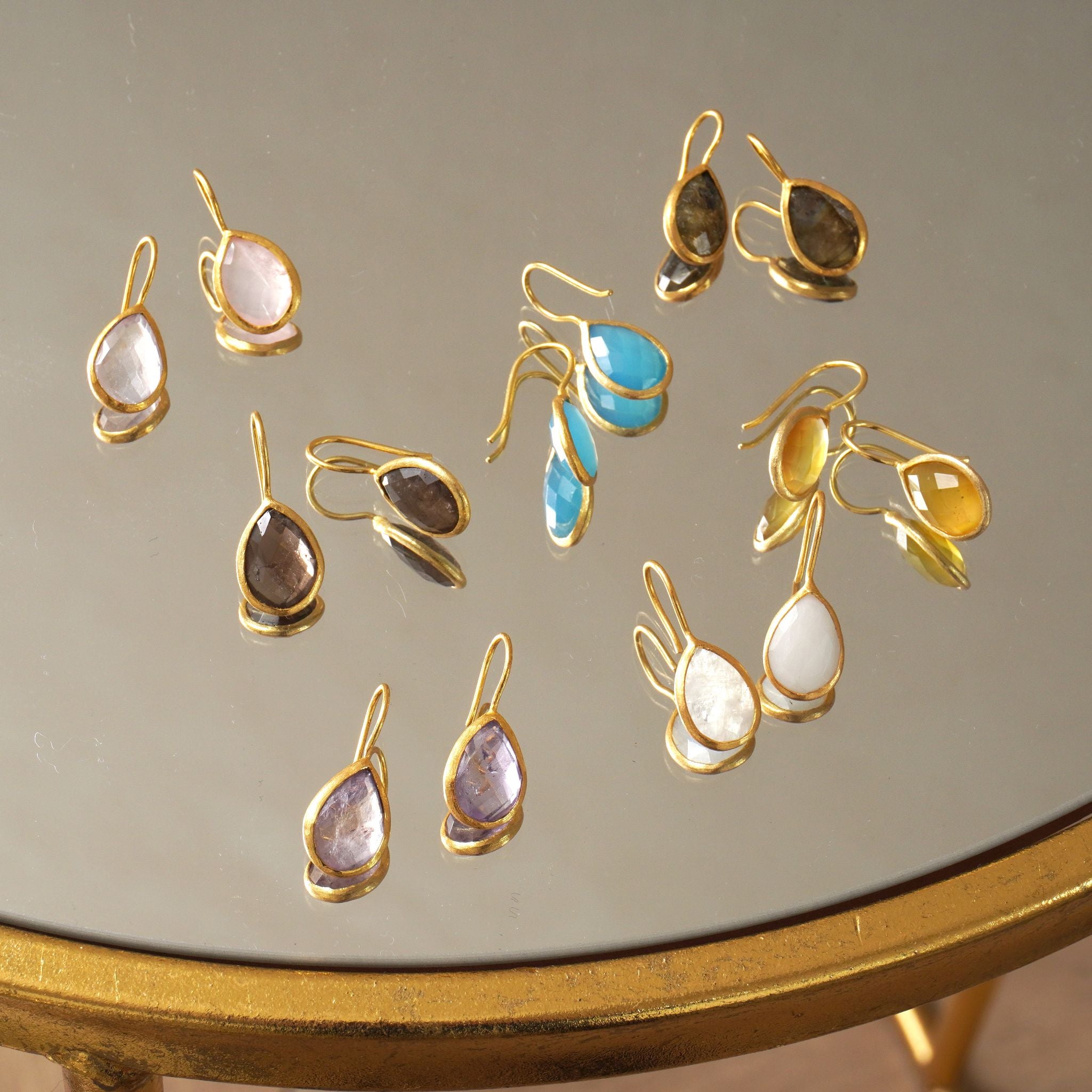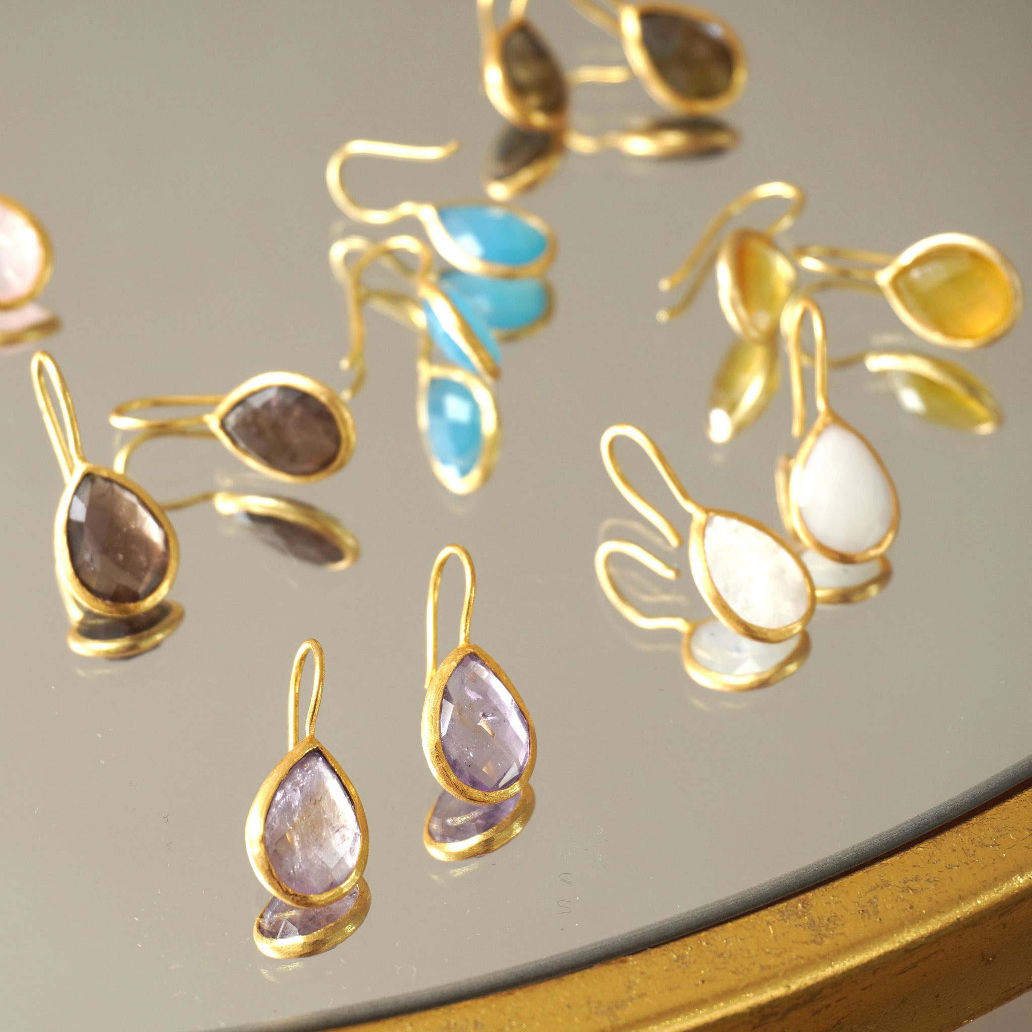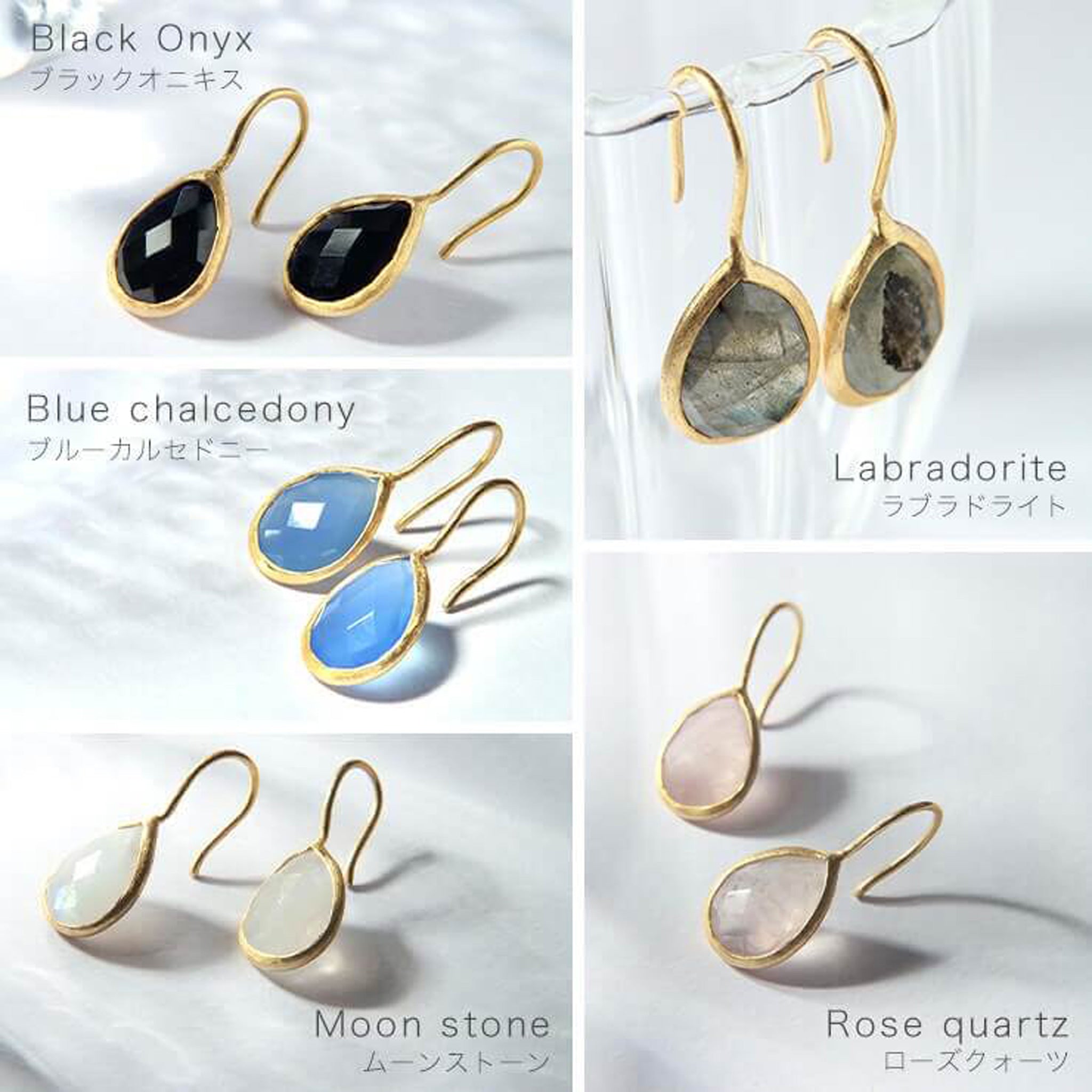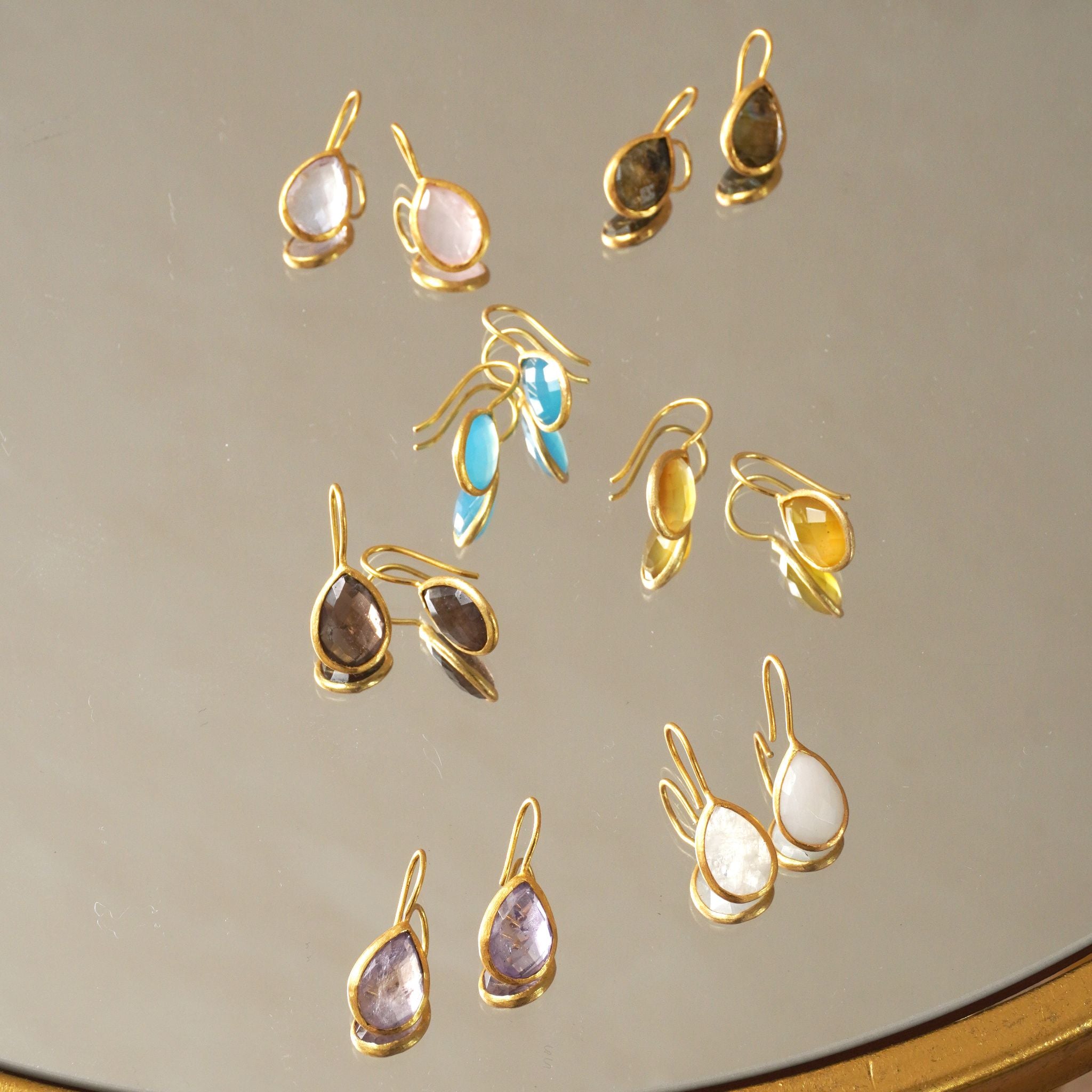 インド・ジャイプールで厳選された良質の天然石。厳選した10種類の石にキラキラと石を輝かせるカッティングを施した華やかティアドロップピアス。