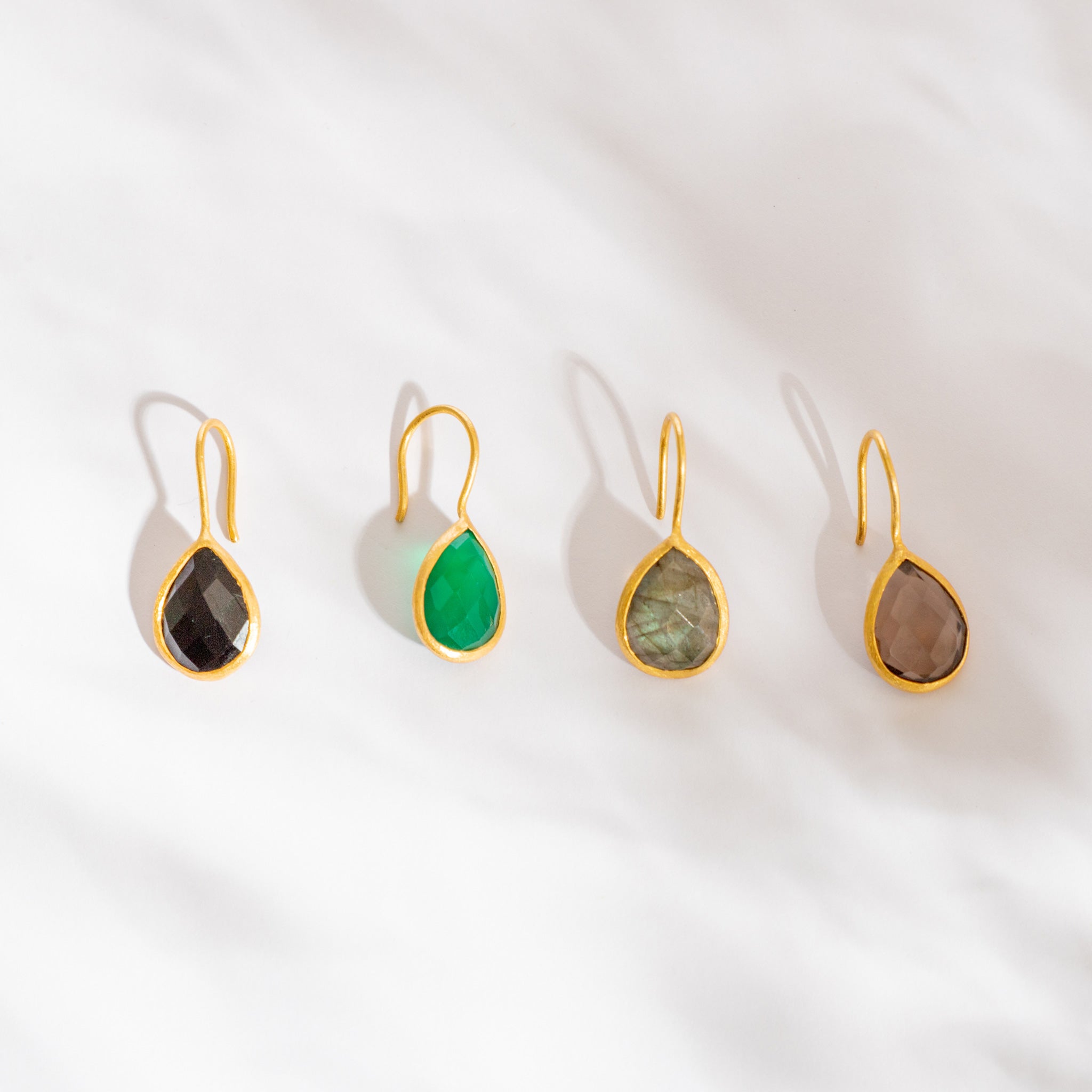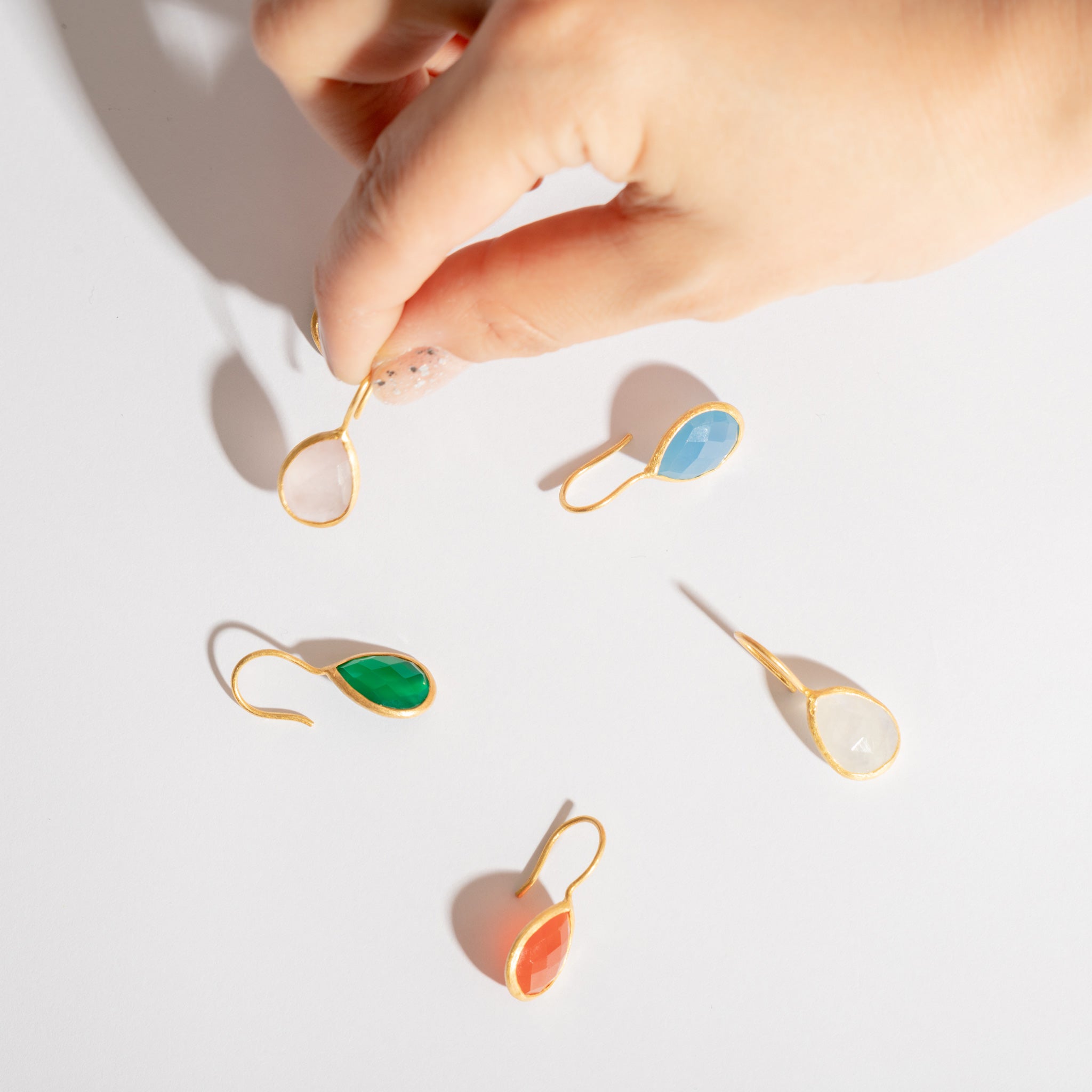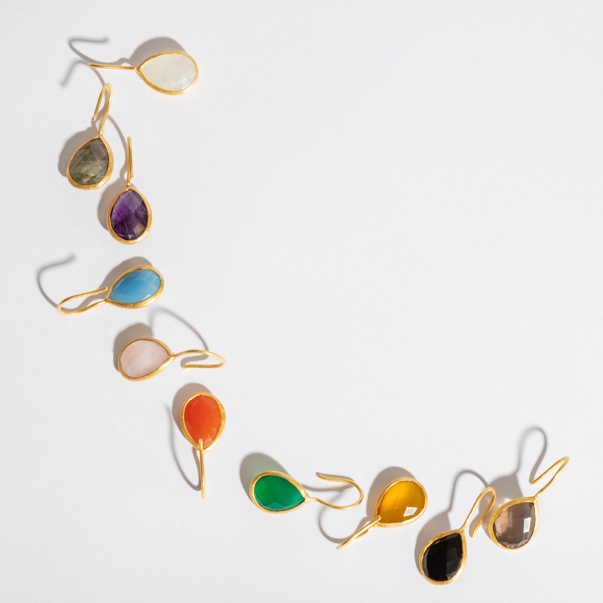 インド・ジャイプールで厳選された良質の天然石。厳選した10種類の石にキラキラと石を輝かせるカッティングを施した華やかティアドロップピアス。