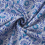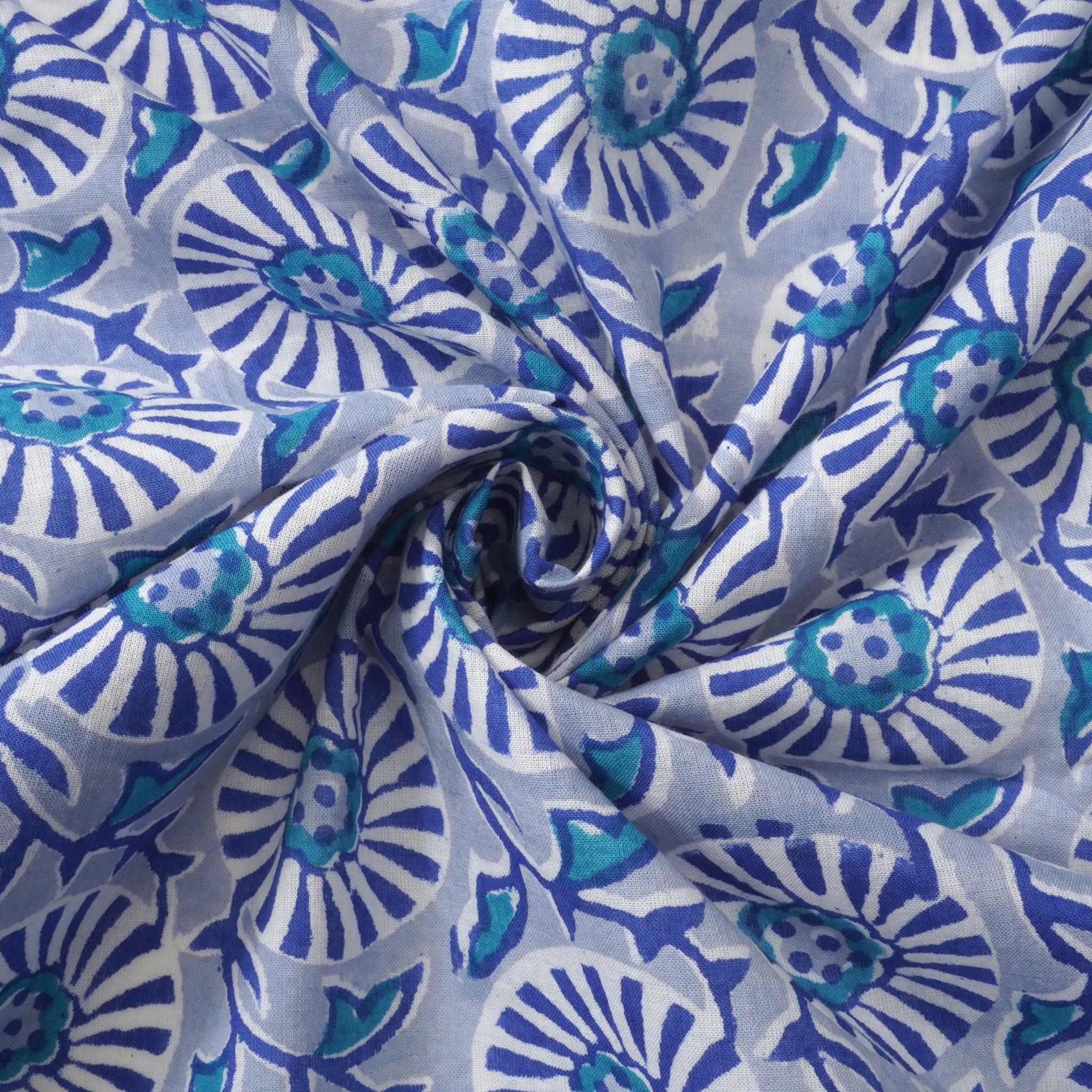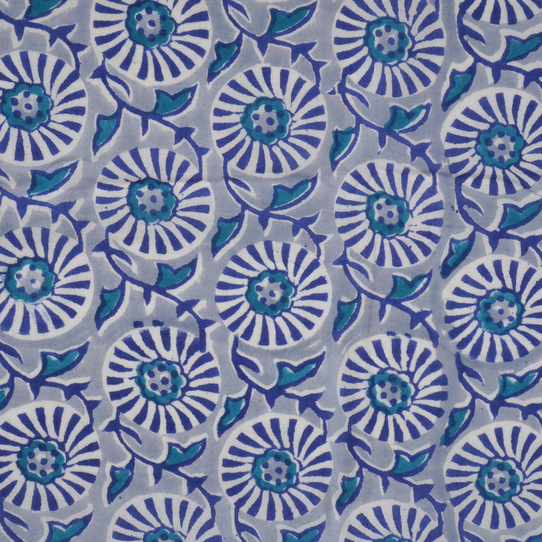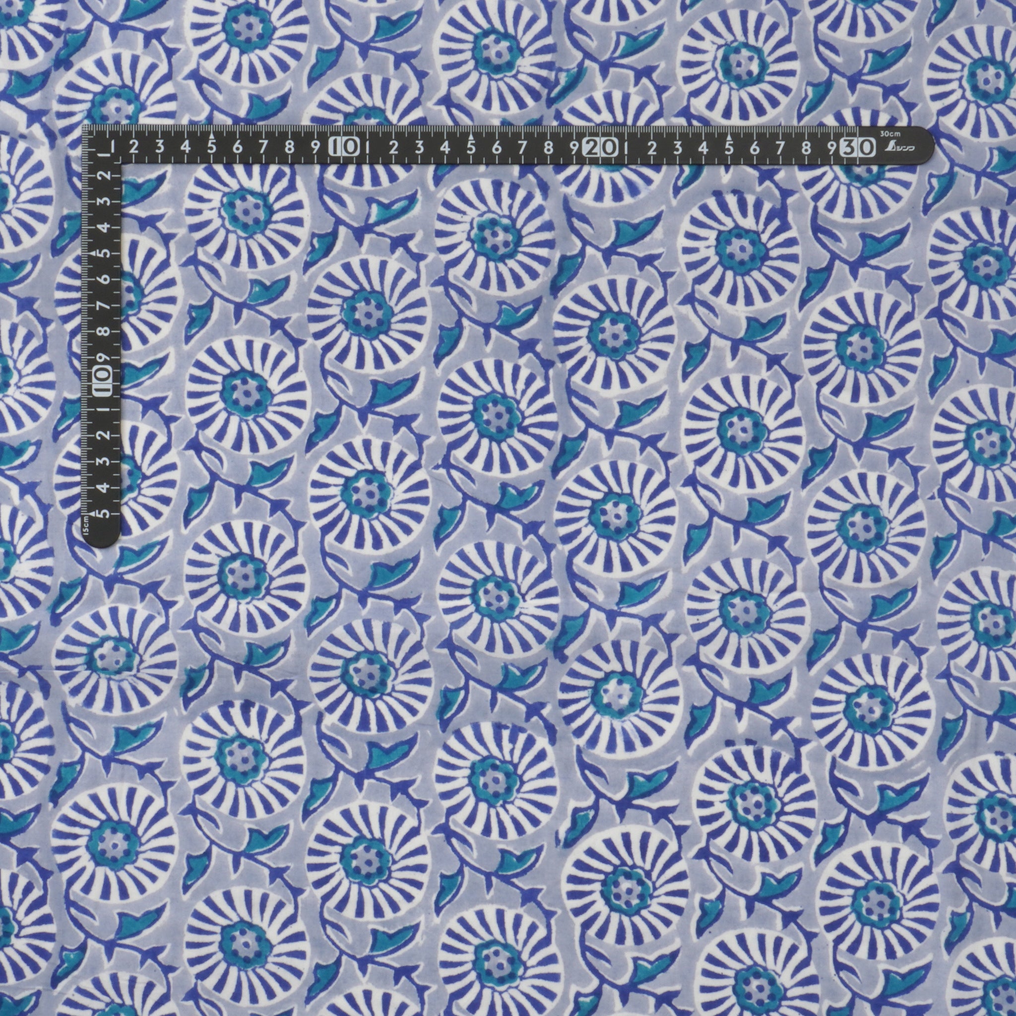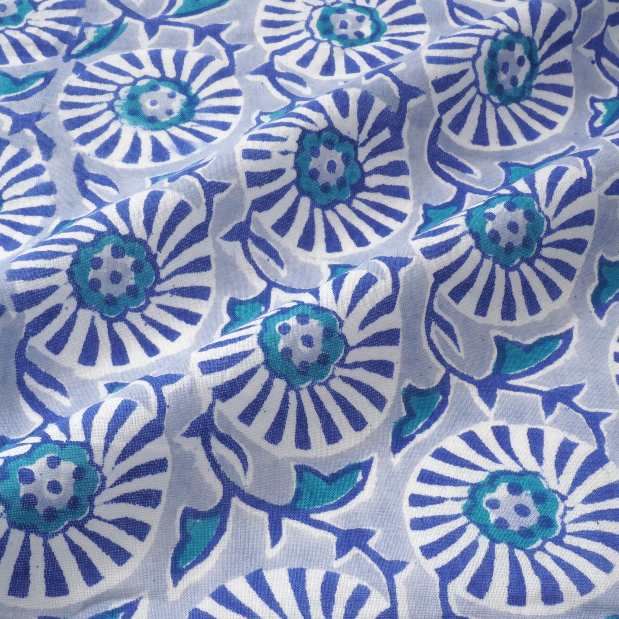 ブロックプリントの生地です。木彫りのスタンプ(ブロック)を使って、職人が1色ずつ丁寧に手作業で柄を押していく伝統的な染色技法です。柄のズレやかすれも手仕事ならではの味わいで、温もりのある風合いが魅力です。