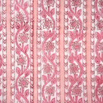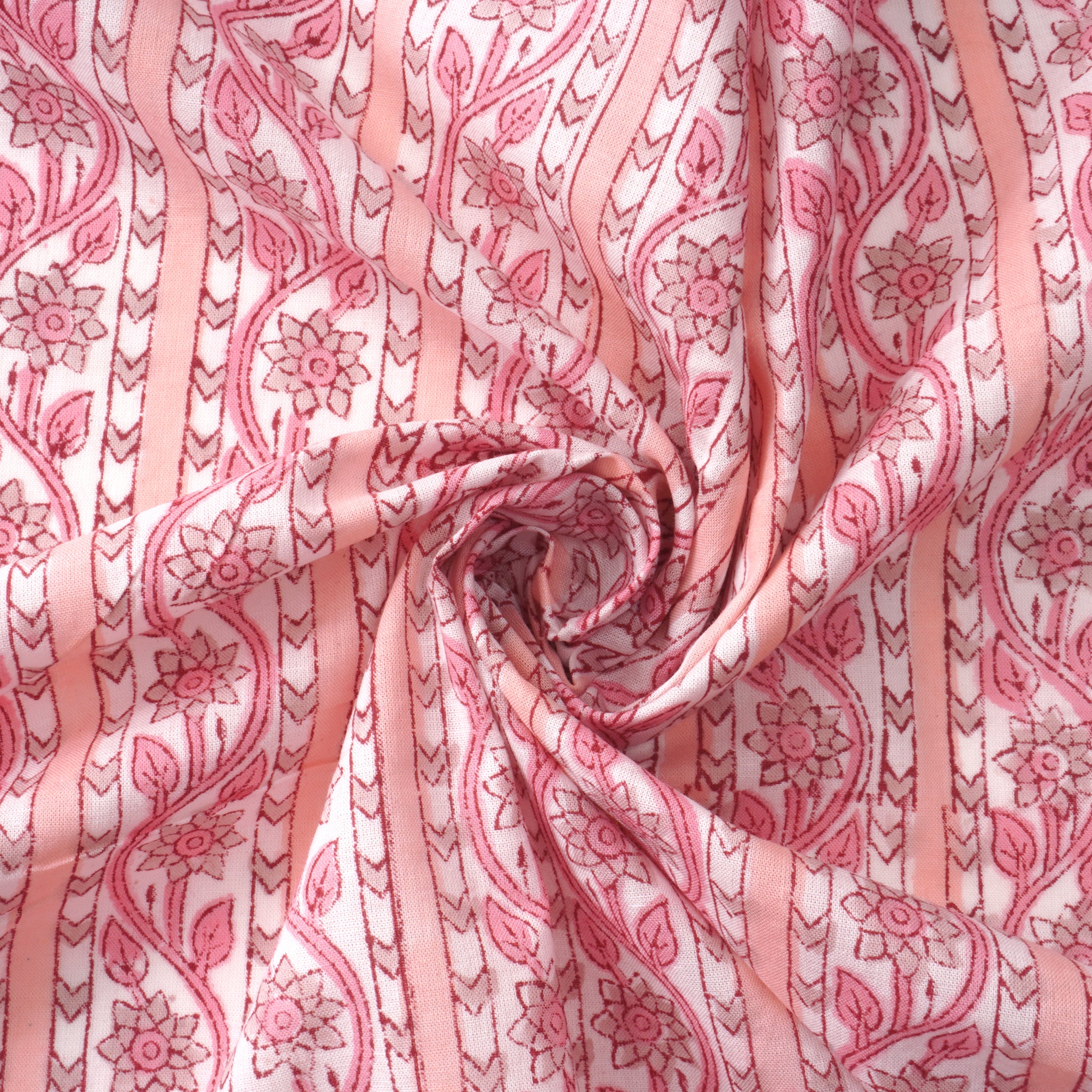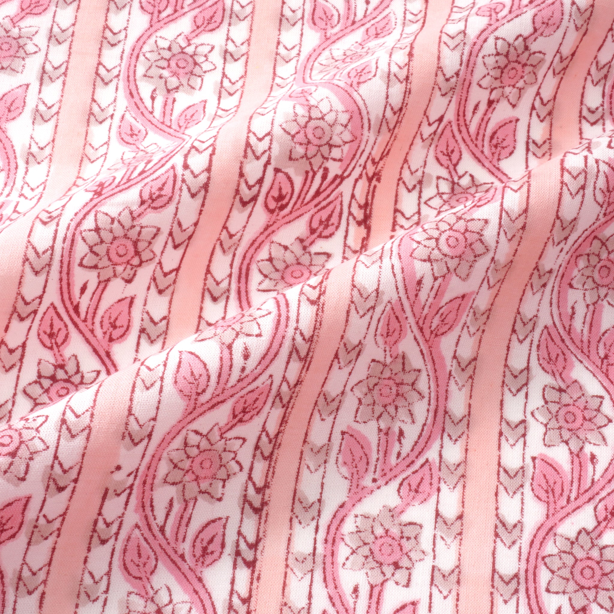 ブロックプリントの生地です。木彫りのスタンプ(ブロック)を使って、職人が1色ずつ丁寧に手作業で柄を押していく伝統的な染色技法です。柄のズレやかすれも手仕事ならではの味わいで、温もりのある風合いが魅力です。