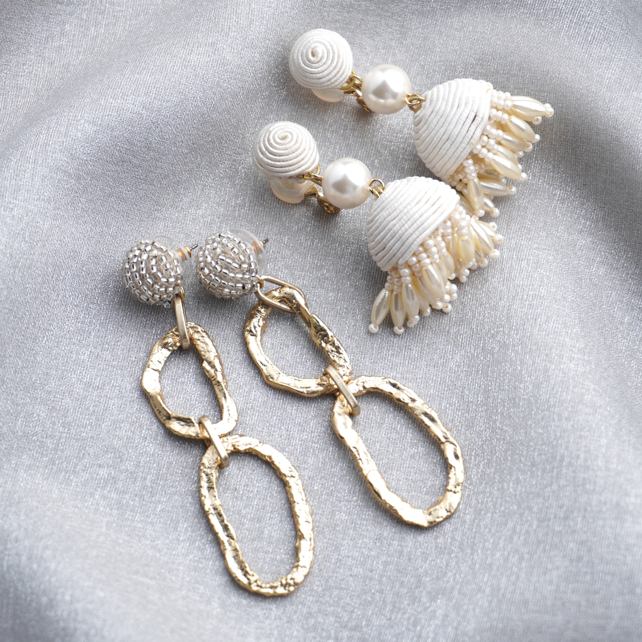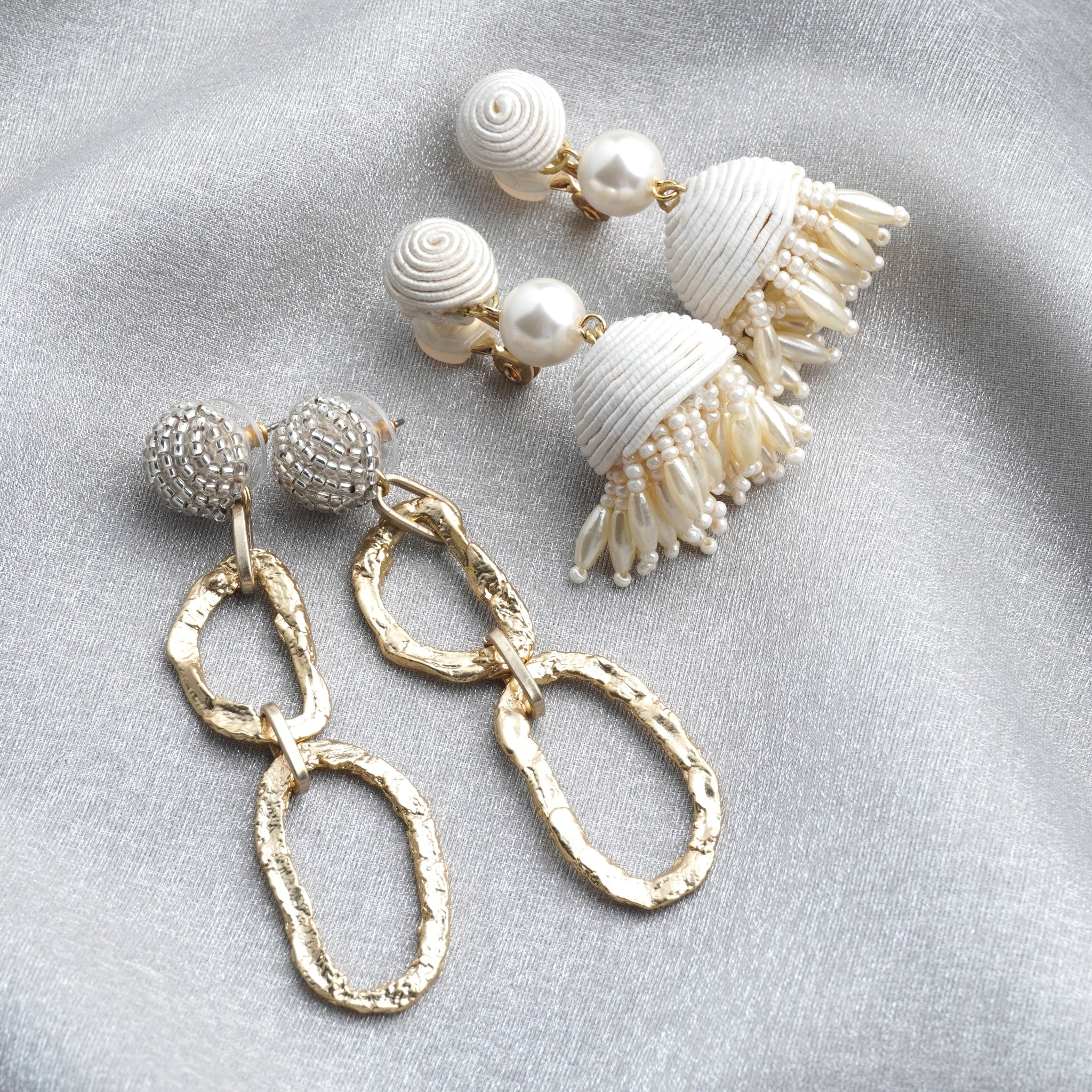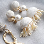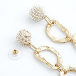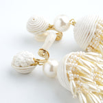 メタルチェーン:ガラス / 亜鉛 / 真鍮 / コットン / チタン(ピアスポスト) / ゴム(イヤリングカバー) / 2.ボンボンタッセル :コットン / アクリルパール / ガラス / 真鍮 / チタン(ピアスポスト) / ゴム(イヤリングカバー)