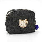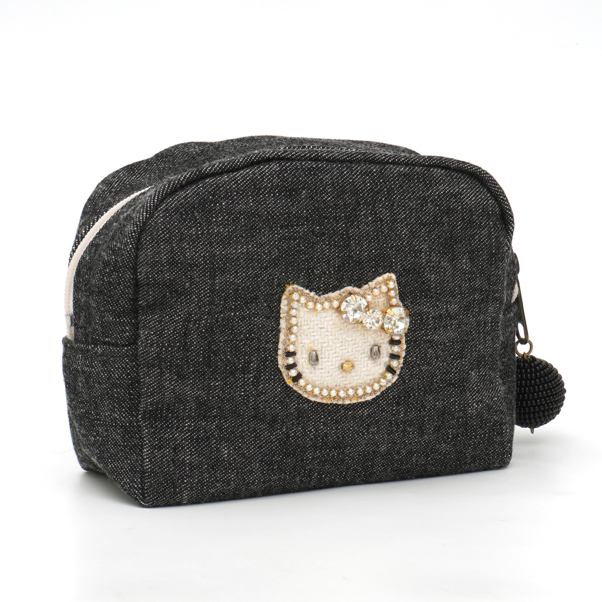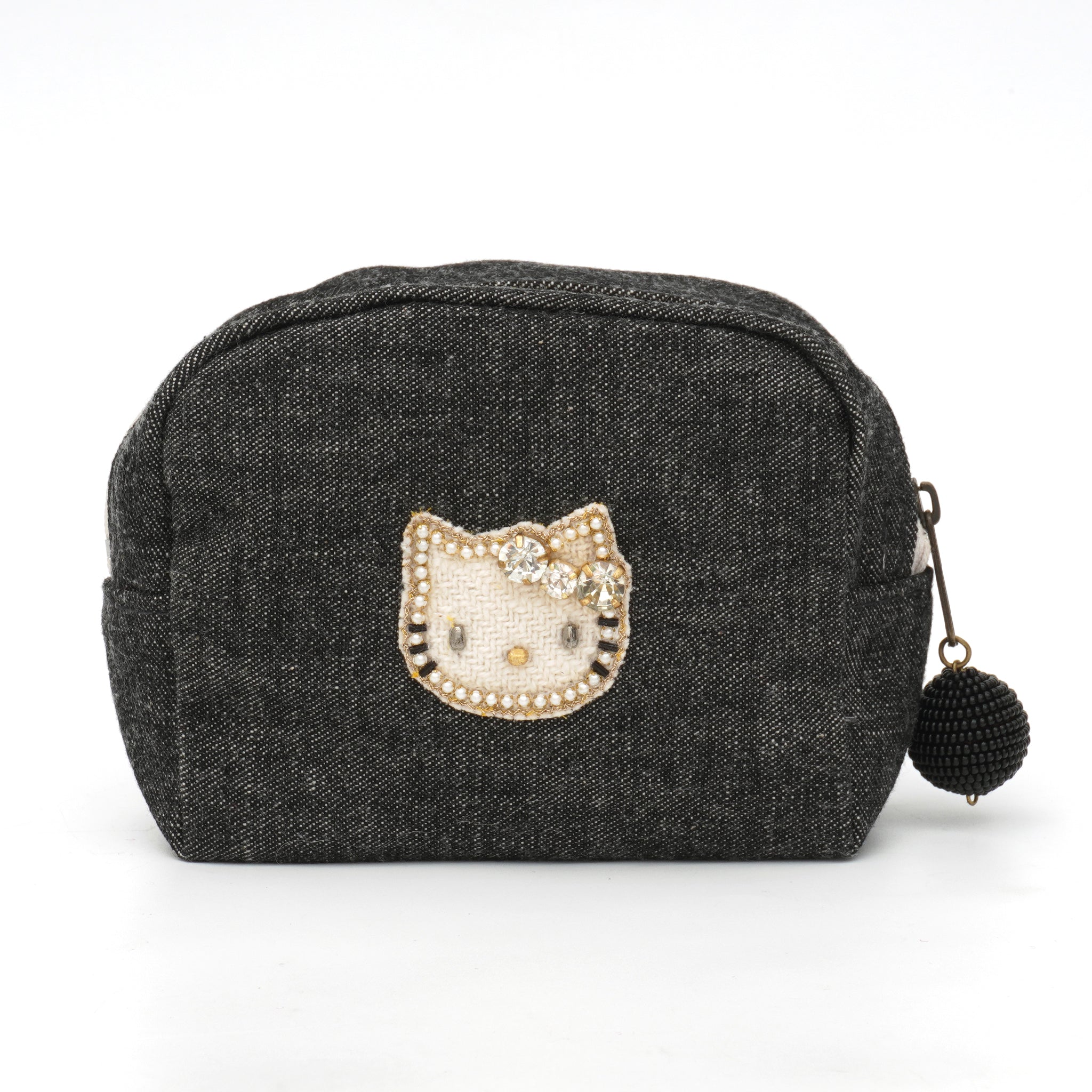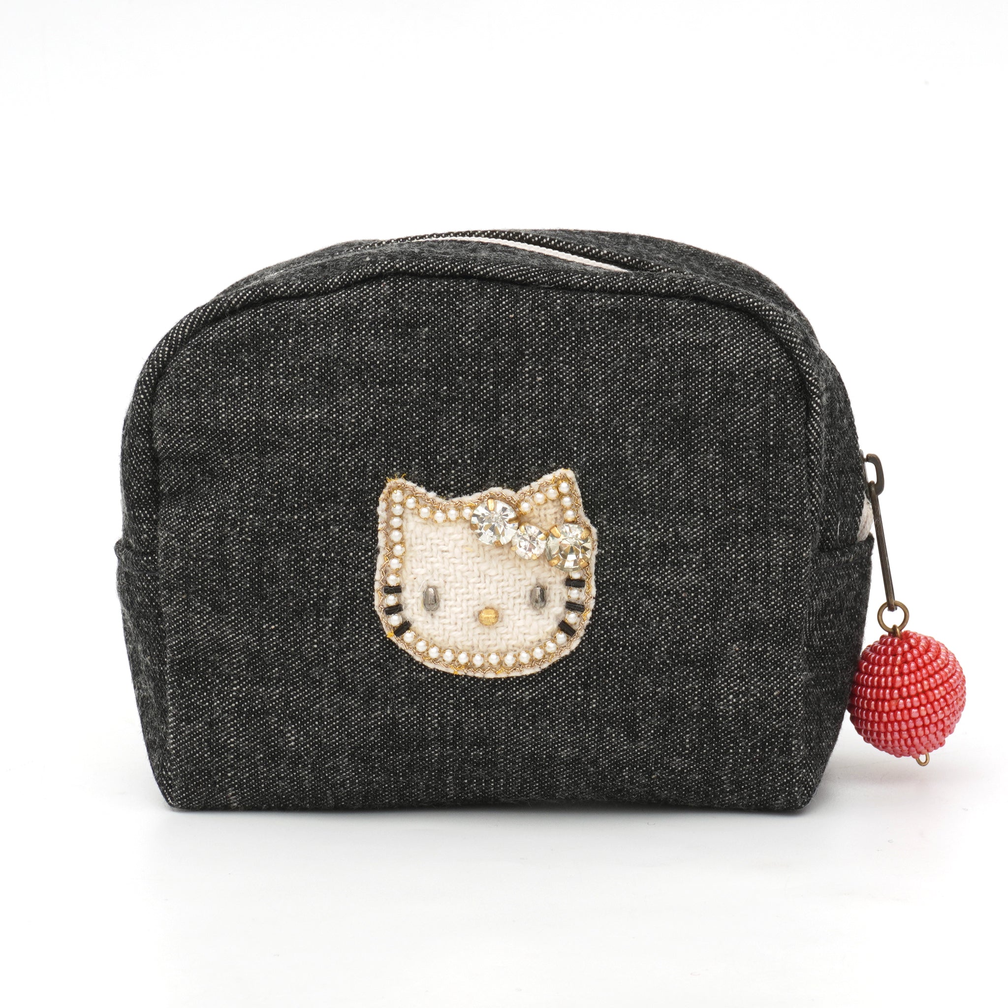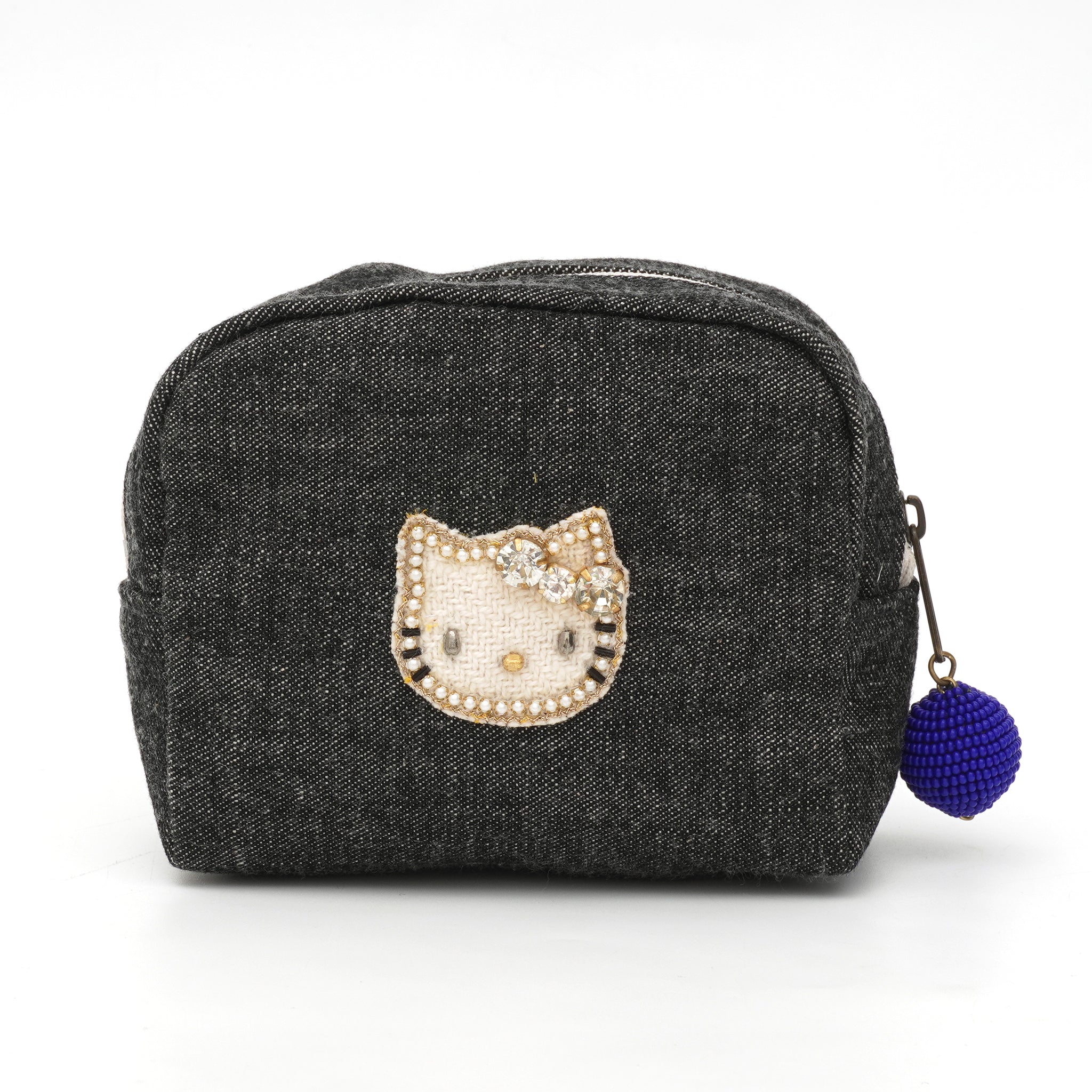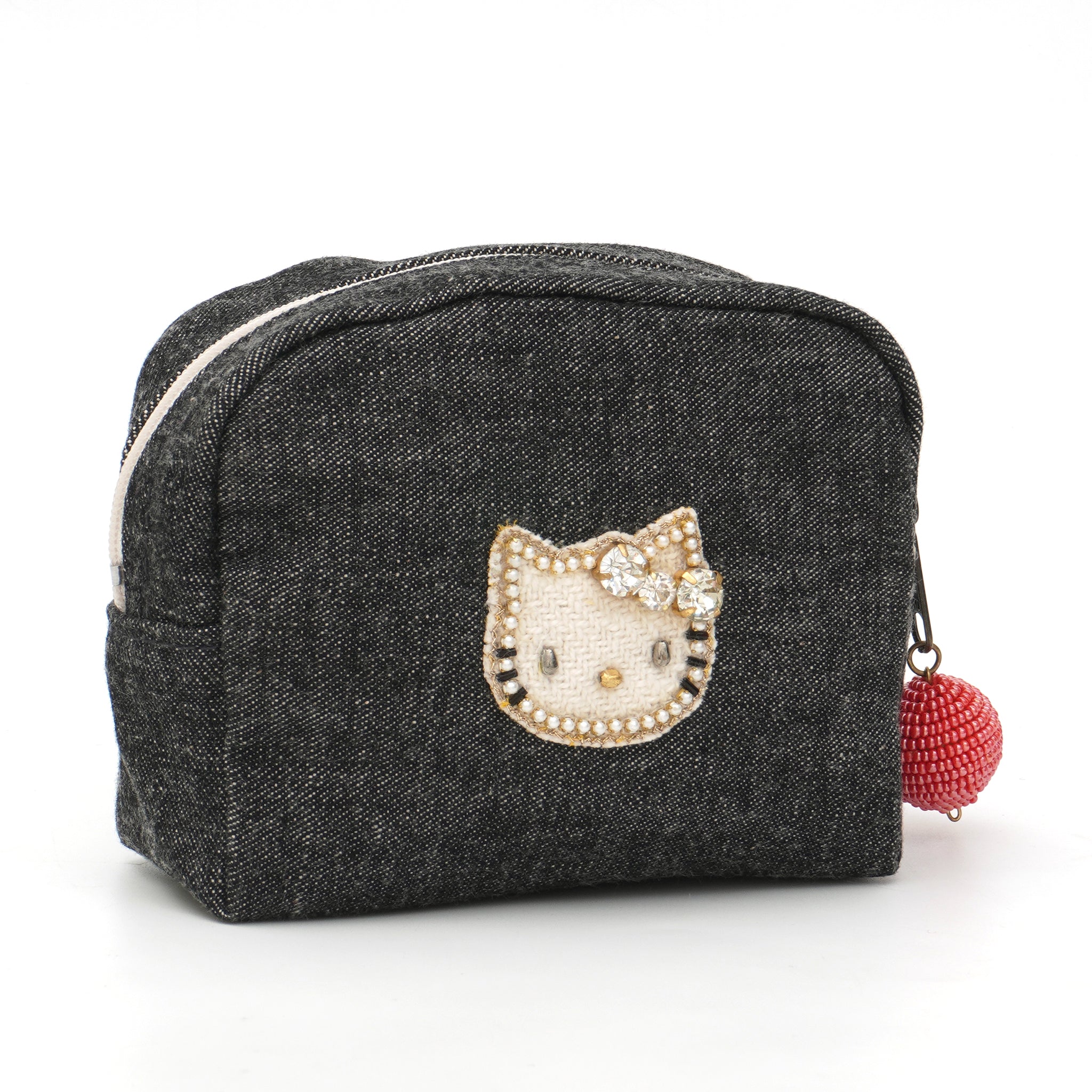 落ち着いたブラックデニムに、きらめくビジューリボンのキティが映える、大人のためのスペシャルアイテムです。バッグ・ポーチ・ミニポーチの3型展開。