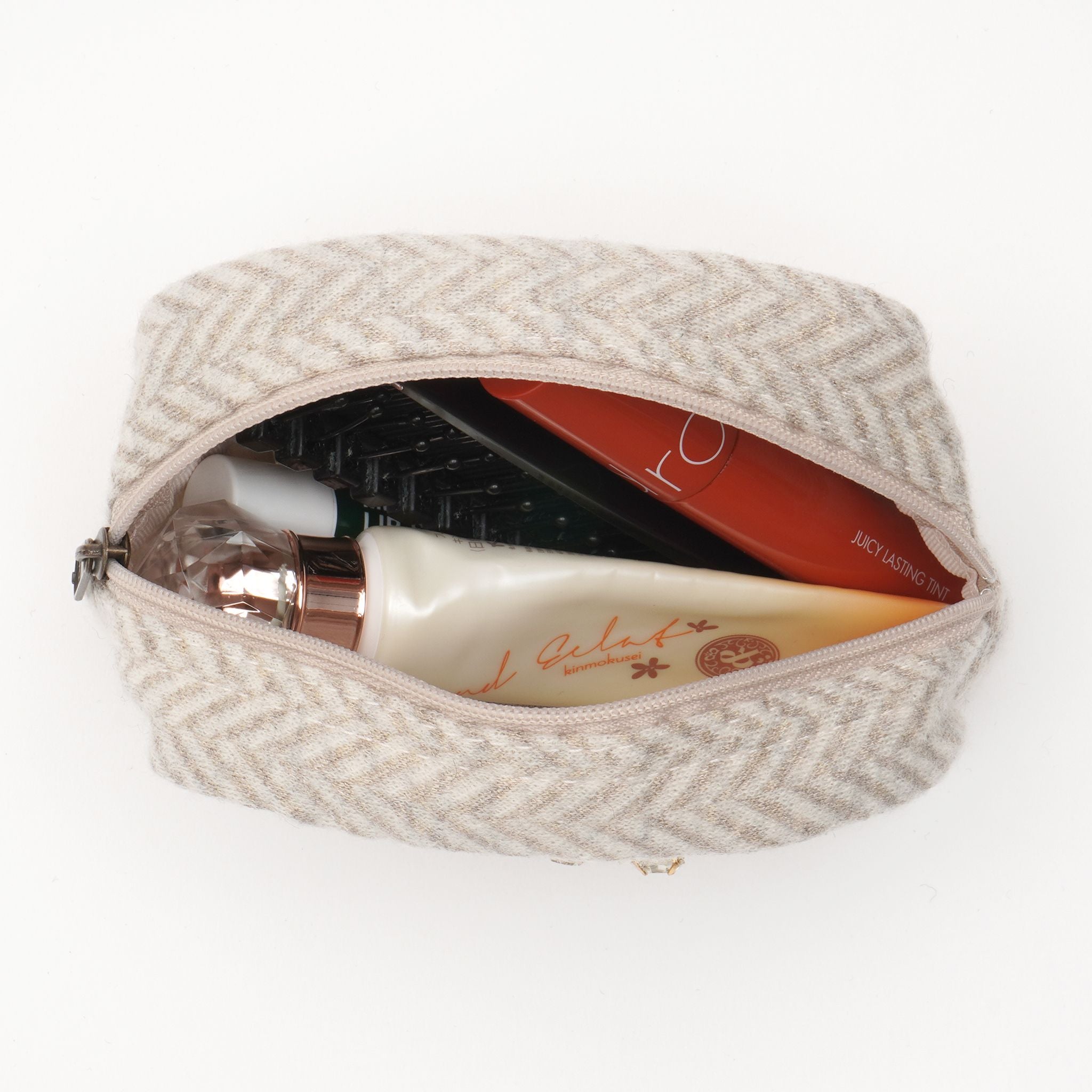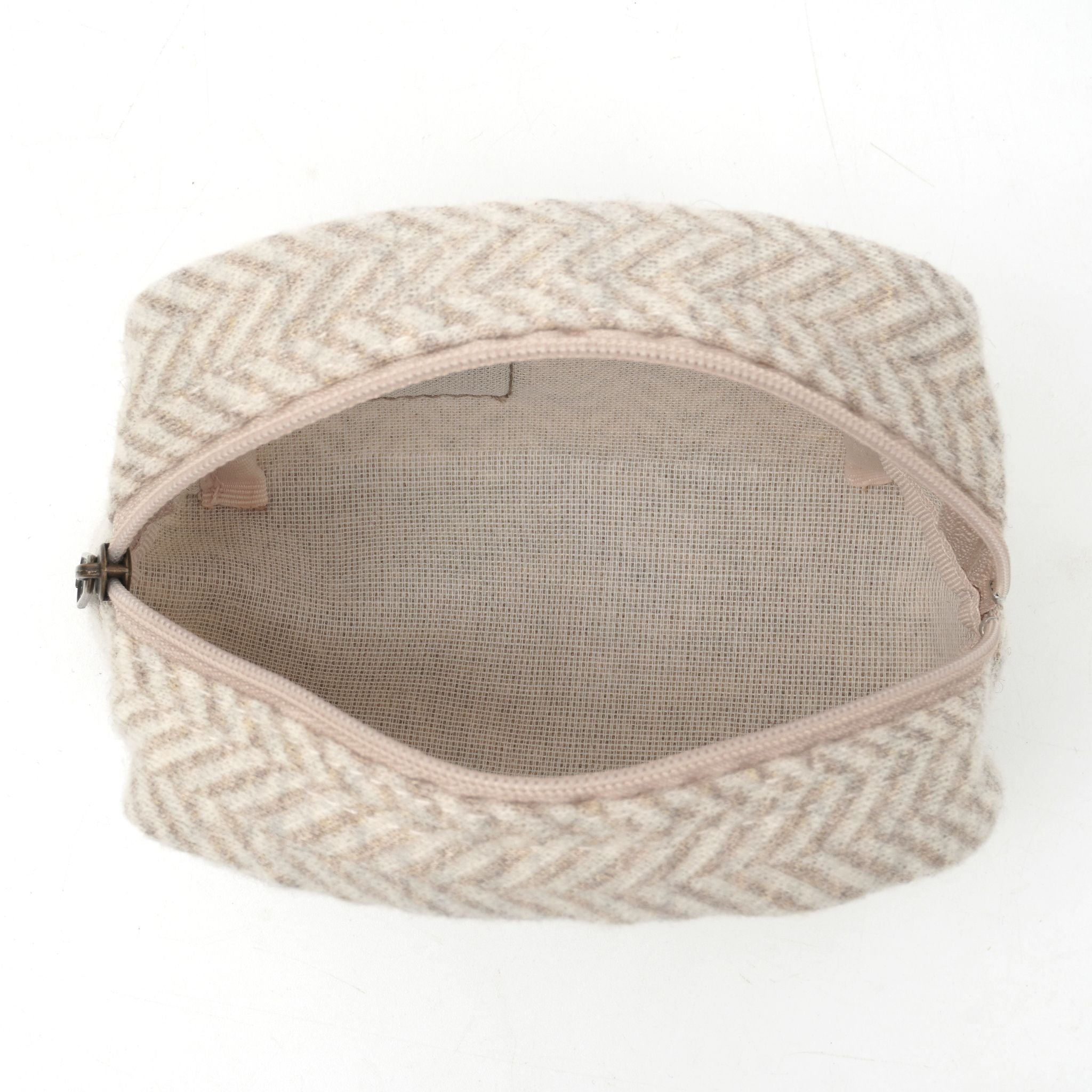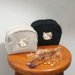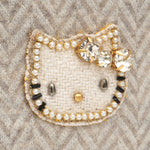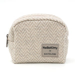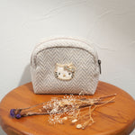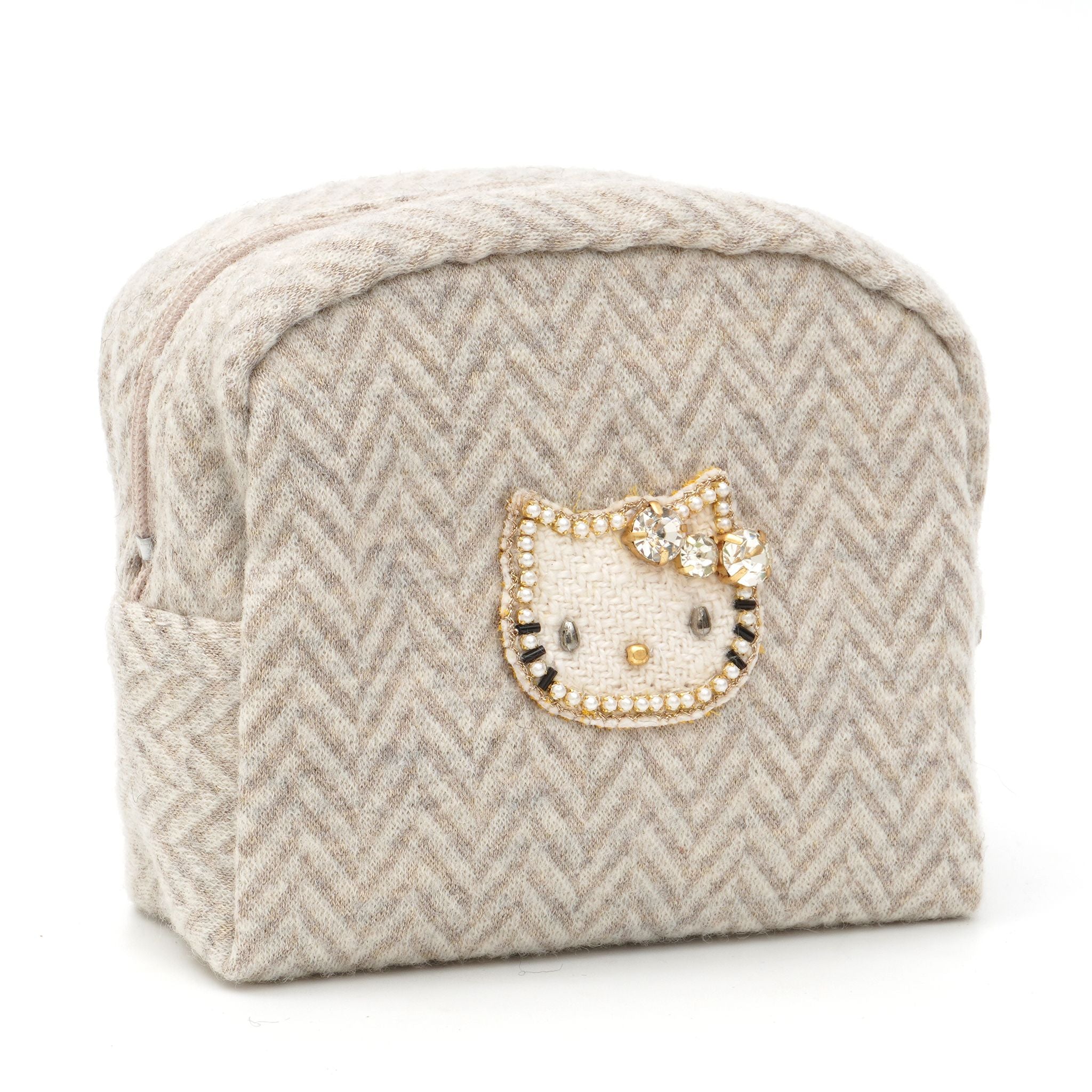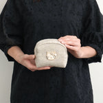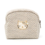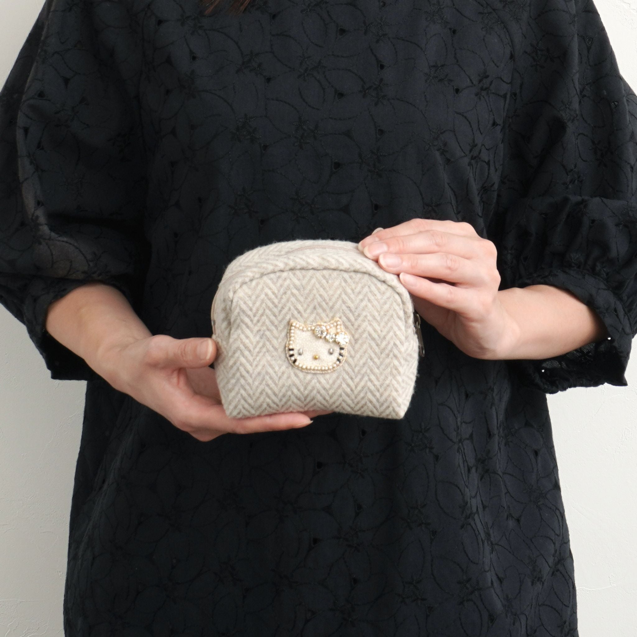 上品な冬素材で仕立てた、柔らかなホワイトヘリンボーン柄のポーチ。やさしいホワイトトーンの生地に、きらりと輝くビジューをあしらったハローキティのワンポイントが、大人の可愛さをさりげなく添えます。ふんわりとした手触りで季節感もたっぷり。コンパクトながらマチが広く、コスメや小物をすっきり収納できる実用性も魅力です。バッグの中にほっとする温もりと華やぎを与えてくれる、冬のお出かけにぴったりのアイテムです。