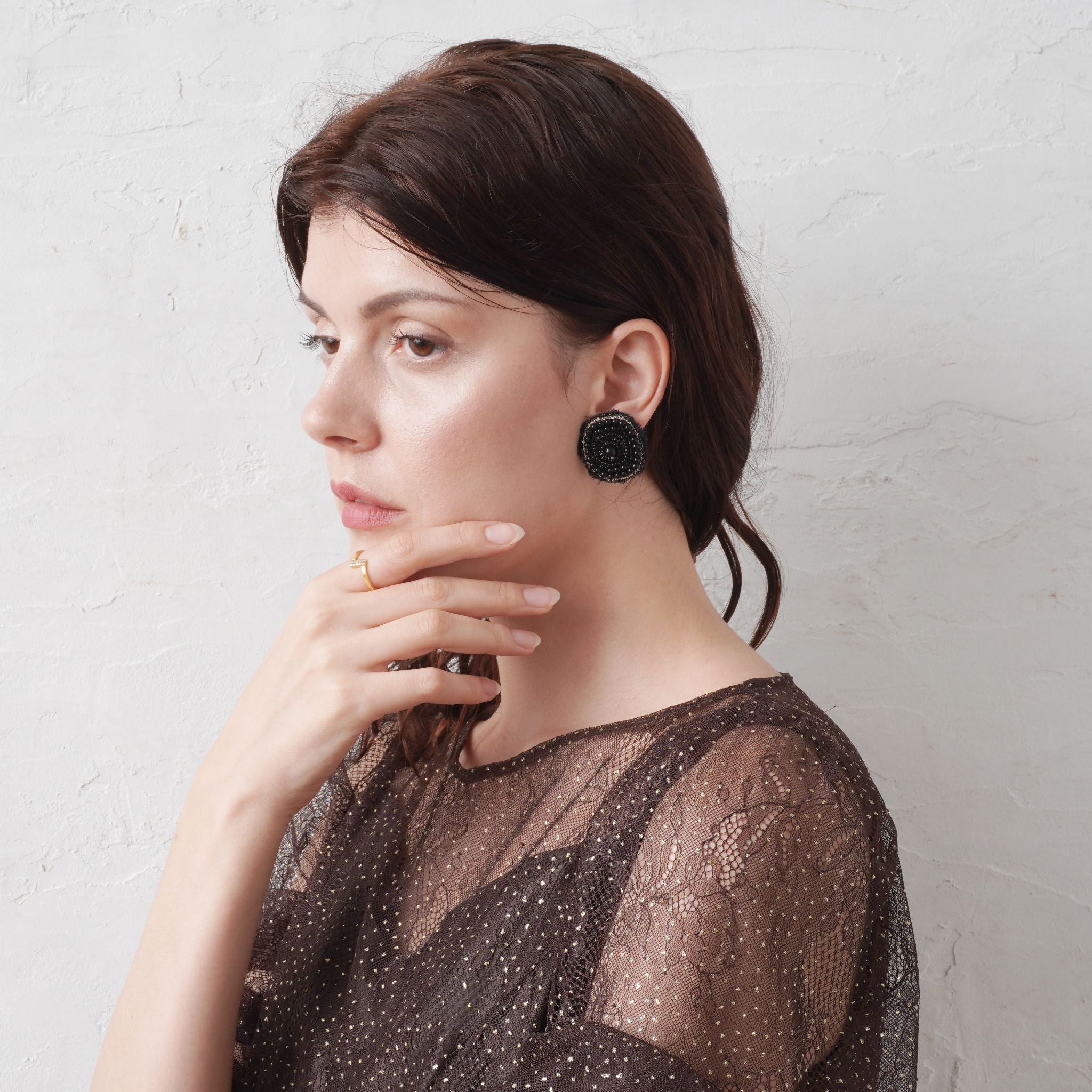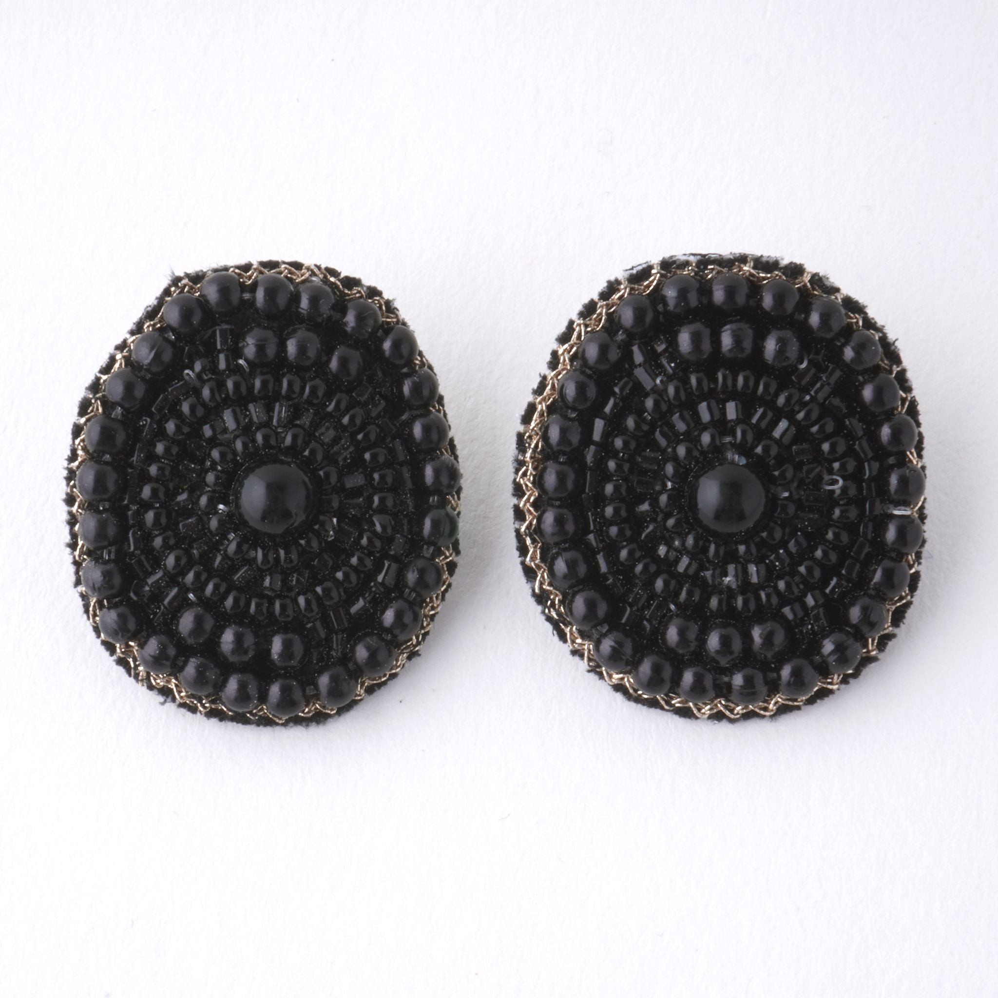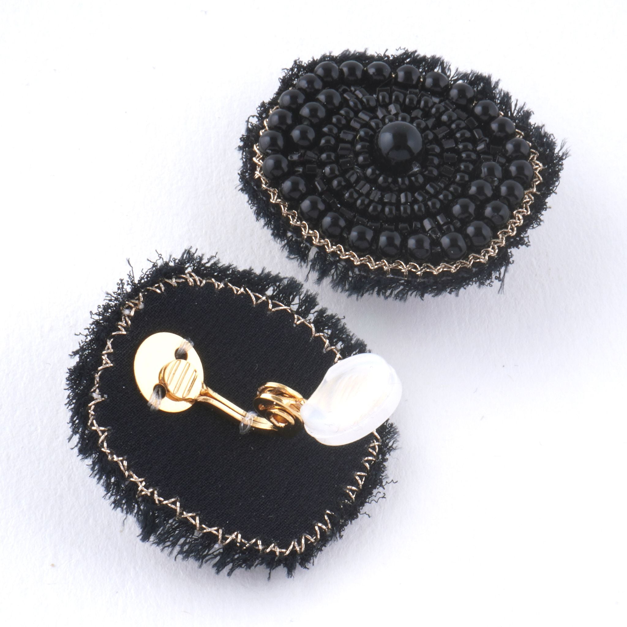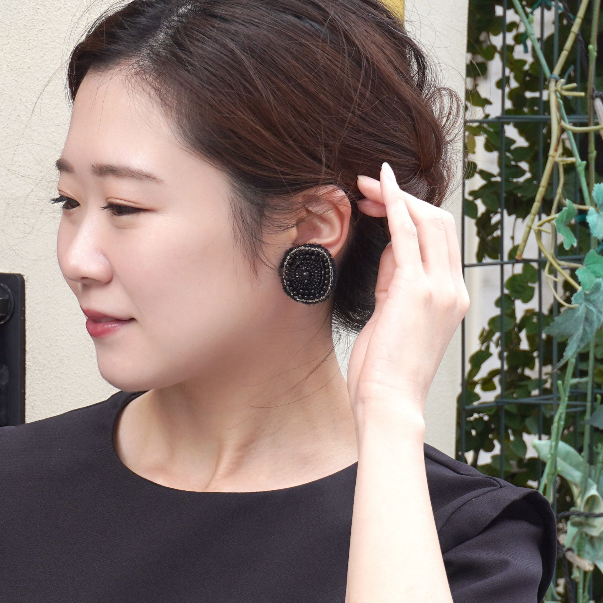 クラシカルな気品を纏う、ビーズエンブロイダリーピアス/イヤリング、Selina セリナ。 まるでアンティークのブローチのような風格と、ハンドメイドの温かみを兼ね備えたデザイン。繊細に編み込まれたビーズが、幾重にも重なることで奥行きのある美しさを生み出し、シンプルながらも存在感のあるアクセサリーに仕上げました。