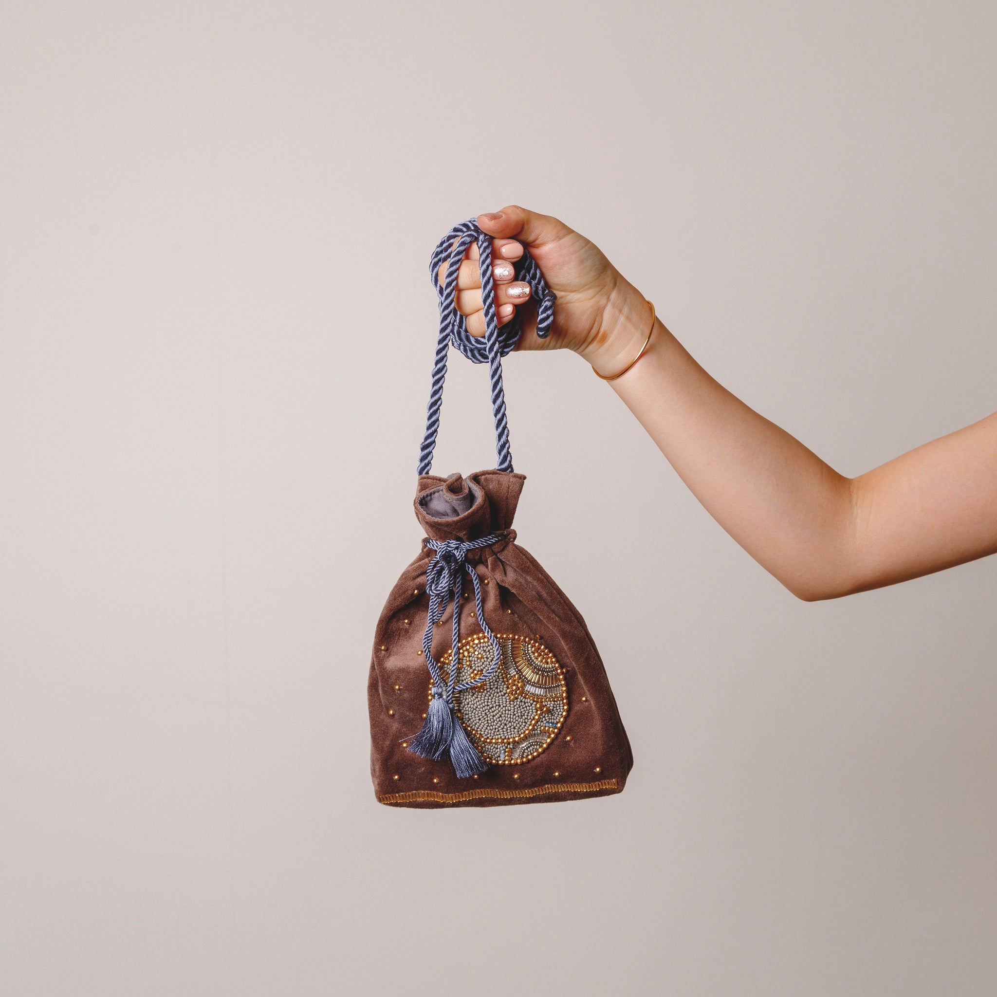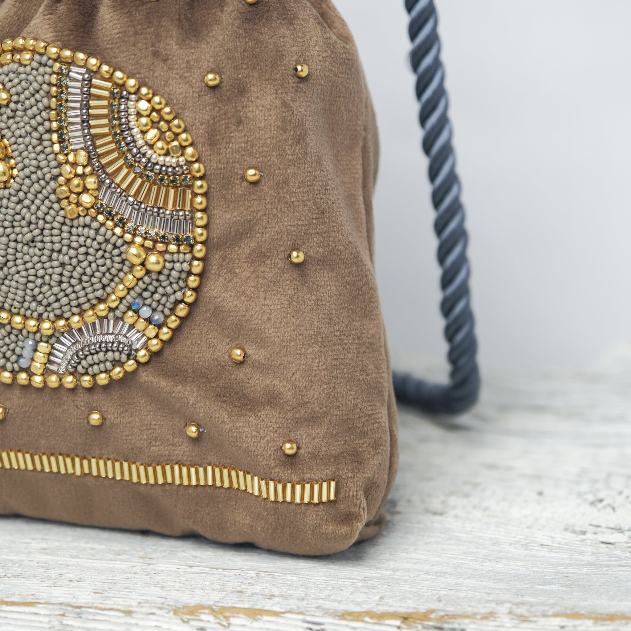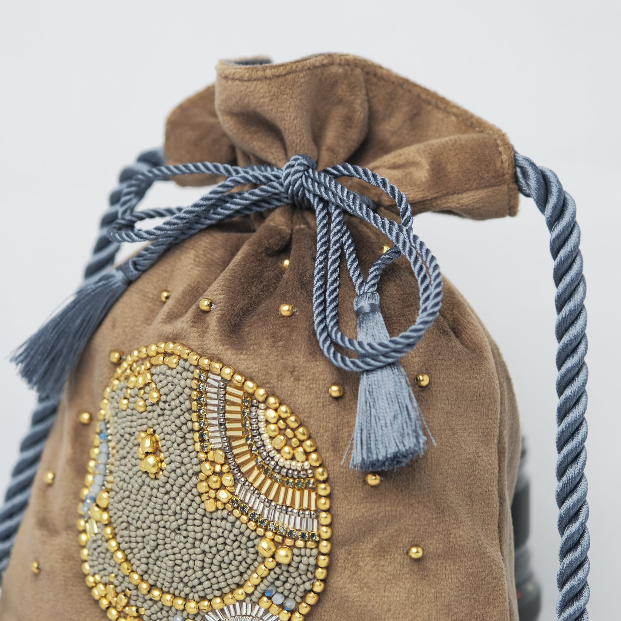 巾着の縫製から刺繍部分、持ち手のロープまで全てインドの村で一つ一つハンドメイドで作っています。