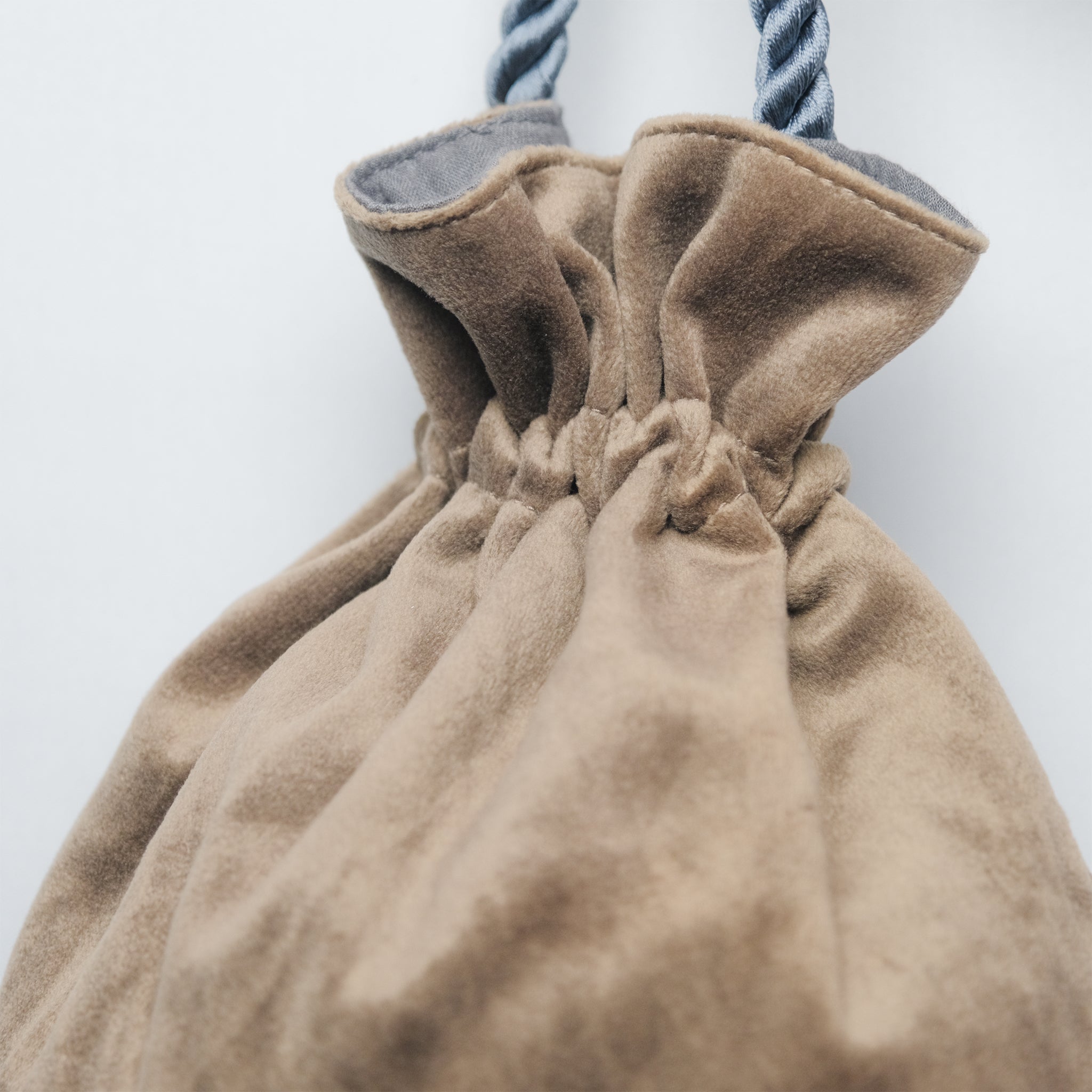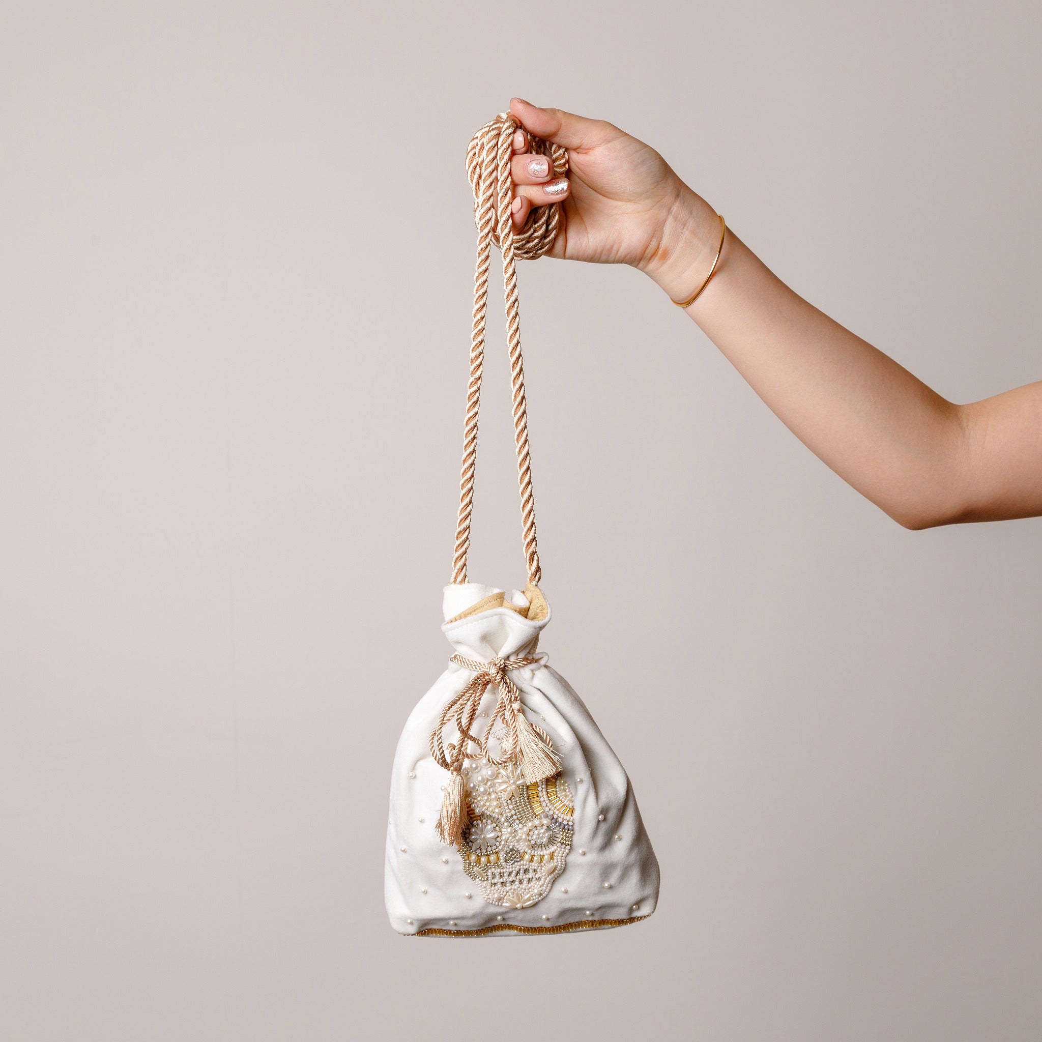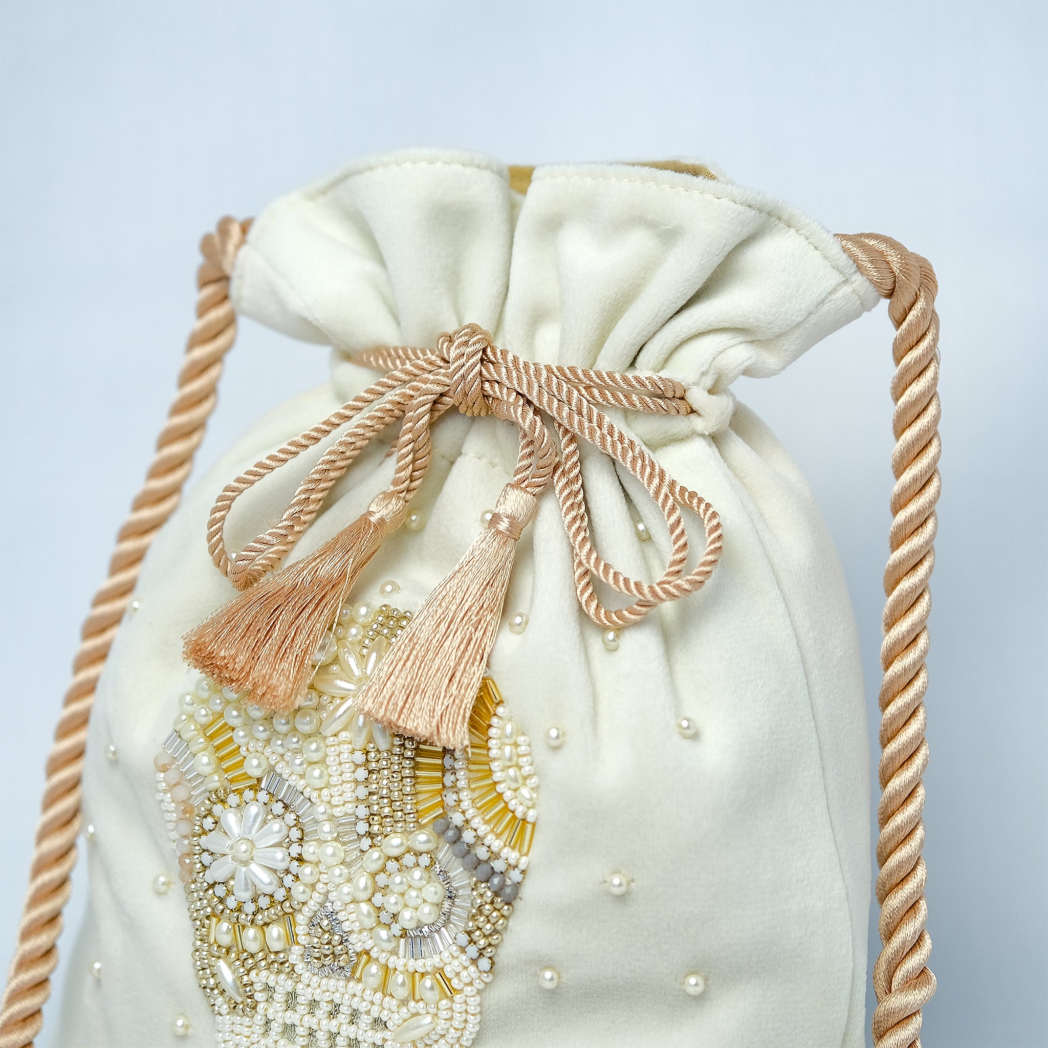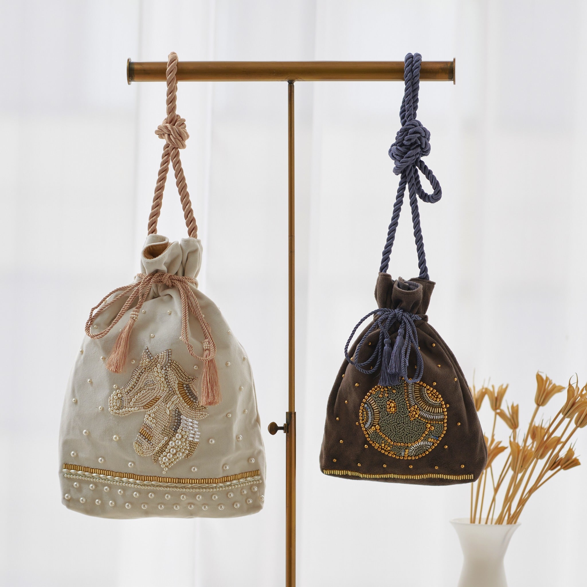 巾着の縫製から刺繍部分、持ち手のロープまで全てインドの村で一つ一つハンドメイドで作っています。