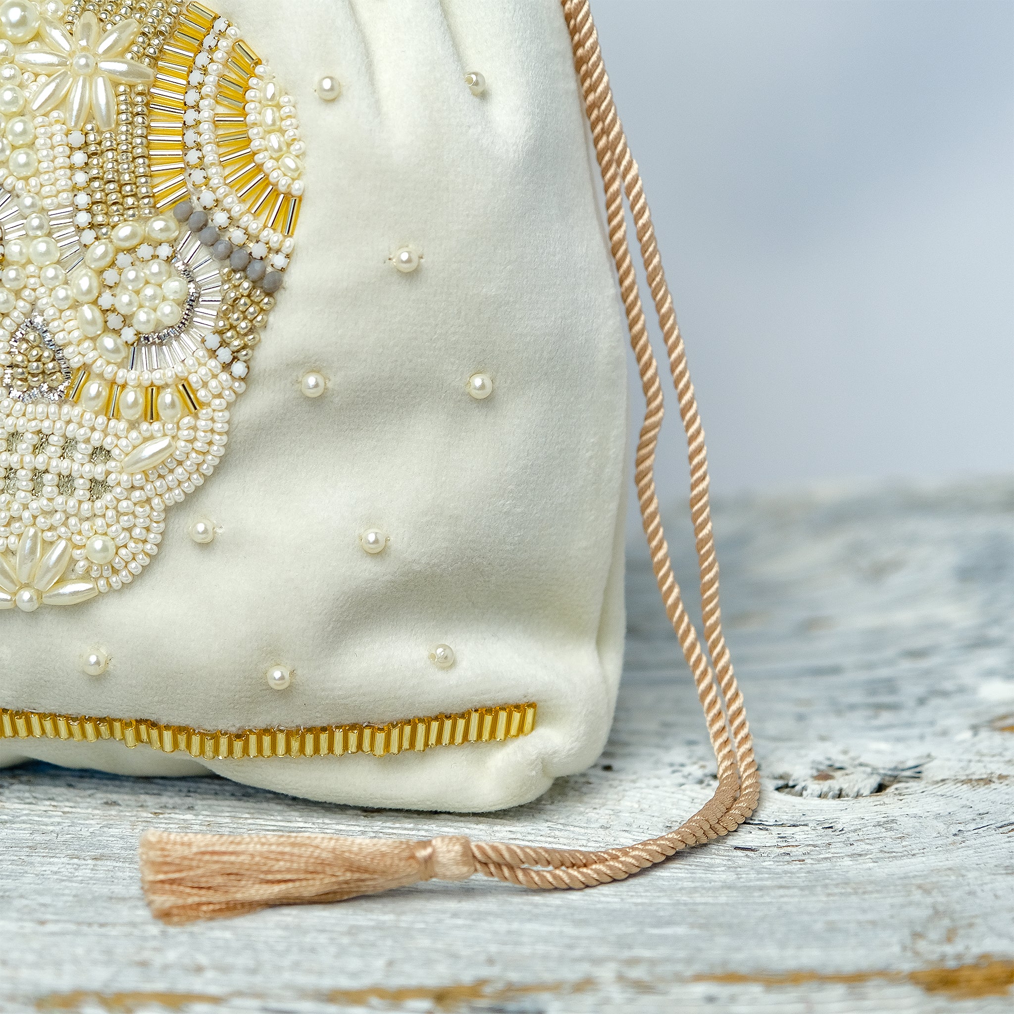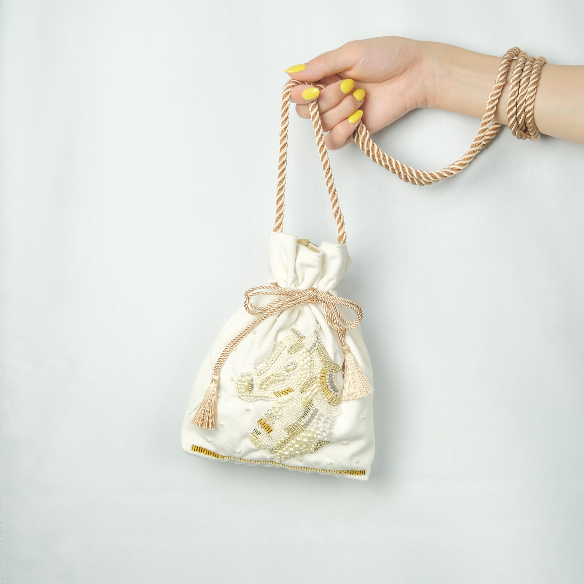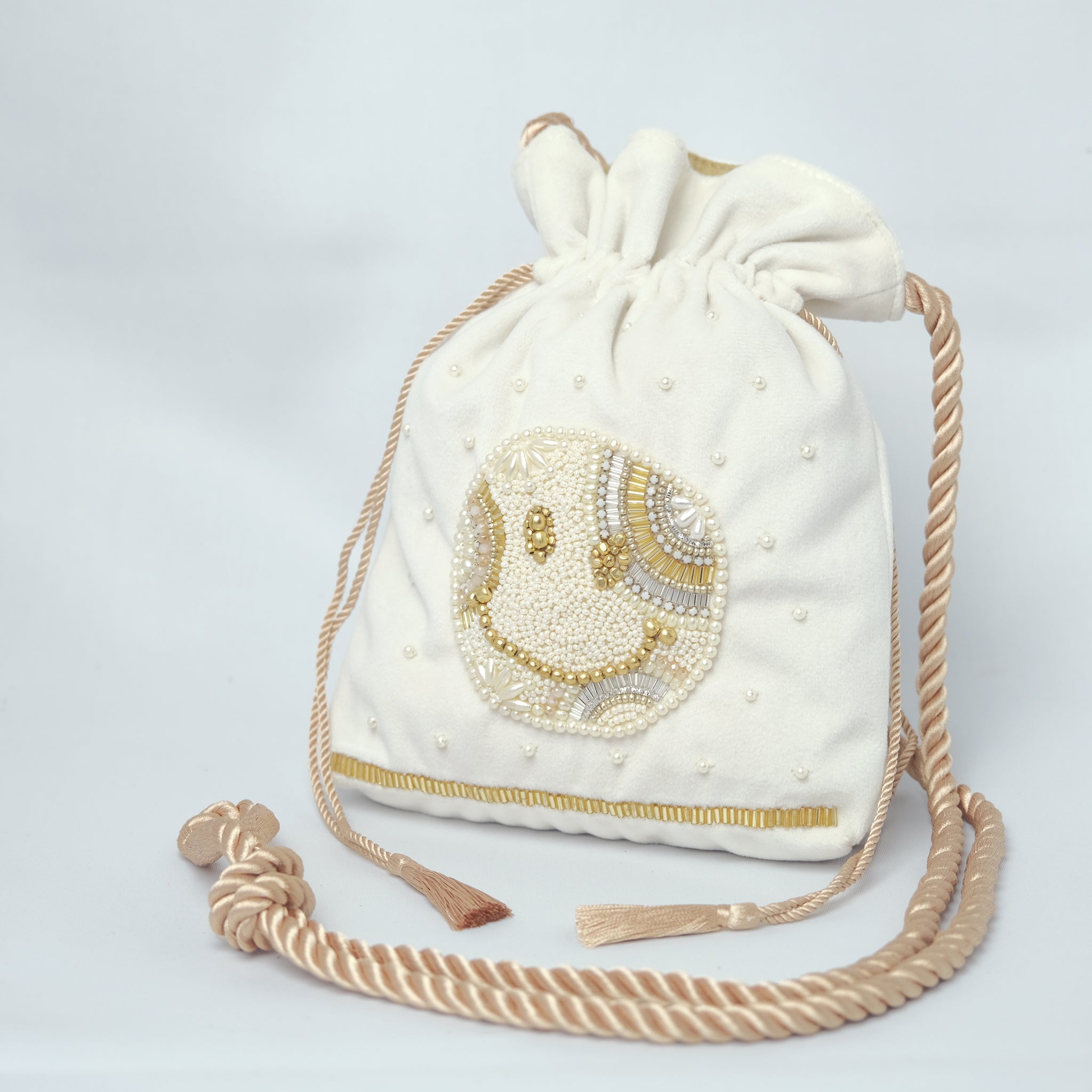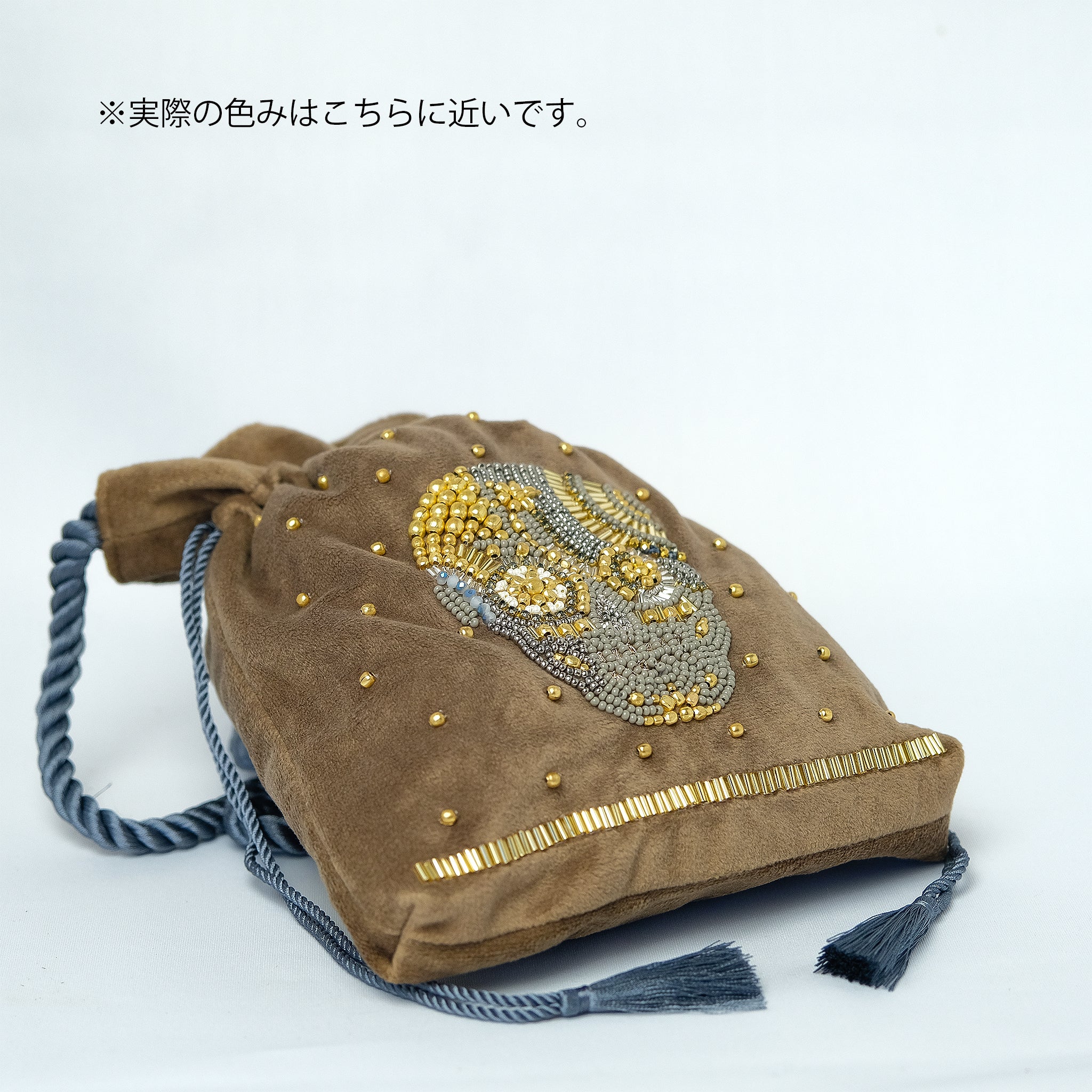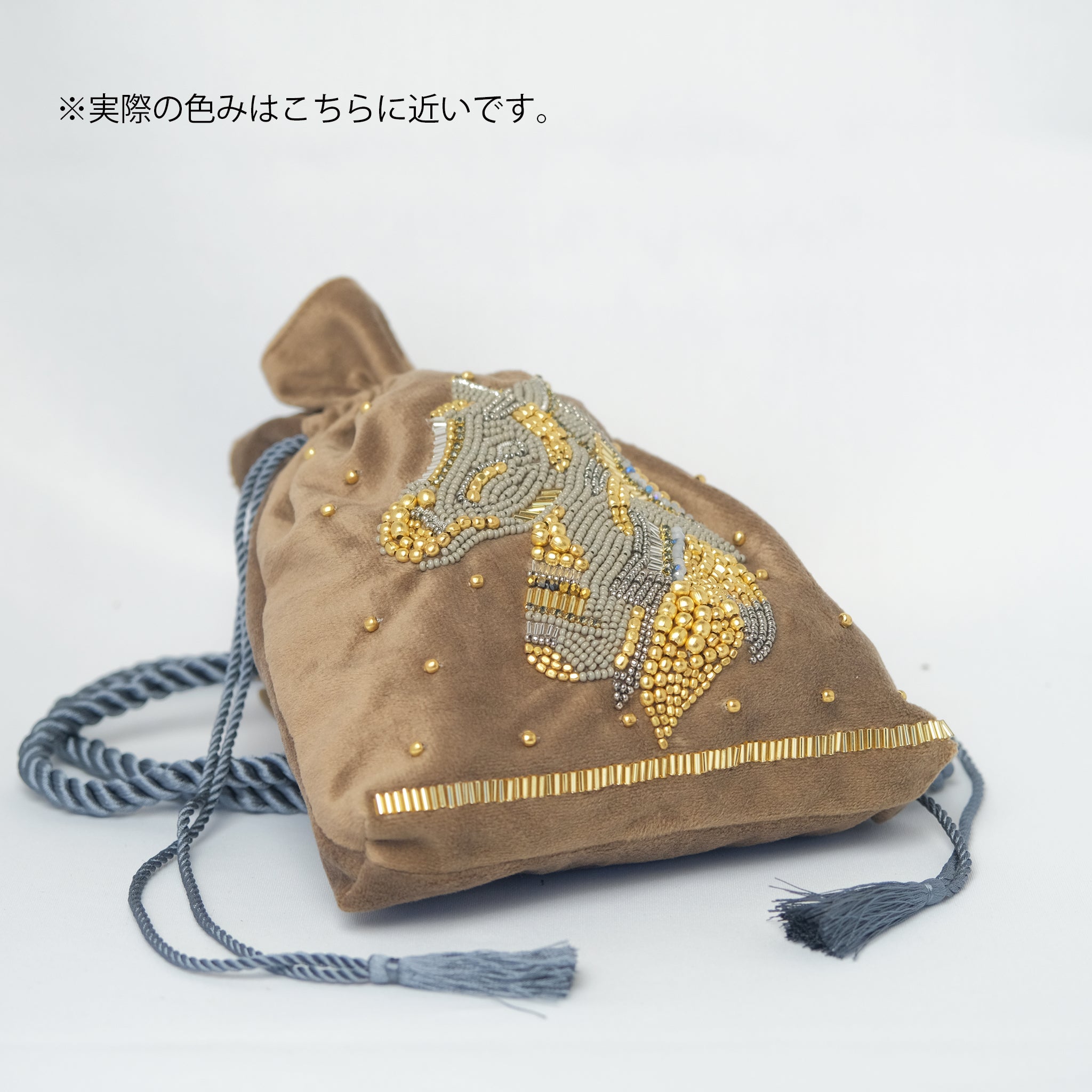 生地の選定から刺繍部分のビーズの種類・配置など細部に至るまで一つ一つ丁寧にデザインした、 こだわりのぎゅっと詰まった唯一無二のアイテムとなっております。