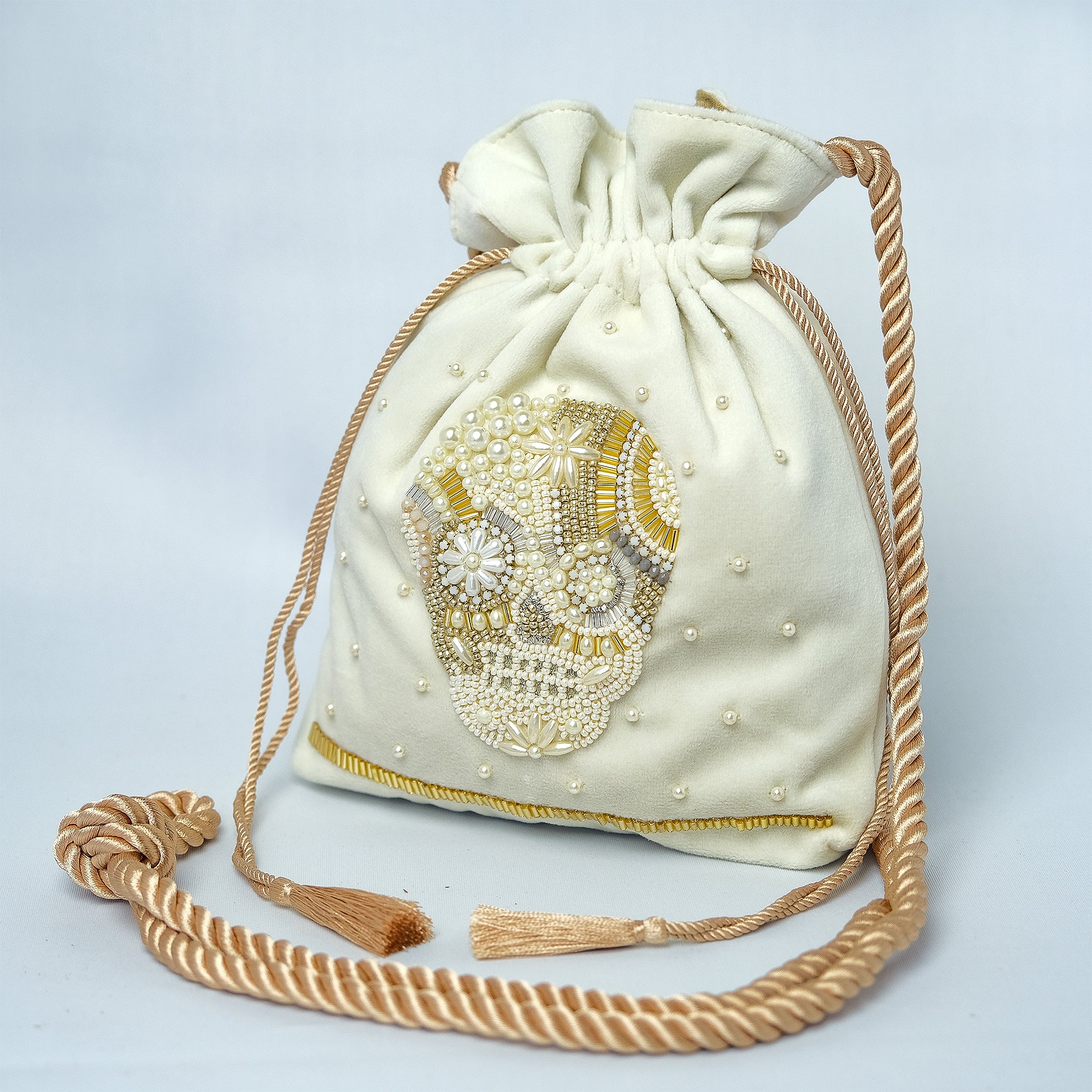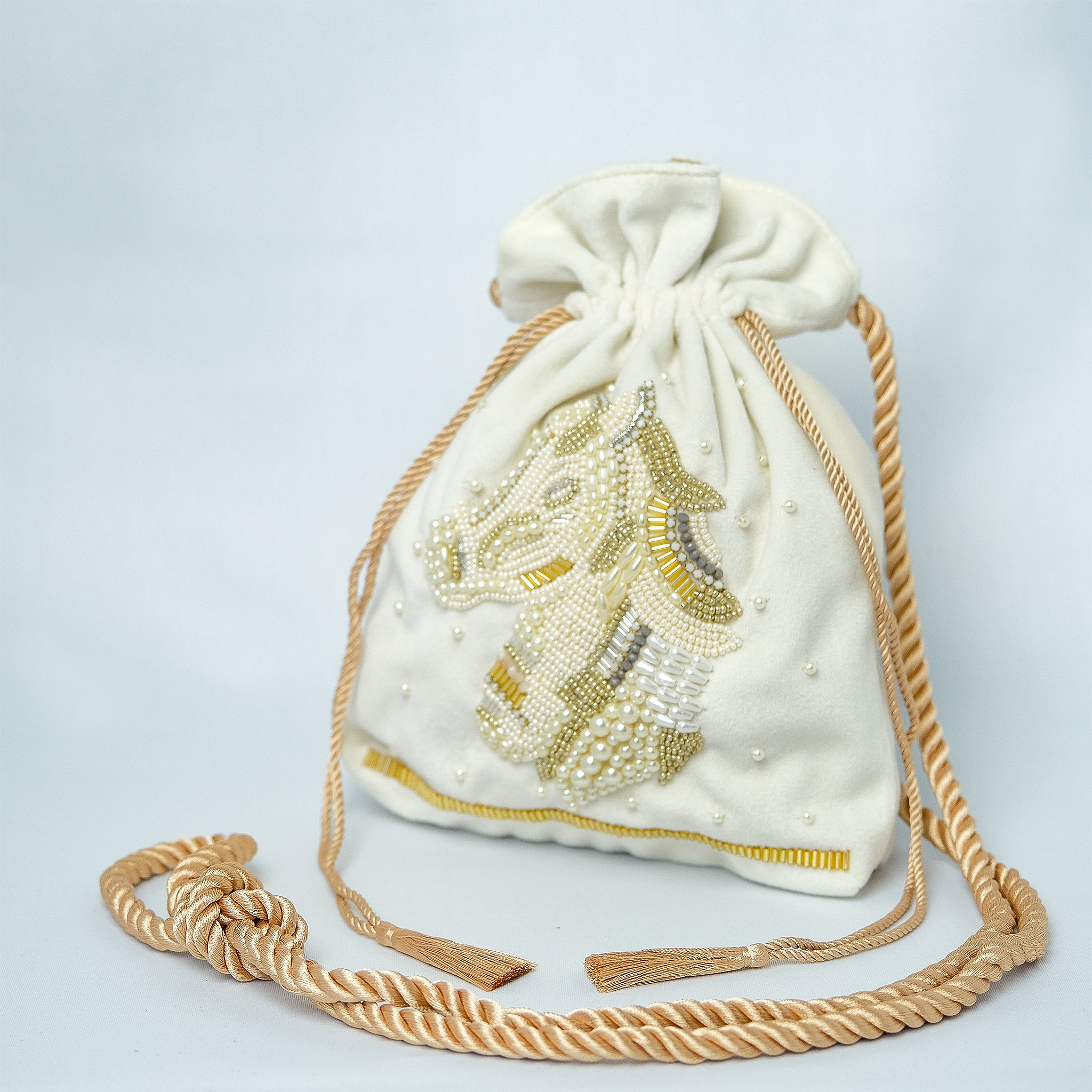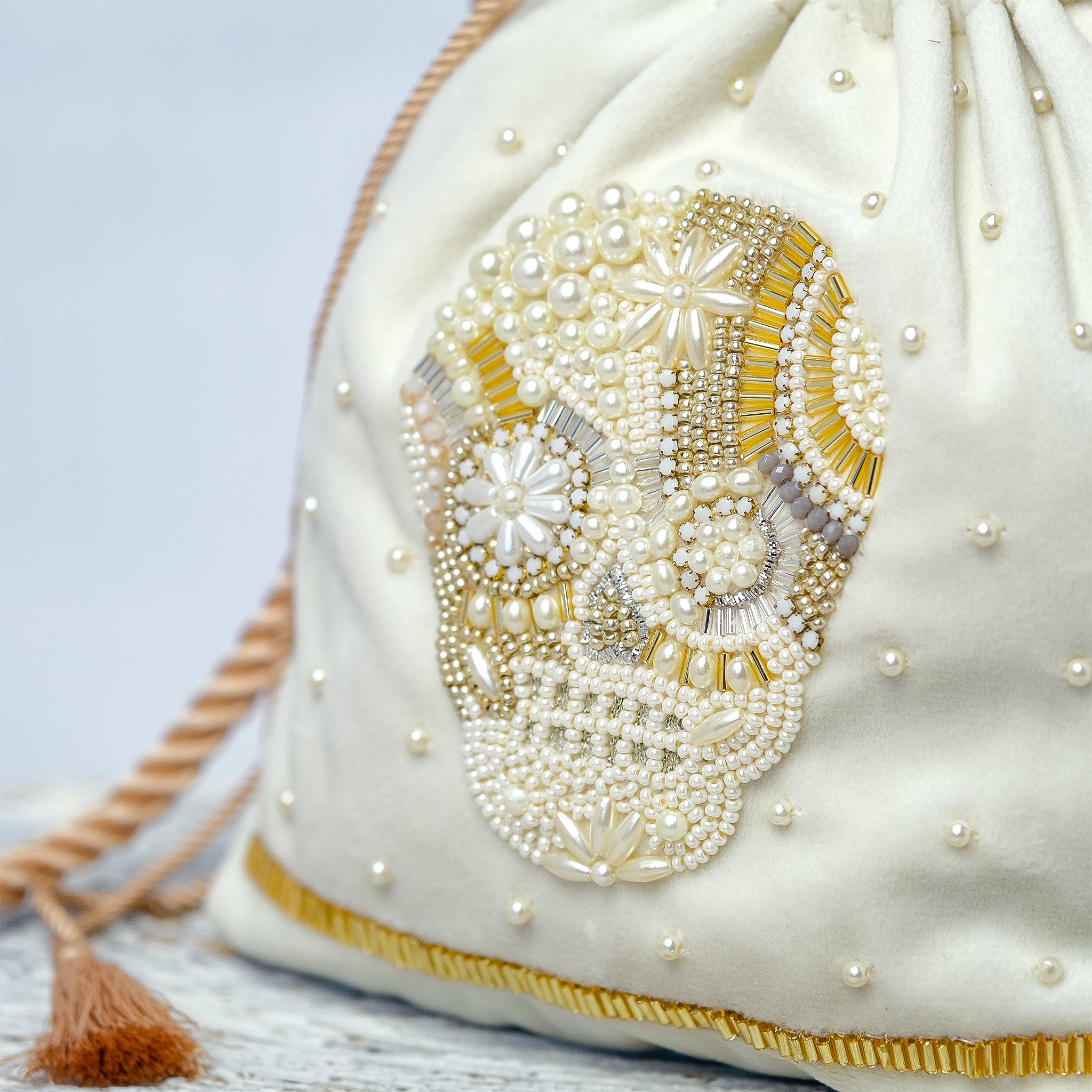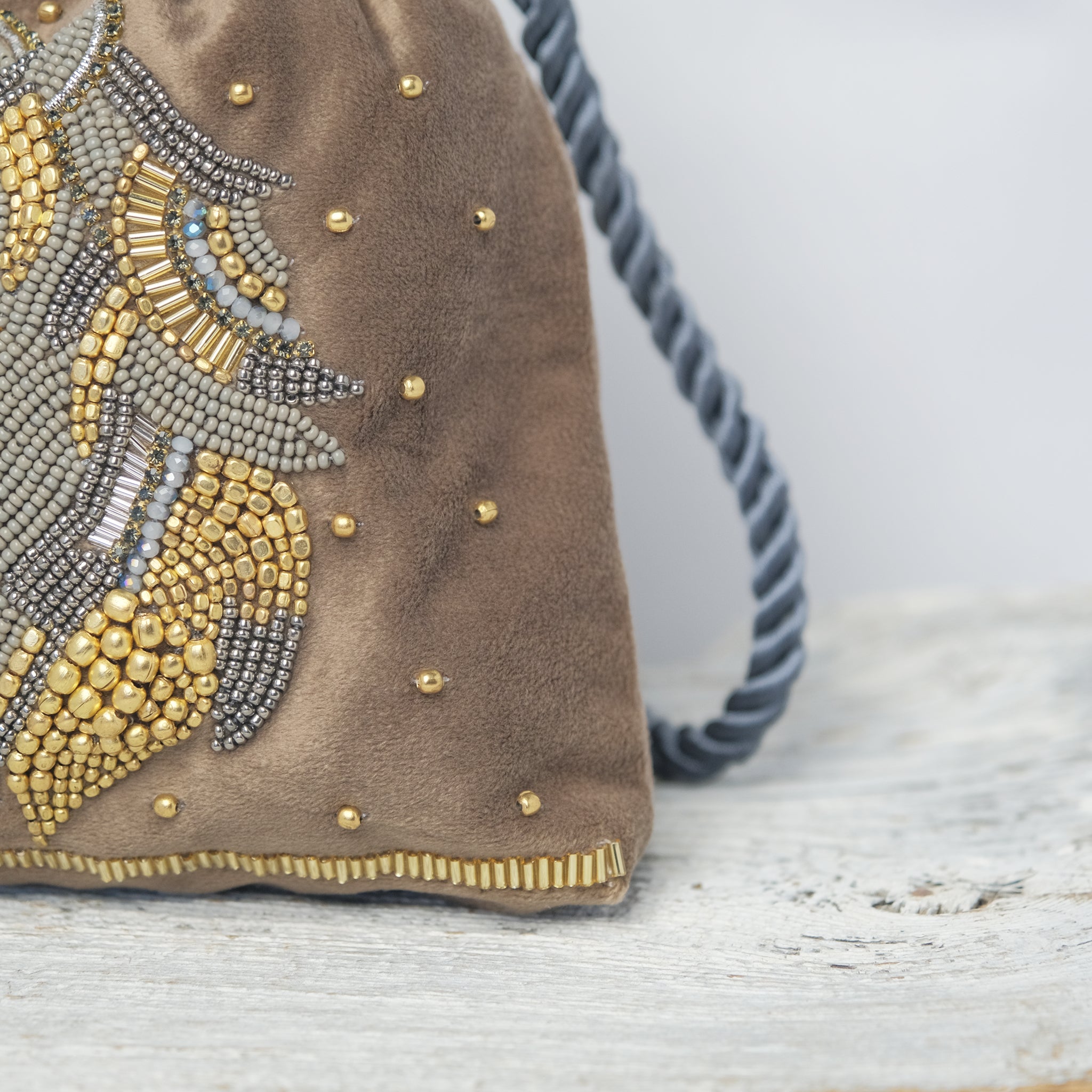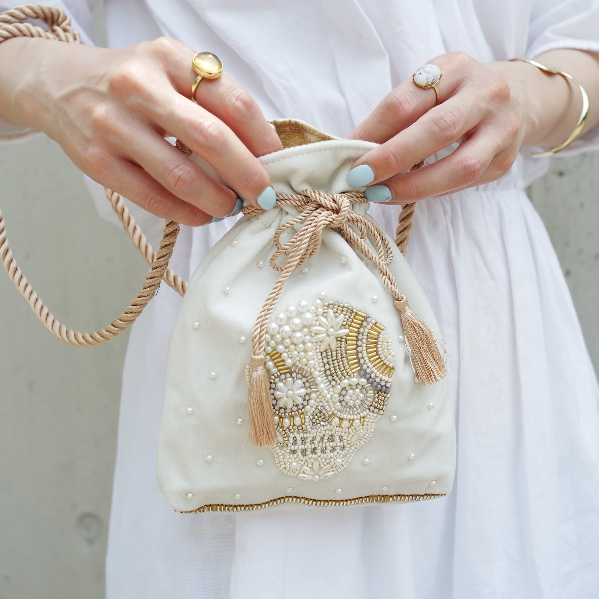生地の選定から刺繍部分のビーズの種類・配置など細部に至るまで一つ一つ丁寧にデザインした、 こだわりのぎゅっと詰まった唯一無二のアイテムとなっております。