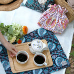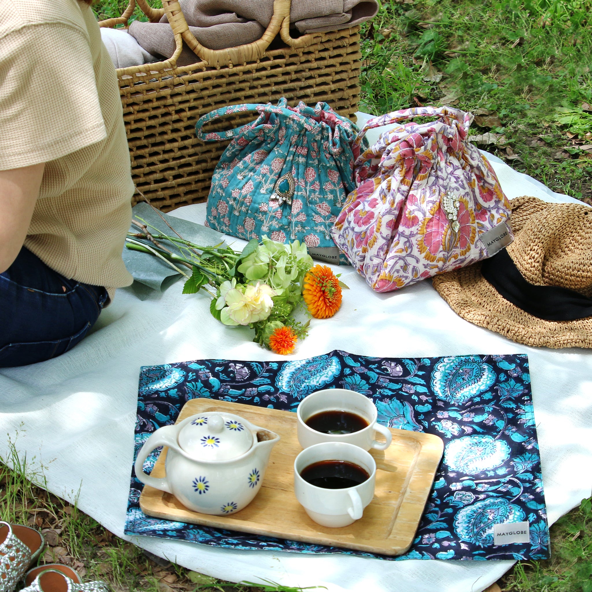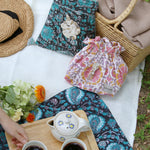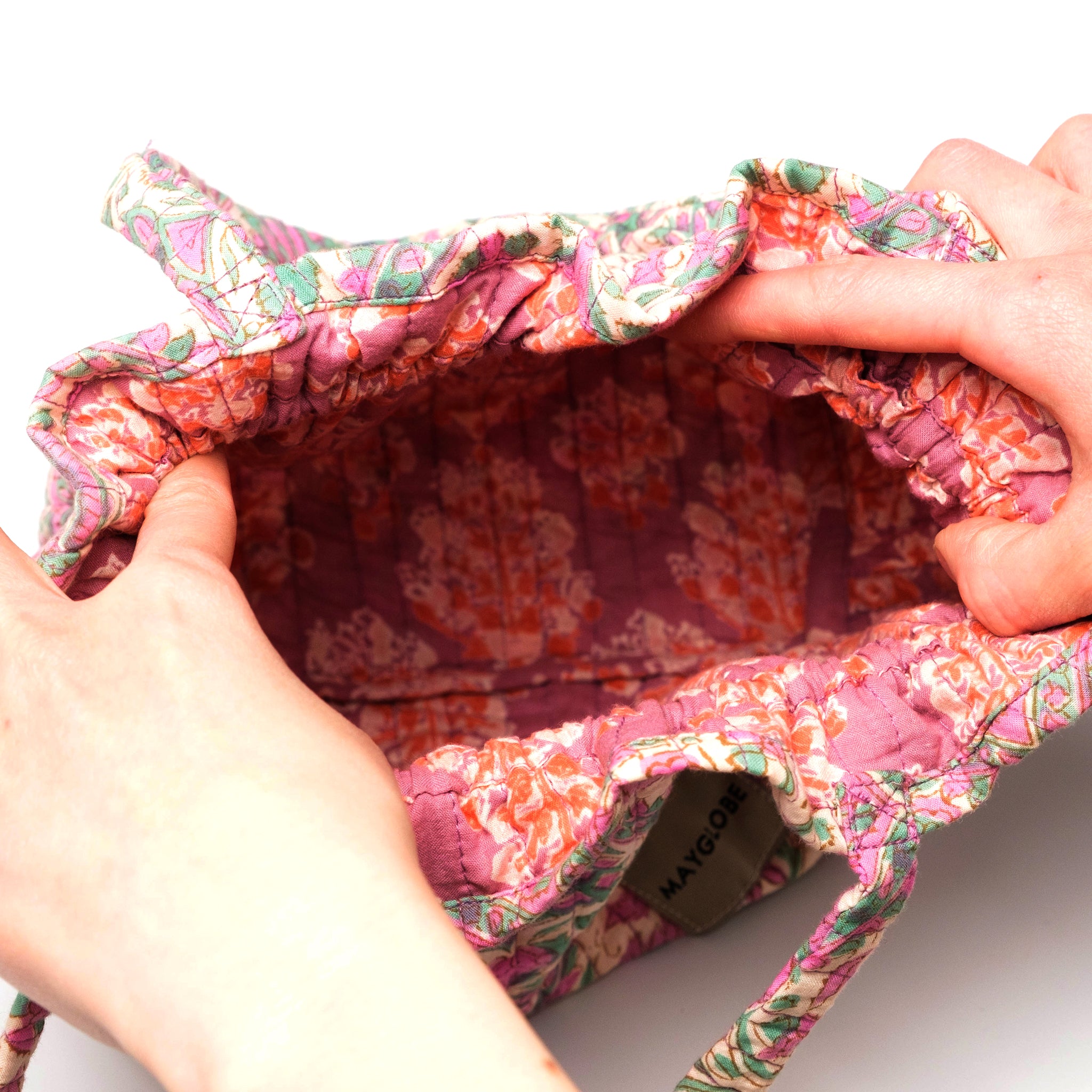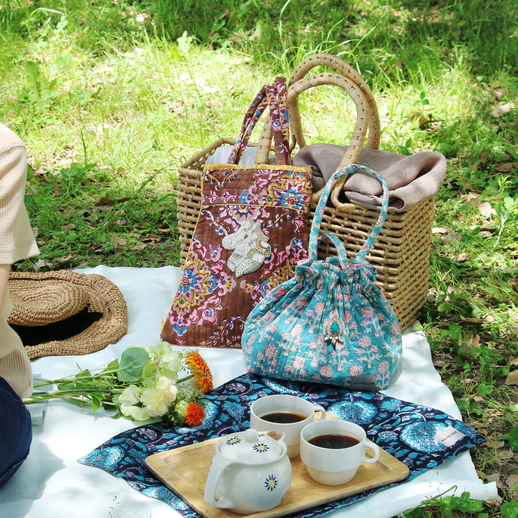 インドで起源前から語り継がれていると言われているブロックプリントという技法。ブロックプリントは幾重にもインクを重ねていくため、大変手間がかかる技法ですが、その分、機械では出せないハンドメイドならではの優しい風合いが生み出されます。生地のデザインはもちろん、ブロックプリントの木版も手作りするところから企画しました。コットンケンブリック地をキルティング加工し、肌触りもよく、軽やかで柔らかくなっており、素材にもこだわりました。