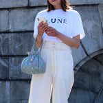 | 素材 | バッグ:コットン、モチーフボディ:シフォン(合成繊維),ツイード(合成繊維) / モチーフ:ガラス,真鍮,ポリエステル,コットン,アクリルパール ( ホワイトのみ ),フェルト(合成繊維) |