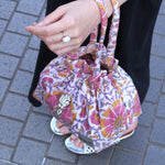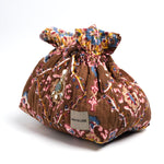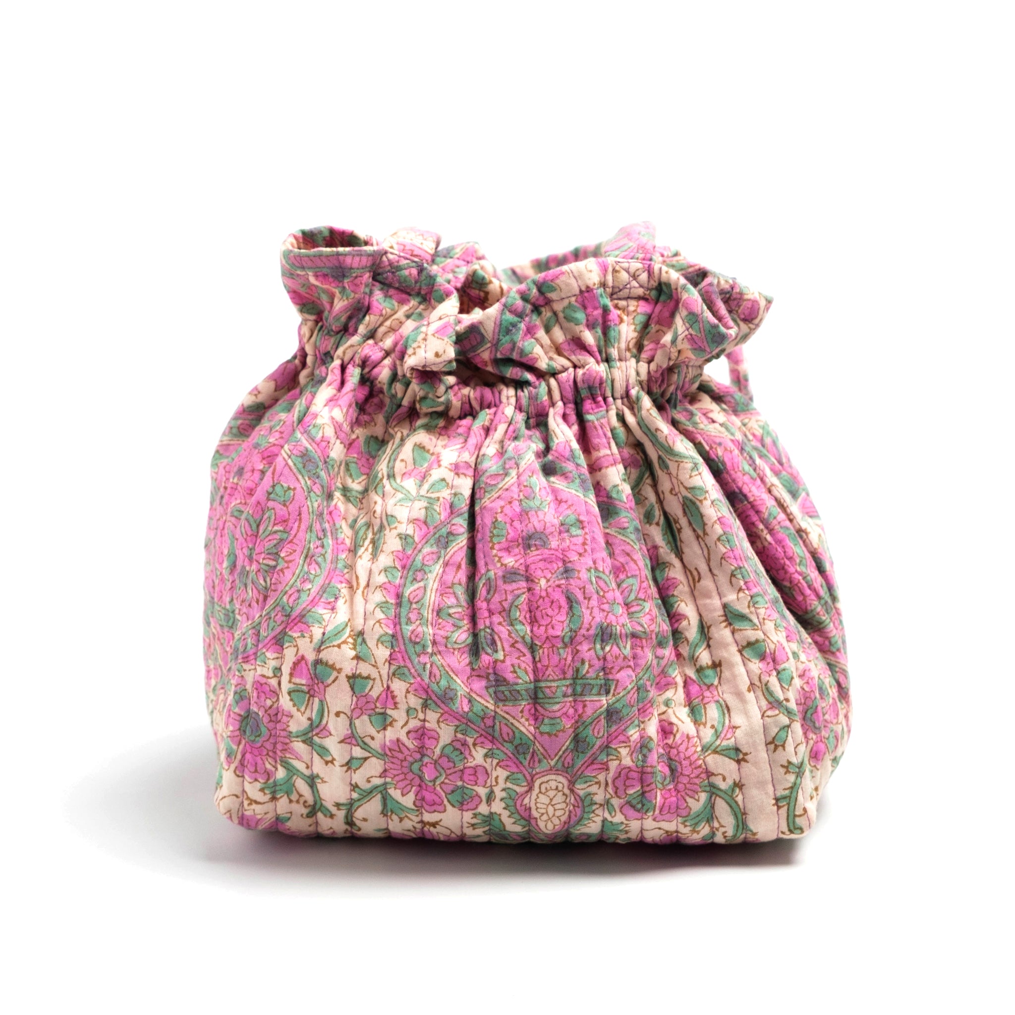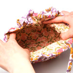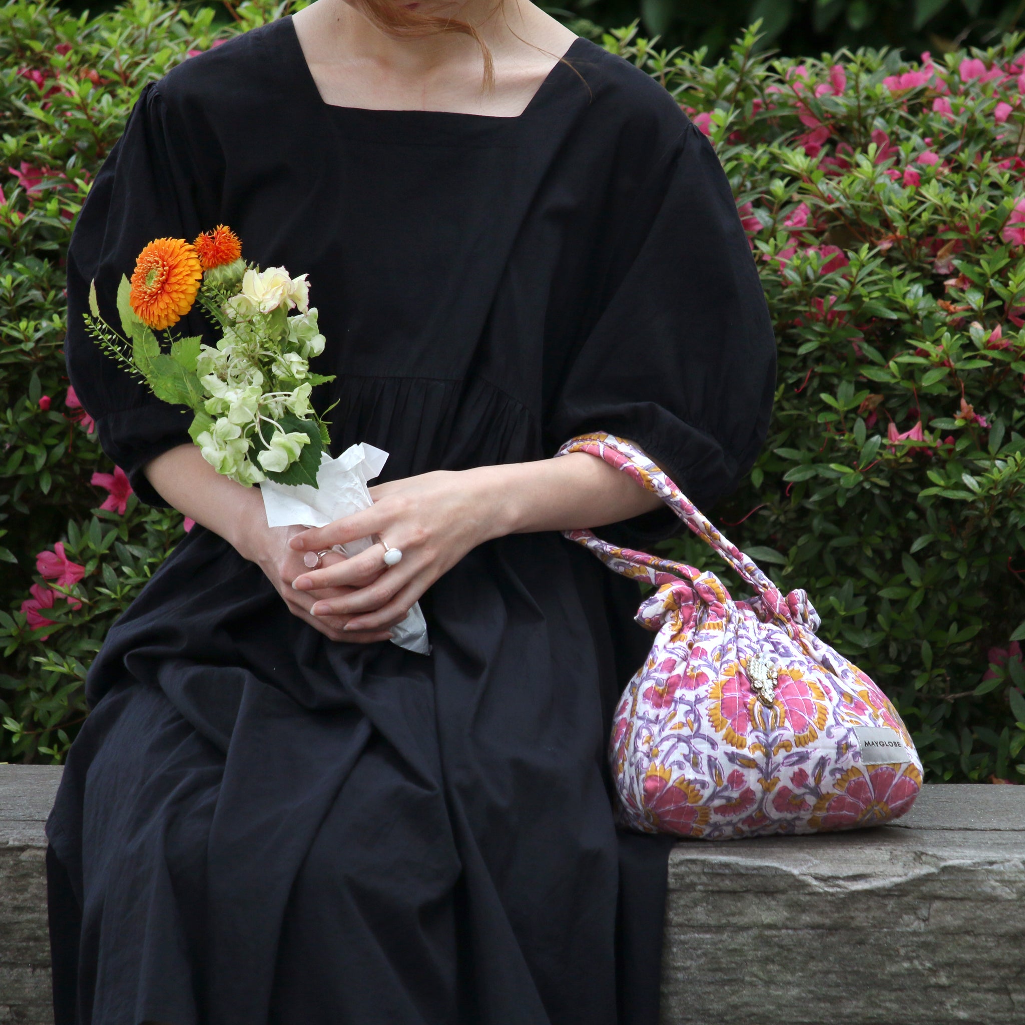 ブロックプリントという技法で作った生地を巾着バッグにしました。コロンとした丸い形がかわいらしく、バッグの開閉部分はゴムになっているので取り出しも簡単。表地も裏地もかわいいこだわりが詰まったバッグ。ビーズ刺繍のモチーフももちろんハンドメイド。生地のパターンは5色からお選びいただけ、モチーフは生地各色につき2種類からお選びいただけます。モチーフはAまたはBからお選びくださいませ。※生地デザインによって選べるモチーフが異なります。※受注生産のためご注文から2-3日後に発送となります。