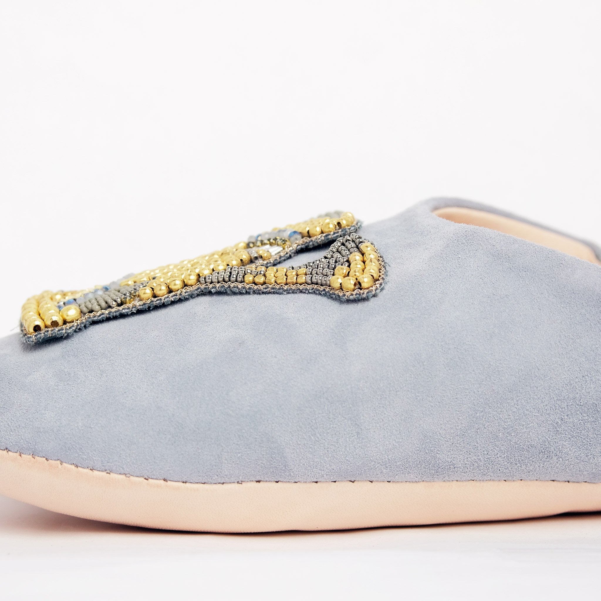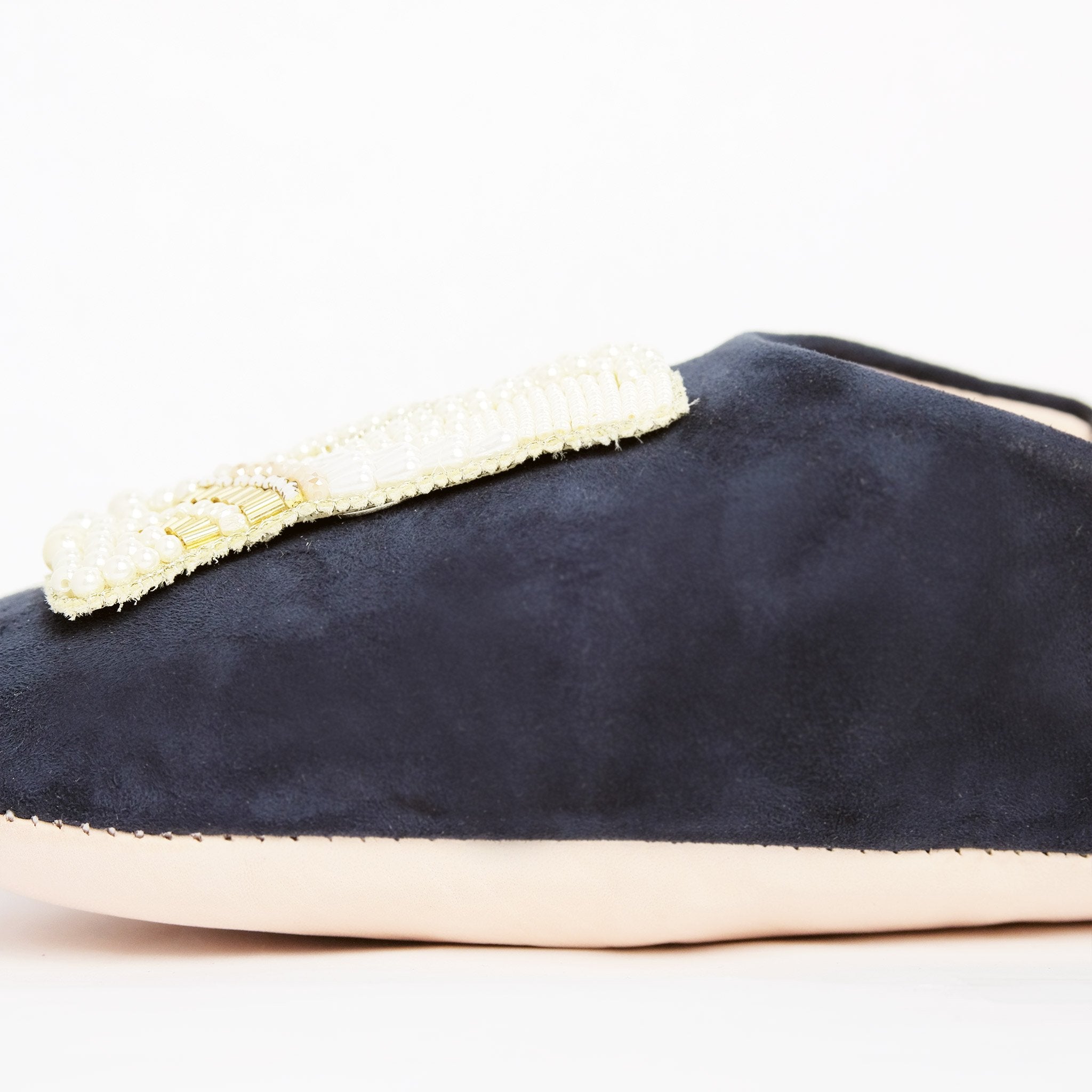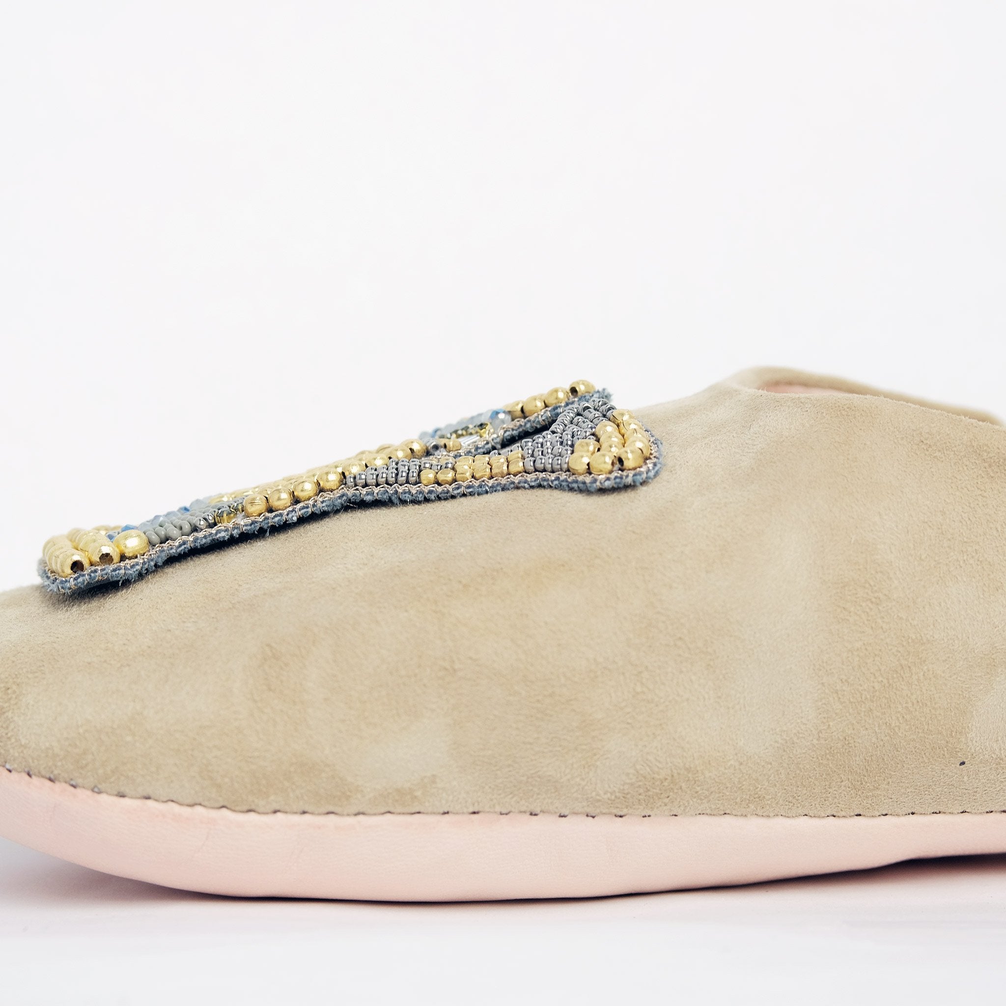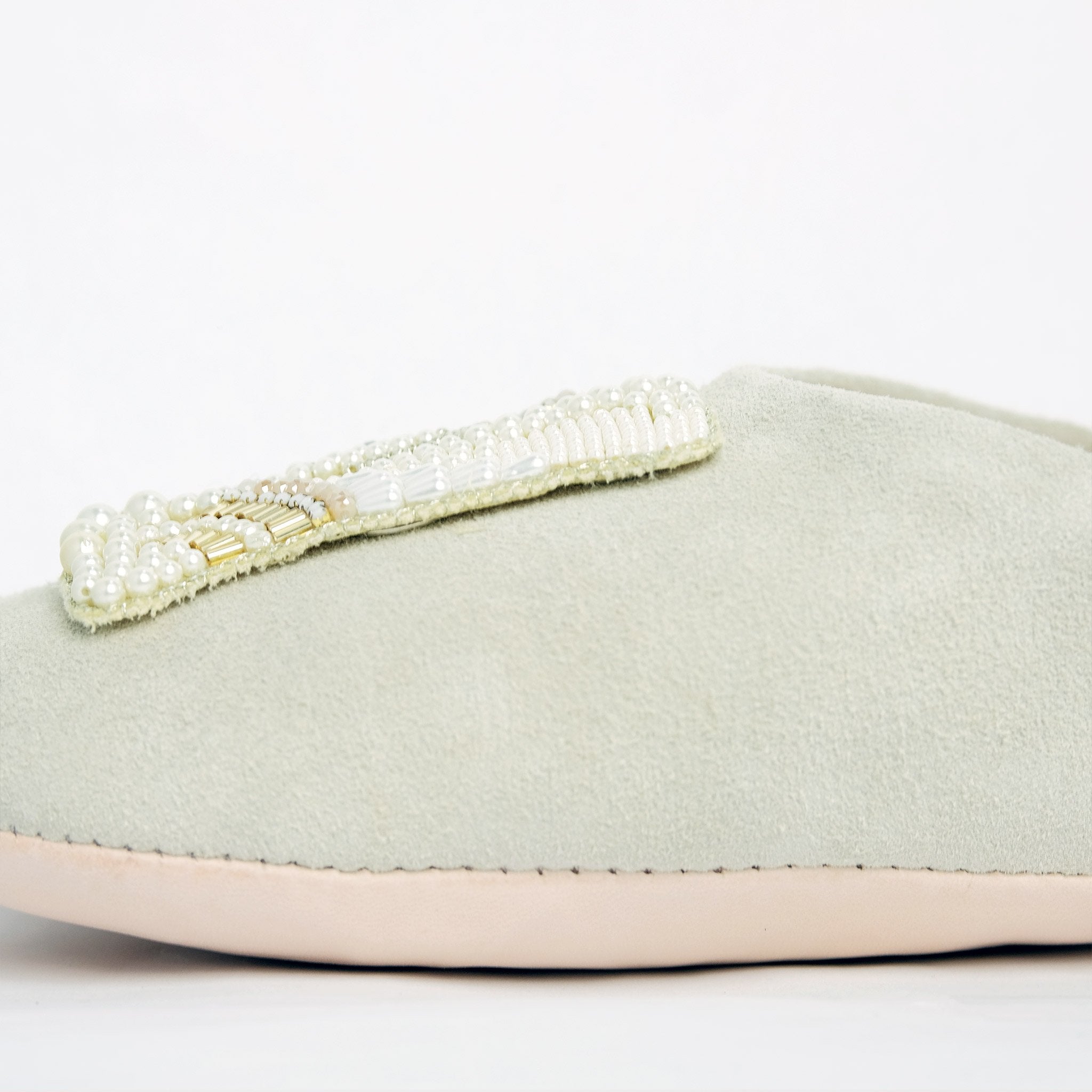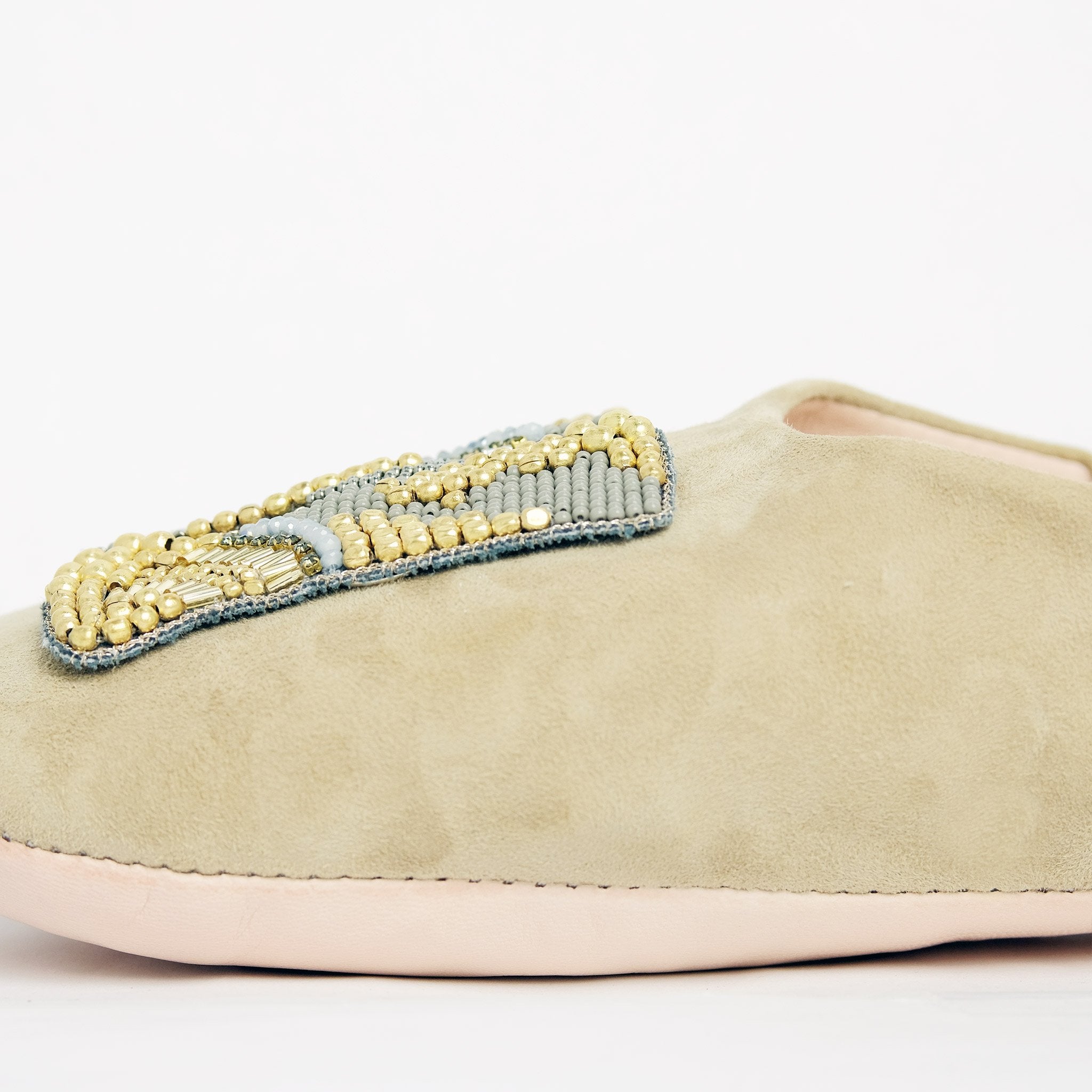 職人の手仕事が生み出す、繊細で美しい刺繍がこのバブーシュの最大の魅力。一針一針丁寧に施されたビジュー刺繍は、光の加減でさりげなく輝き、足元に上品なアクセントをプラスします。