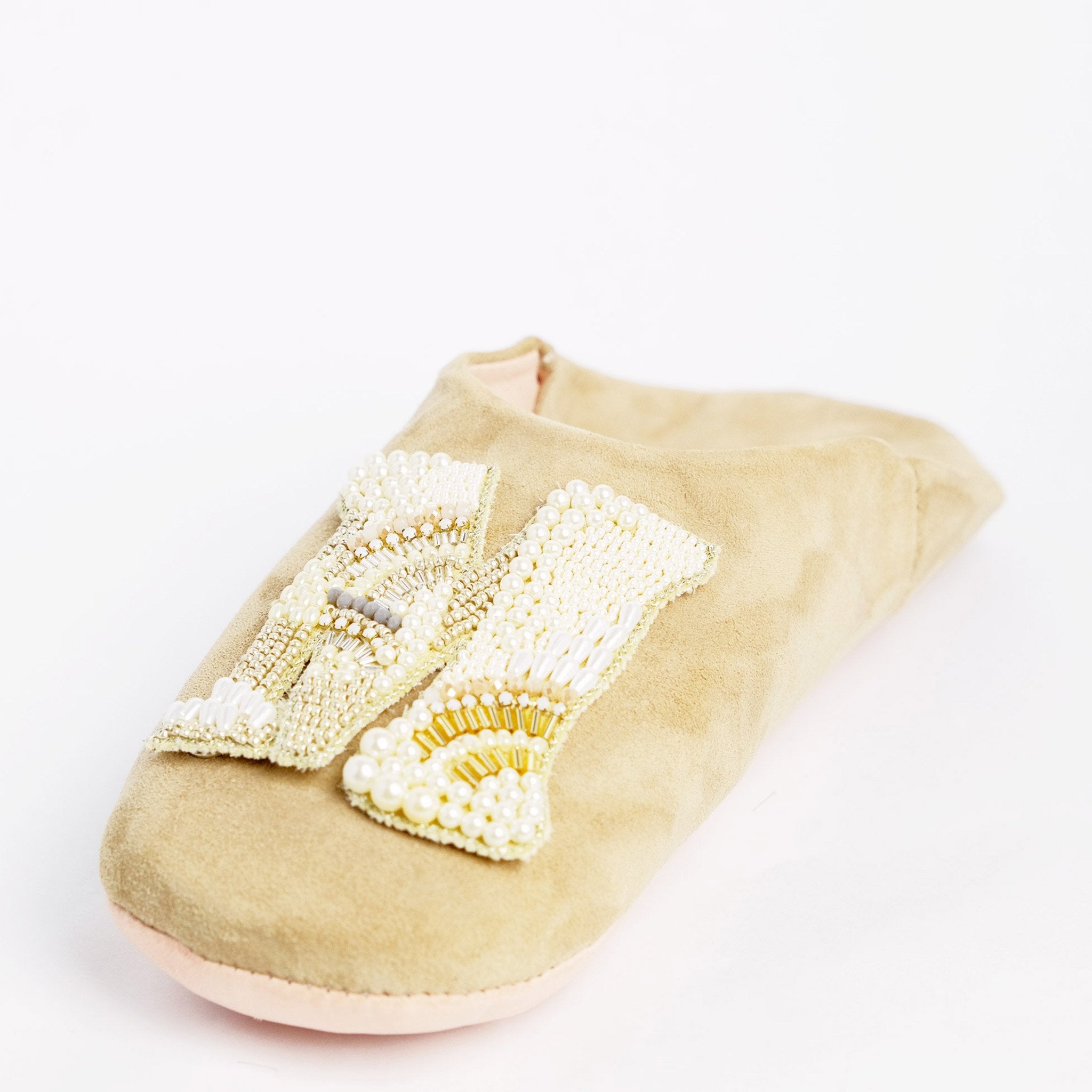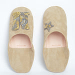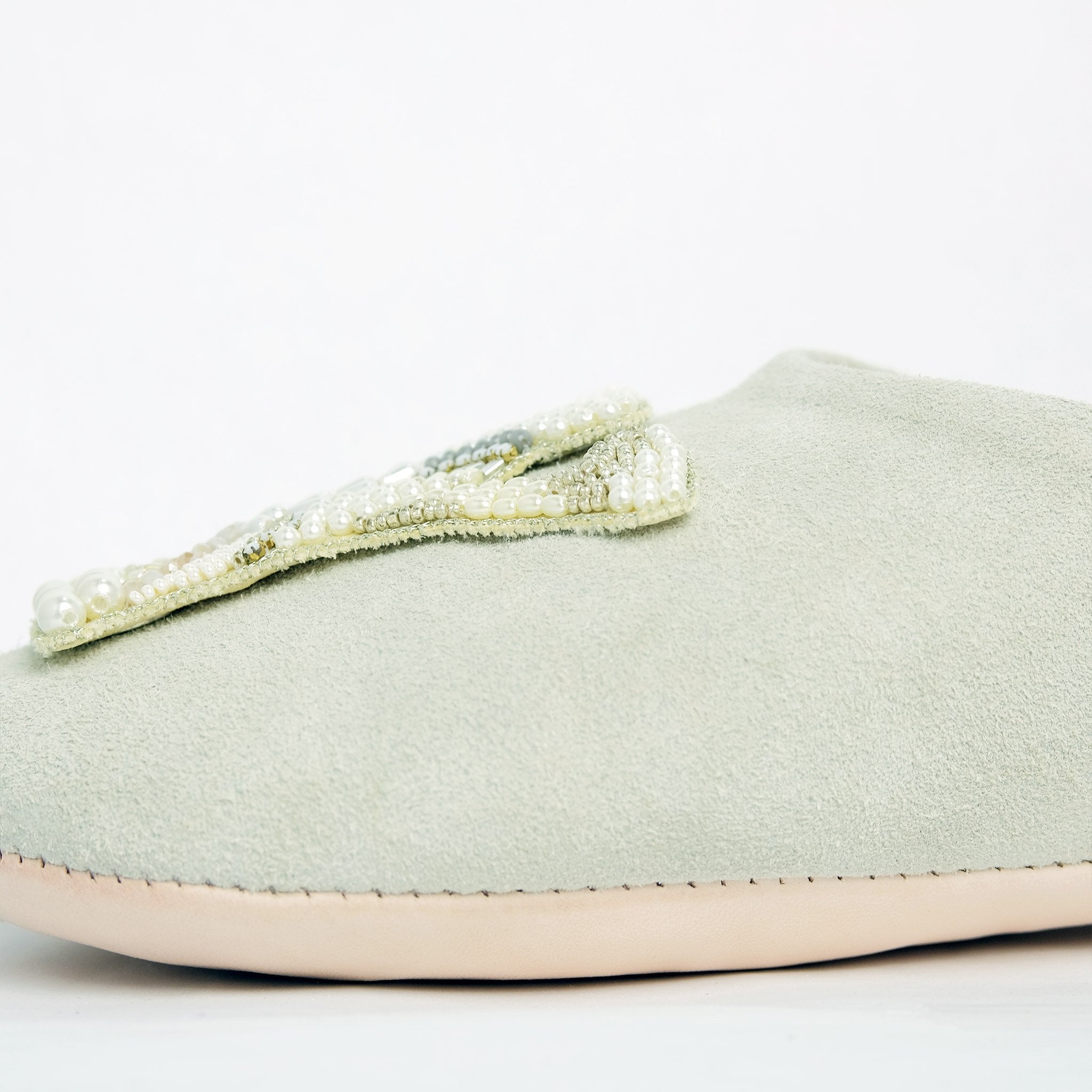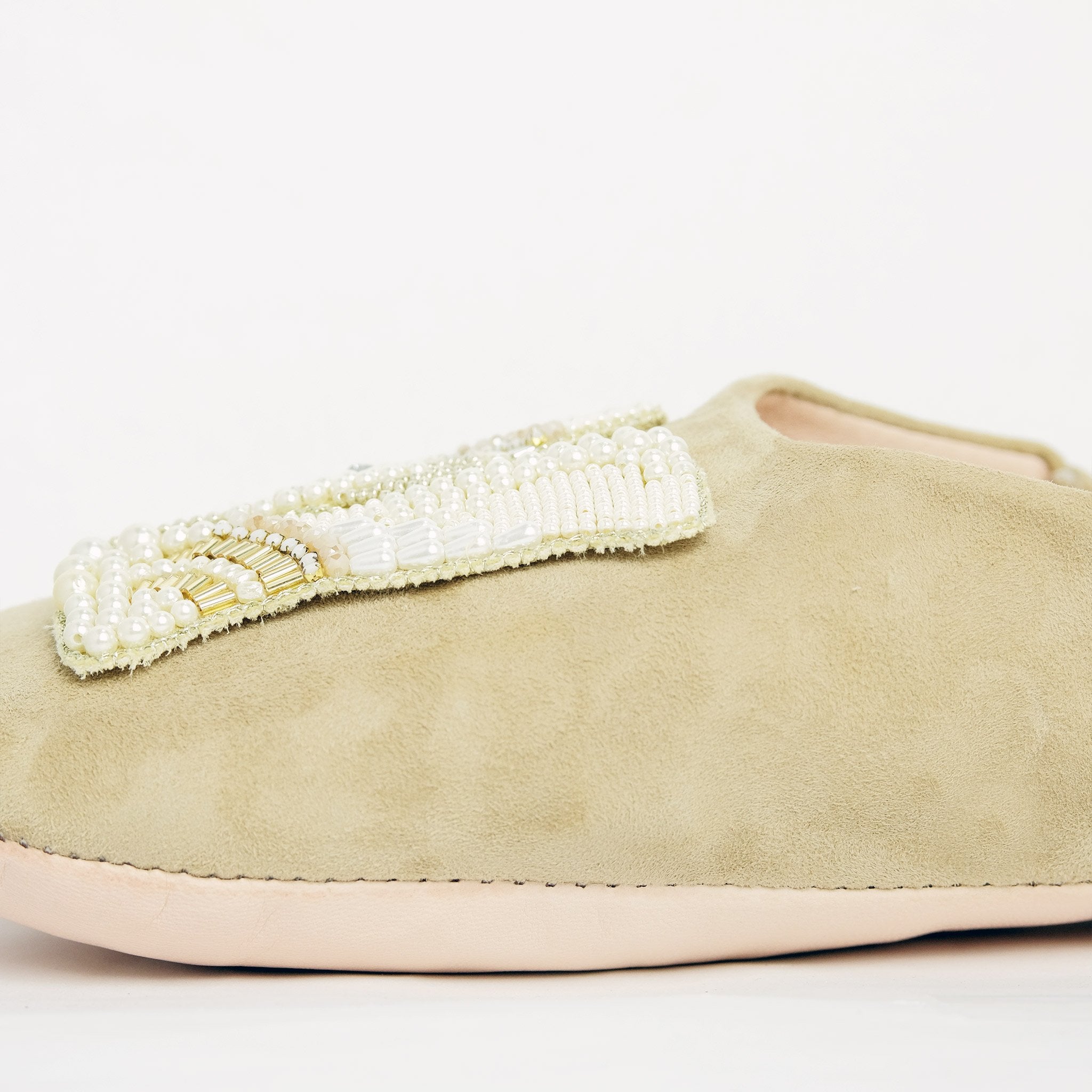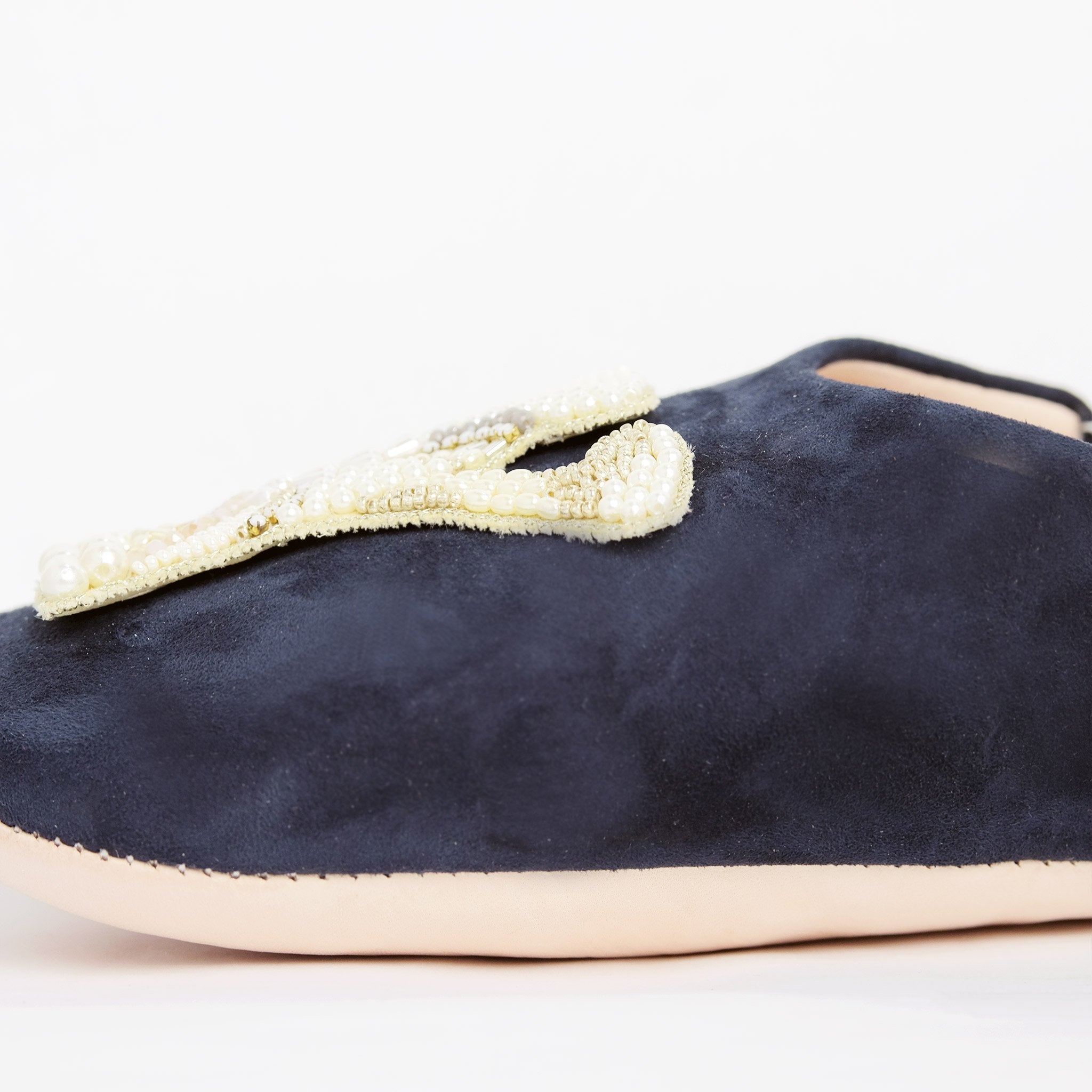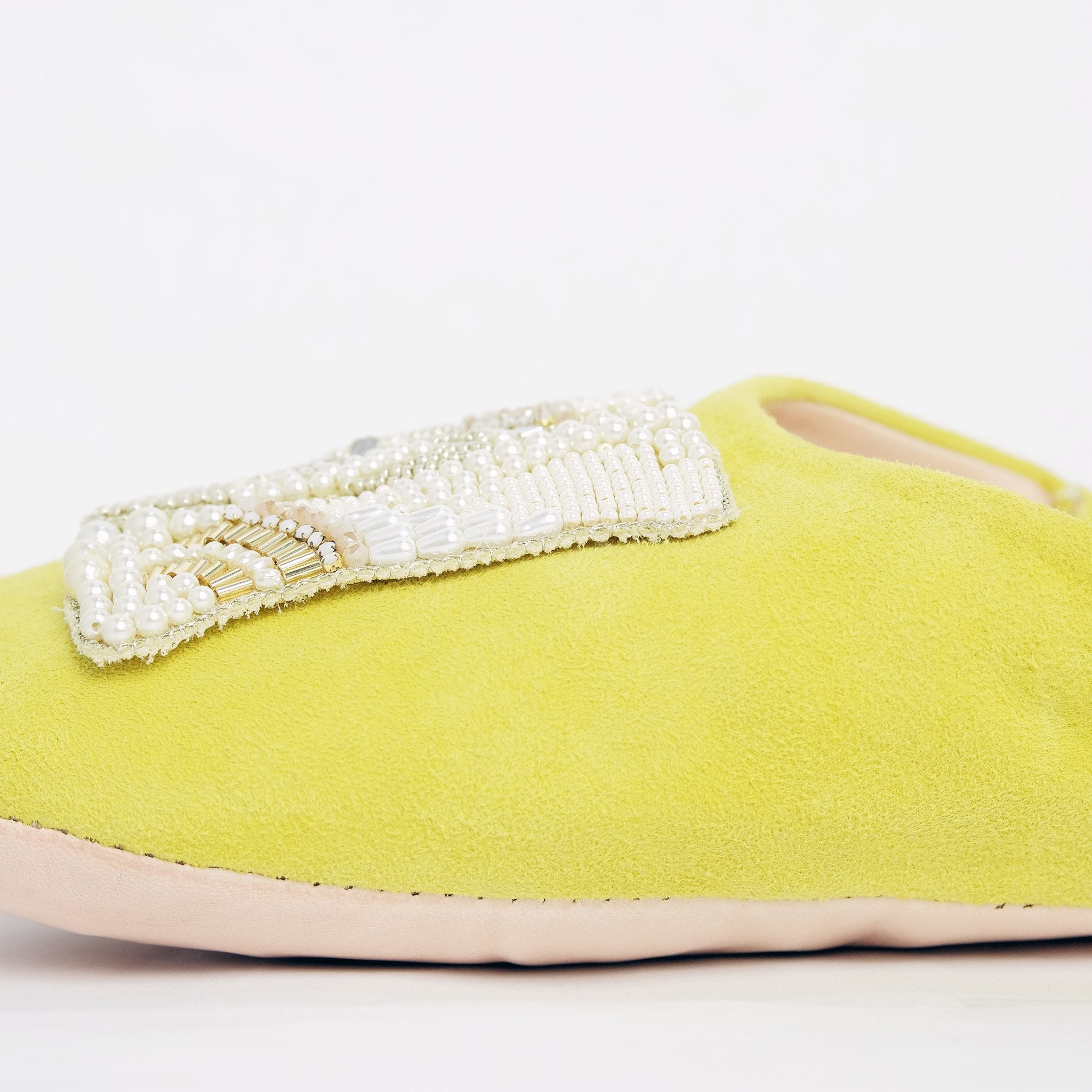 職人の手仕事が生み出す、繊細で美しい刺繍がこのバブーシュの最大の魅力。一針一針丁寧に施されたビジュー刺繍は、光の加減でさりげなく輝き、足元に上品なアクセントをプラスします。