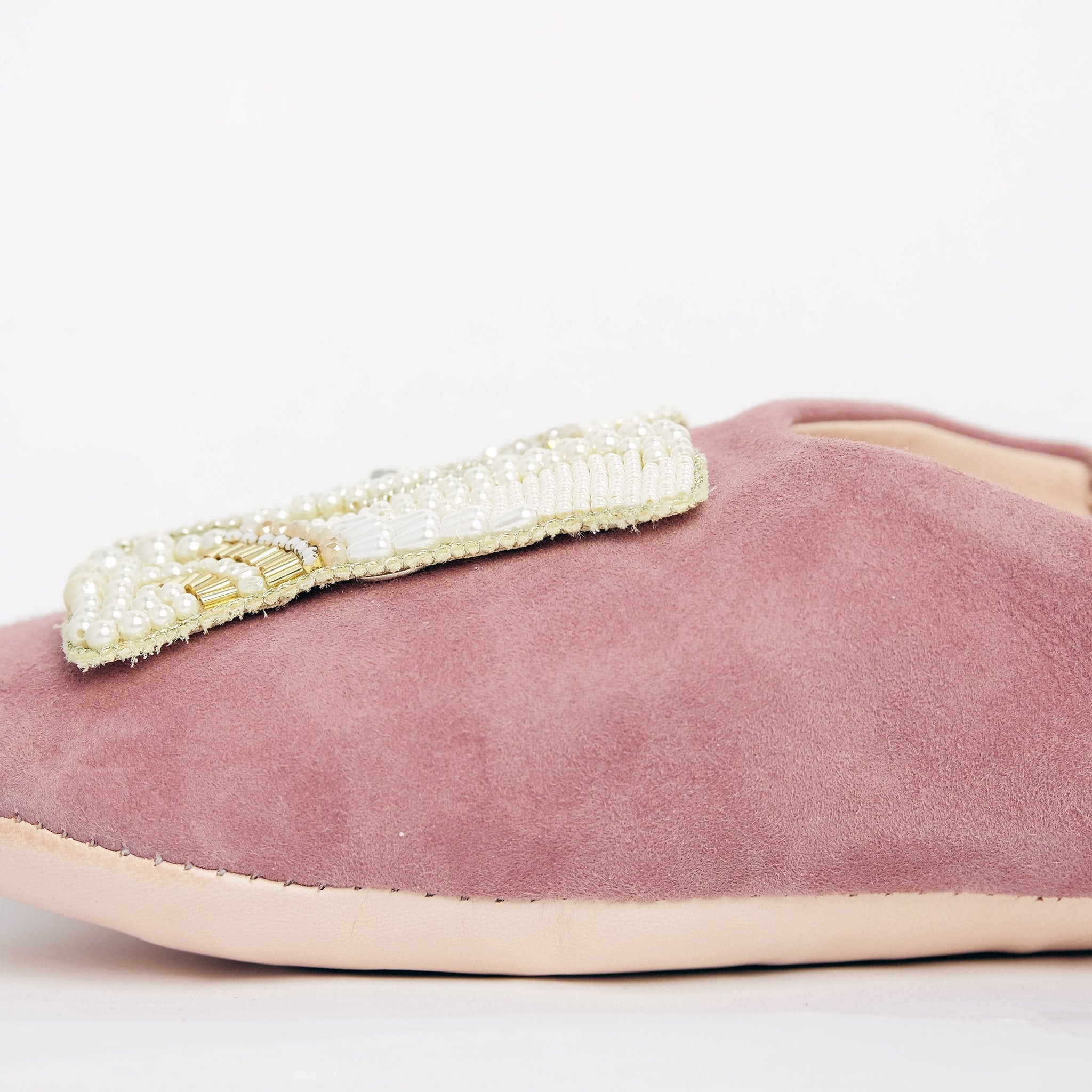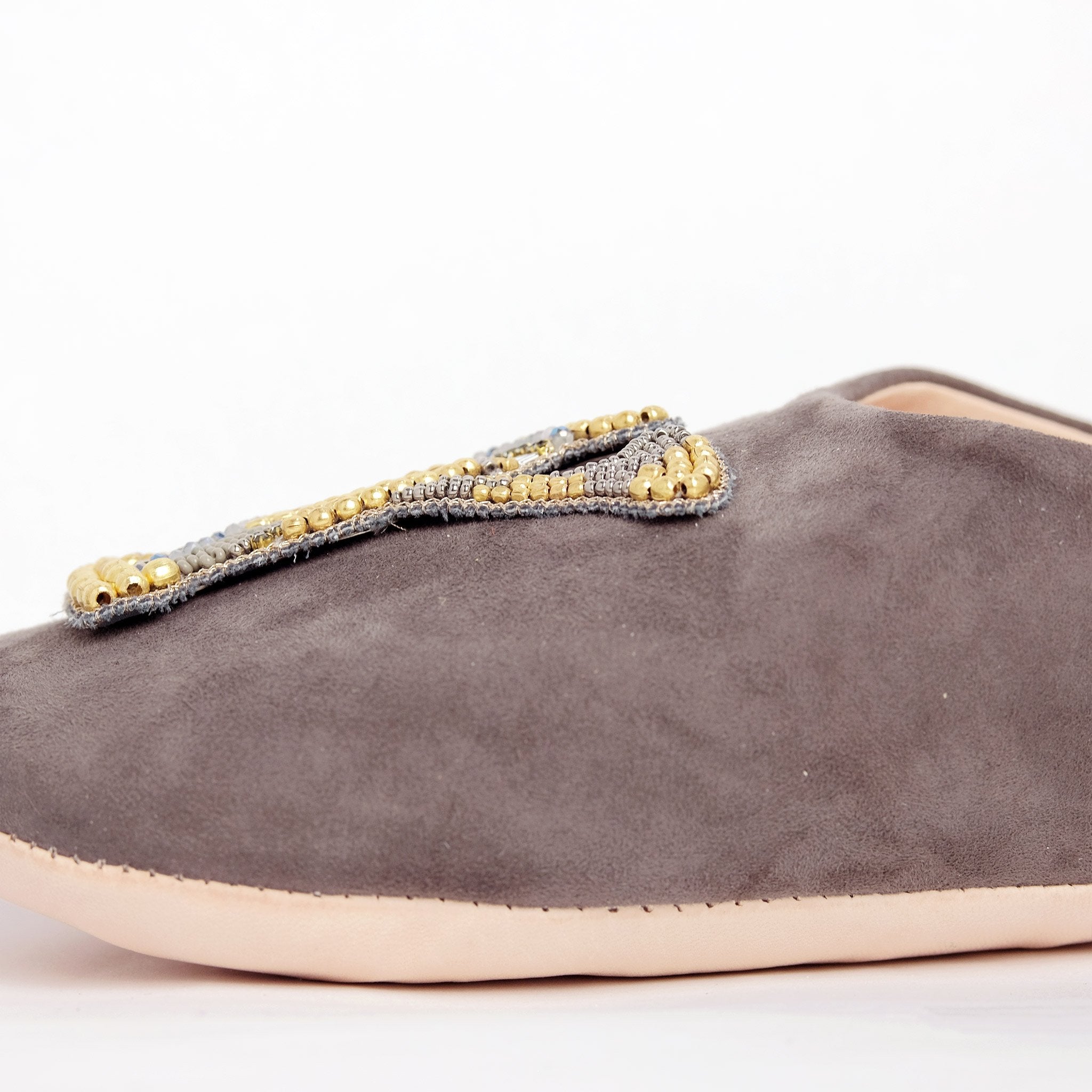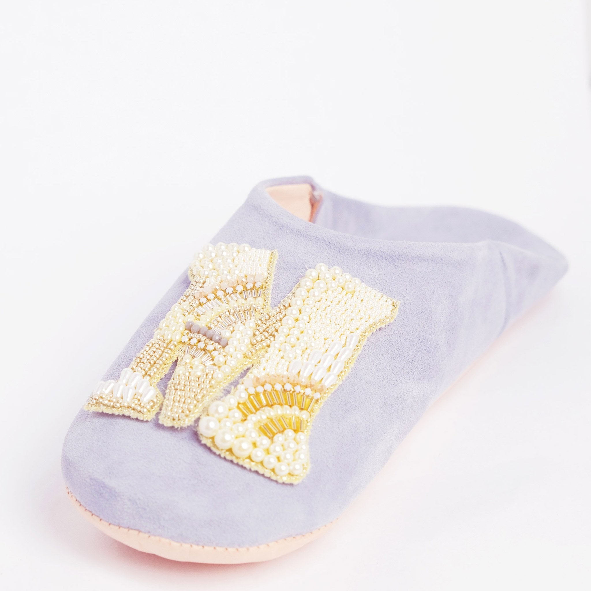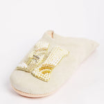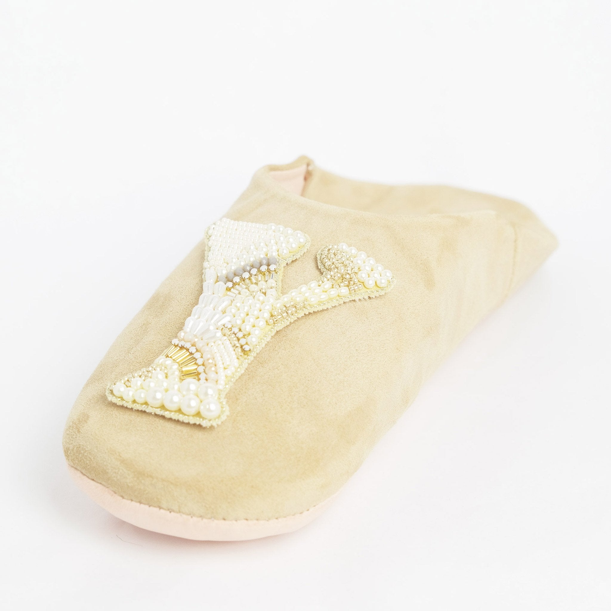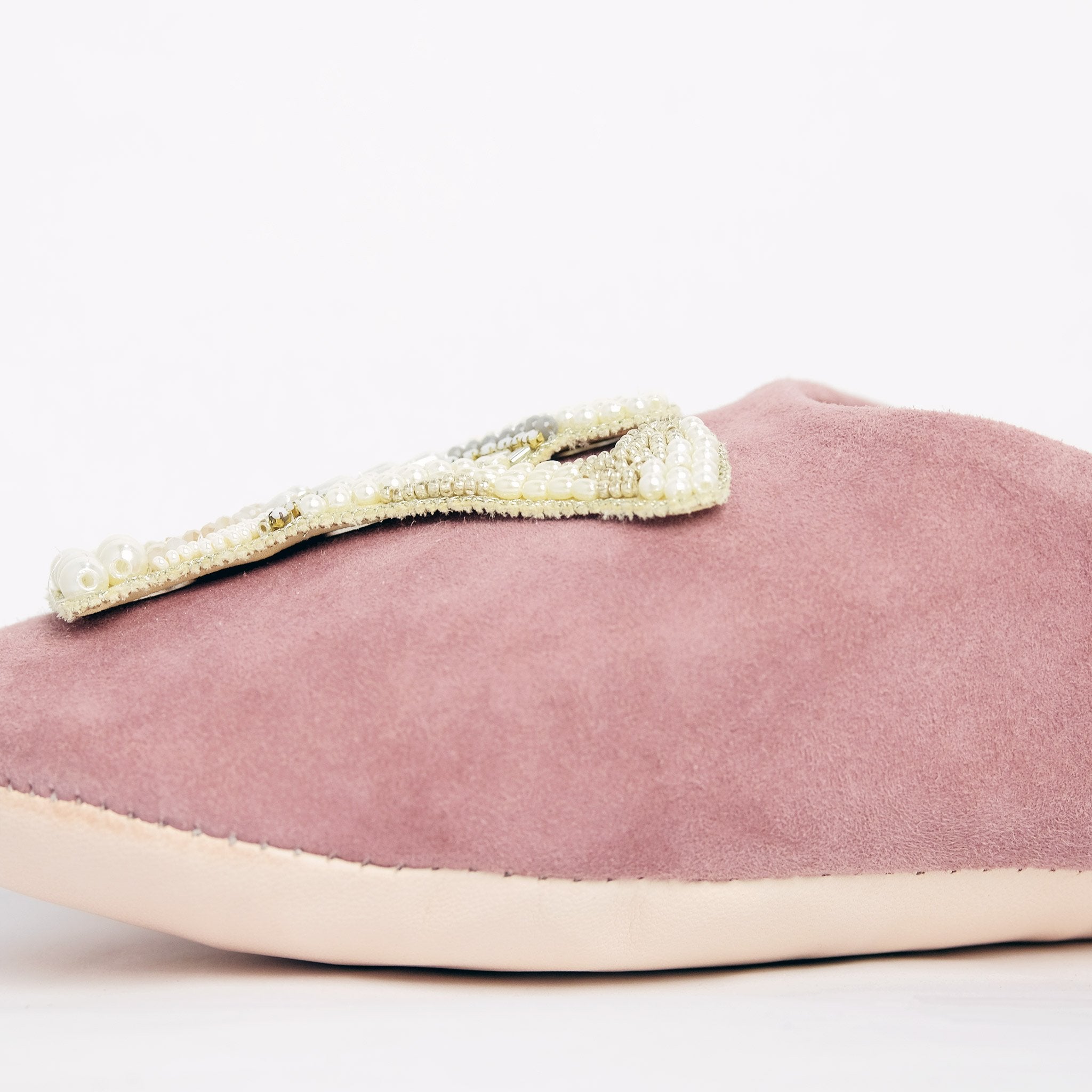 職人の手仕事が生み出す、繊細で美しい刺繍がこのバブーシュの最大の魅力。一針一針丁寧に施されたビジュー刺繍は、光の加減でさりげなく輝き、足元に上品なアクセントをプラスします。