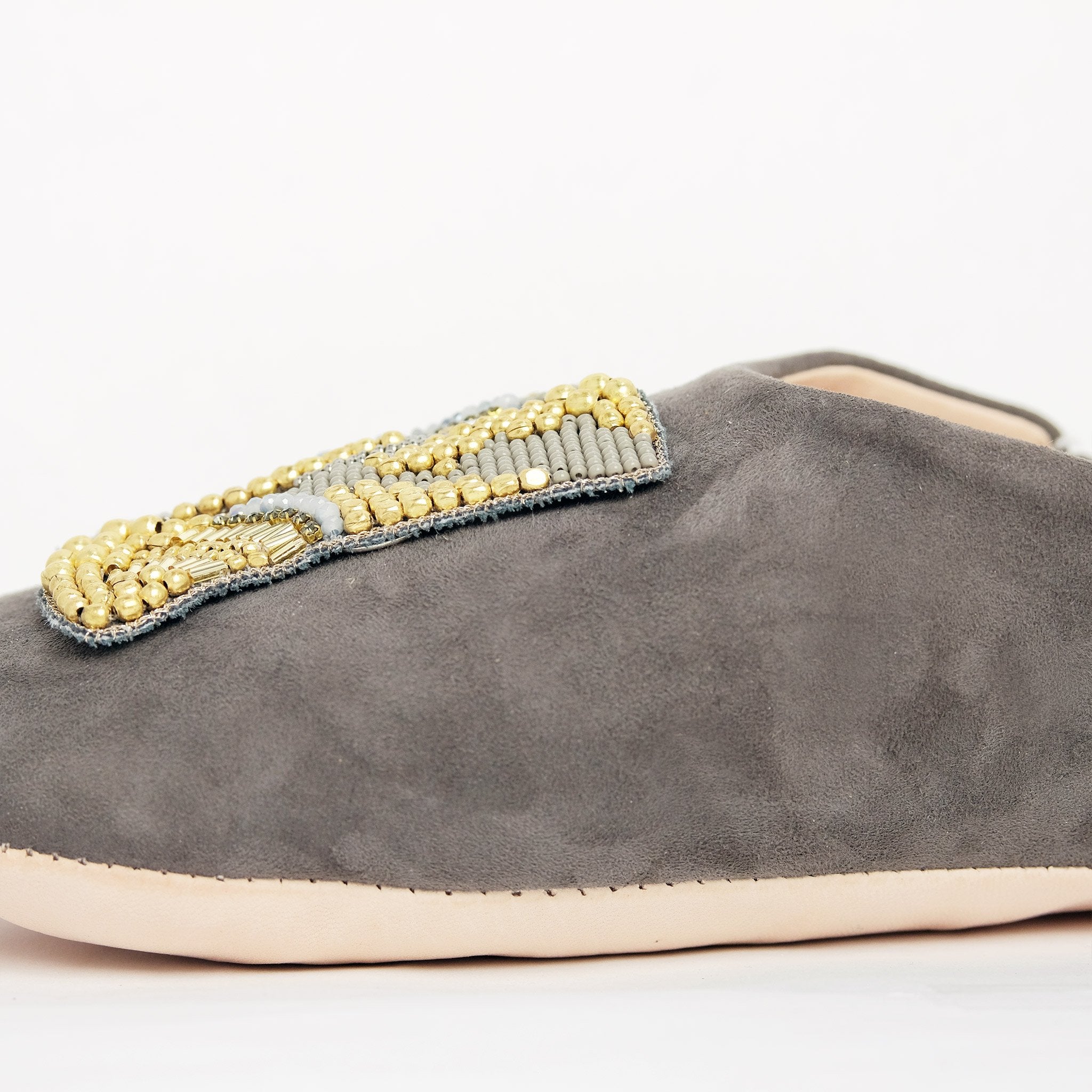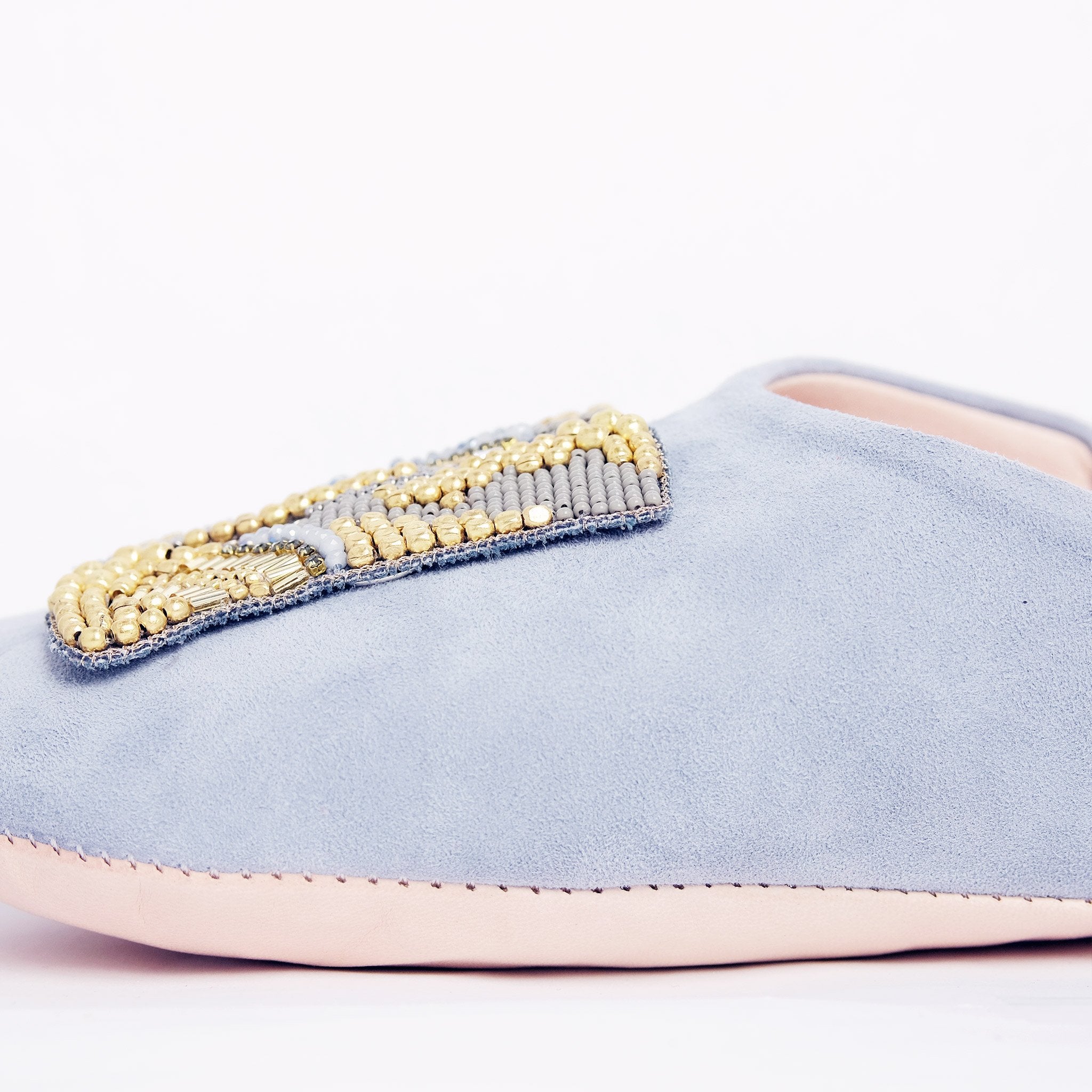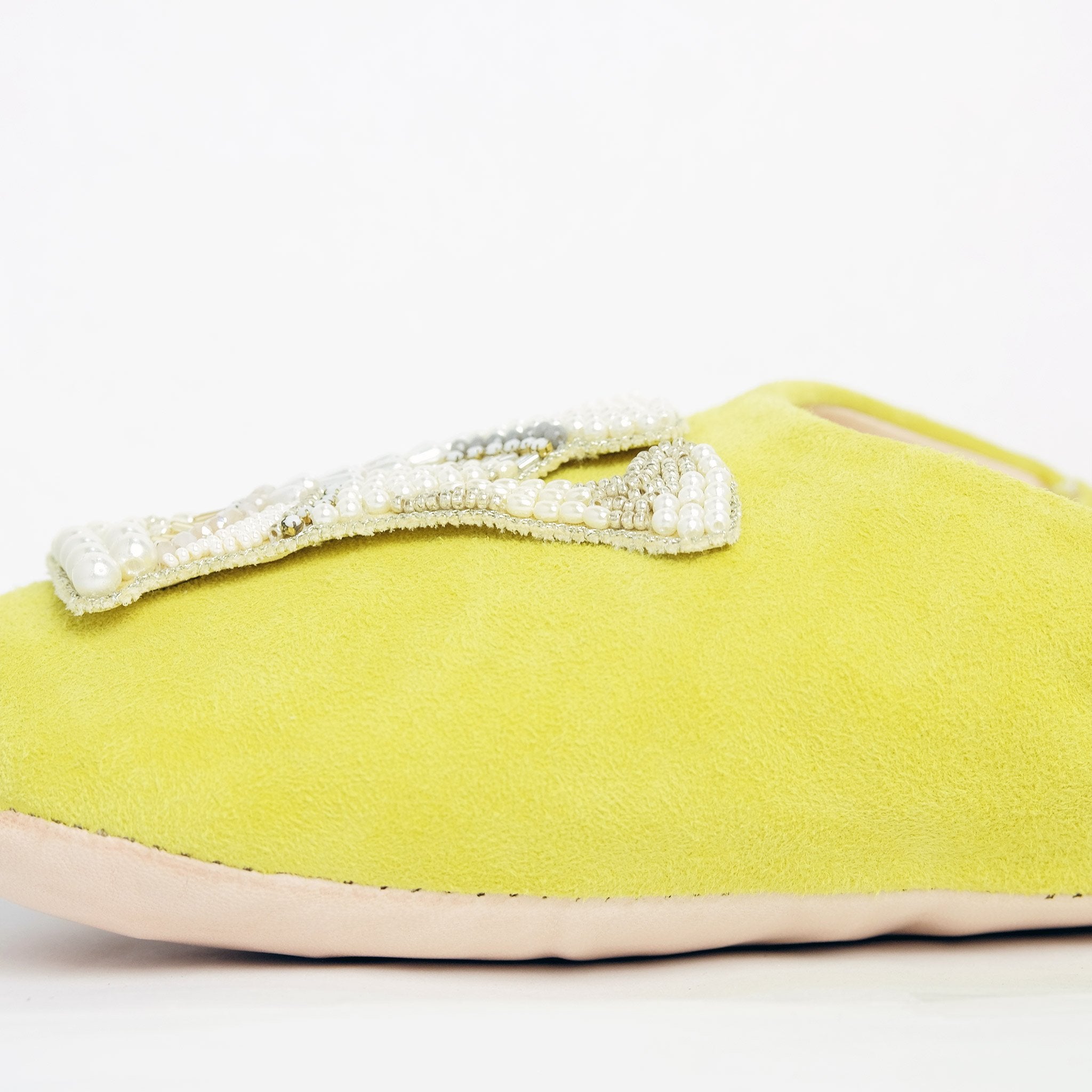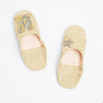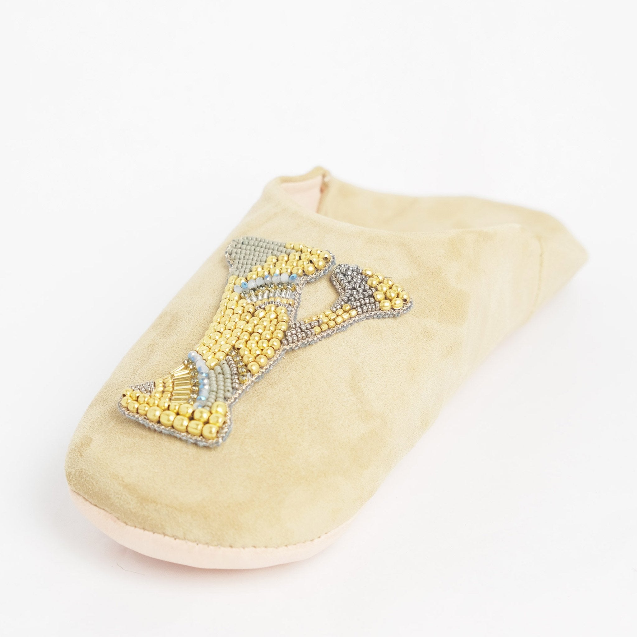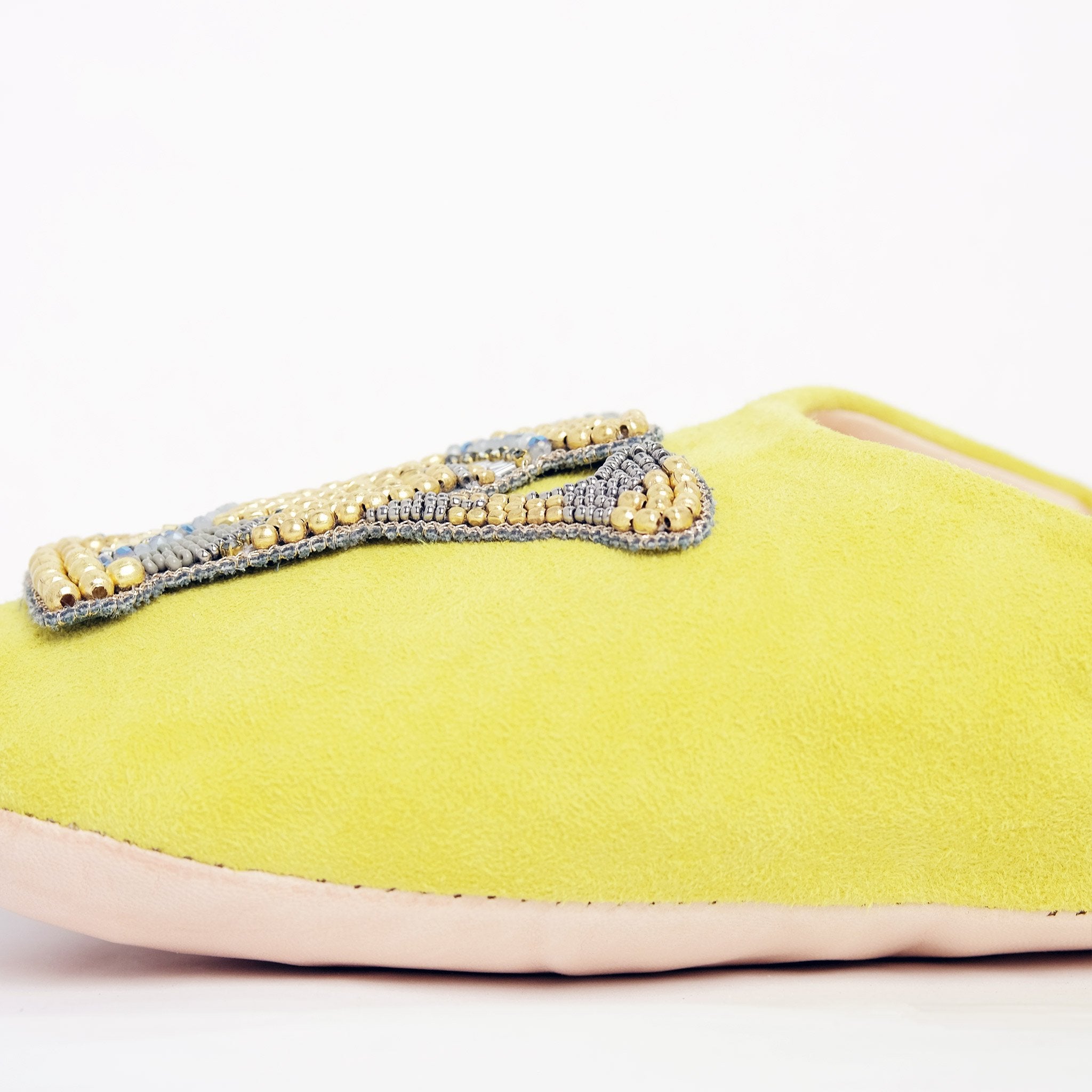 職人の手仕事が生み出す、繊細で美しい刺繍がこのバブーシュの最大の魅力。一針一針丁寧に施されたビジュー刺繍は、光の加減でさりげなく輝き、足元に上品なアクセントをプラスします。