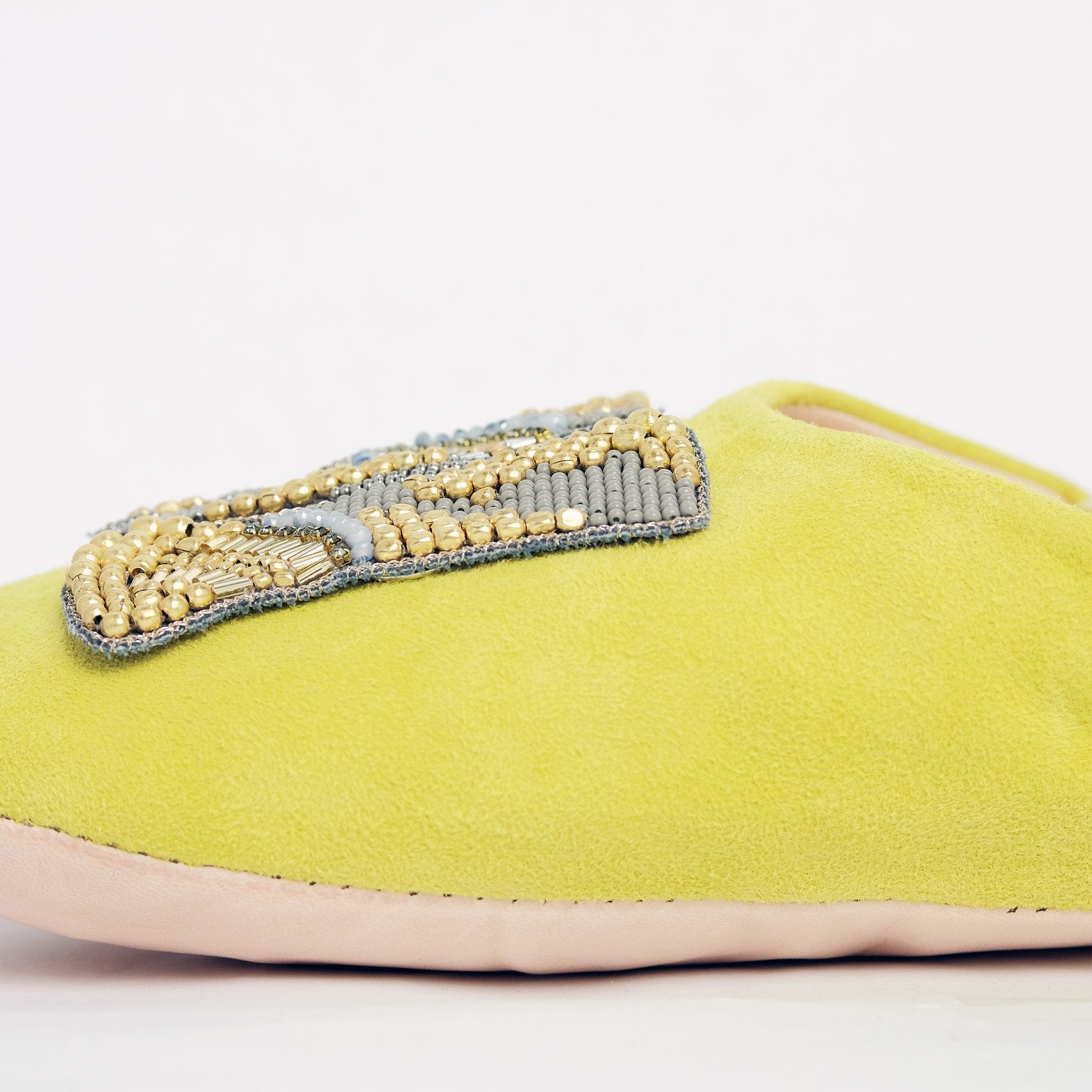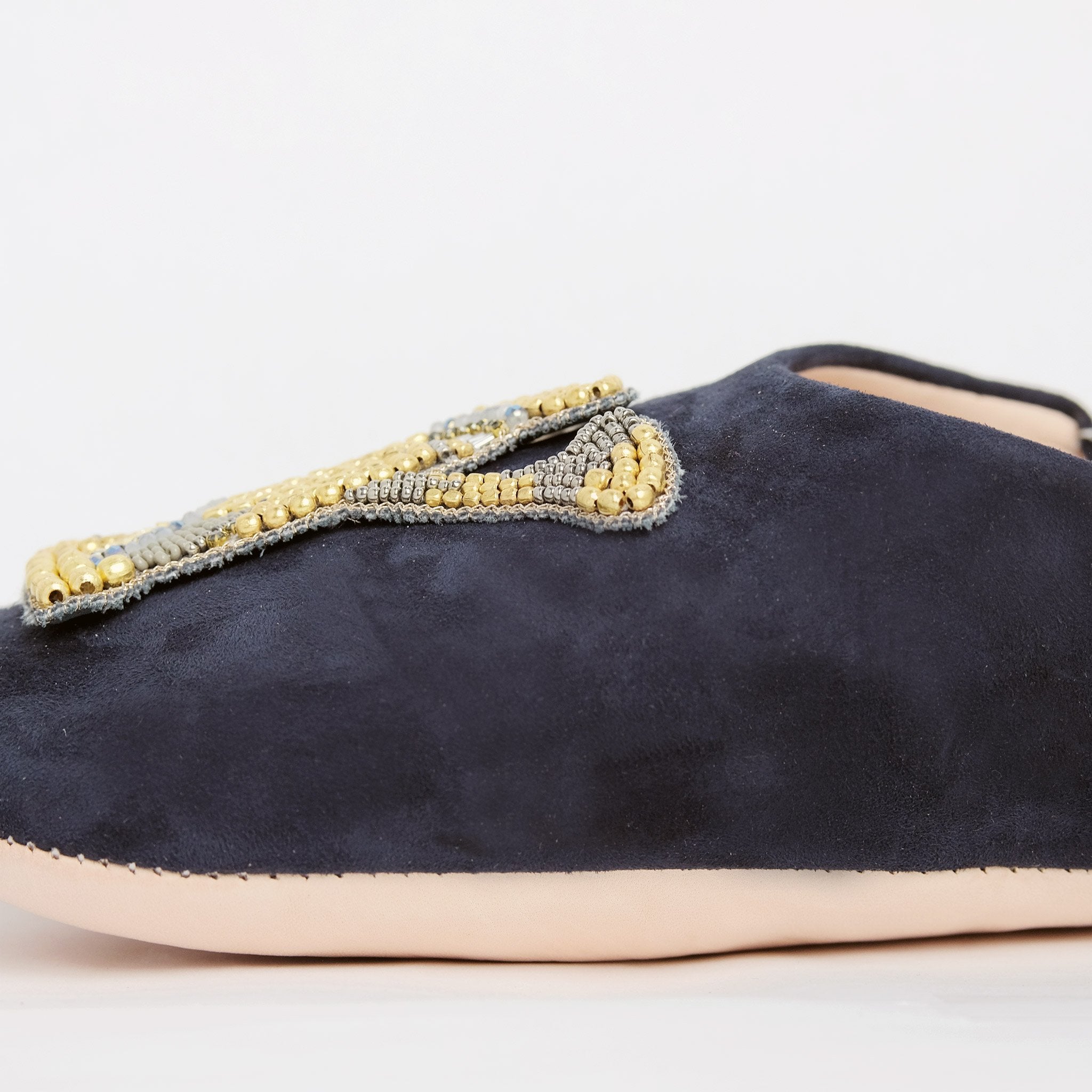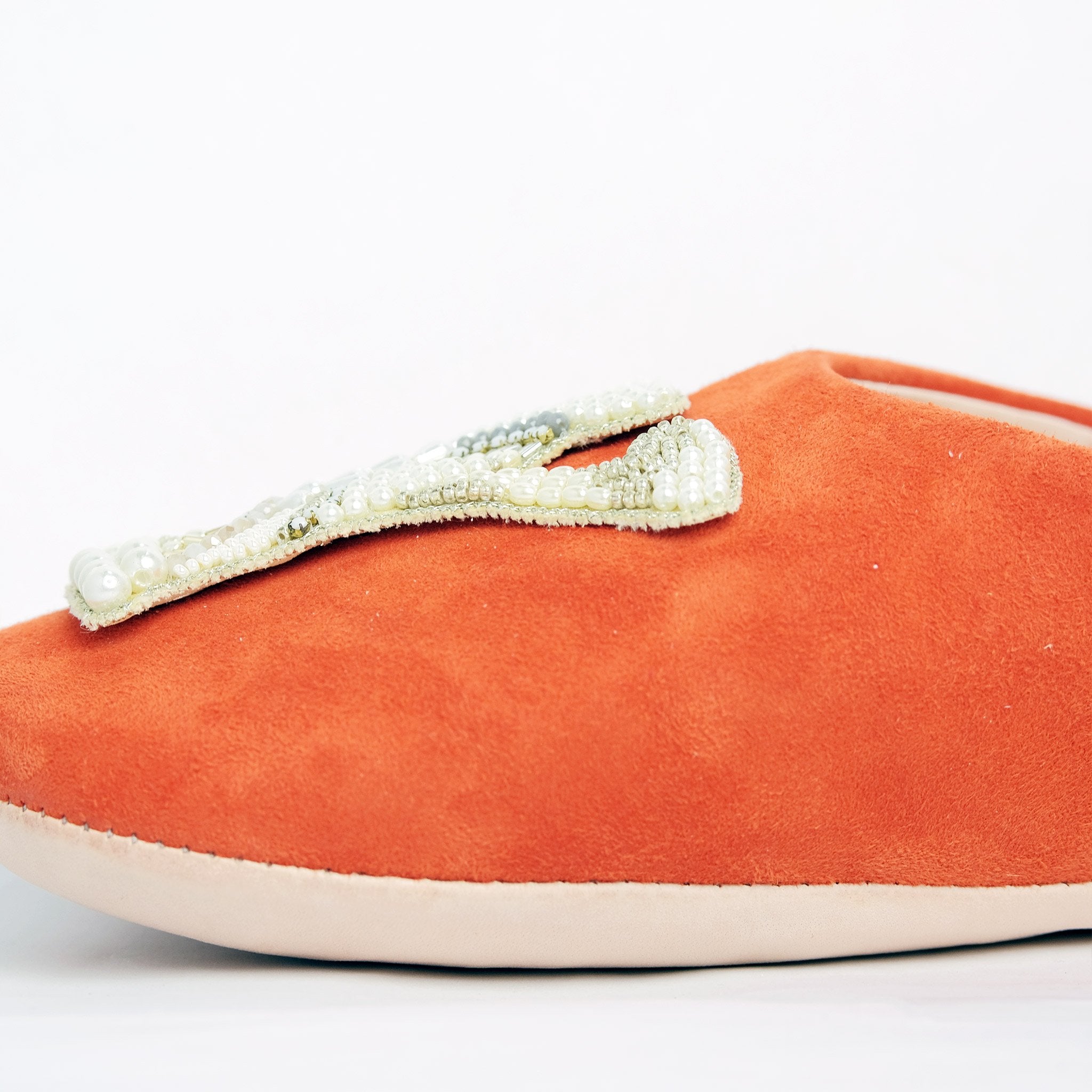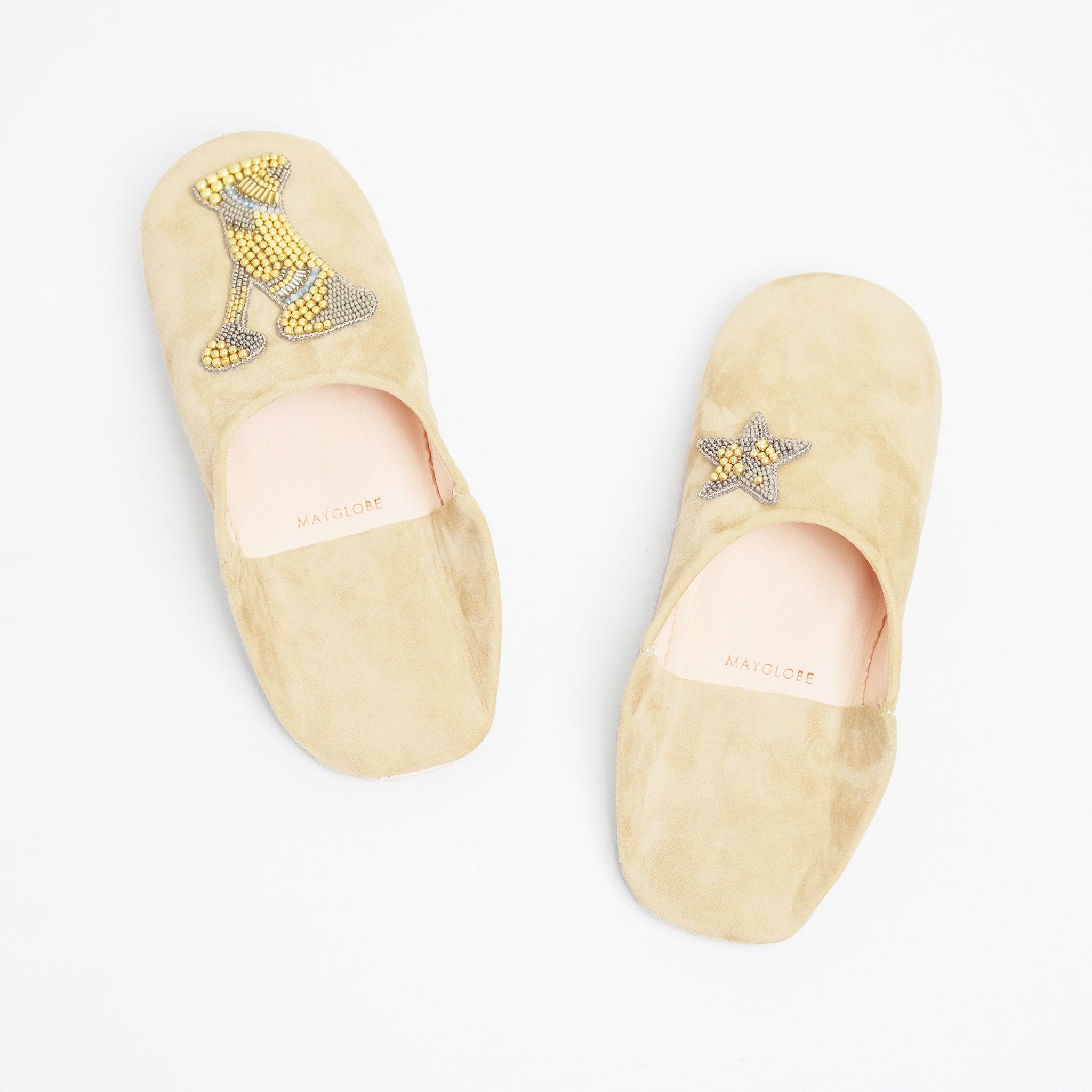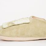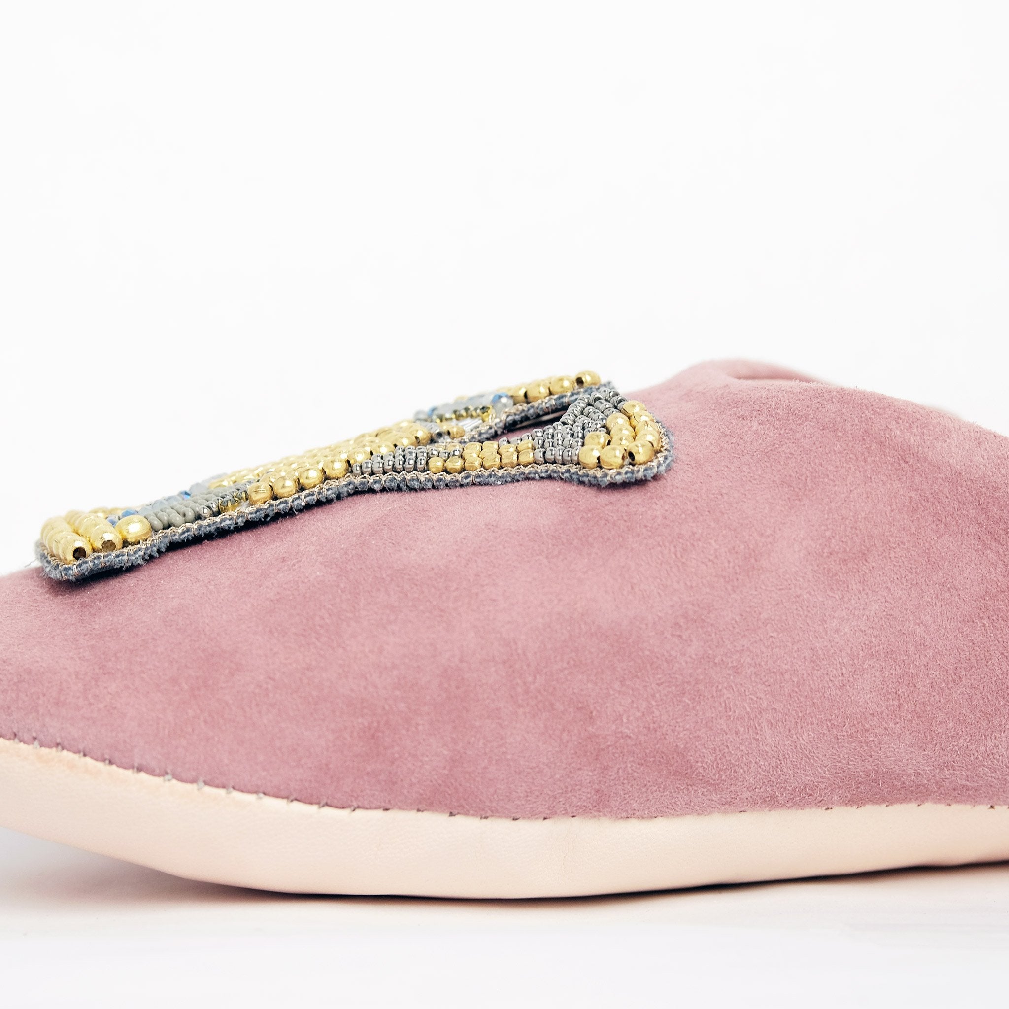 職人の手仕事が生み出す、繊細で美しい刺繍がこのバブーシュの最大の魅力。一針一針丁寧に施されたビジュー刺繍は、光の加減でさりげなく輝き、足元に上品なアクセントをプラスします。