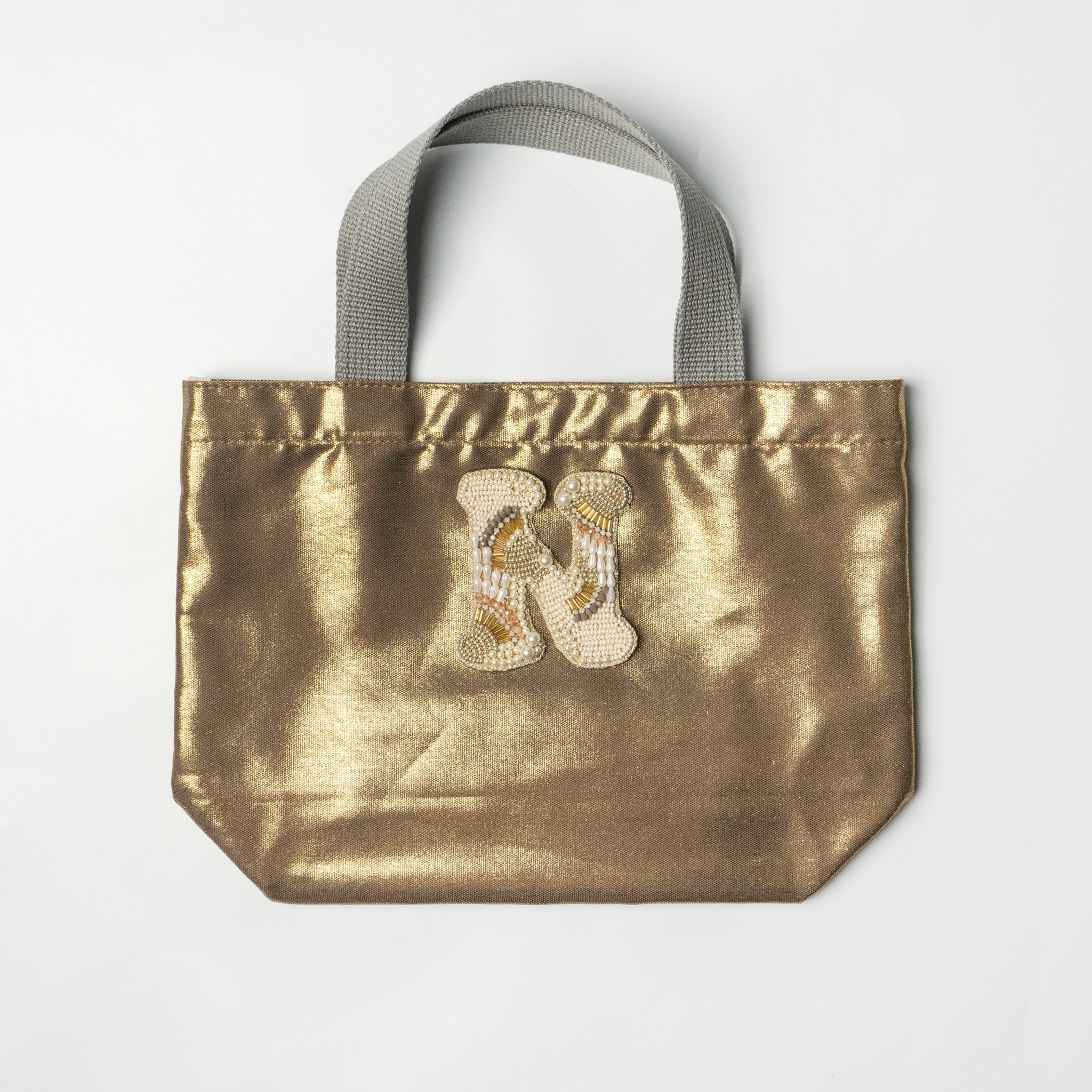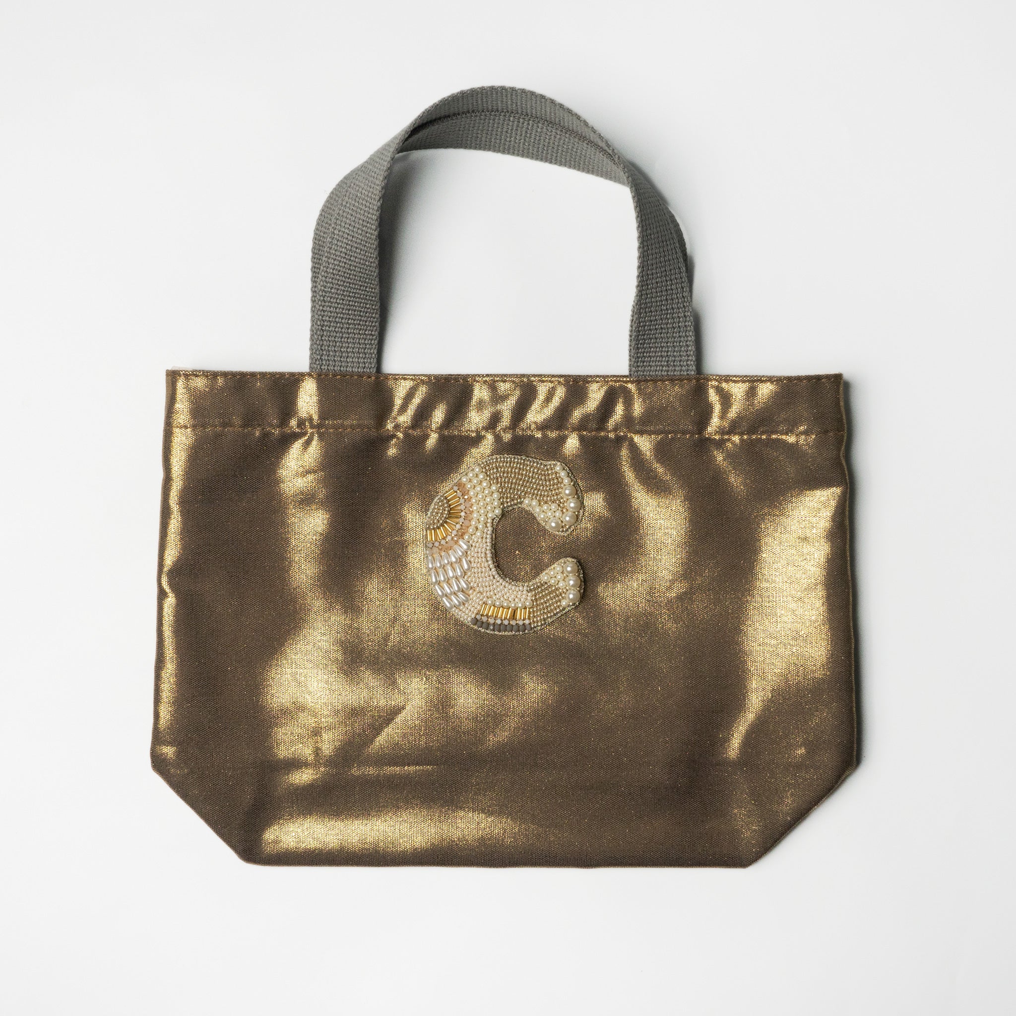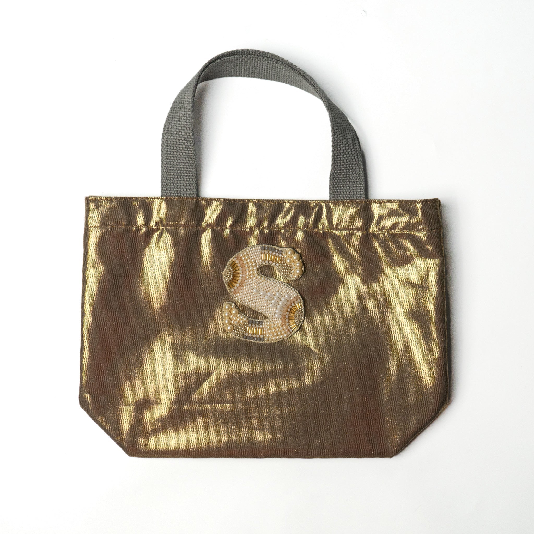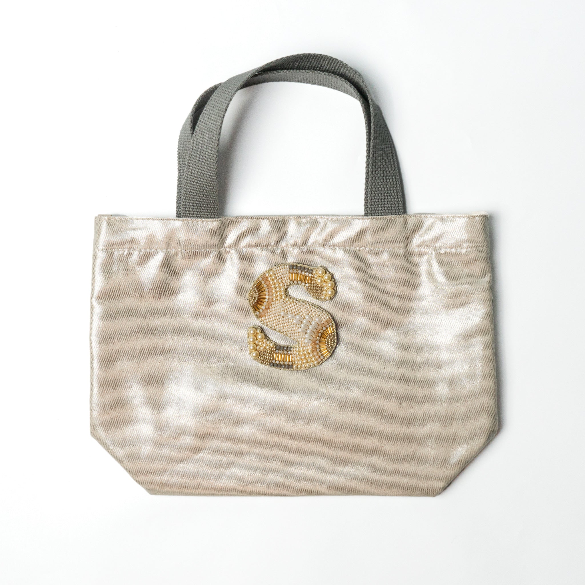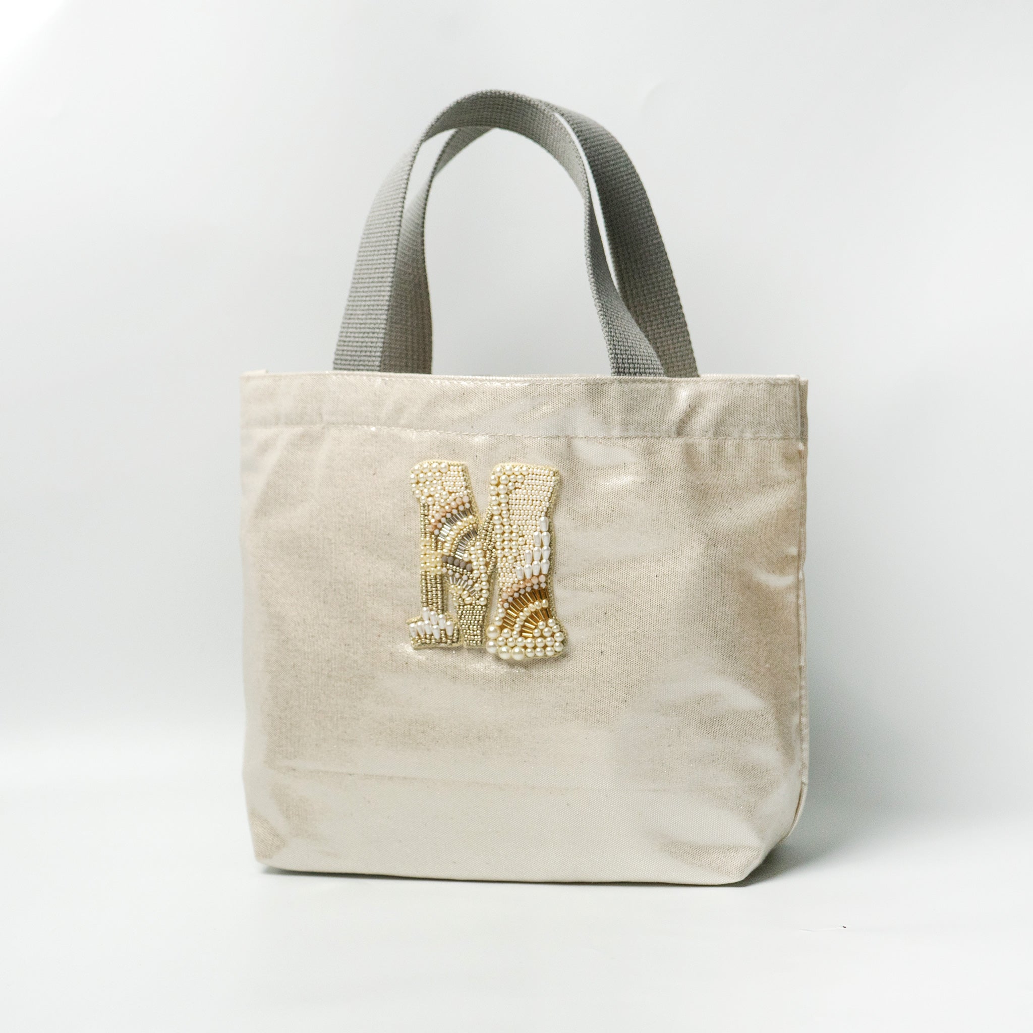 コットンの生地にオリジナルの箔プリントを施したバッグにインドで昔から代々伝わる繊細なハンドワークによって作られたユニークなモチーフが付いたミニトートバッグ。