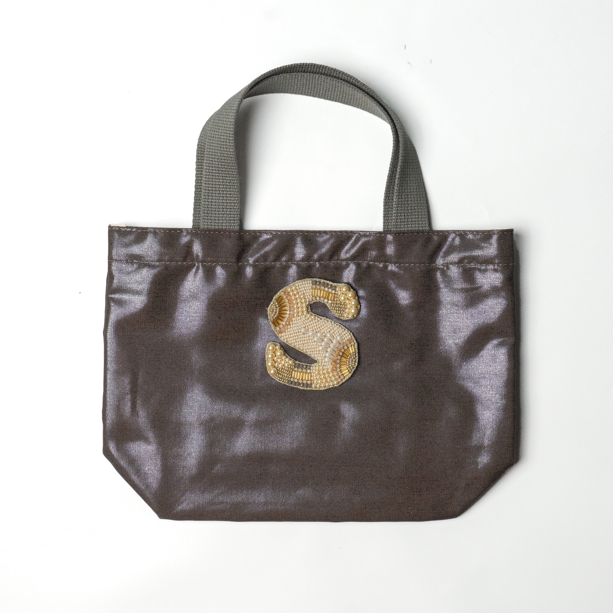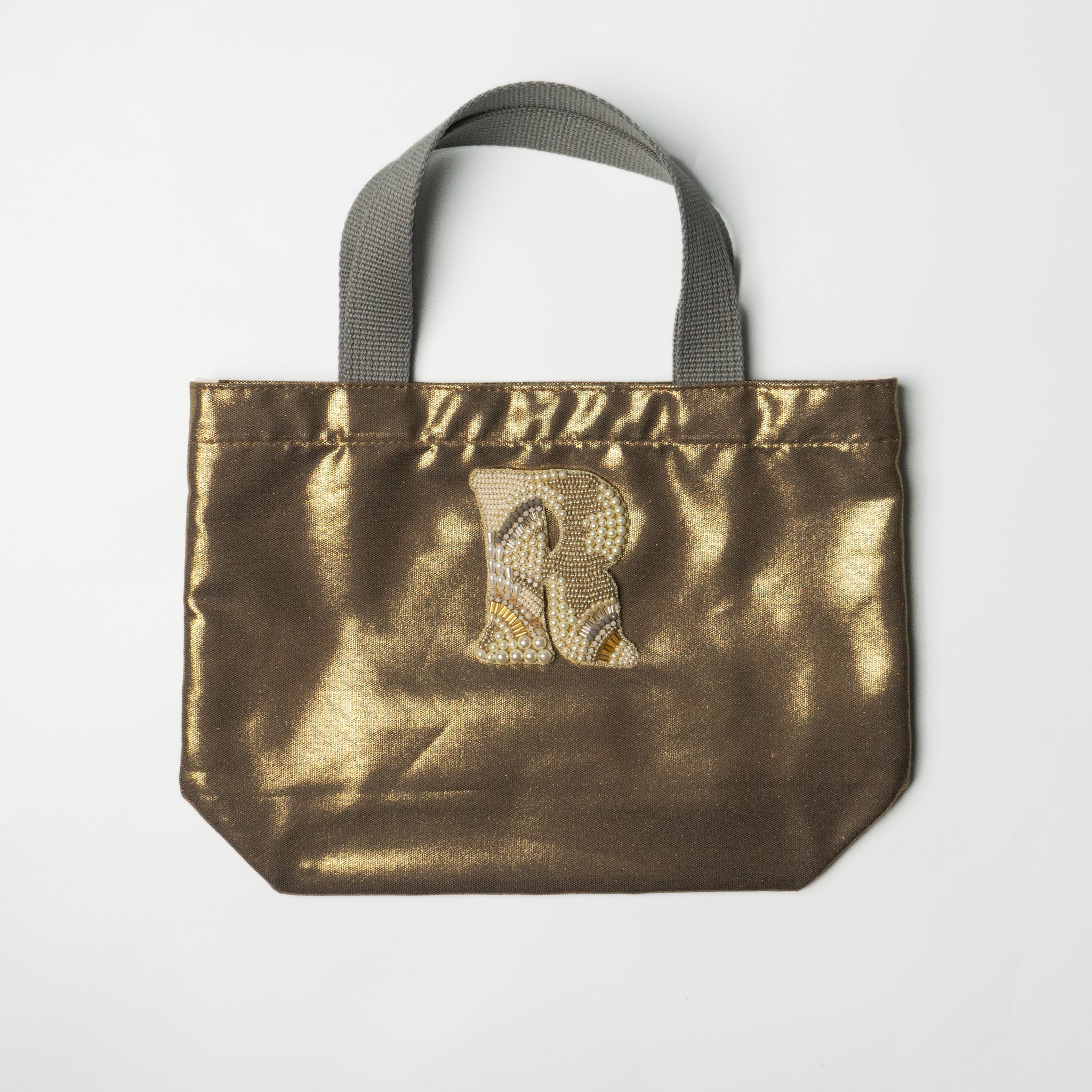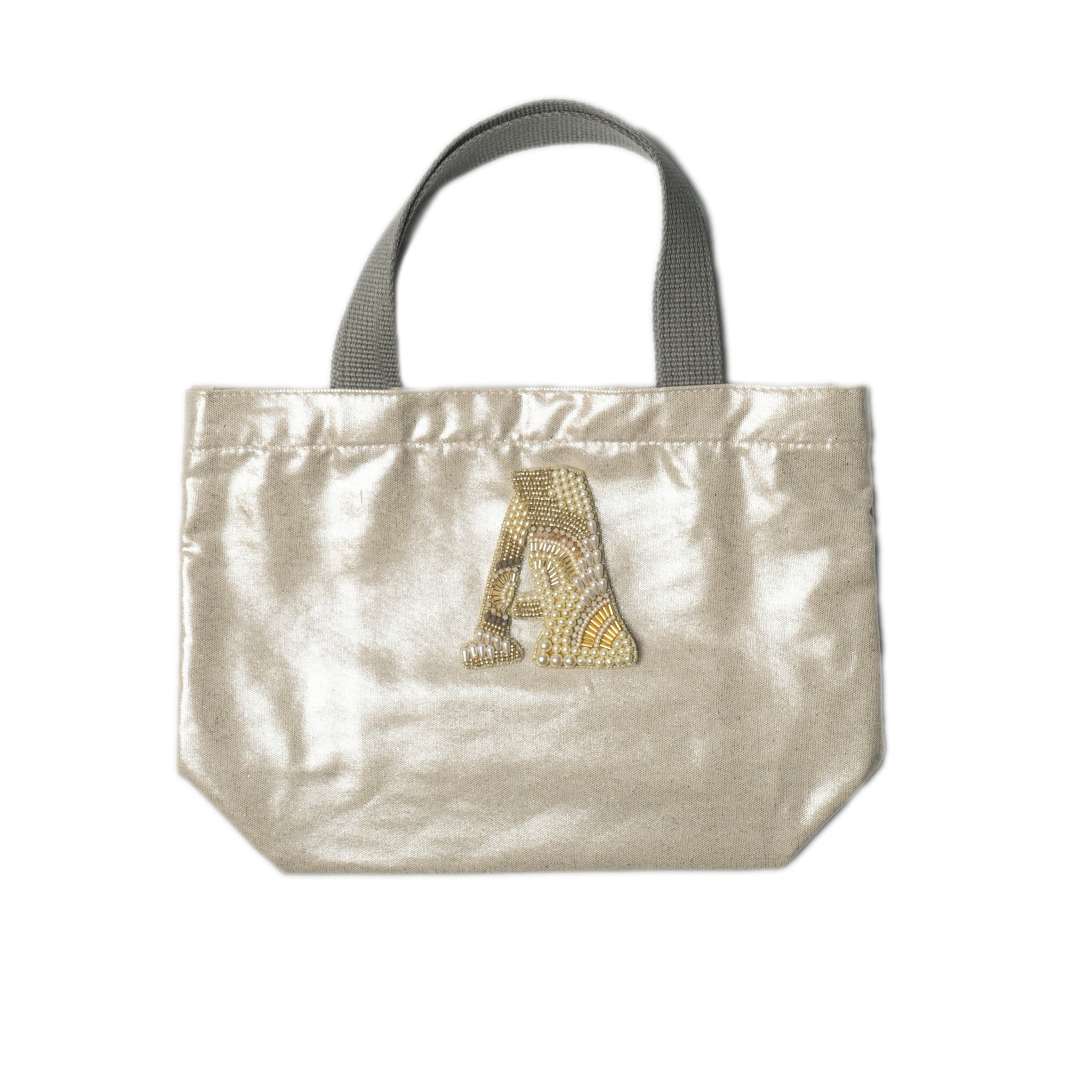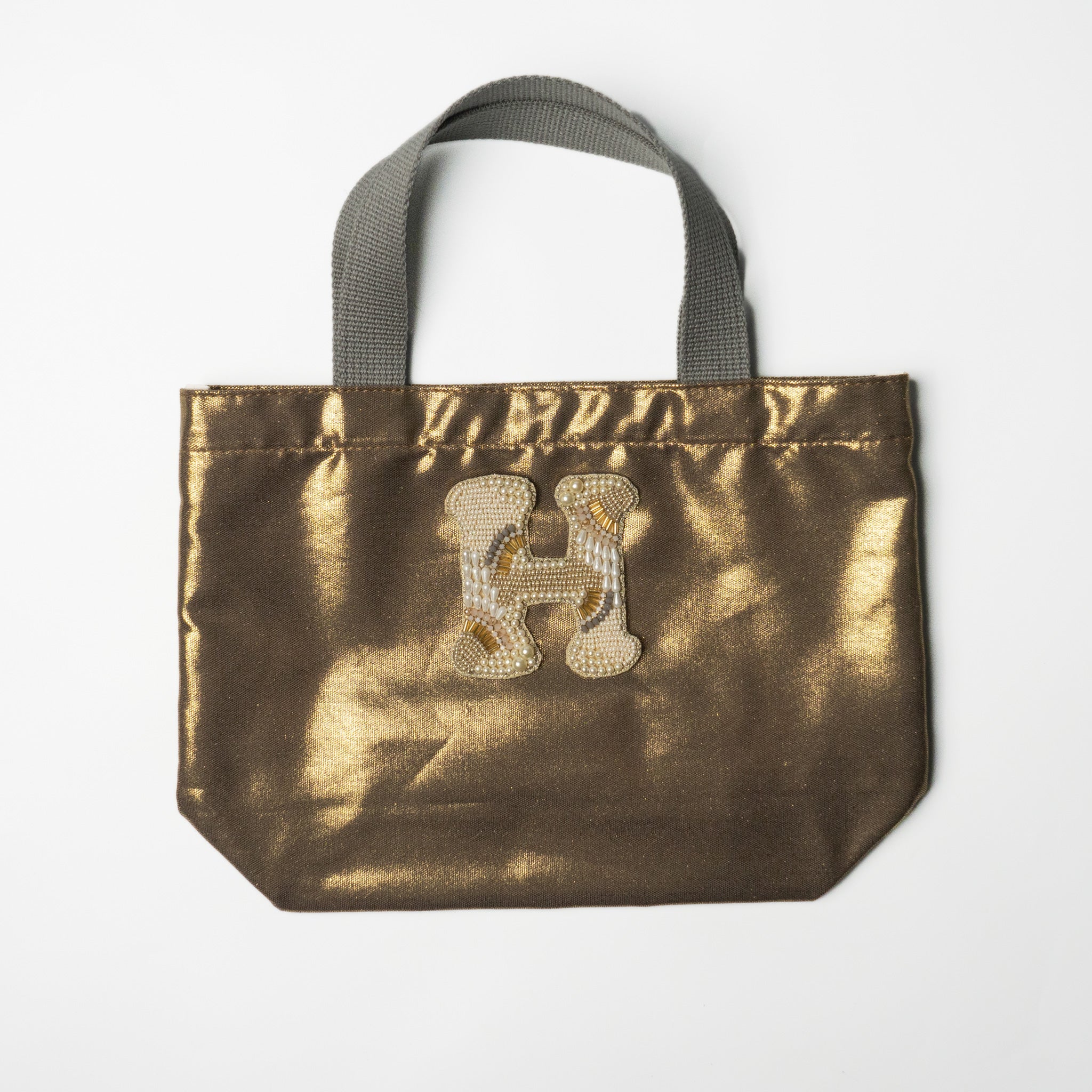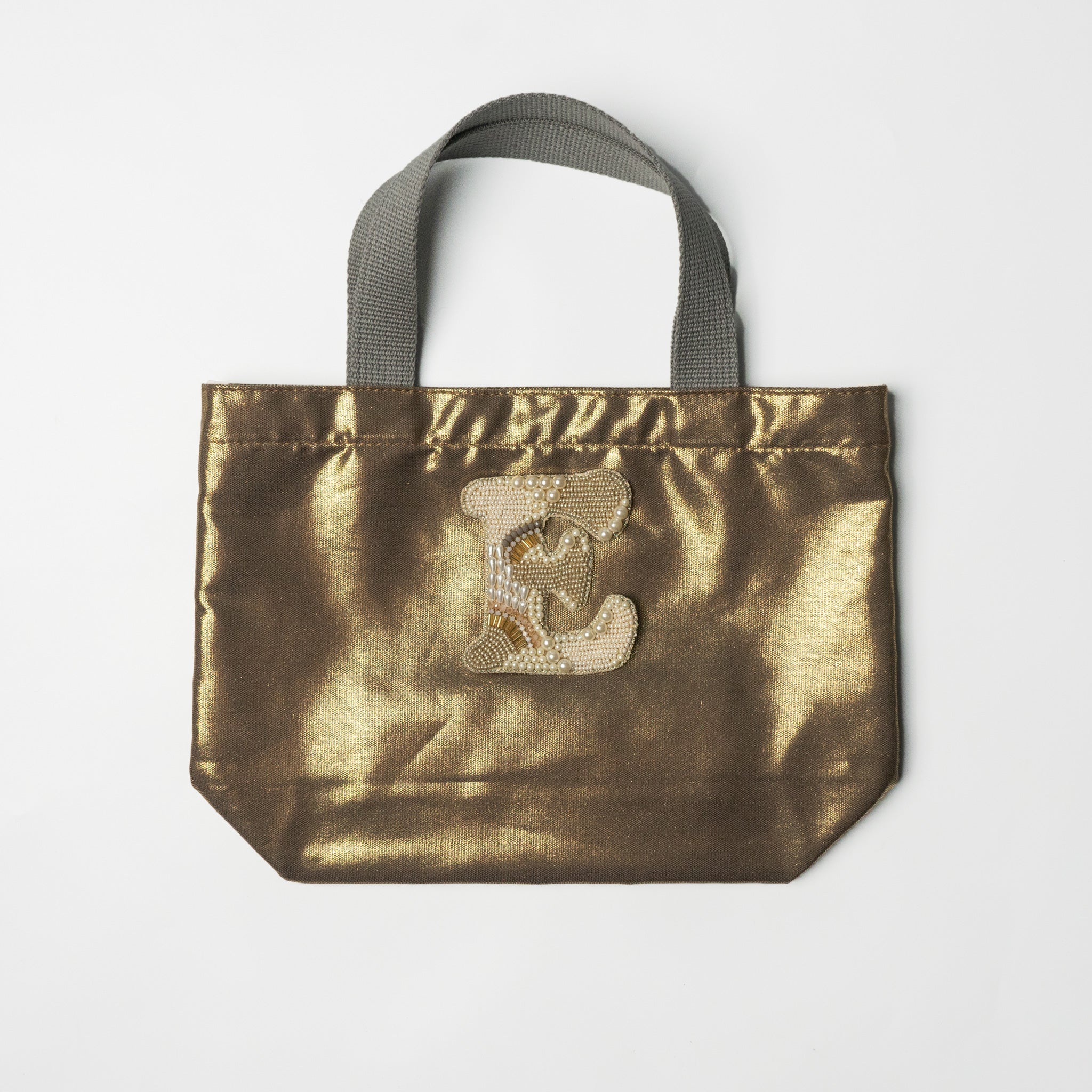 コットンの生地にオリジナルの箔プリントを施したバッグにインドで昔から代々伝わる繊細なハンドワークによって作られたユニークなモチーフが付いたミニトートバッグ。