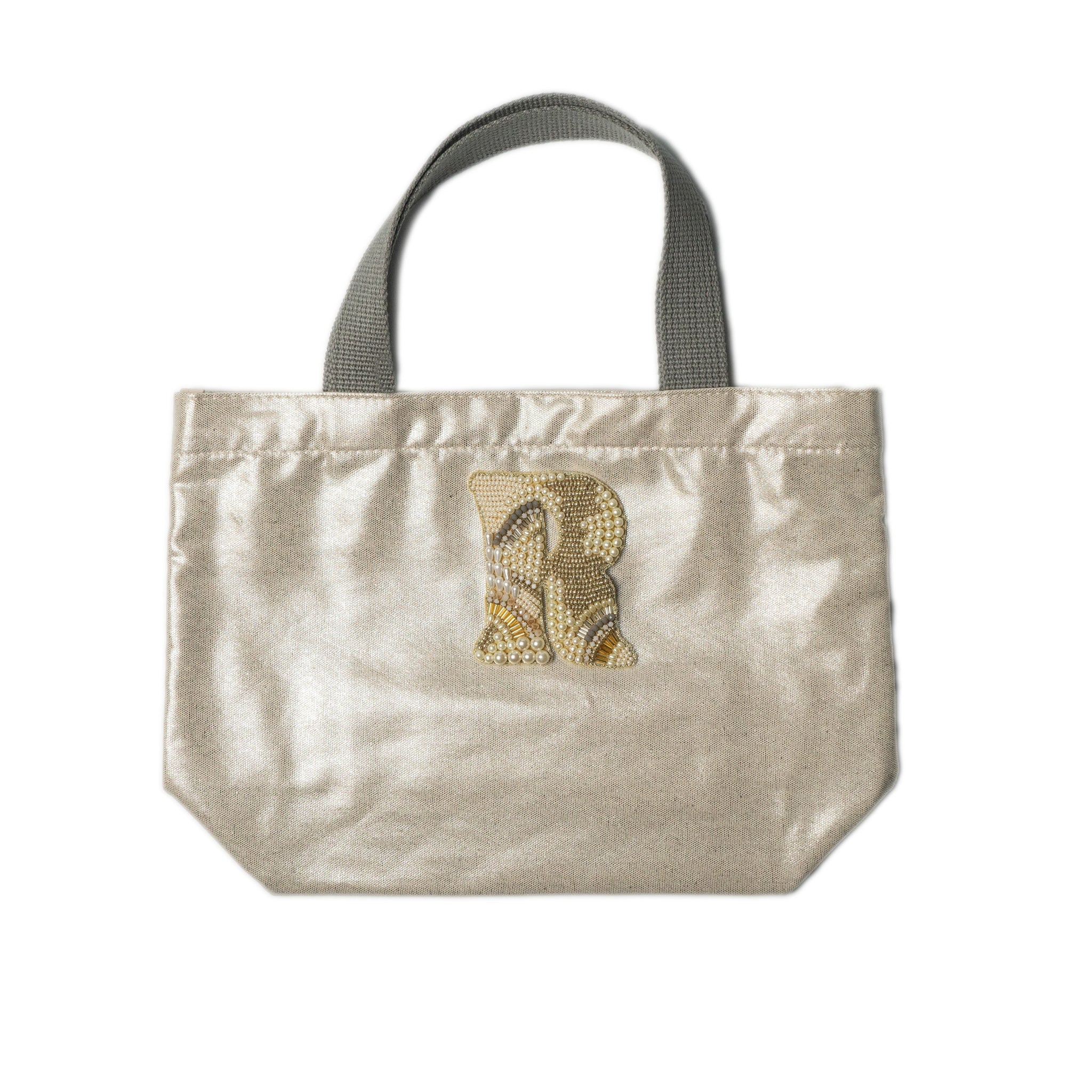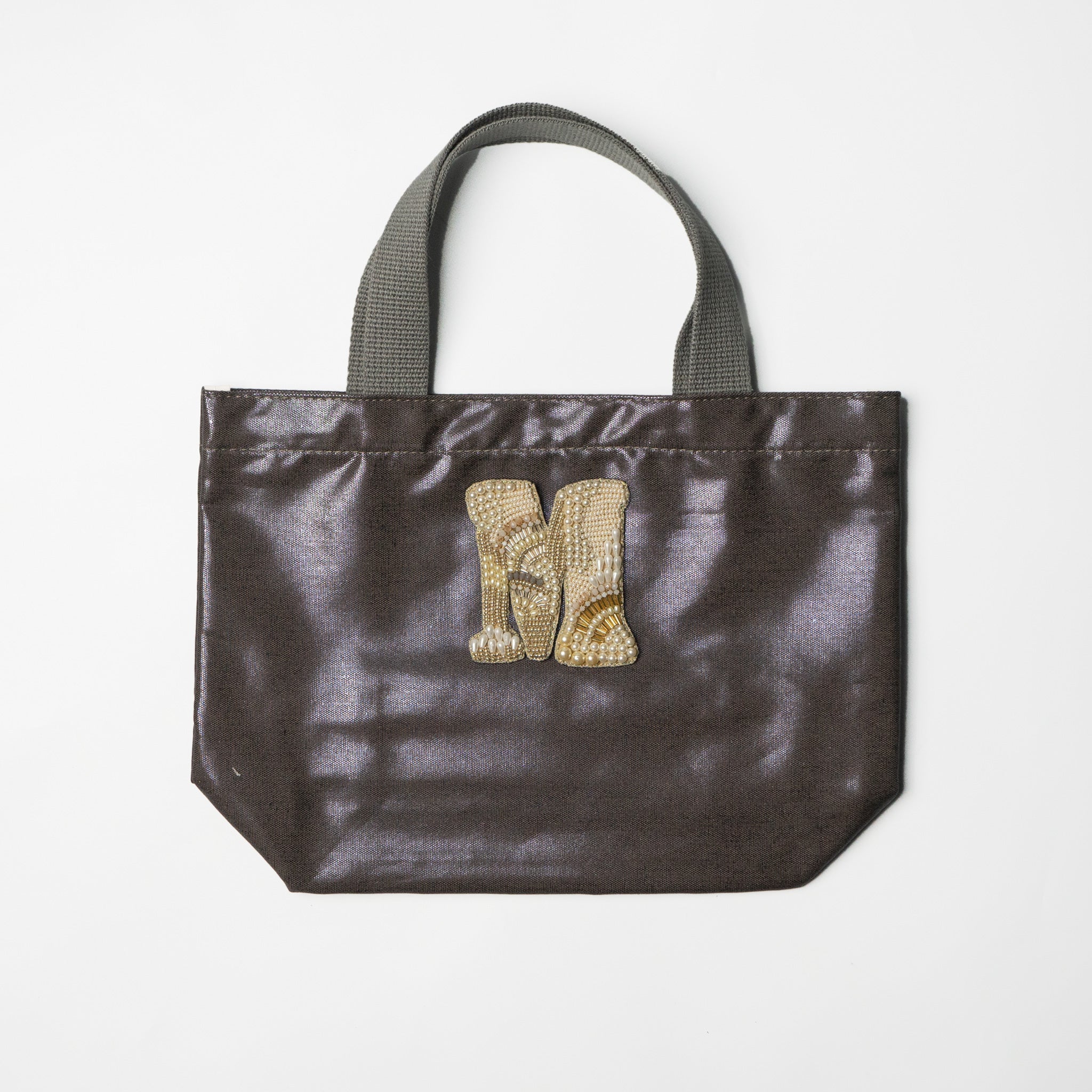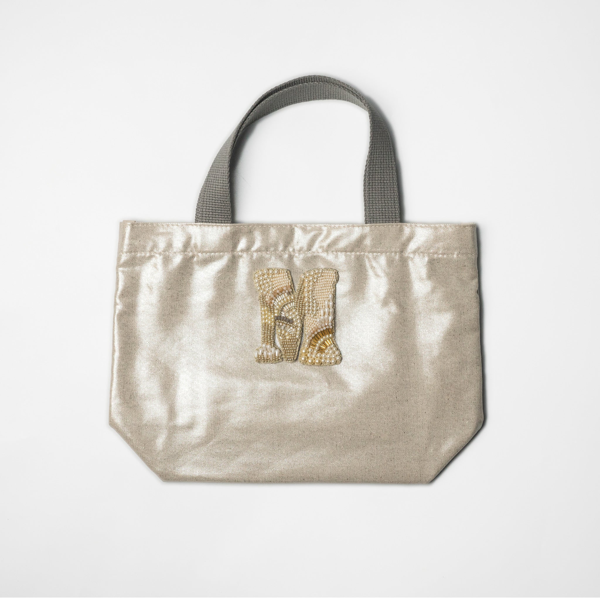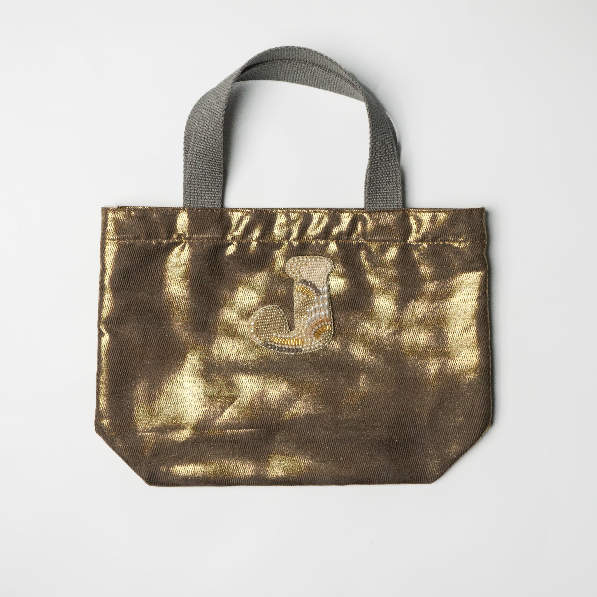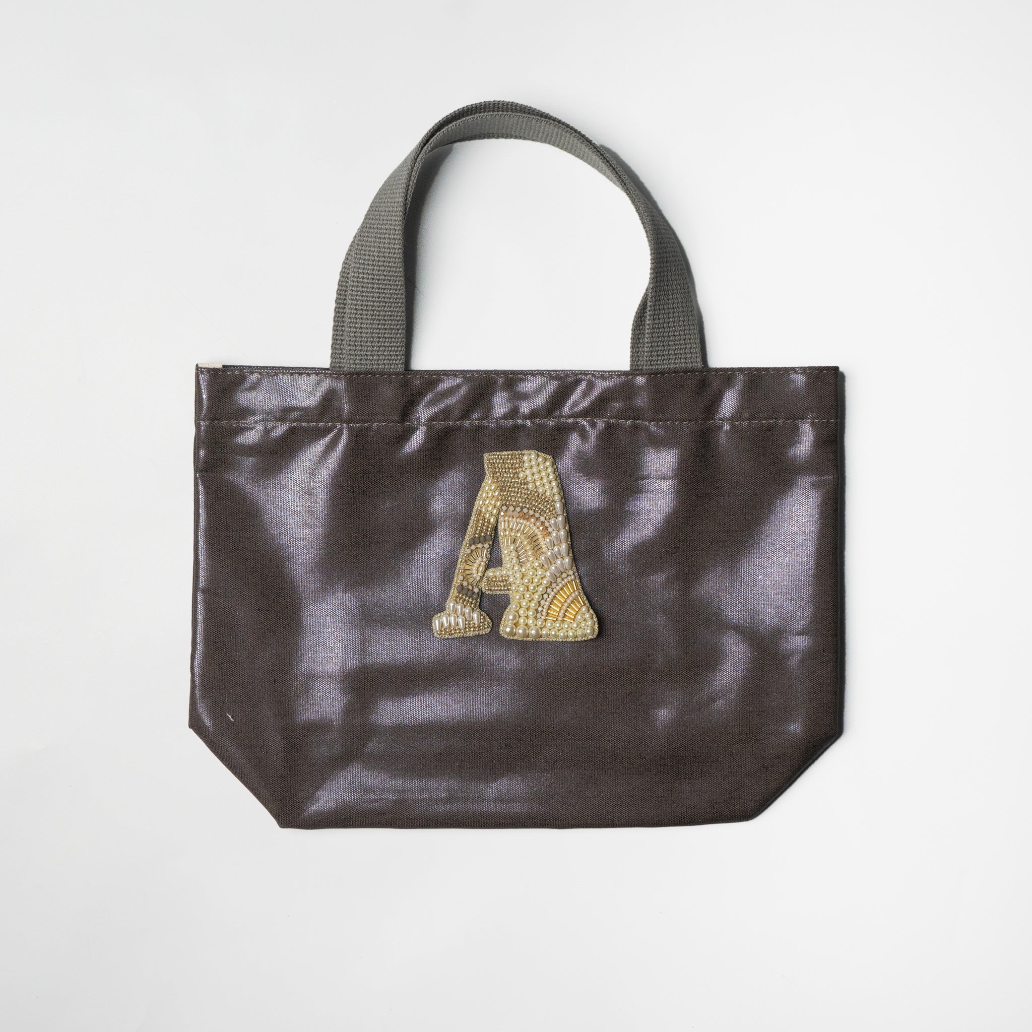 コットンの生地にオリジナルの箔プリントを施したバッグにインドで昔から代々伝わる繊細なハンドワークによって作られたユニークなモチーフが付いたミニトートバッグ。