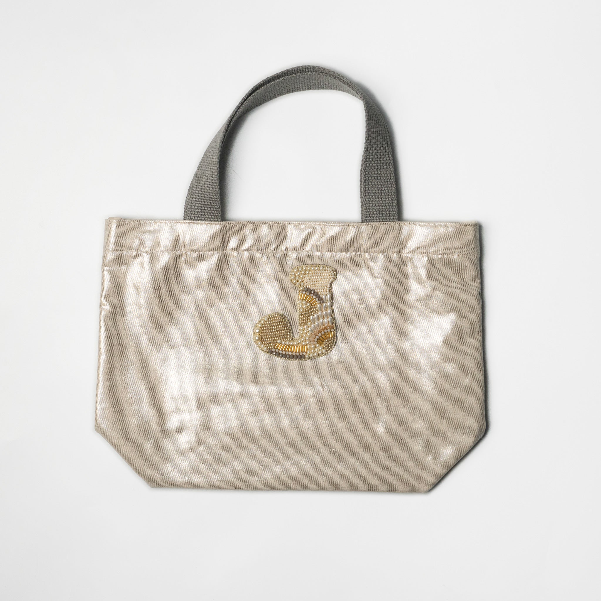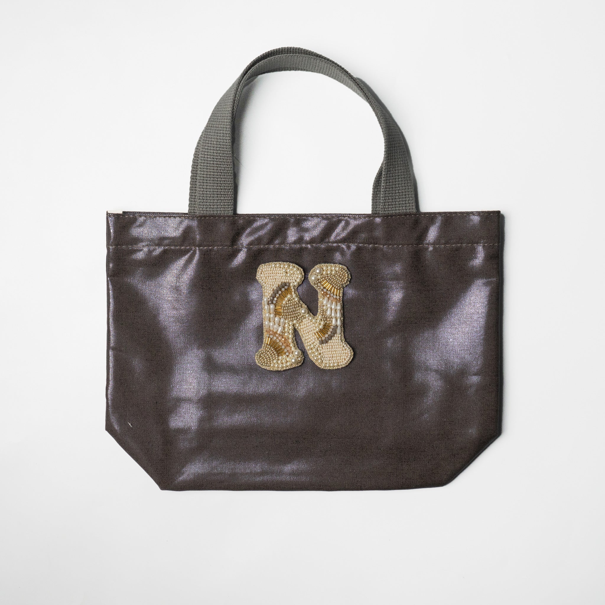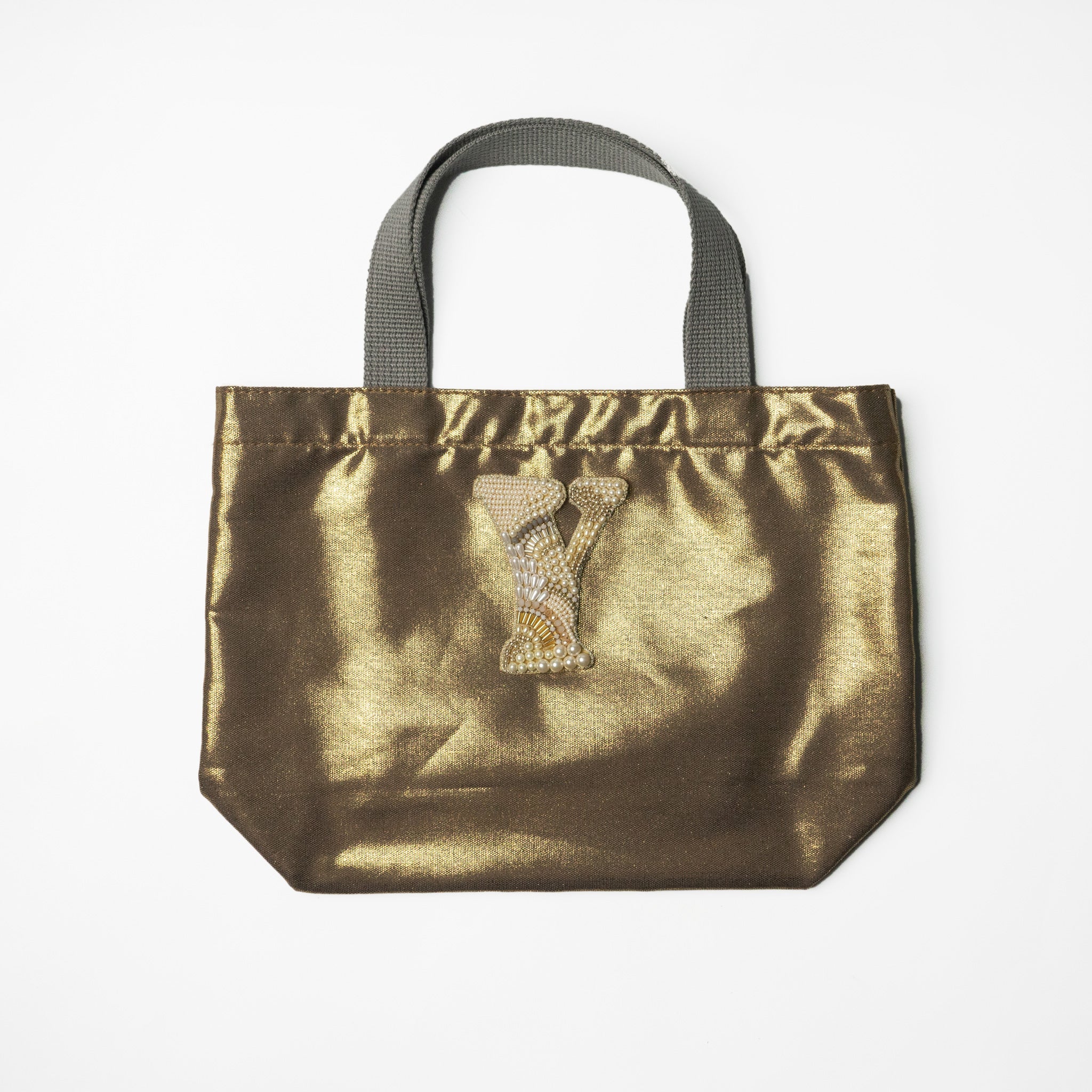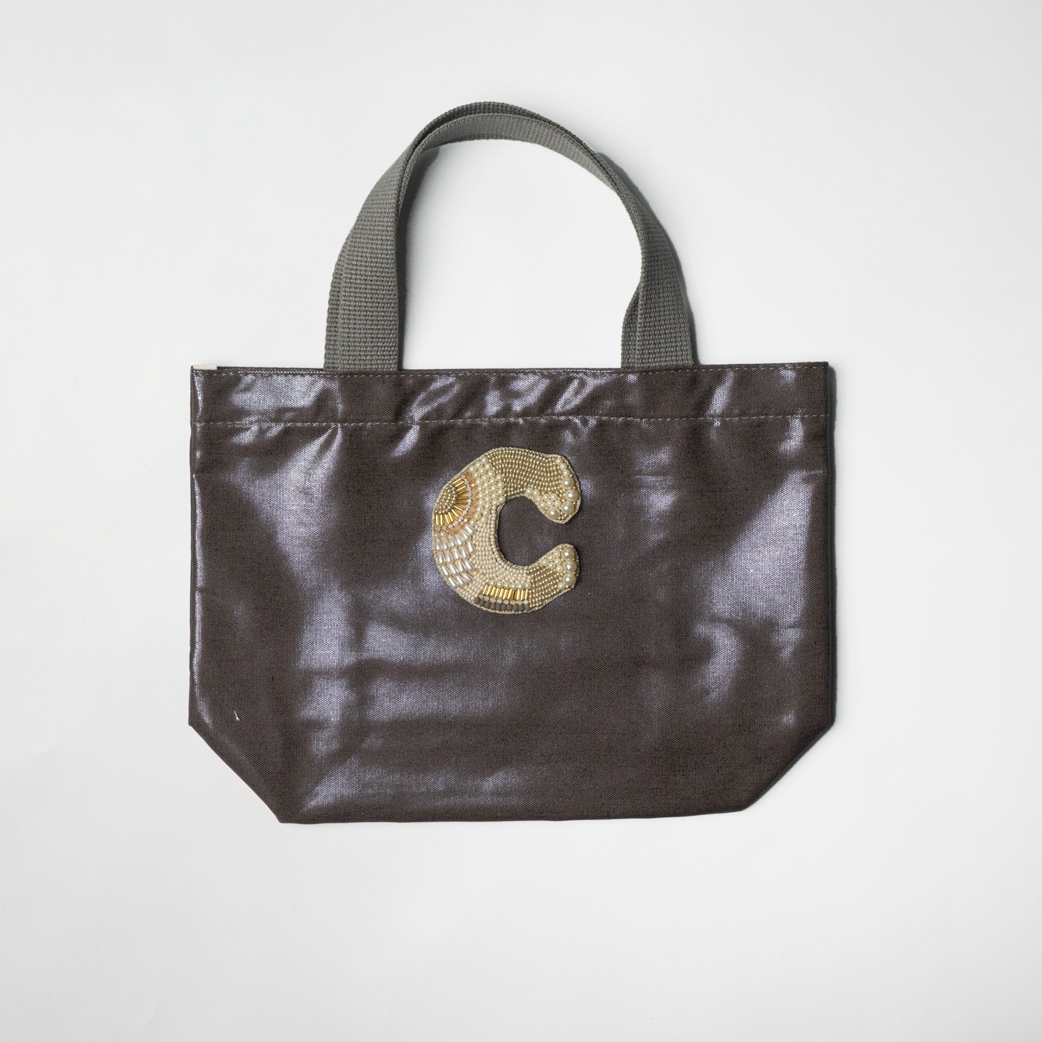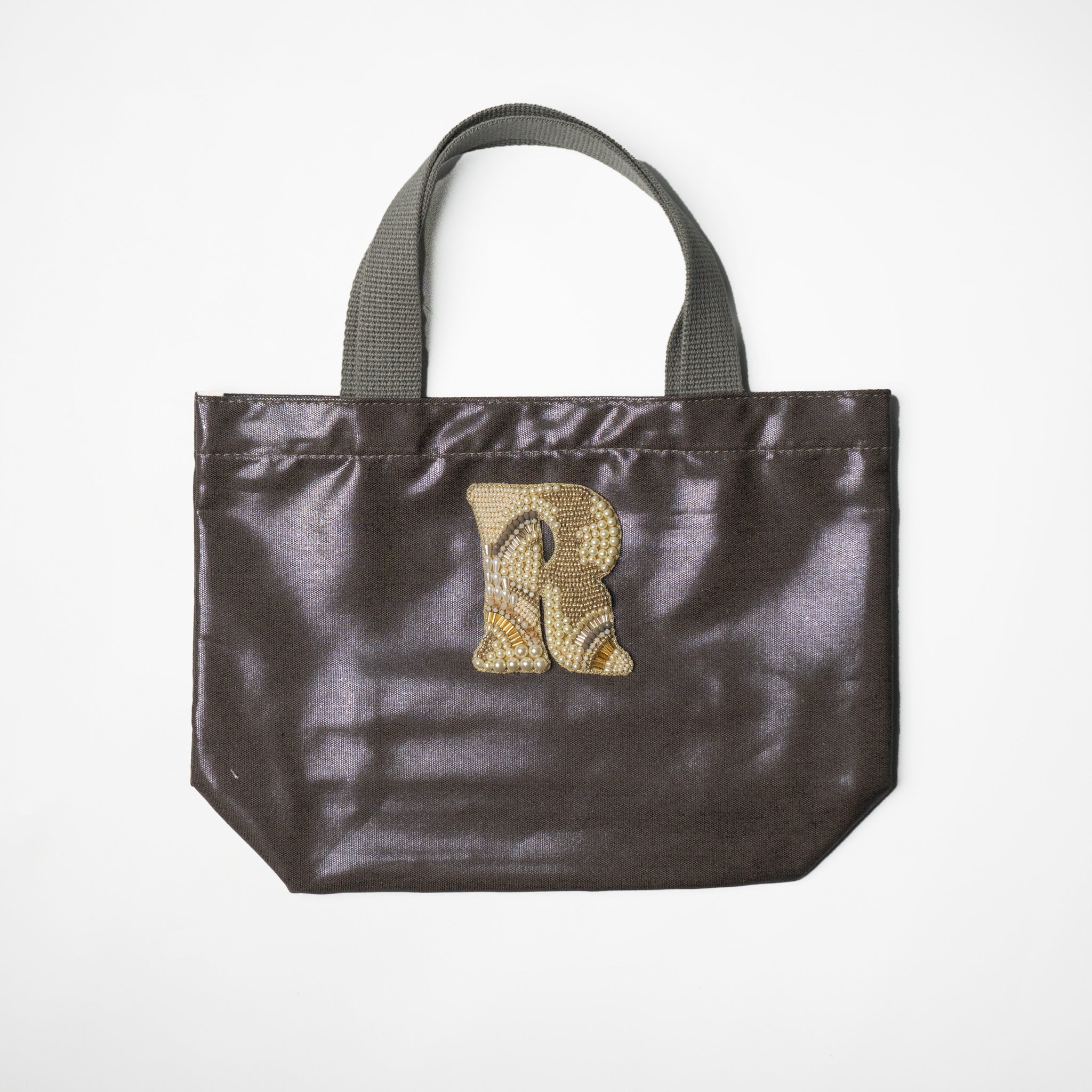 コットンの生地にオリジナルの箔プリントを施したバッグにインドで昔から代々伝わる繊細なハンドワークによって作られたユニークなモチーフが付いたミニトートバッグ。