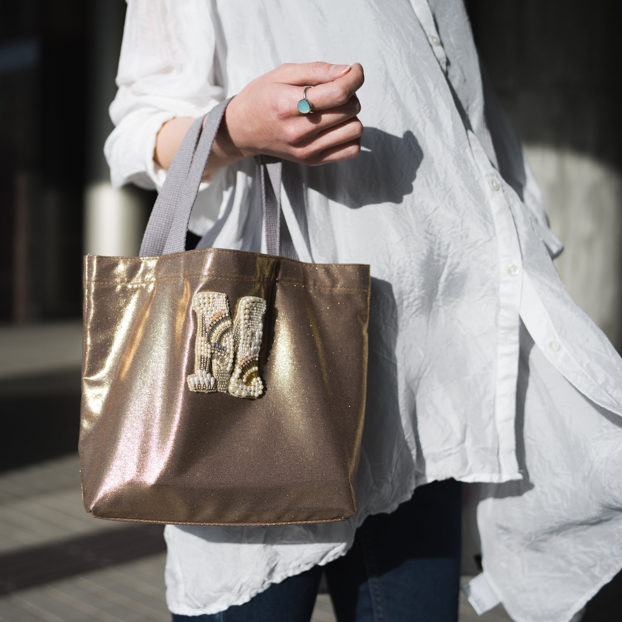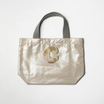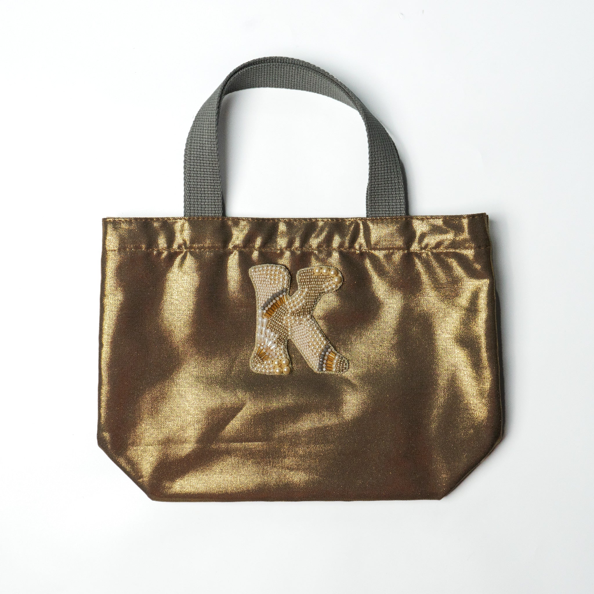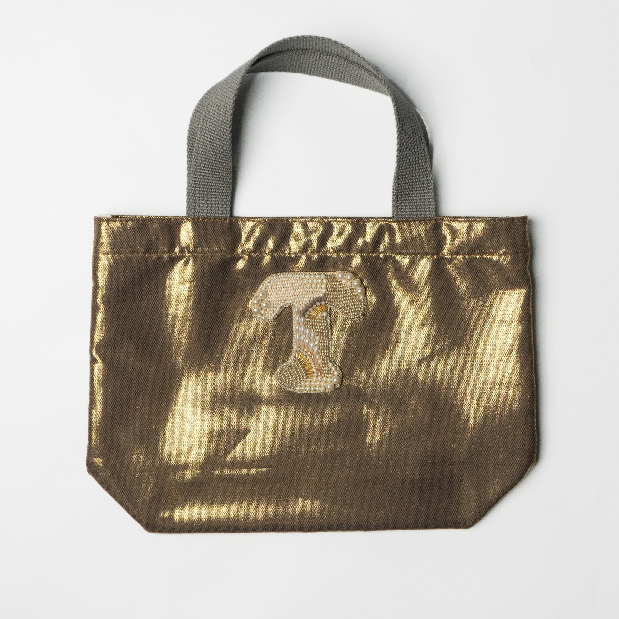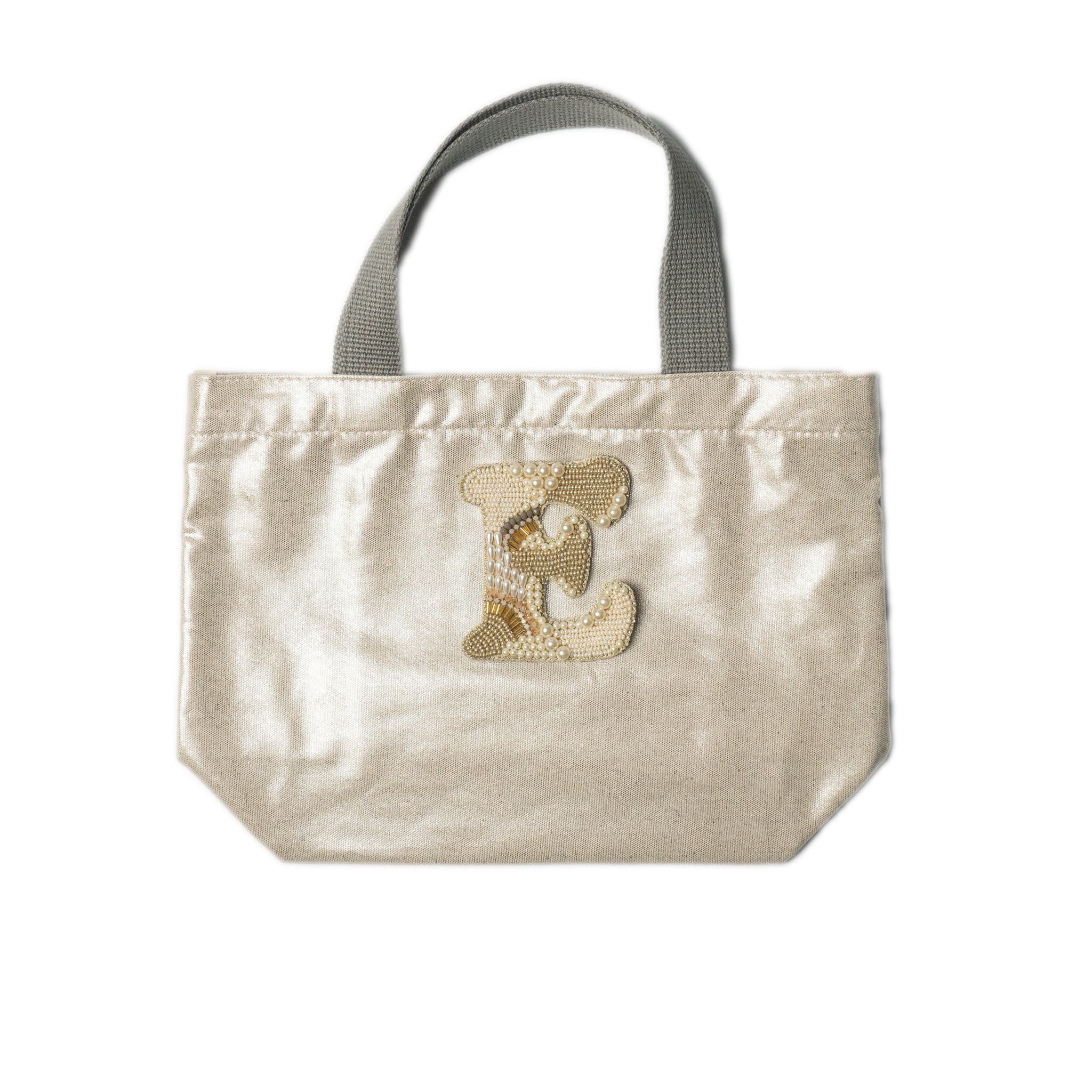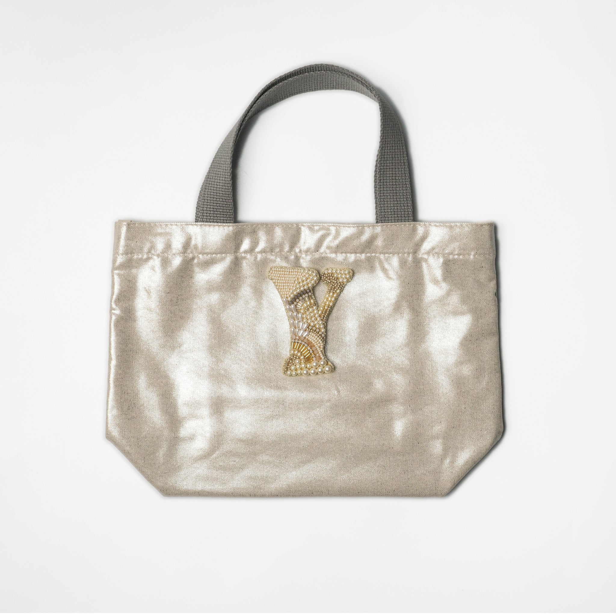 コットンの生地にオリジナルの箔プリントを施したバッグにインドで昔から代々伝わる繊細なハンドワークによって作られたユニークなモチーフが付いたミニトートバッグ。