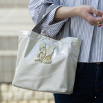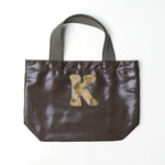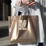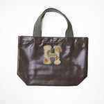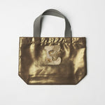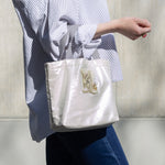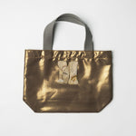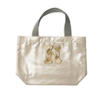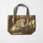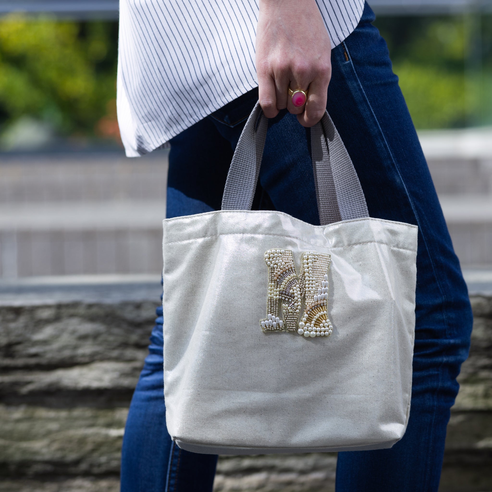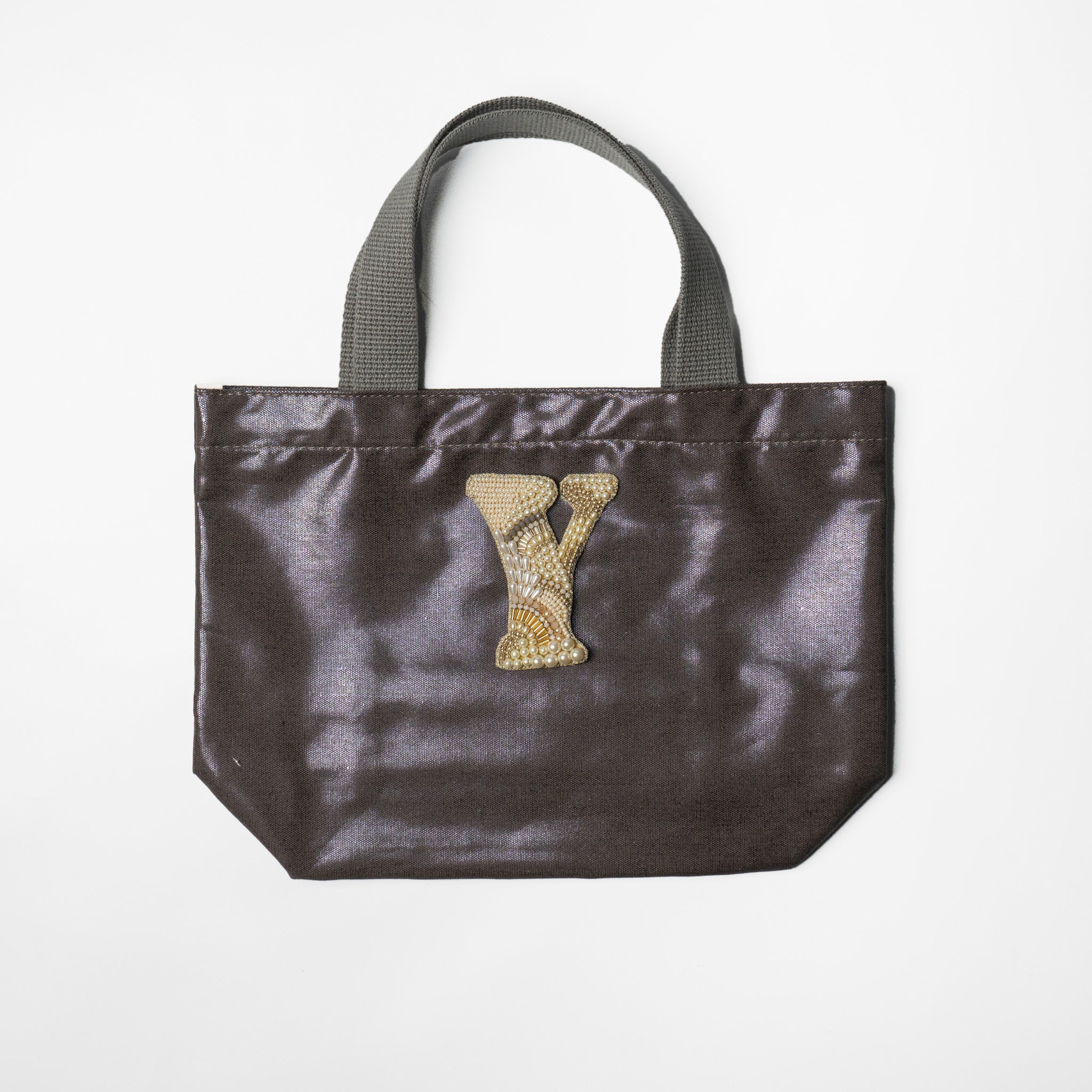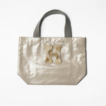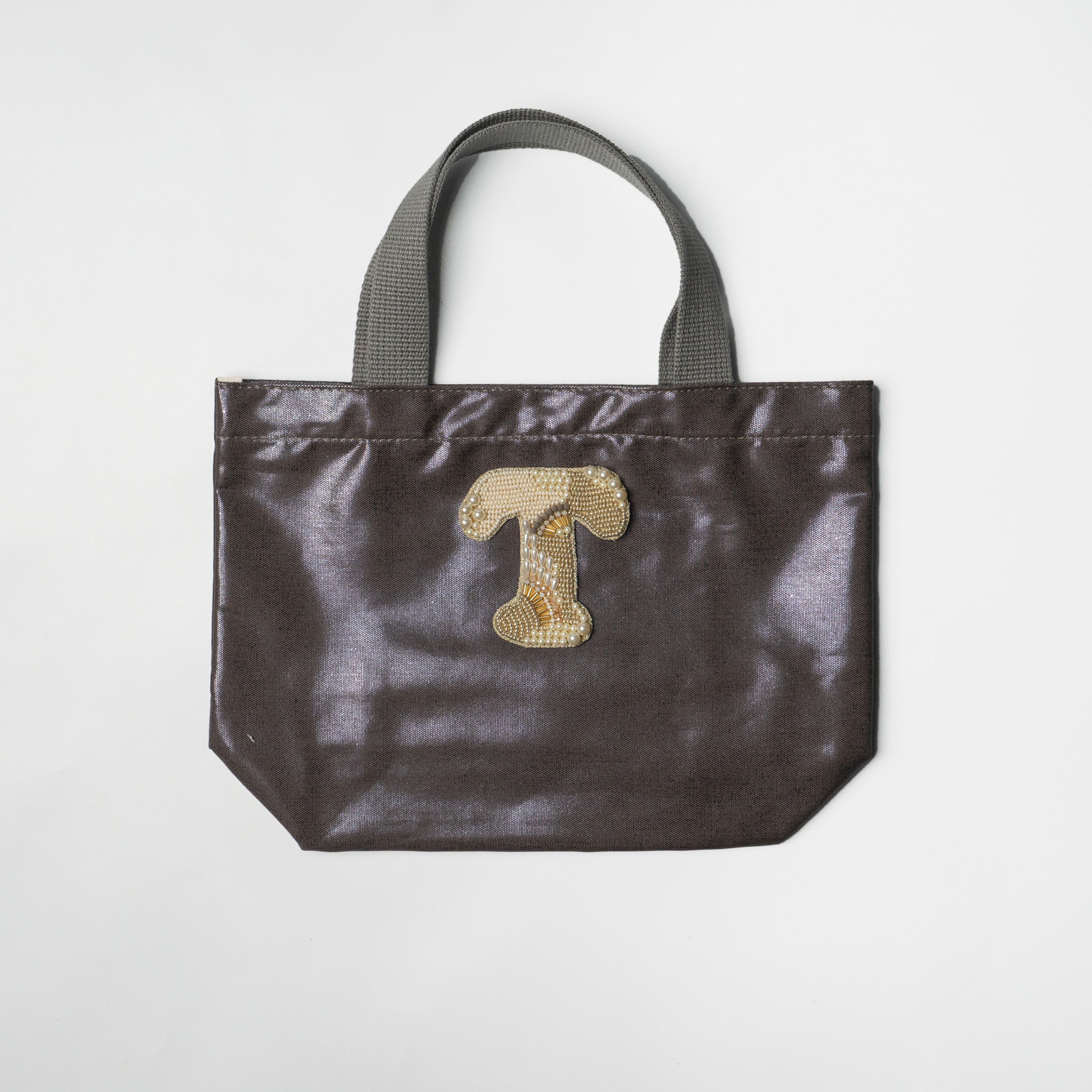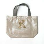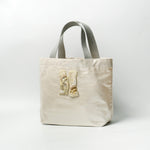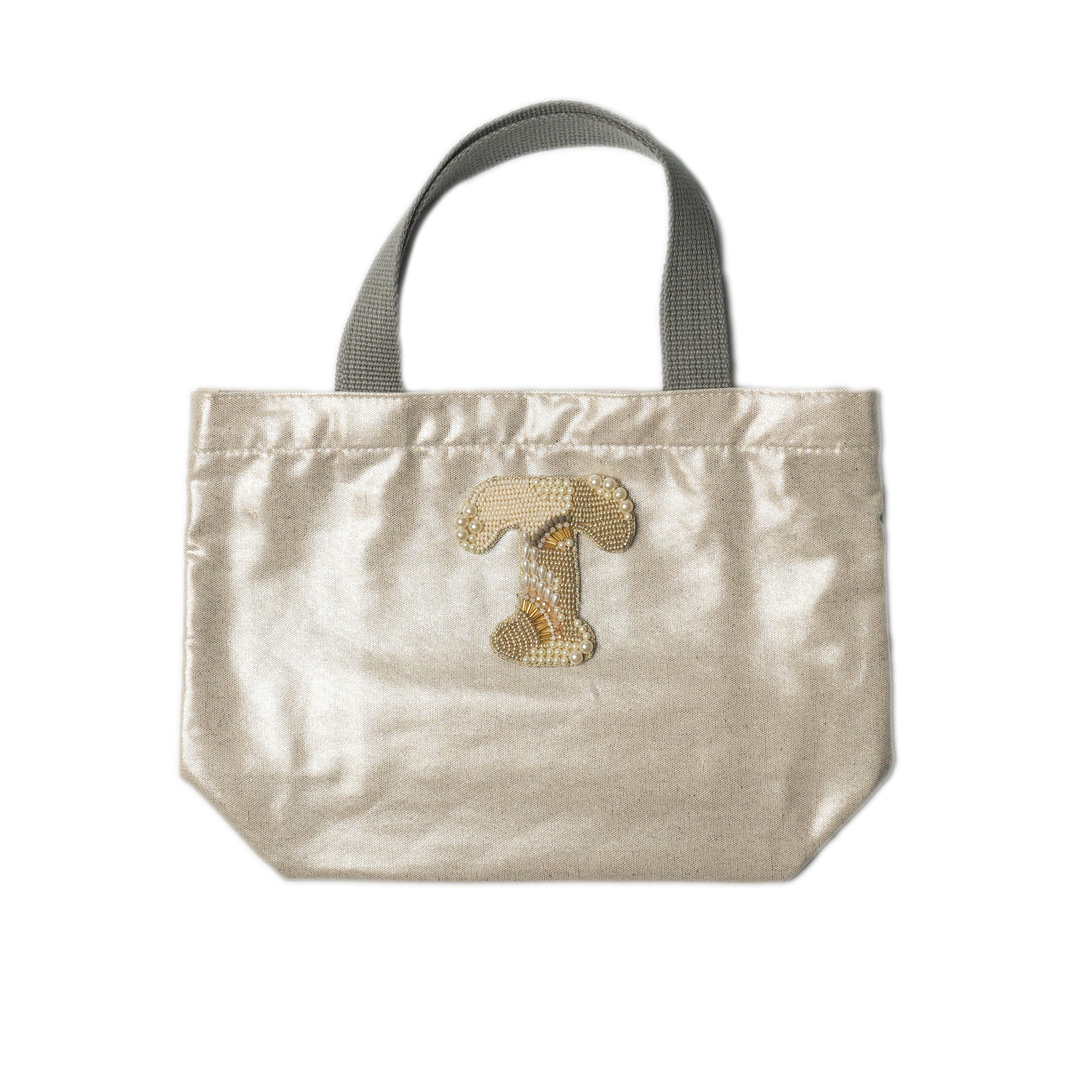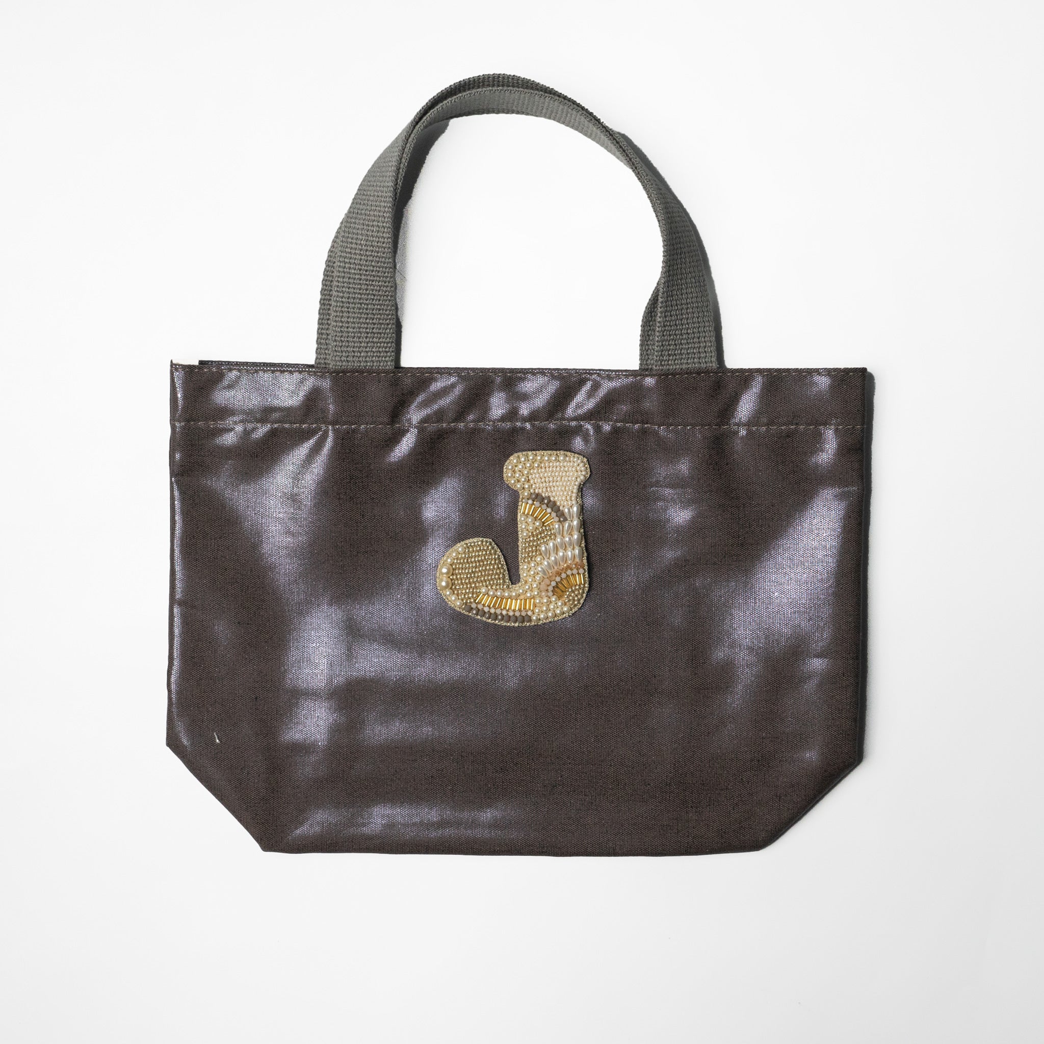 コットンの生地にオリジナルの箔プリントを施したバッグにインドで昔から代々伝わる繊細なハンドワークによって作られたユニークなモチーフが付いたミニトートバッグ。