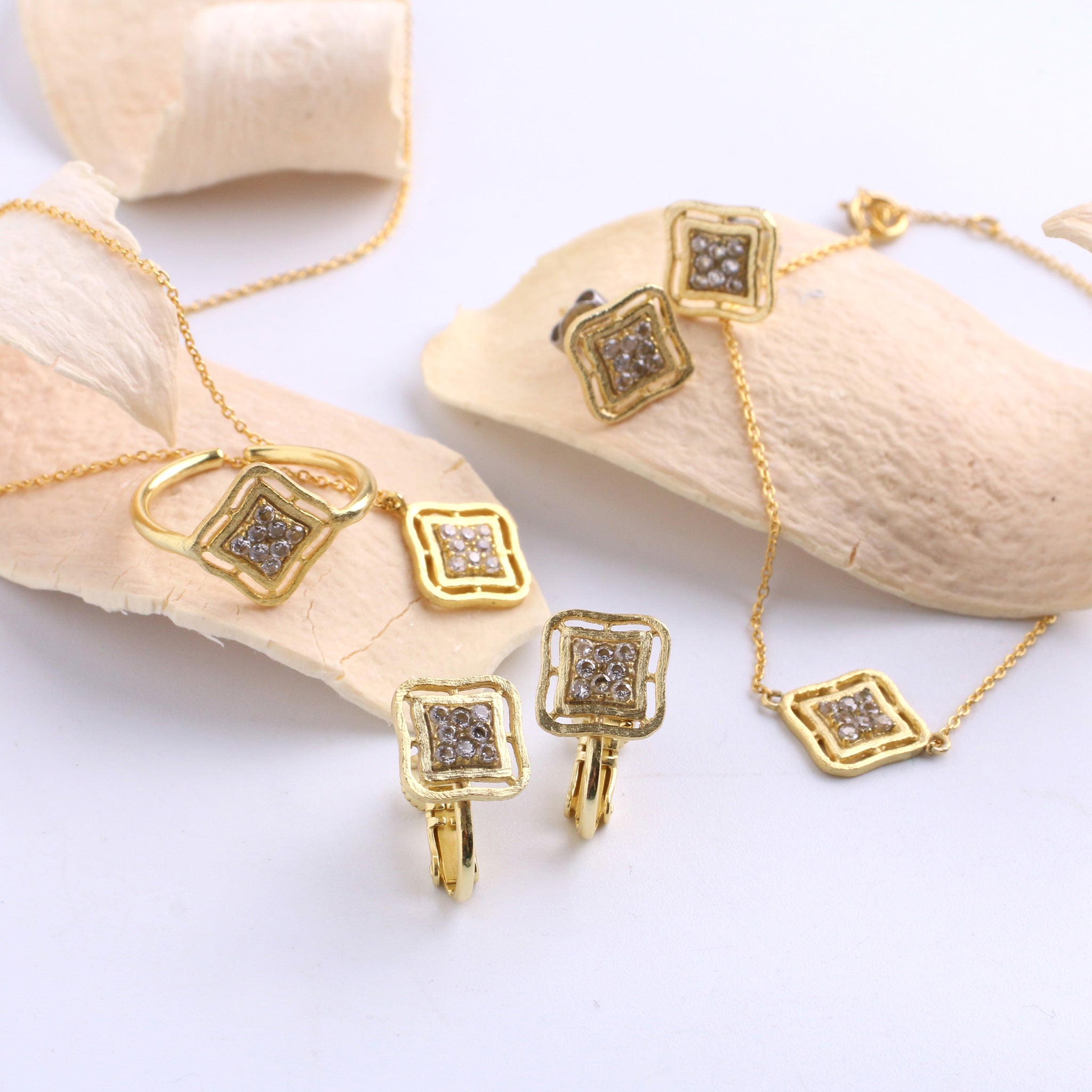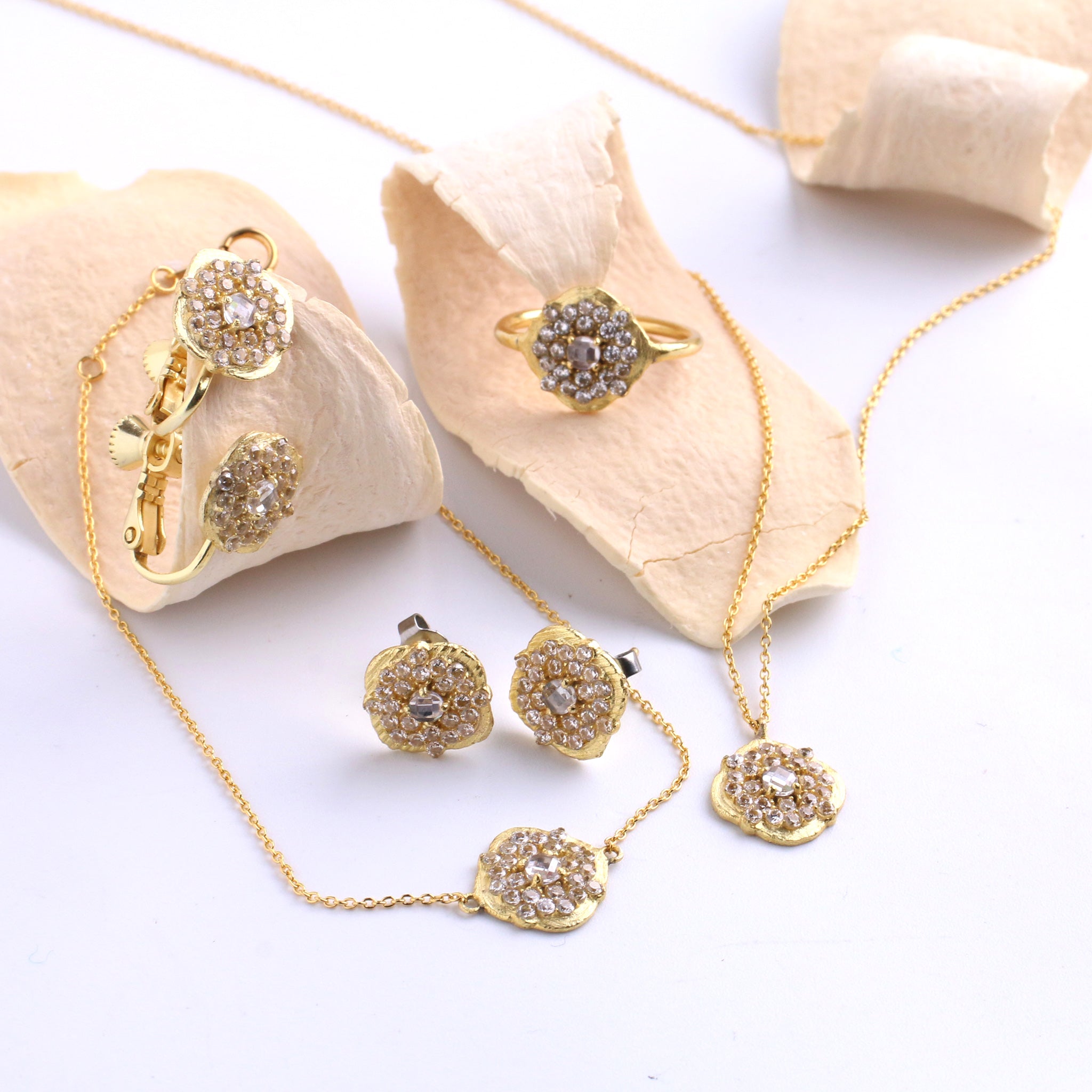クラフトマンシップが光る、日常の中の贅沢。職人が1点ずつ丁寧に石座をハンマーで製作しています。中央のクリスタルクオーツはうるうると輝き、あなたの毎日に小さなご褒美を送ります。※クリスタルクオーツはラウンド・スクエア・フラワーのみ