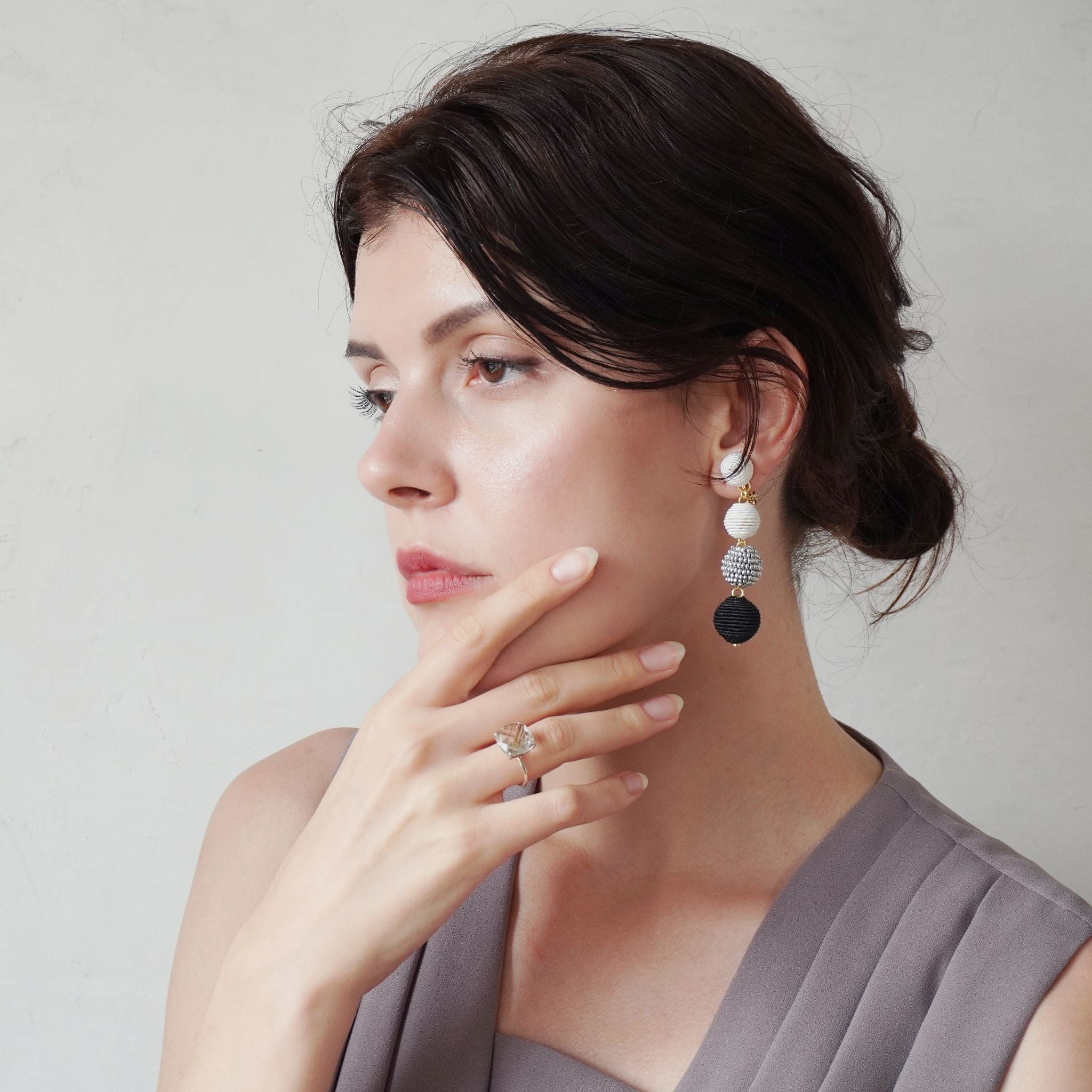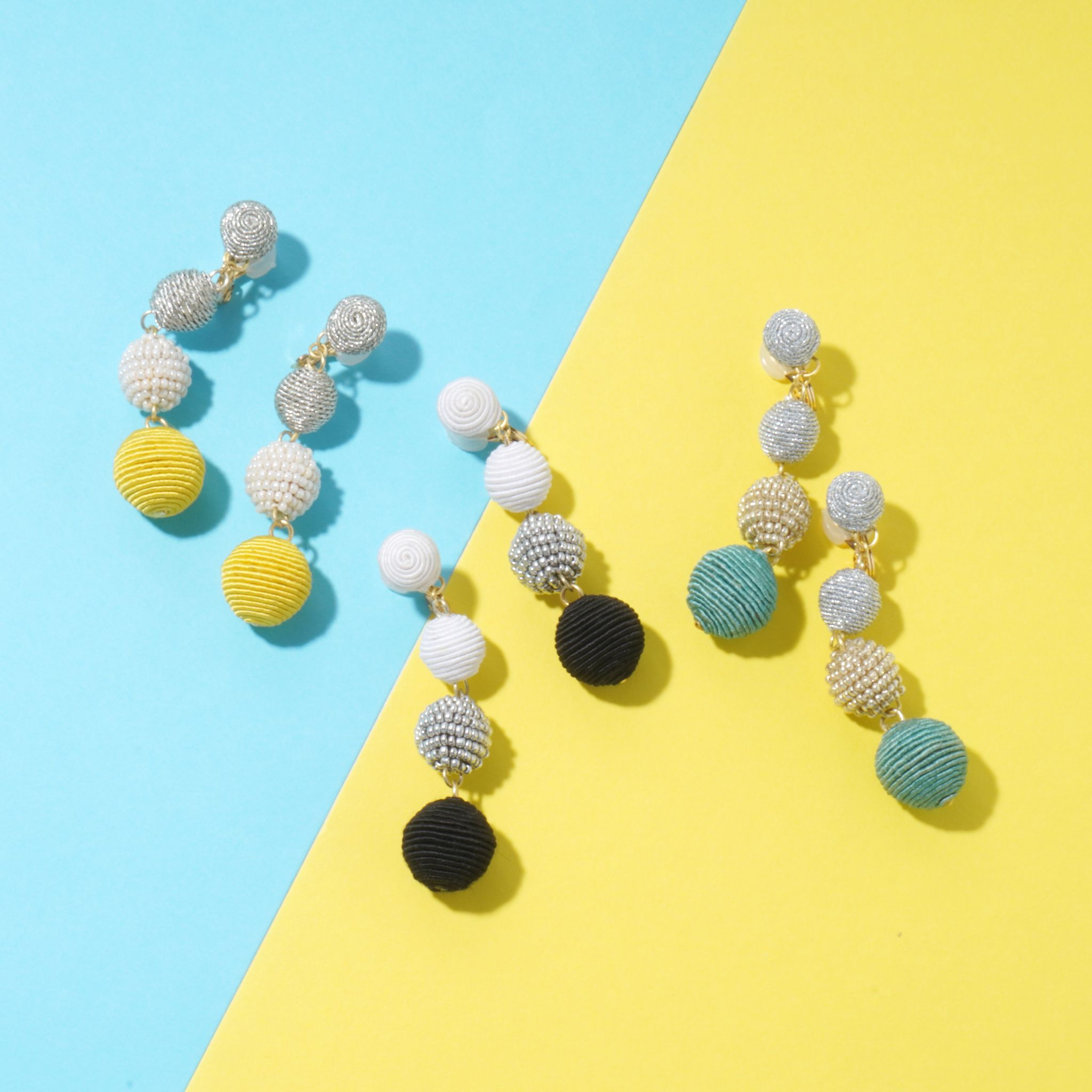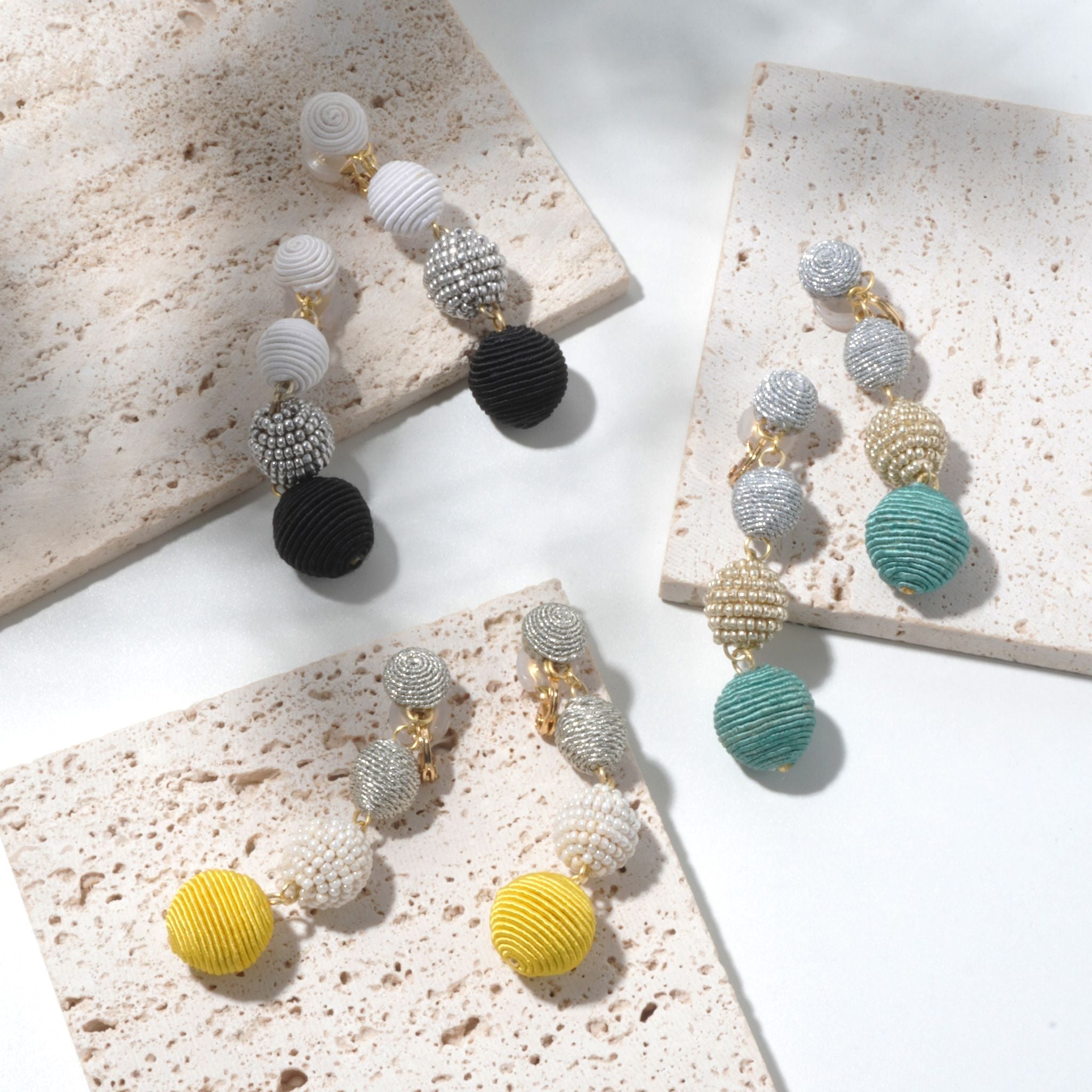 大きめのボンボンモチーフがゆらゆらと揺れ存在感があります。合わせやすい大人っぽいカラーリングなので、デイリーに使いまわせます。パーティーシーンにもおすすめ。