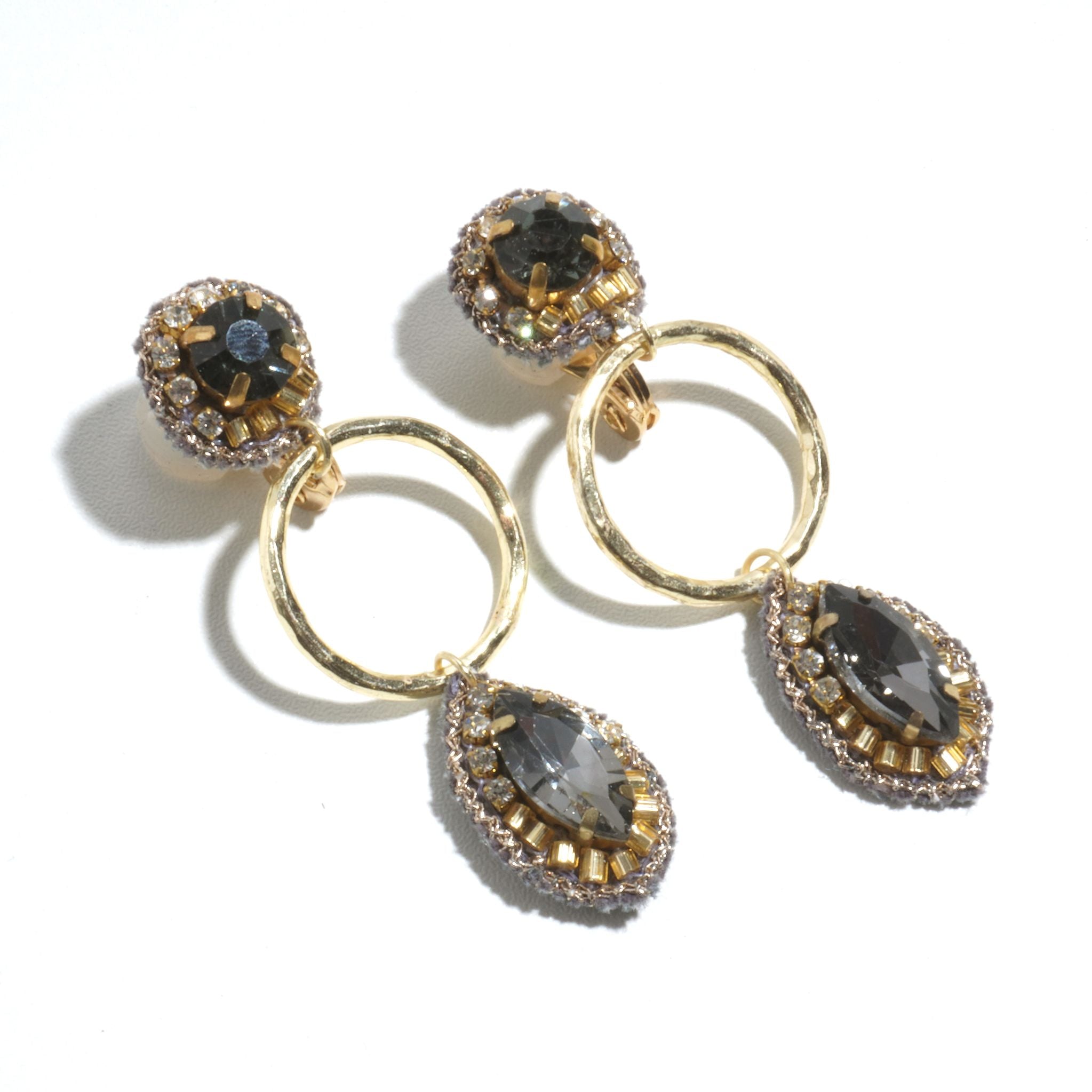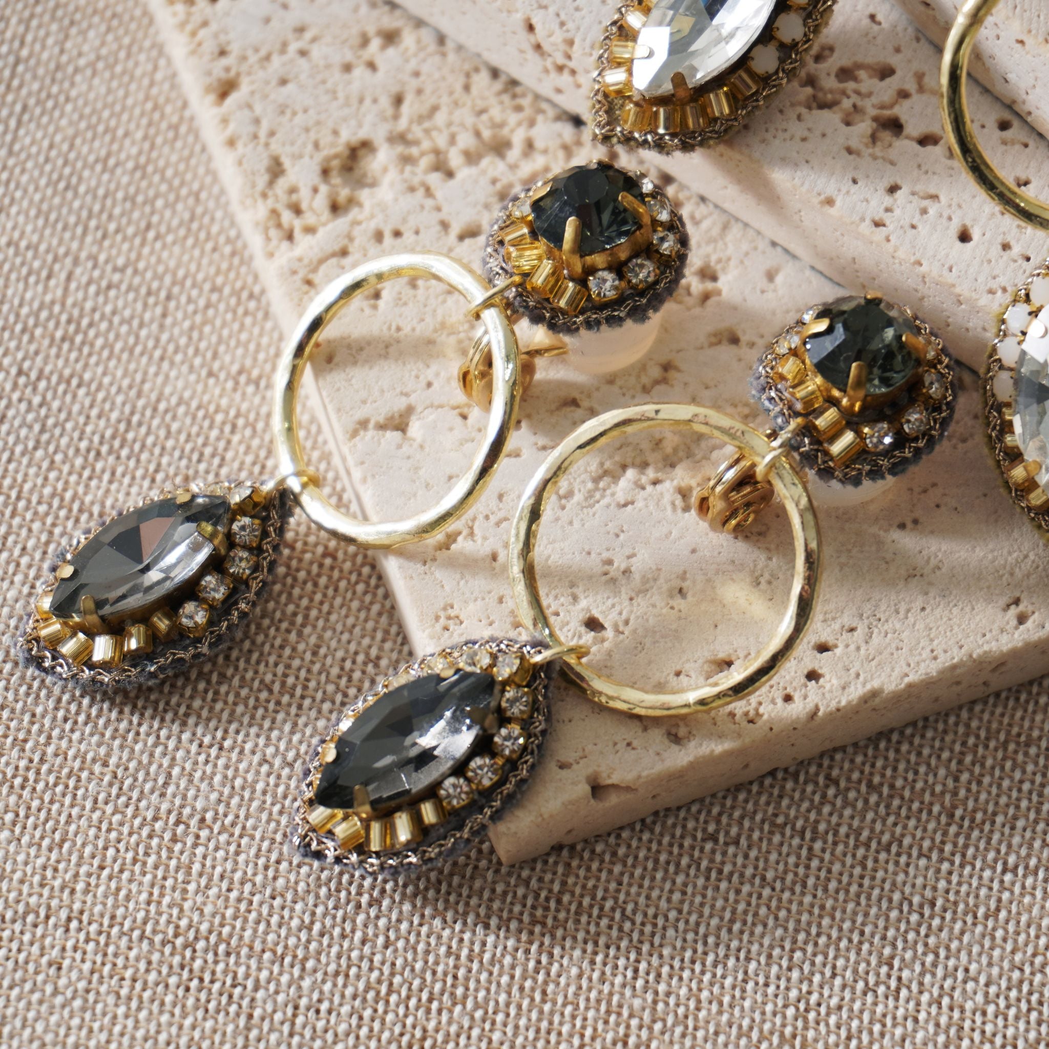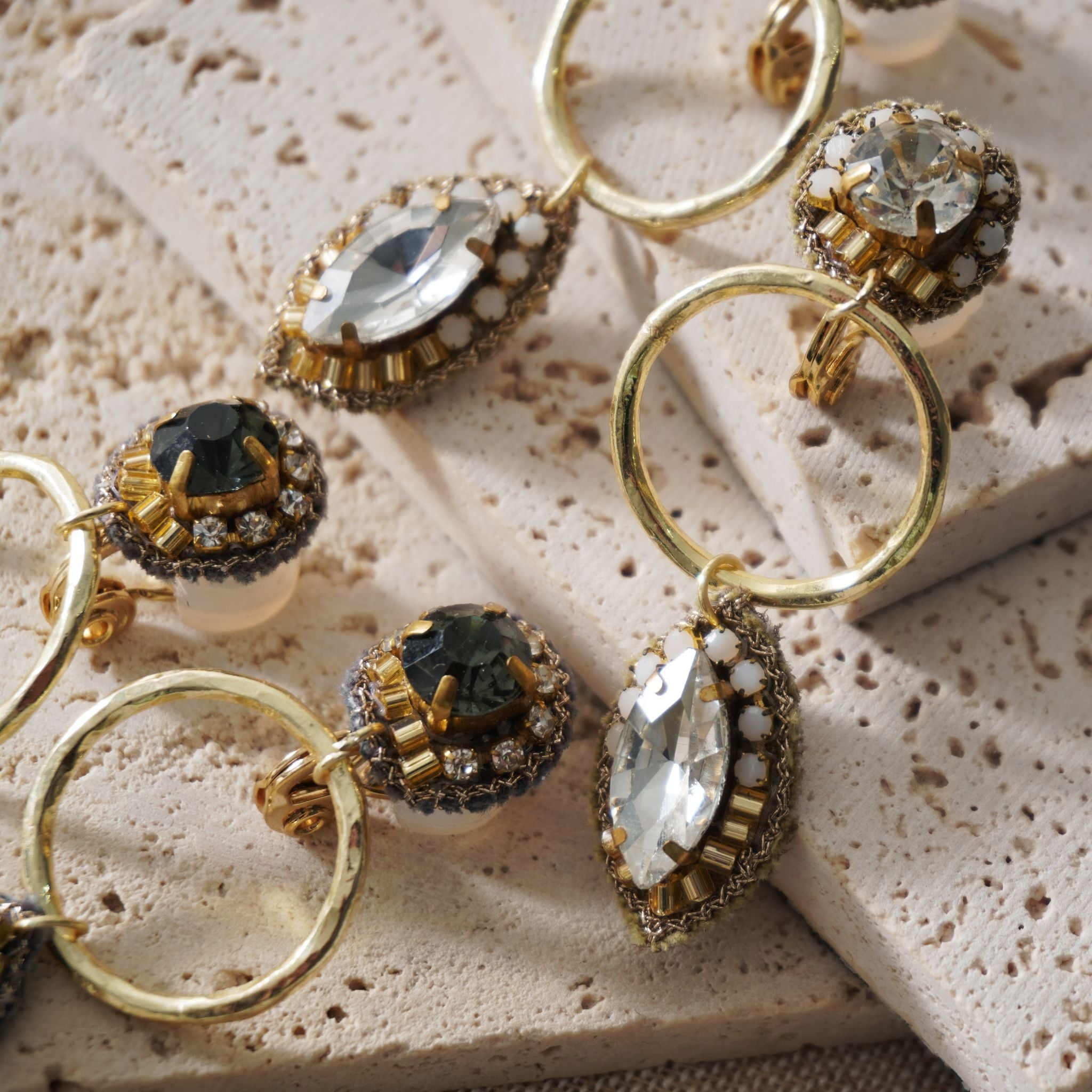 トレンドを取り入れて!大人カジュアルコーデの主役になるピアス/イヤリング。手刺繍のパーツの間にフープをデザインしほどよく辛さを表現したアクセサリー。カジュアルなコーディネートに合わせやすいクリアと、クールな印象のブラックダイヤモンドカラーをご用意。カジュアルシーンだけでなく、揺れるデザインはパーティーシーンにもおすすめです。