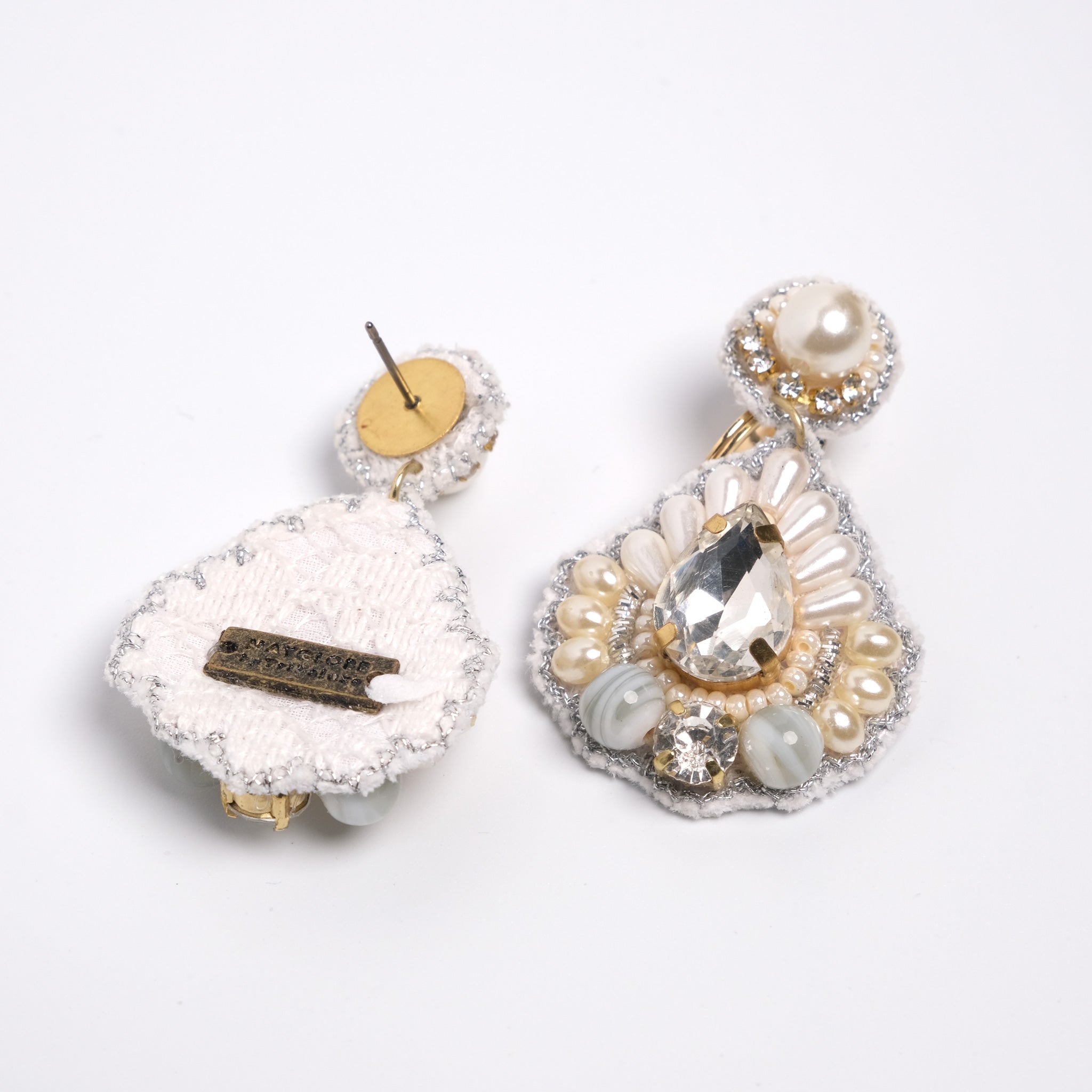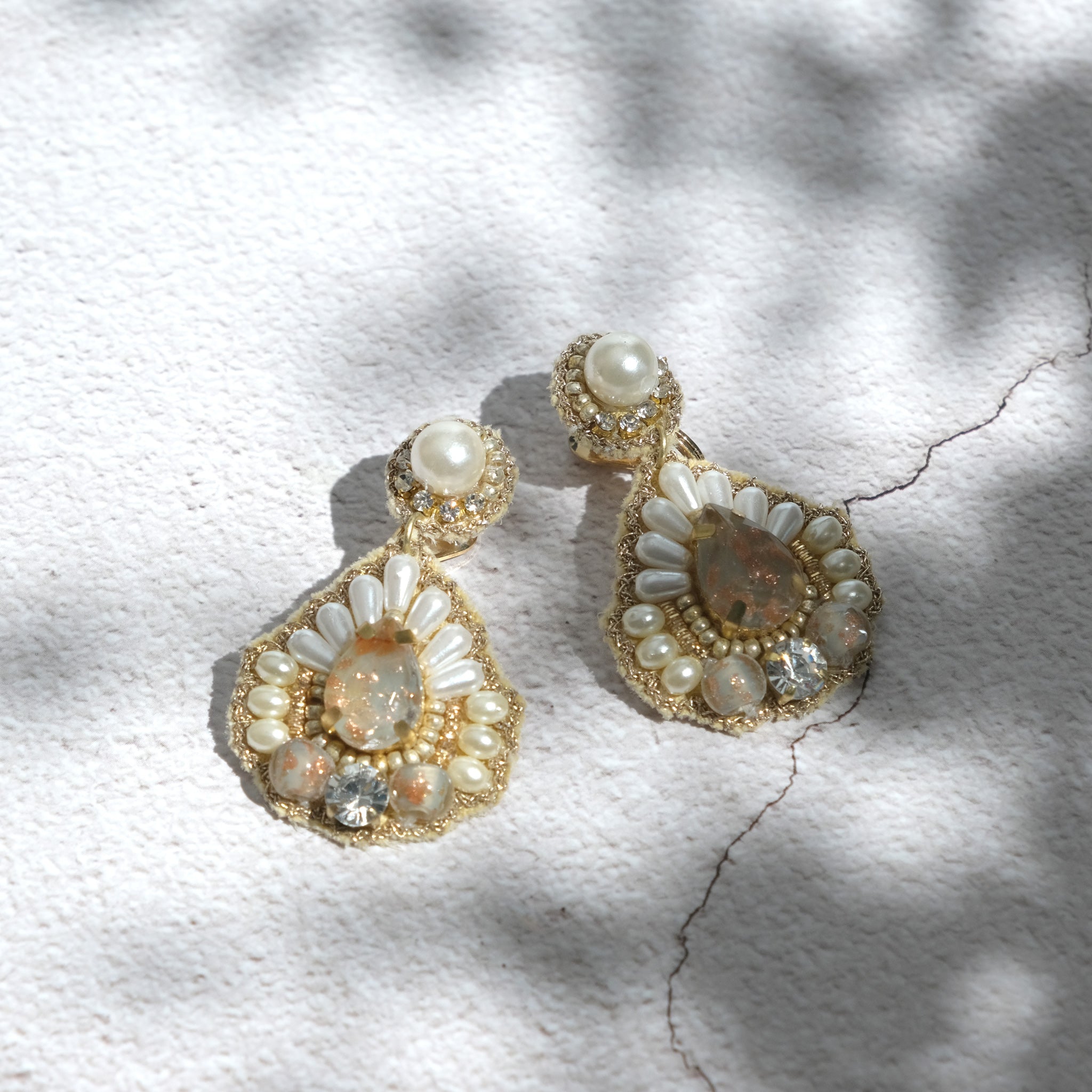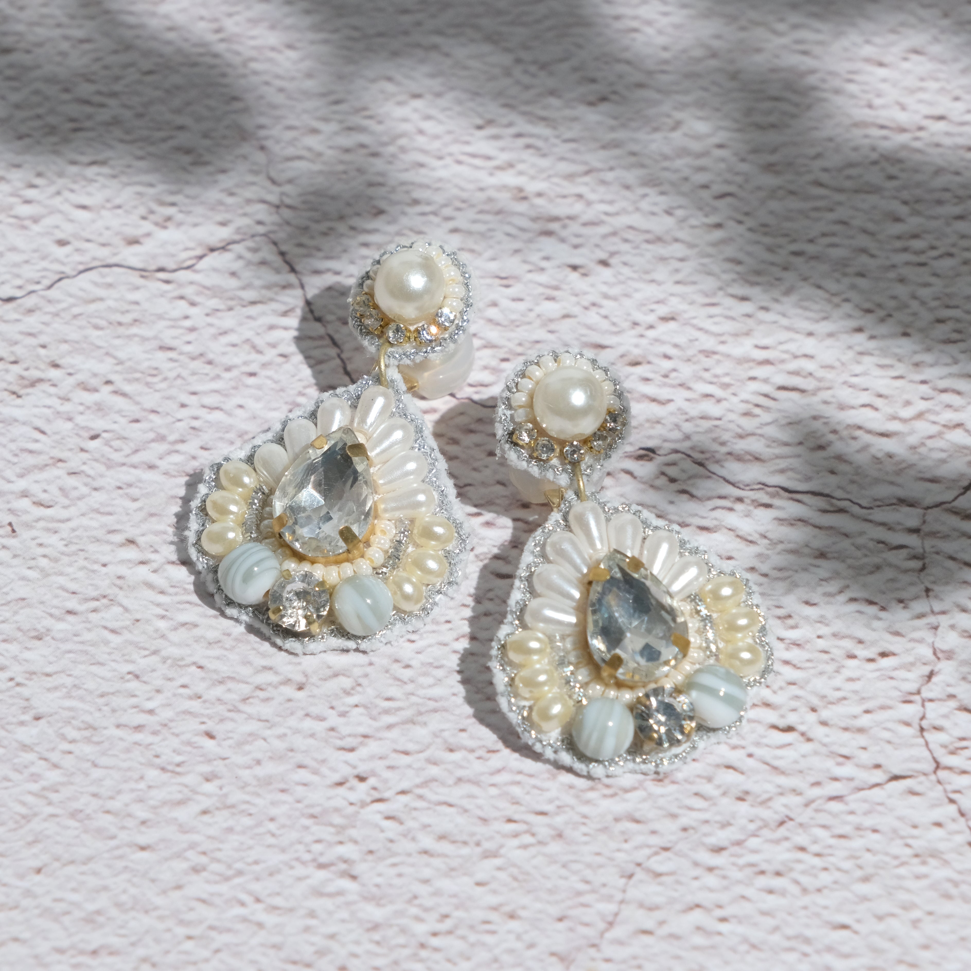 繊細なビーズワークと輝くビジューが織りなす、クラシカルなピアス/イヤリング。