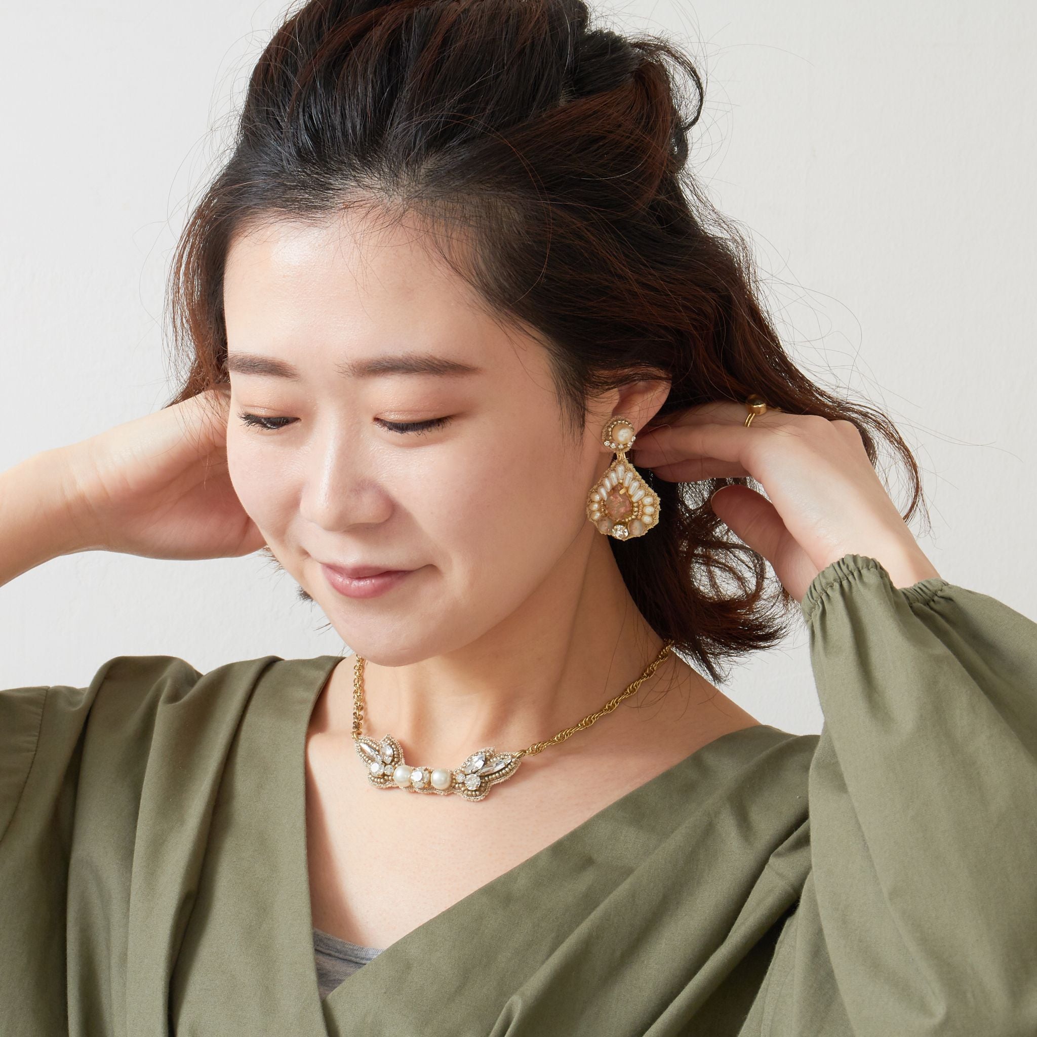 物語のワンシーンを閉じ込めたような、クラシカルな輝きはアンティークジュエリーを思わせる、繊細なビーズワークが魅力のアクセサリー。大小のパールと中央の輝くビジューが、美しいレースのように編み込まれ、エレガントな印象に。