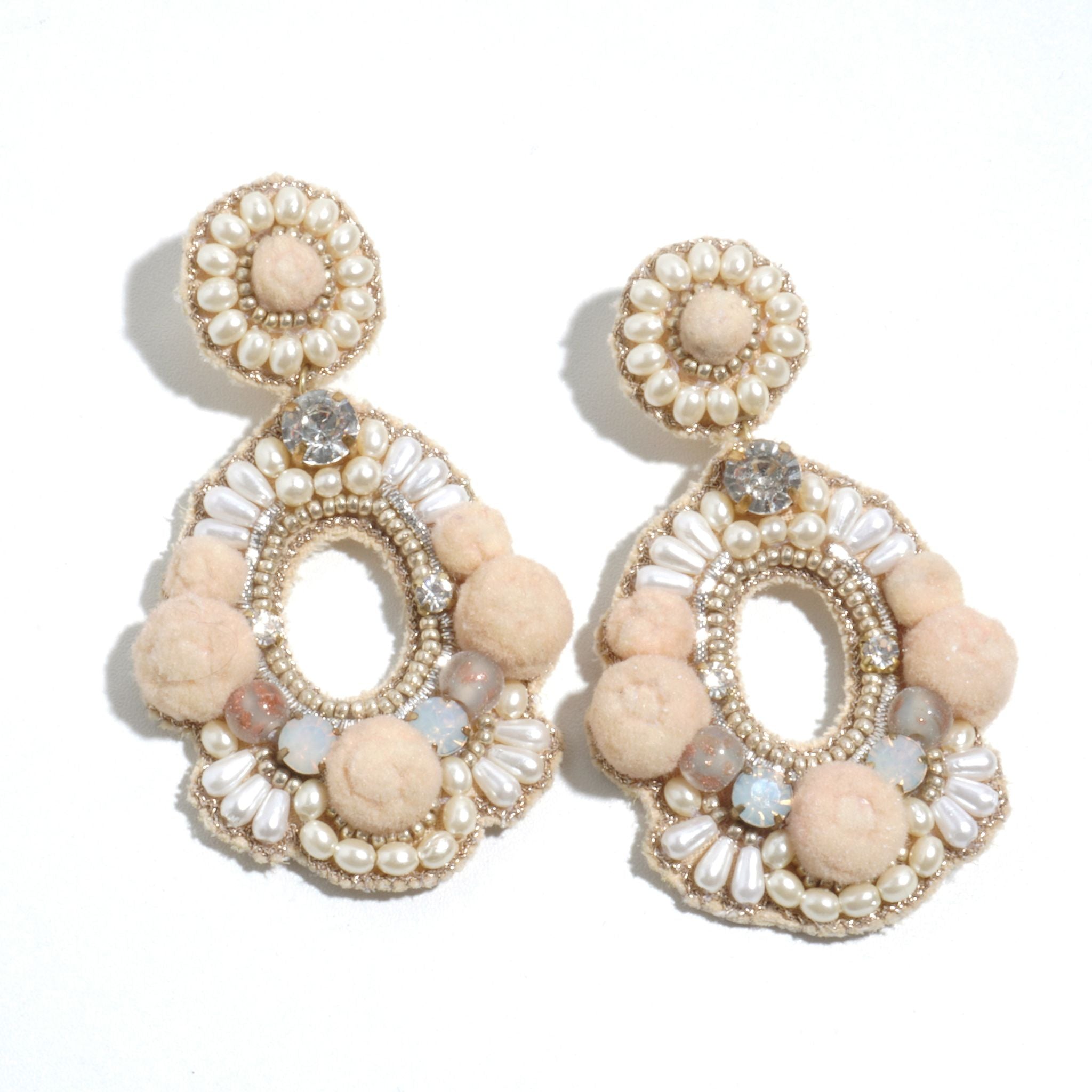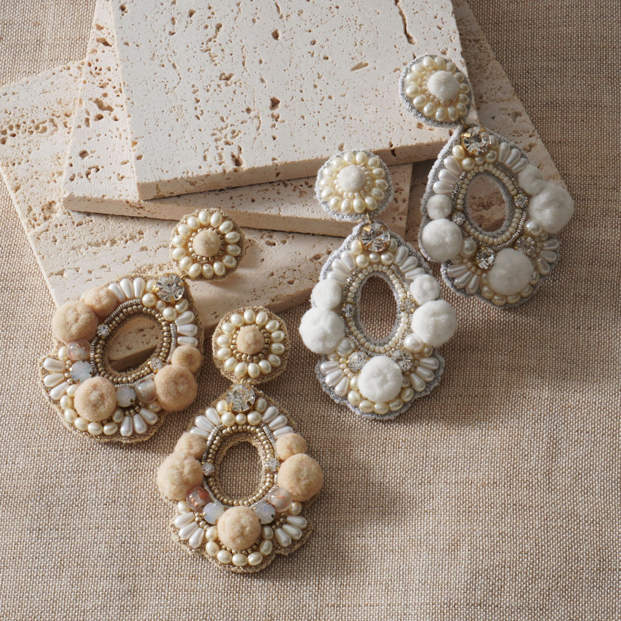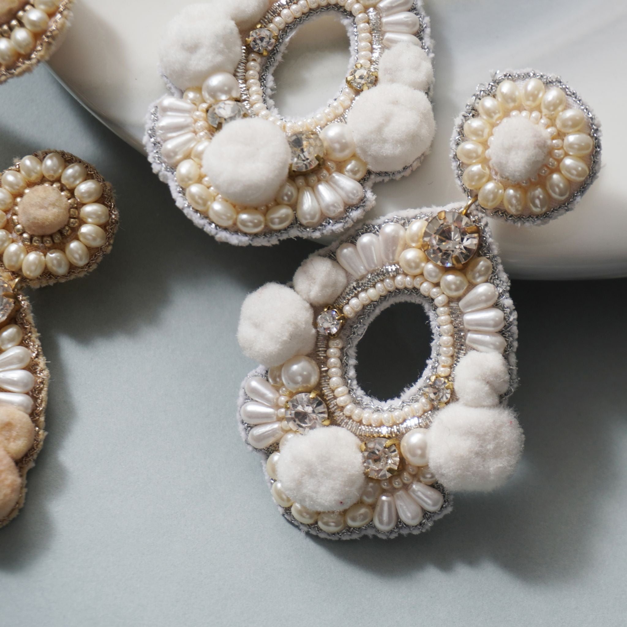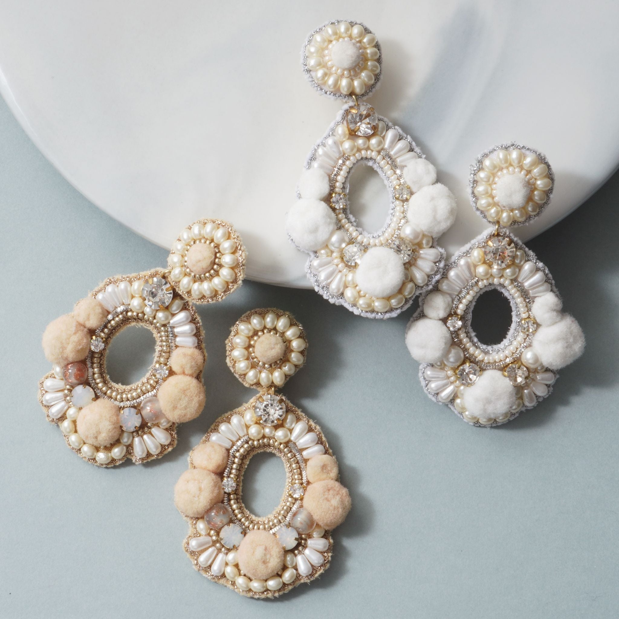 ビジューやパール、ポンポンなどをあしらった個性的で華やかなデザイン。