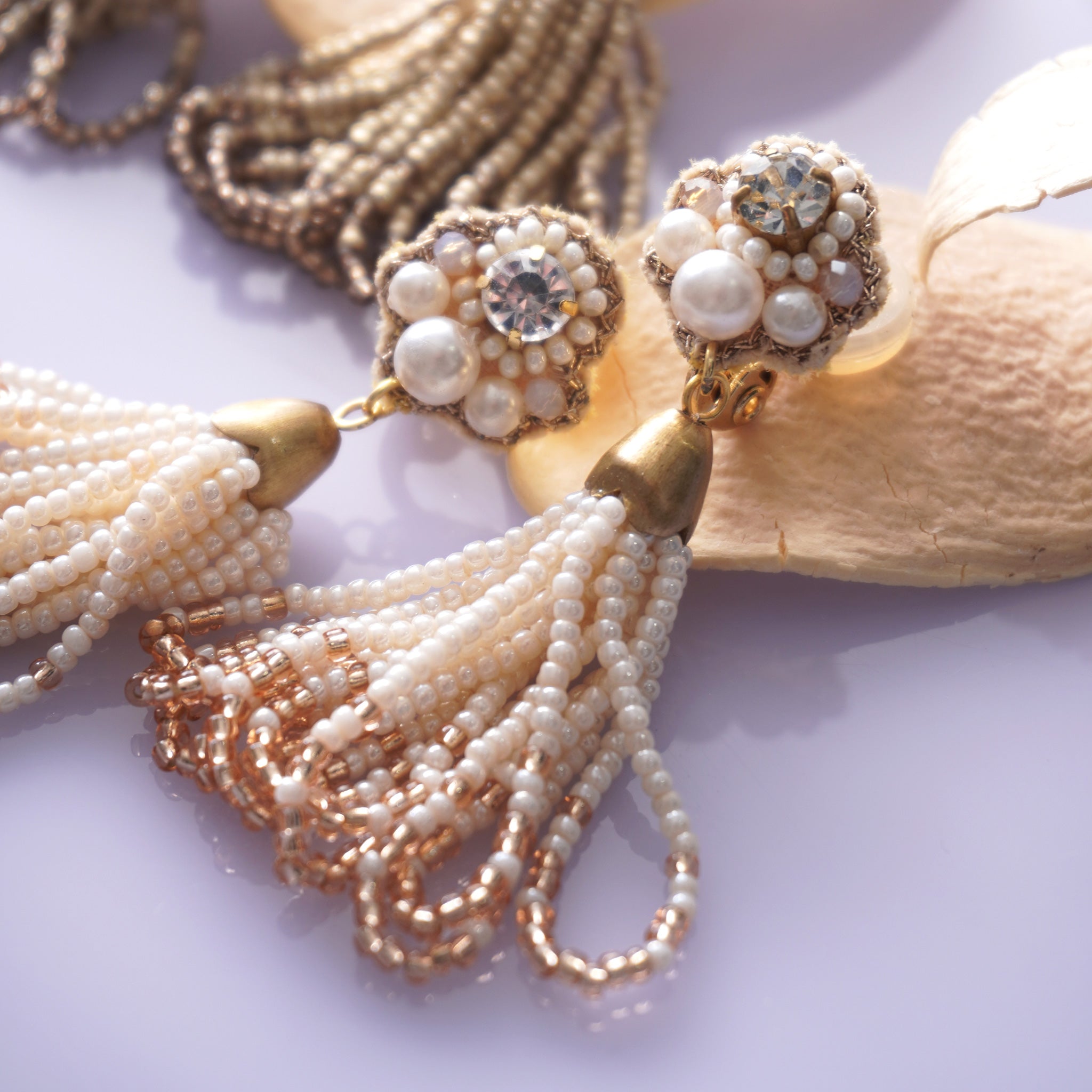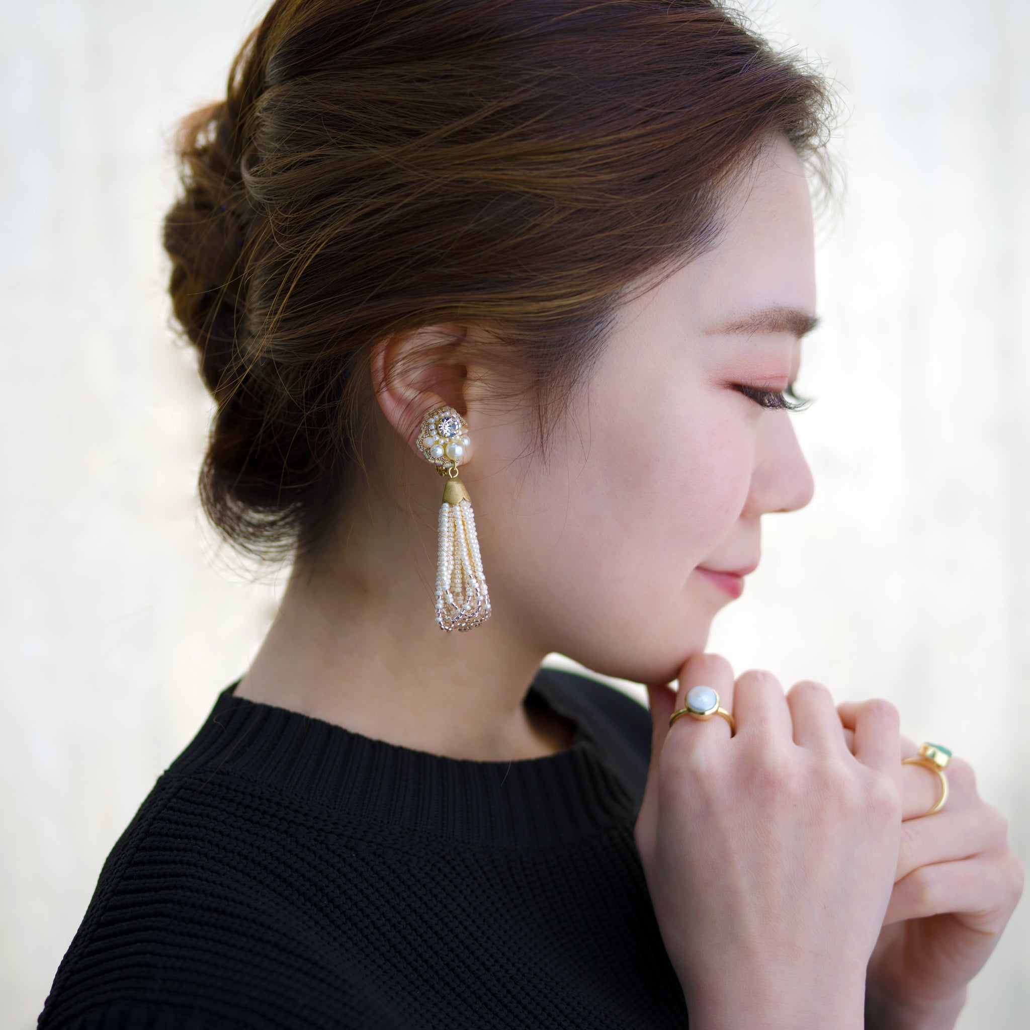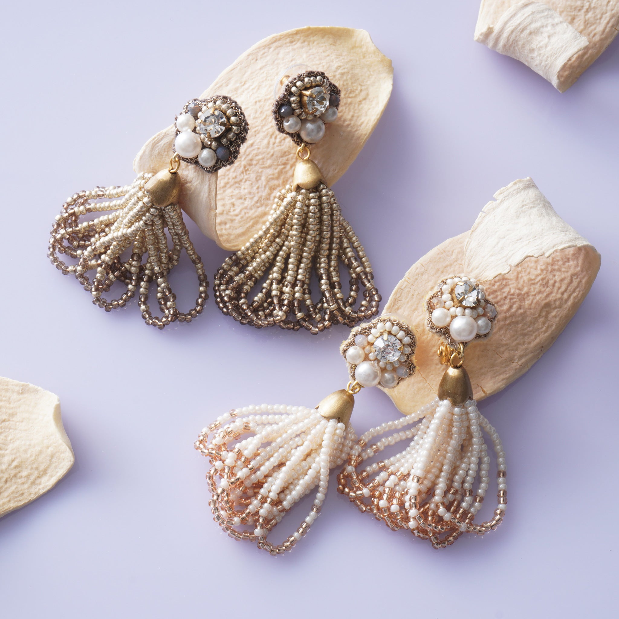ふわっと揺れるタッセルが耳元を包み、表情までパッと華やかに。光と動きが織りなす、大人のための遊び心のあるピアス / イヤリング。